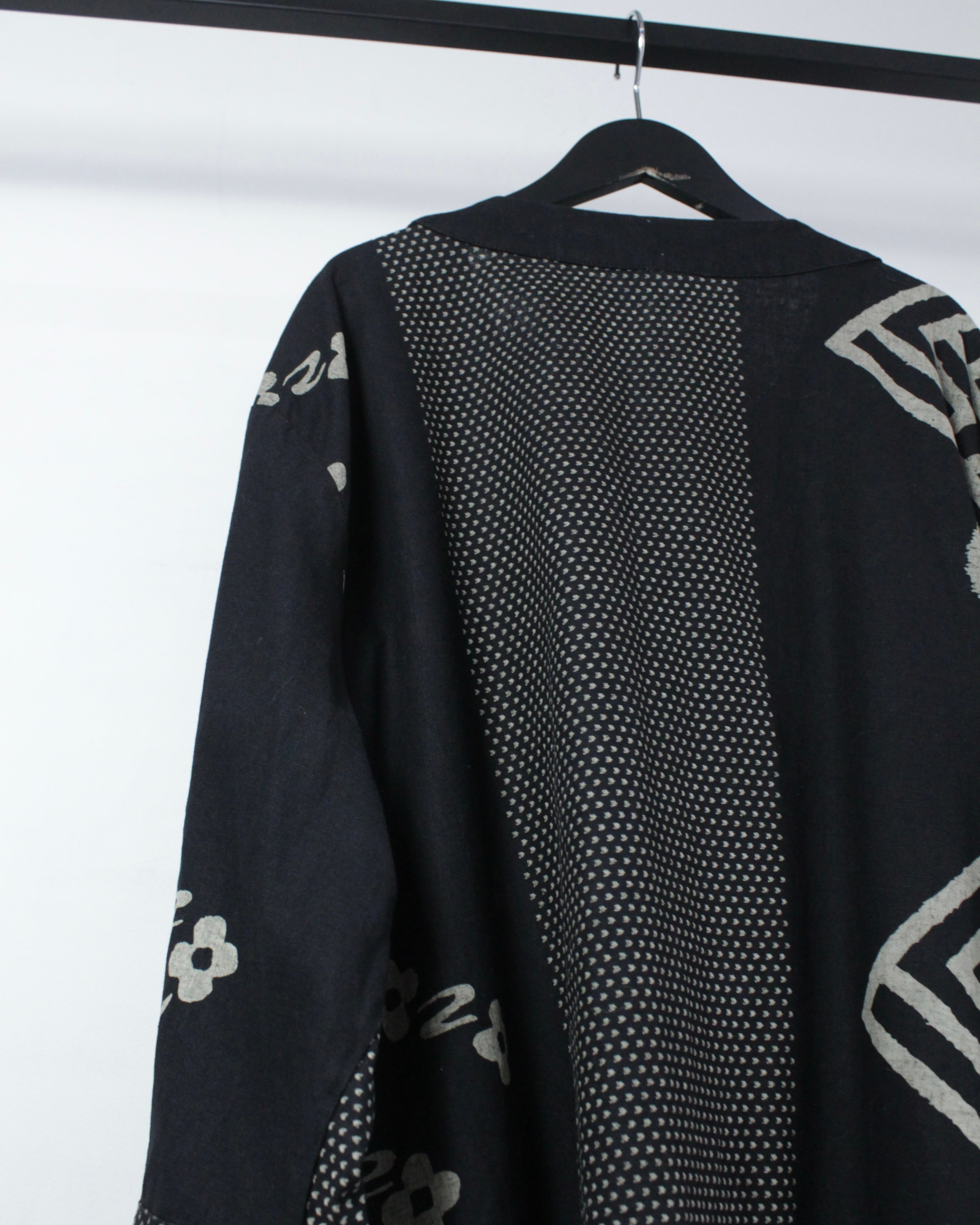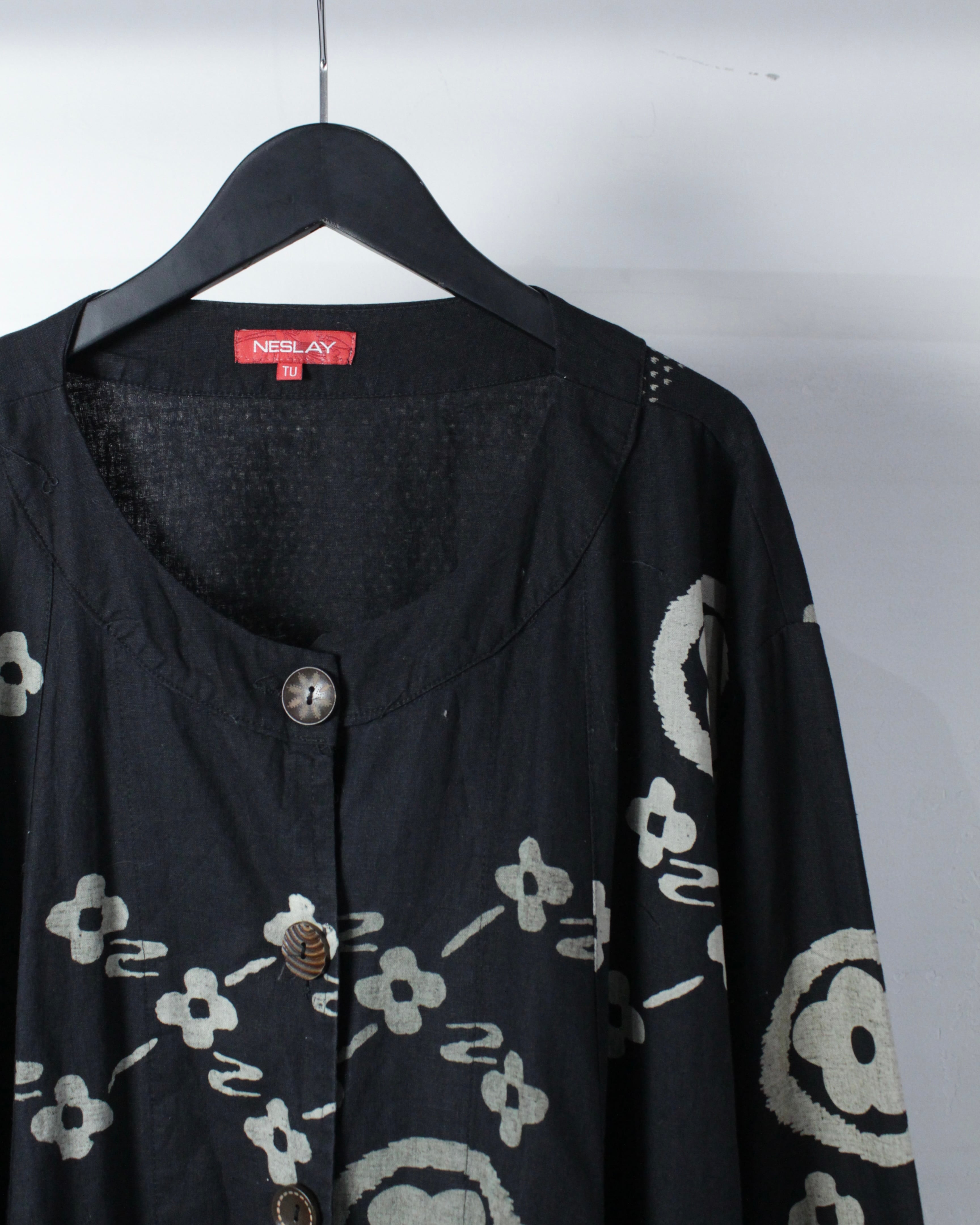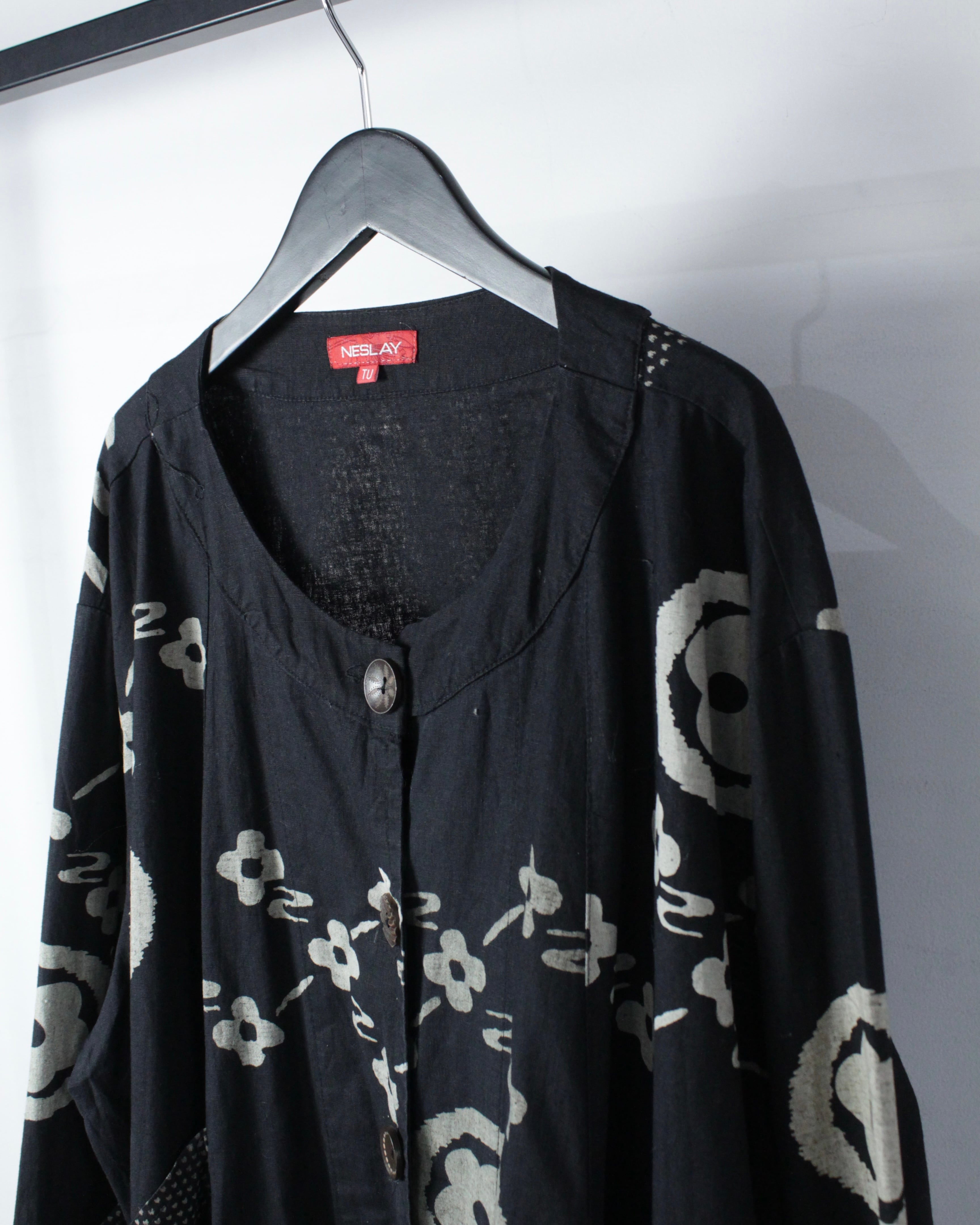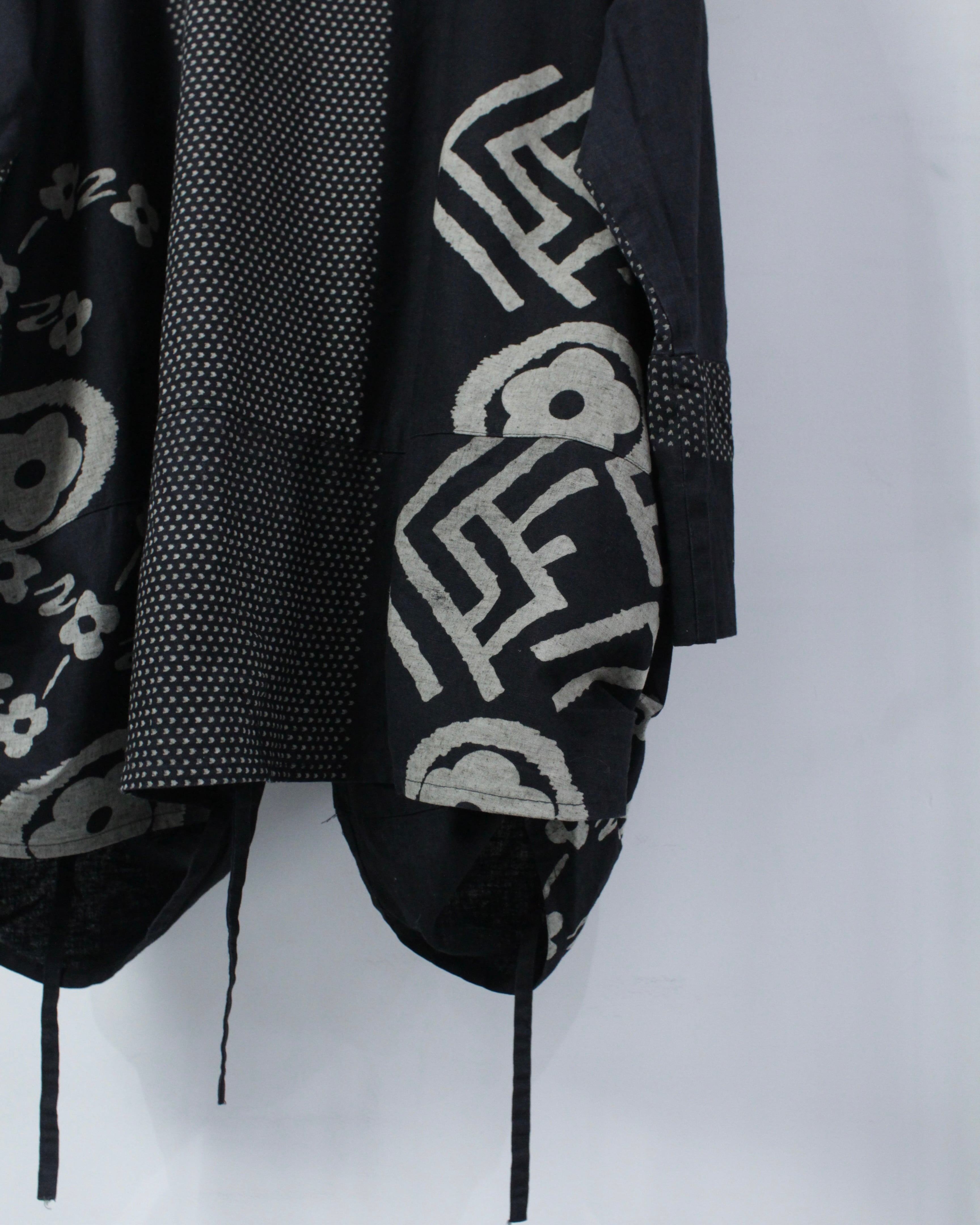 ブラックのボディに生成り調のフラワーパターンと紋様のようなデザインが映え、どこか民俗的でアート性を感じる佇まいに仕上がった1着。