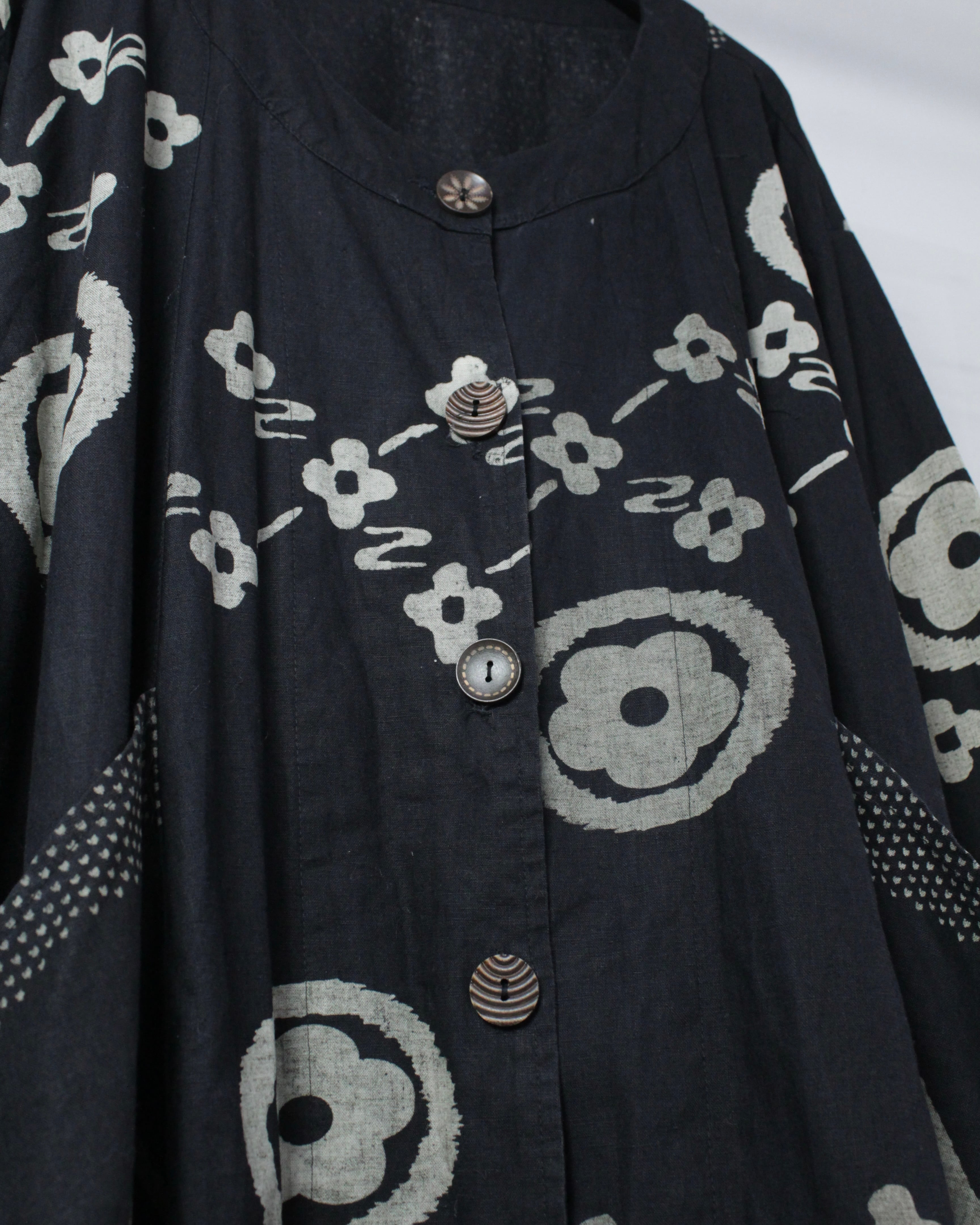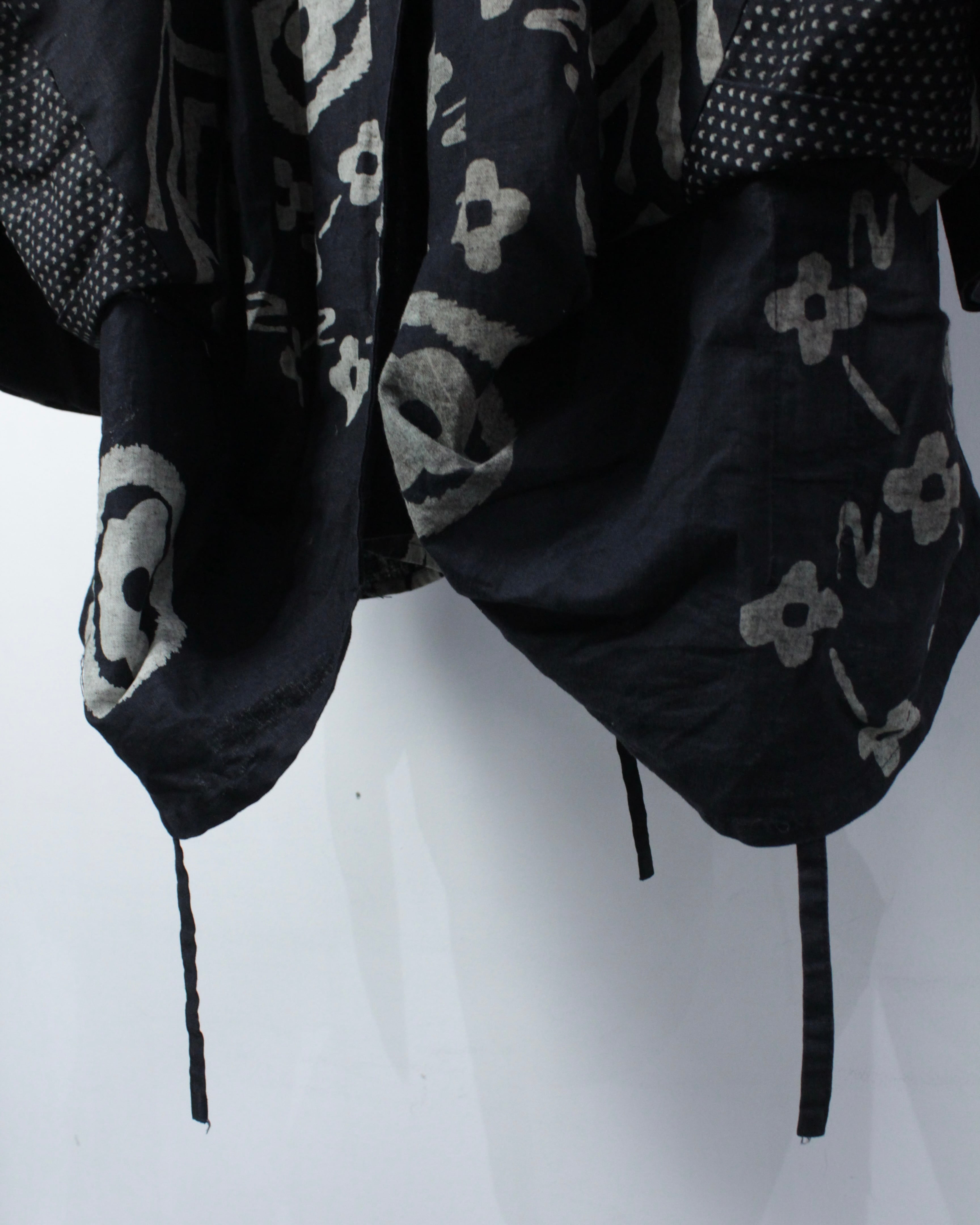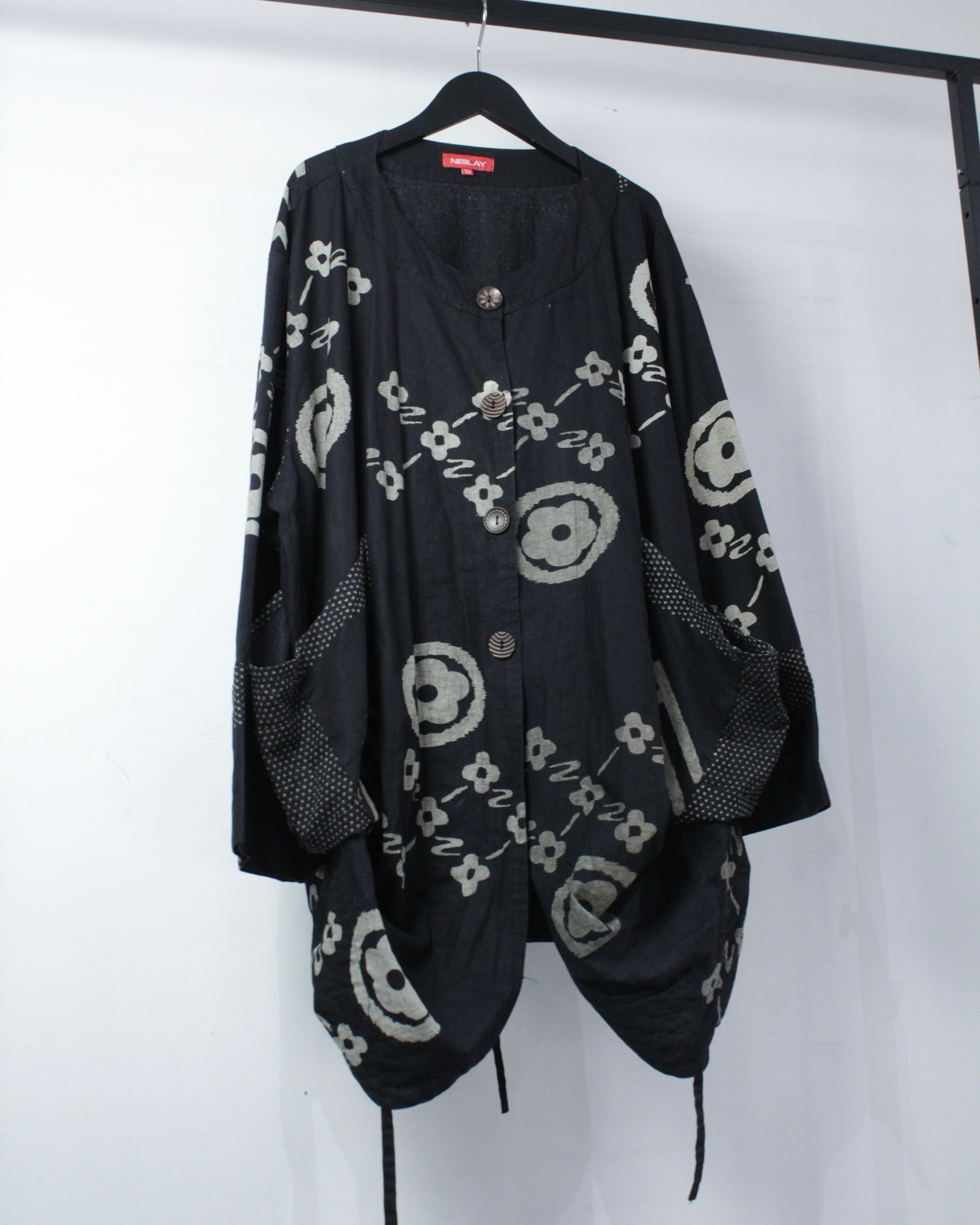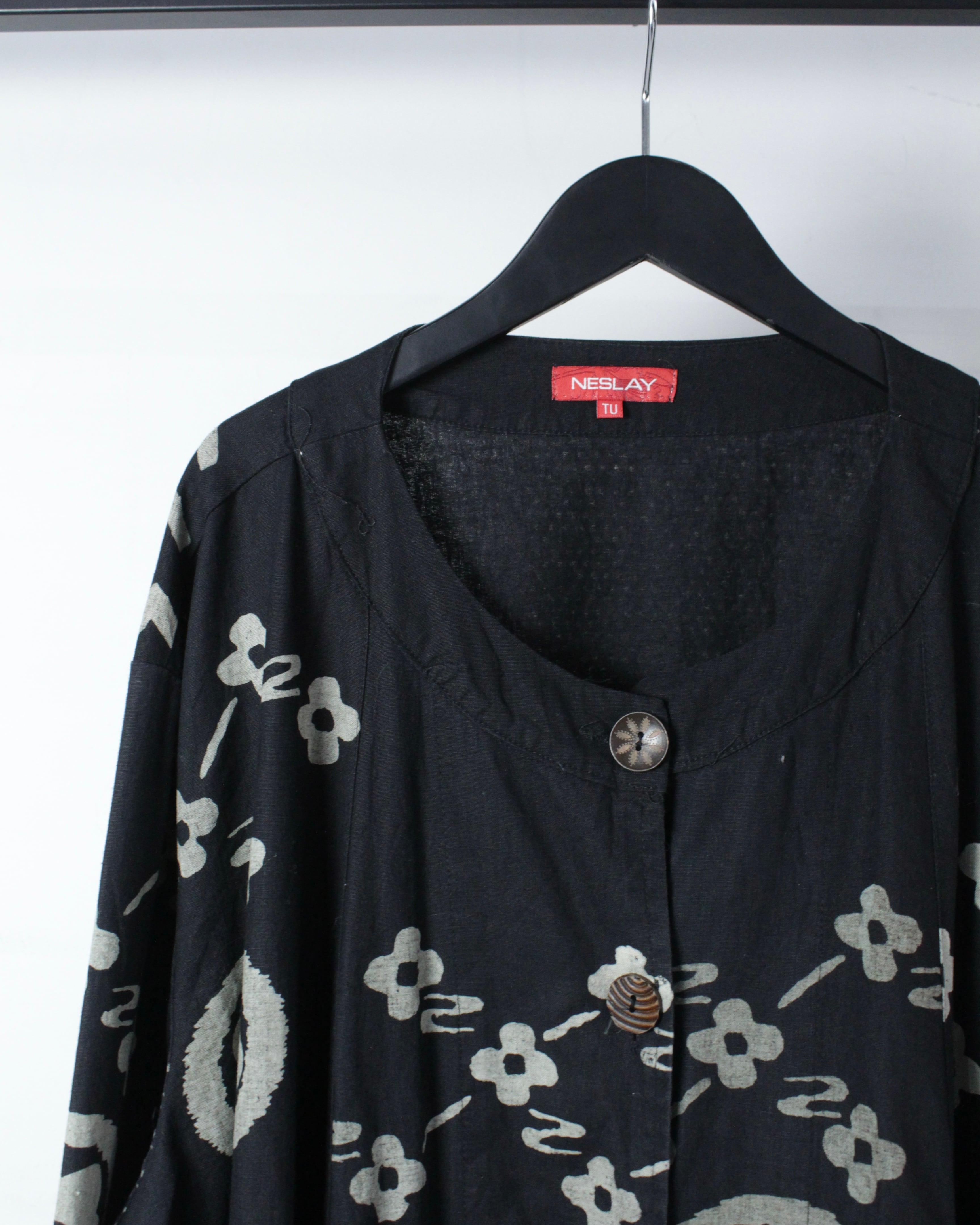 ブラックのボディに生成り調のフラワーパターンと紋様のようなデザインが映え、どこか民俗的でアート性を感じる佇まいに仕上がった1着。