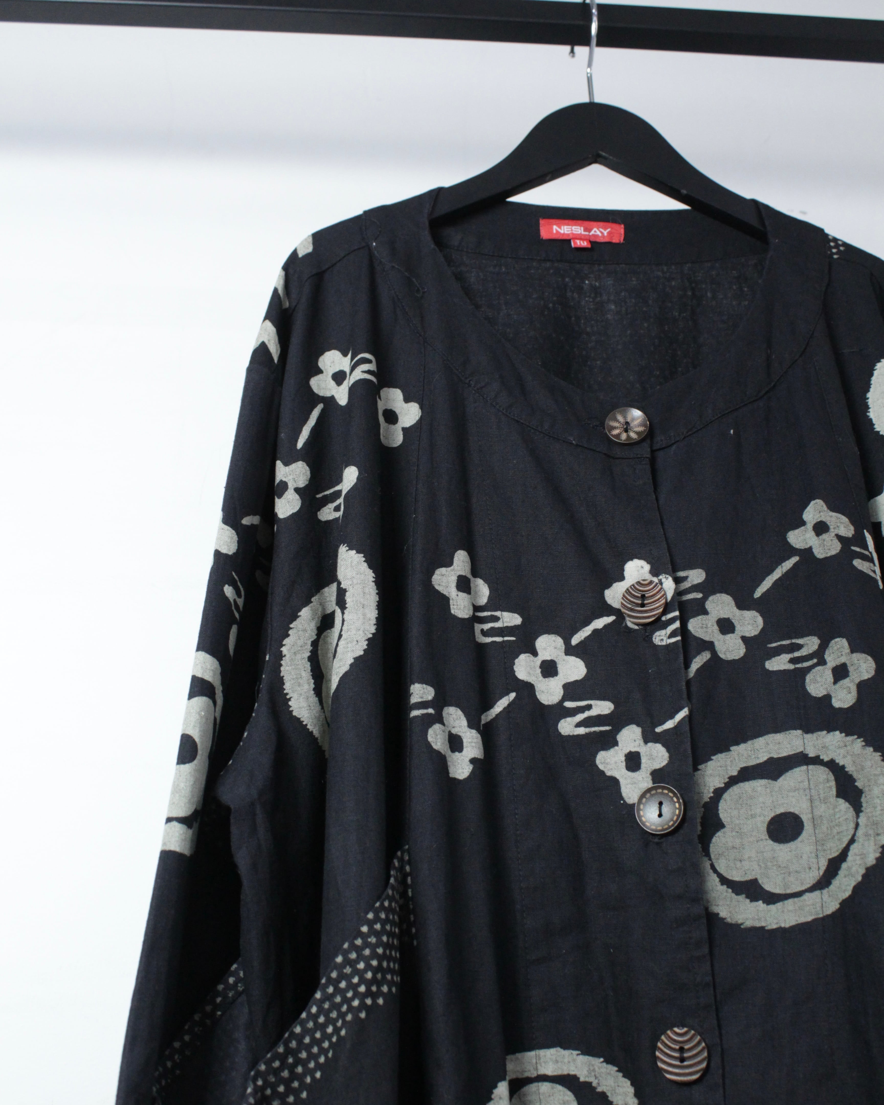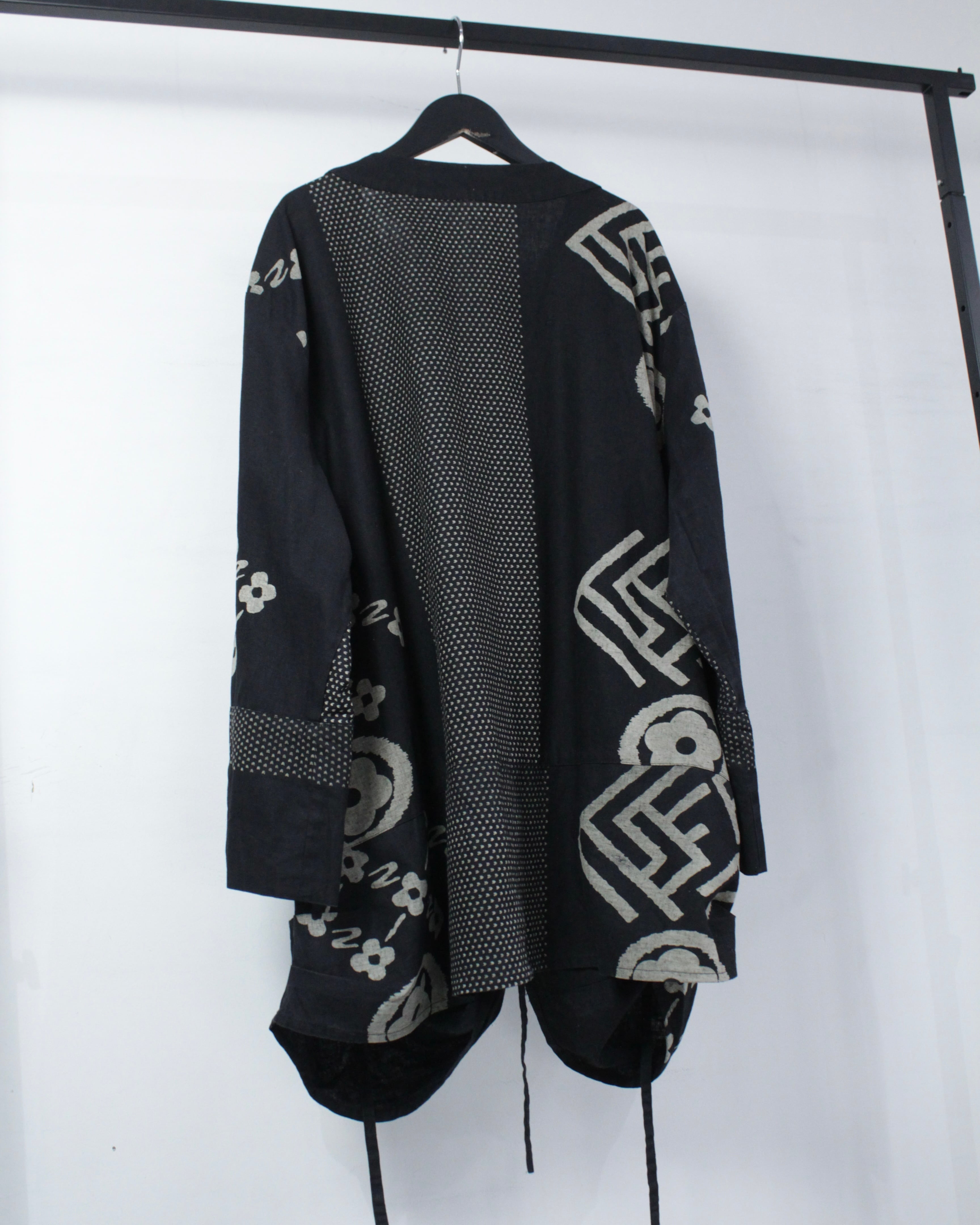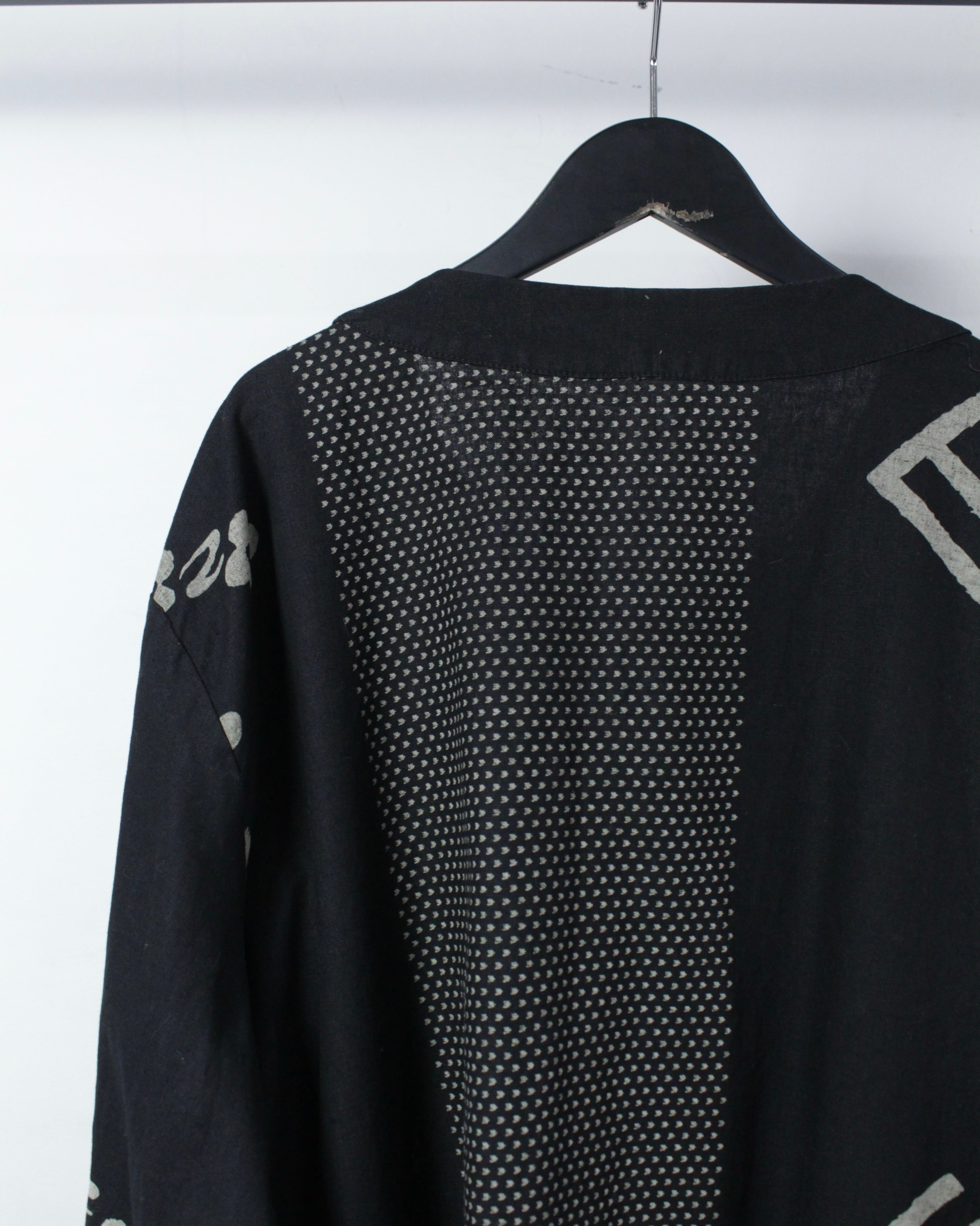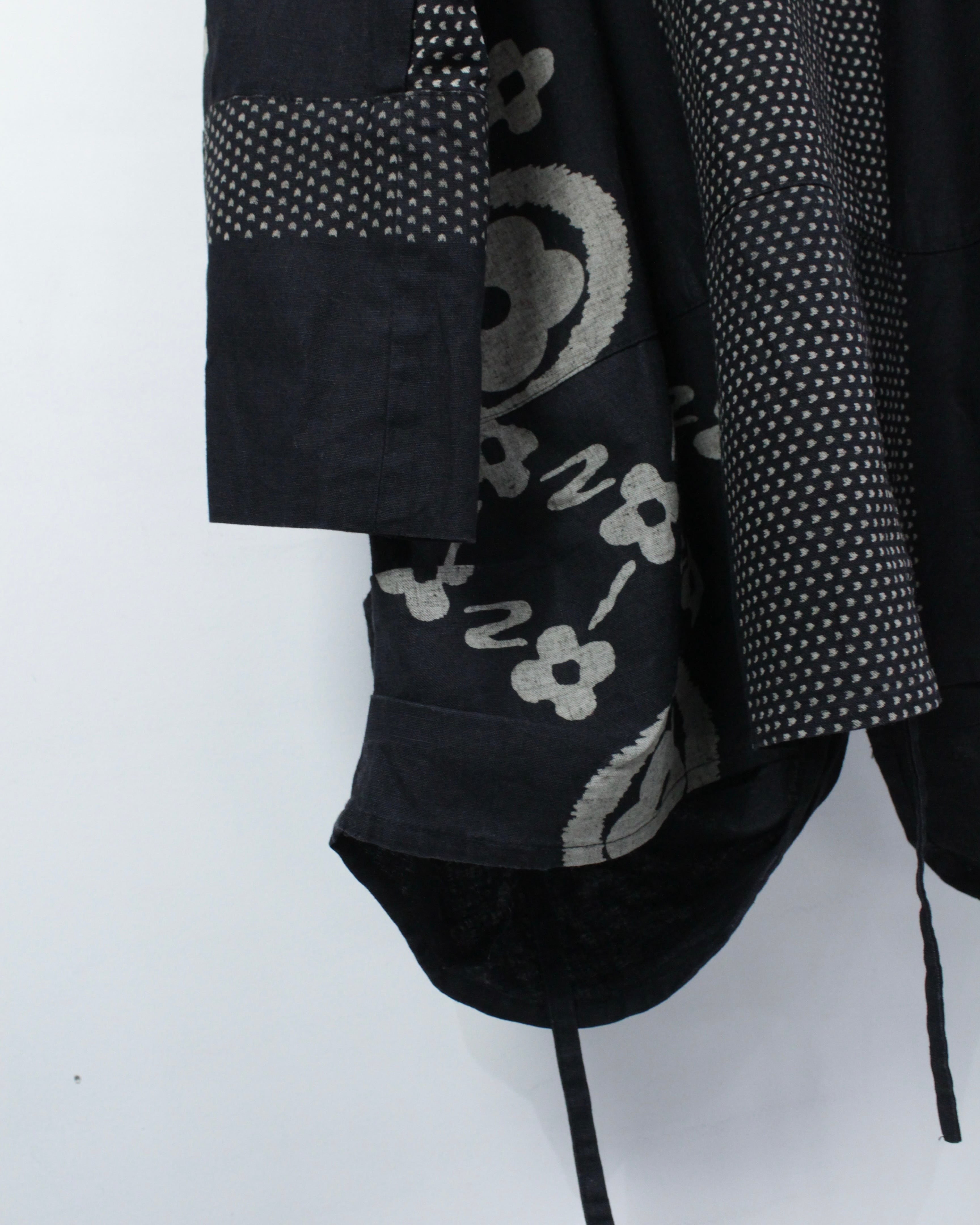 ブラックのボディに生成り調のフラワーパターンと紋様のようなデザインが映え、どこか民俗的でアート性を感じる佇まいに仕上がった1着。