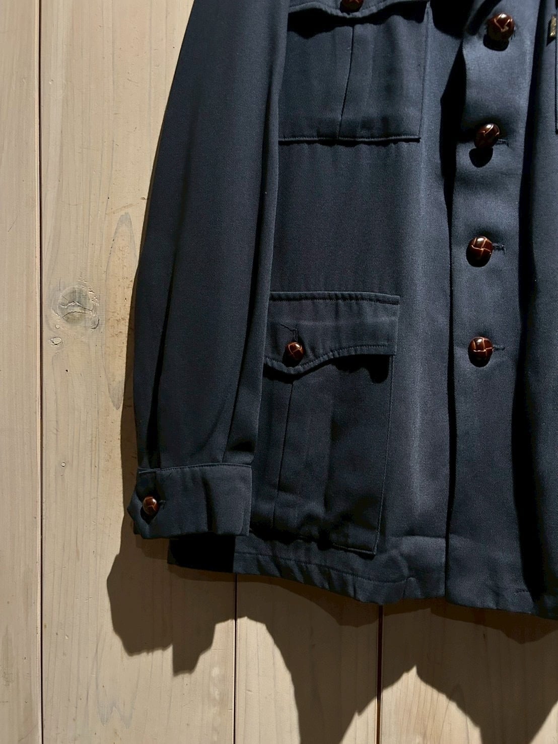 フロントには4つのフラップポケットを配置し、肩にはエポレットを搭載。サファリジャケット特有のディテールを忠実に踏襲しつつ、バスケットボタンが程よいアクセントに。