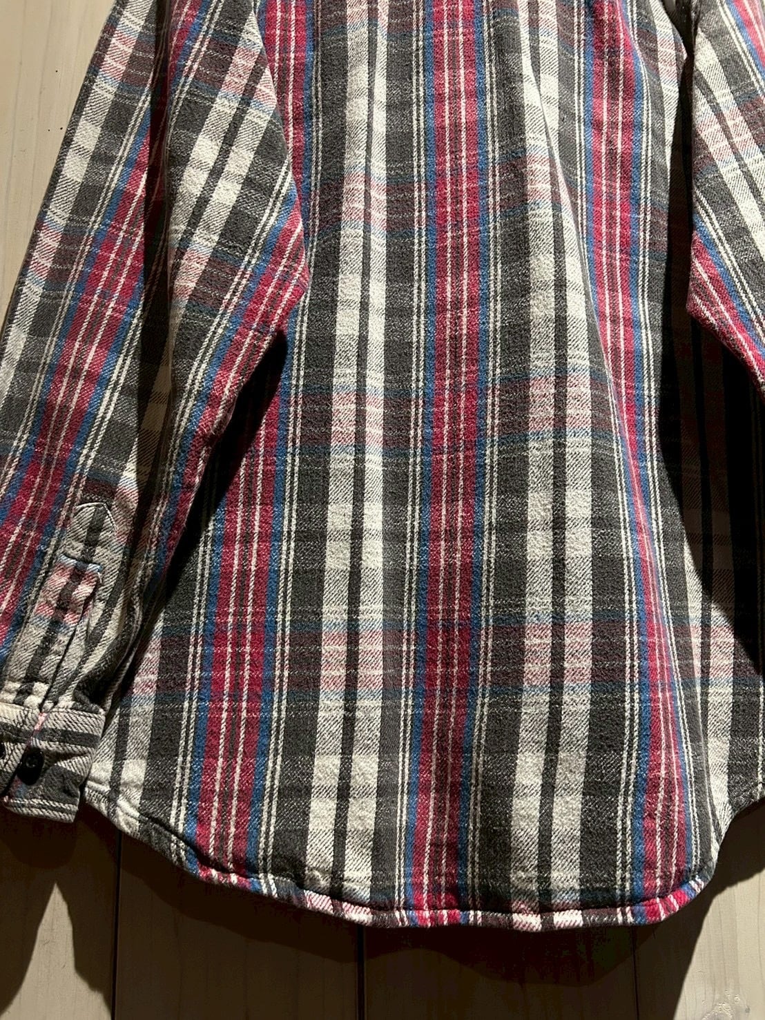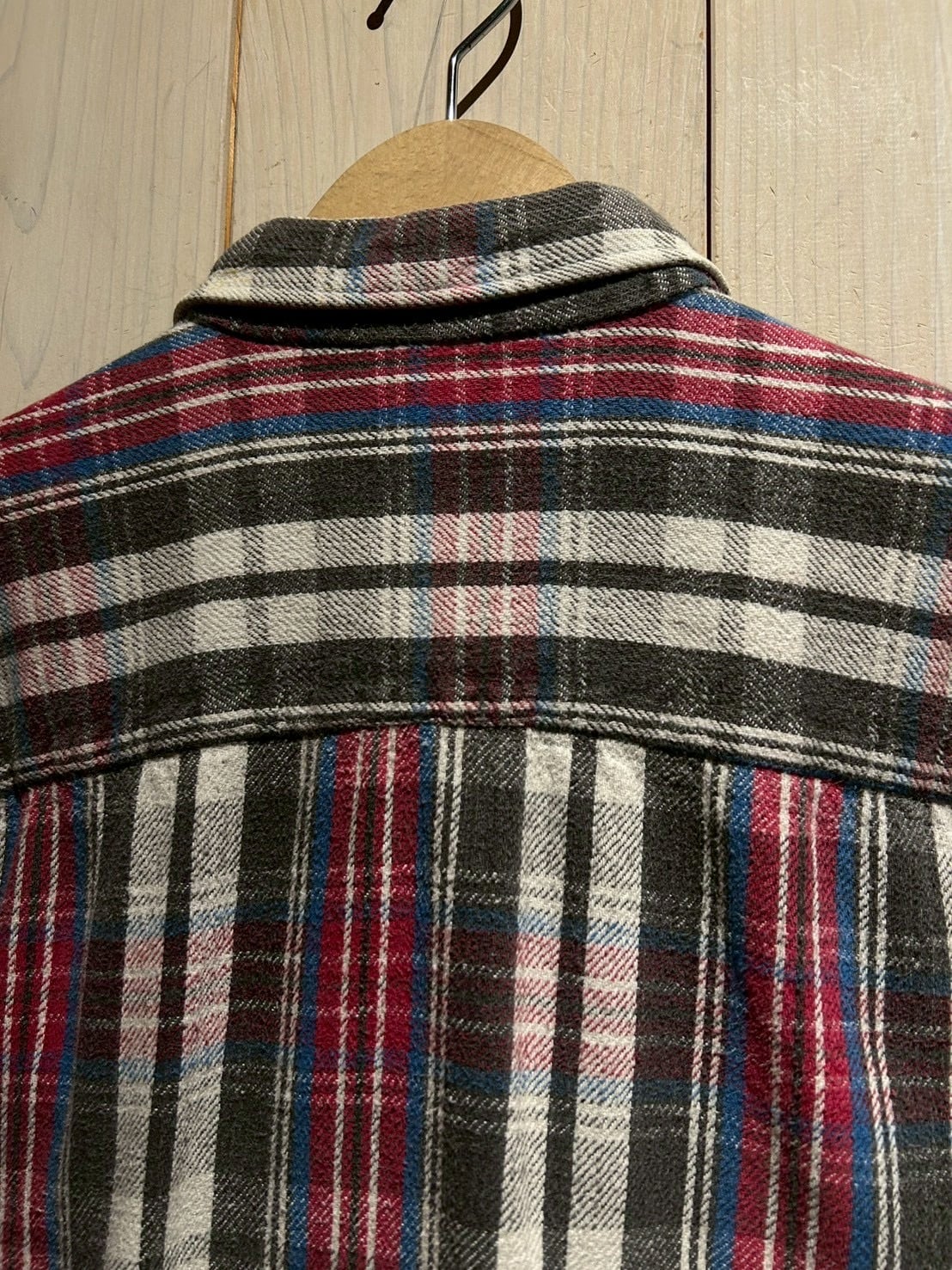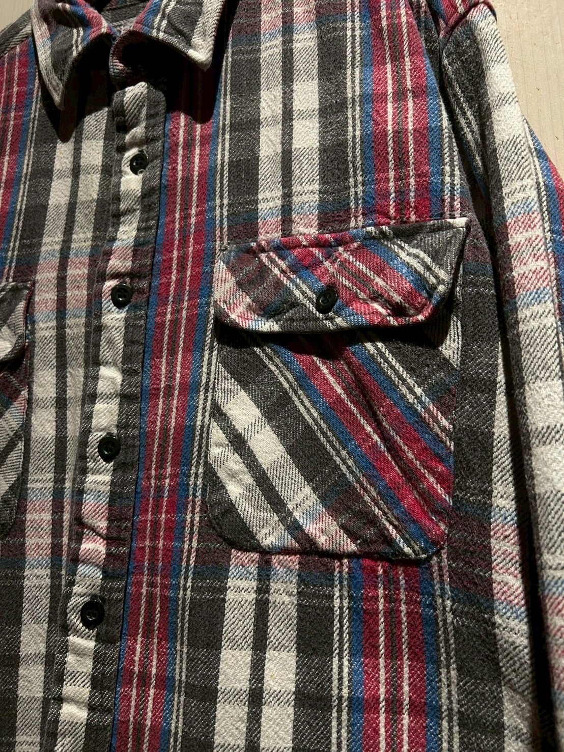 肉厚で起毛感のあるコットンフランネルを使用。グレーをベースに、レッドやブルーを織り交ぜたチェック配色が絶妙で、無骨さの中に洒落感もしっかりと感じさせますね。