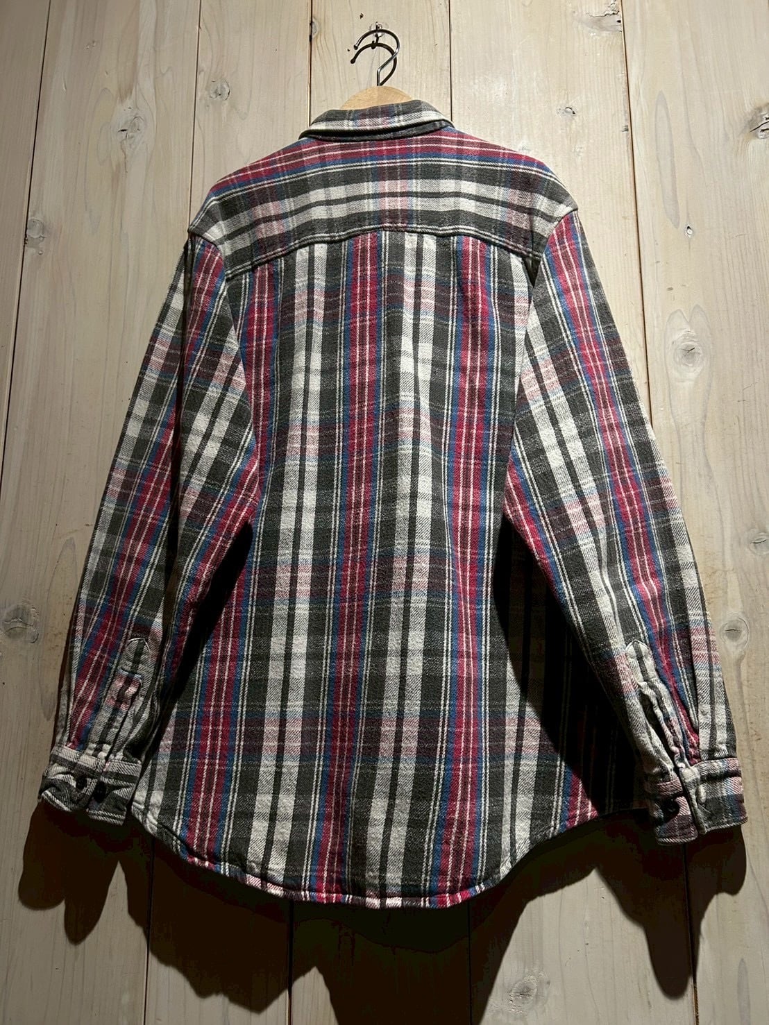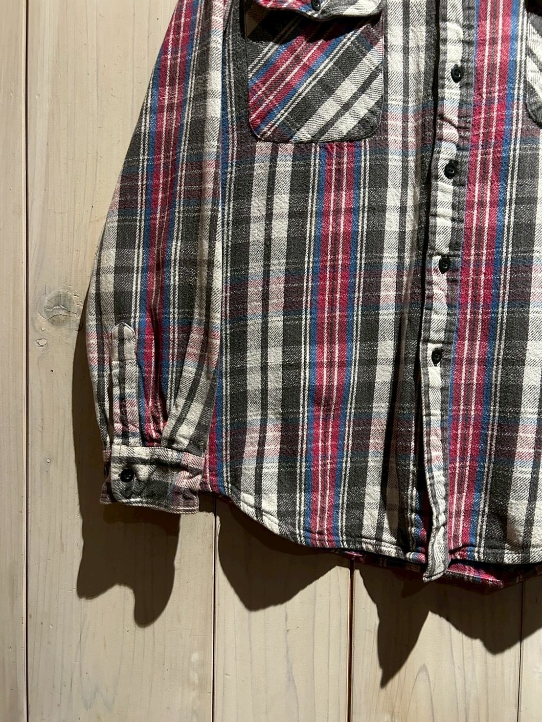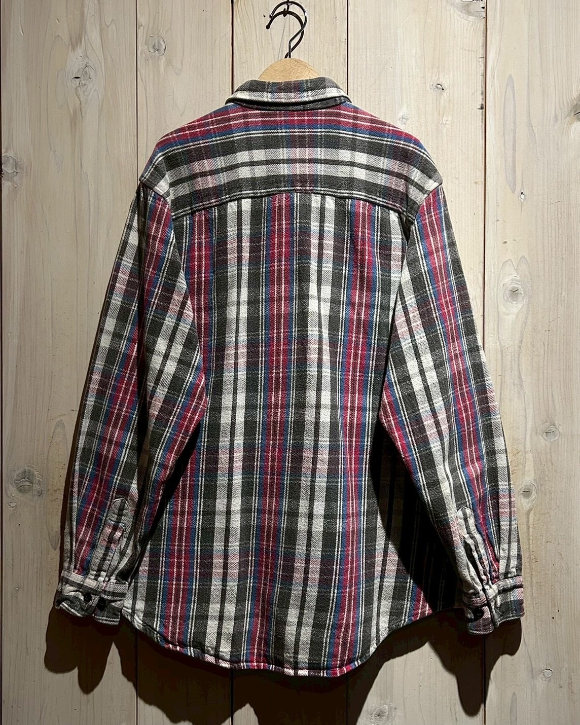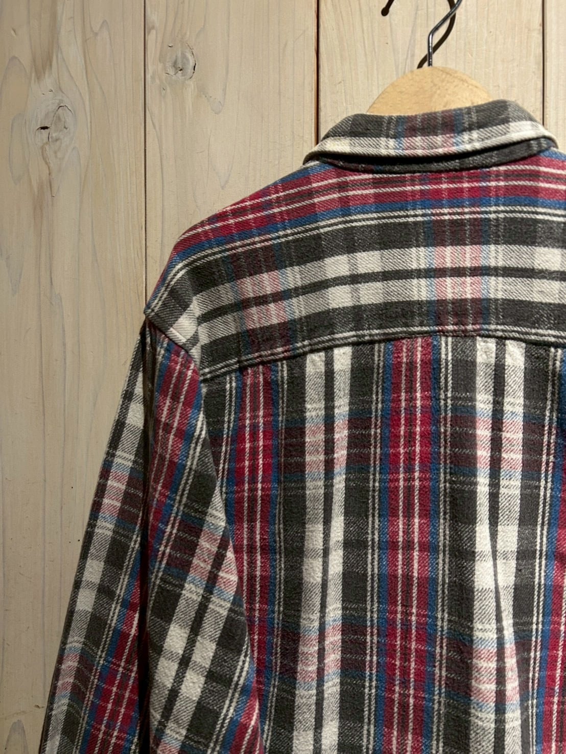 肉厚で起毛感のあるコットンフランネルを使用。グレーをベースに、レッドやブルーを織り交ぜたチェック配色が絶妙で、無骨さの中に洒落感もしっかりと感じさせますね。