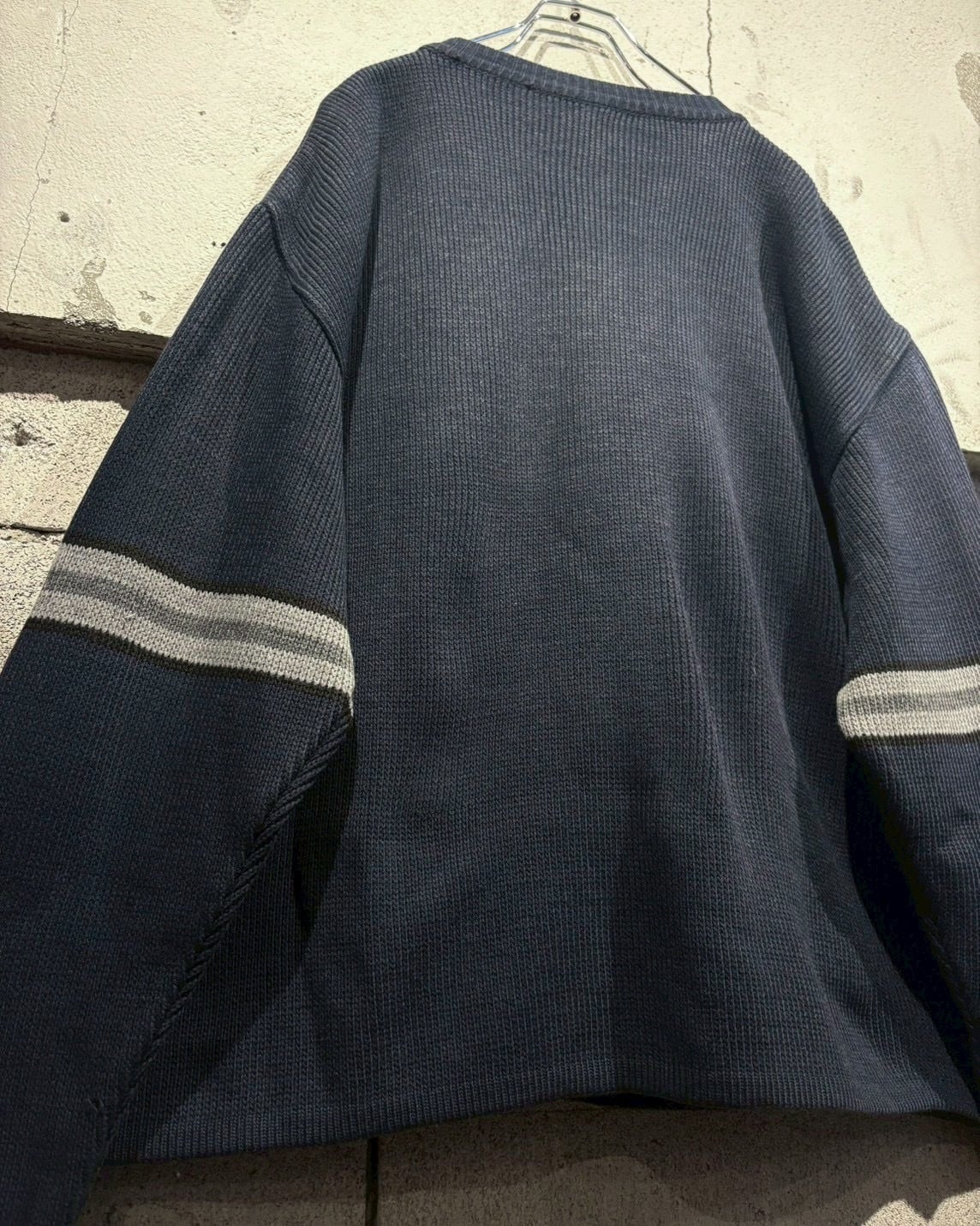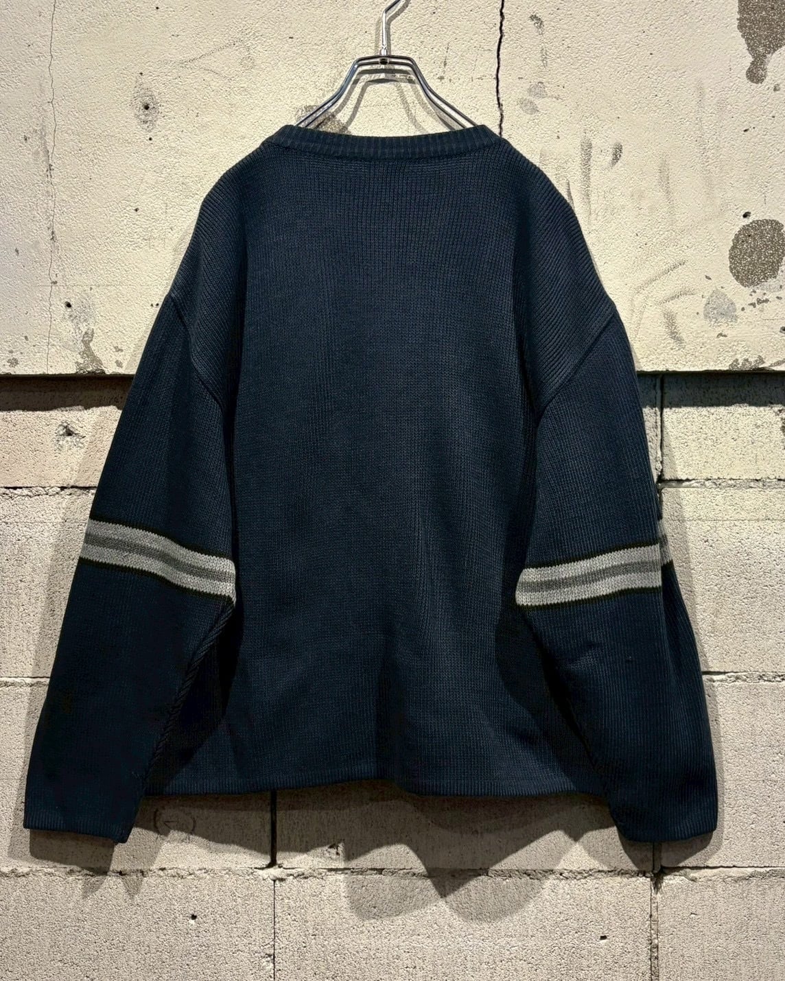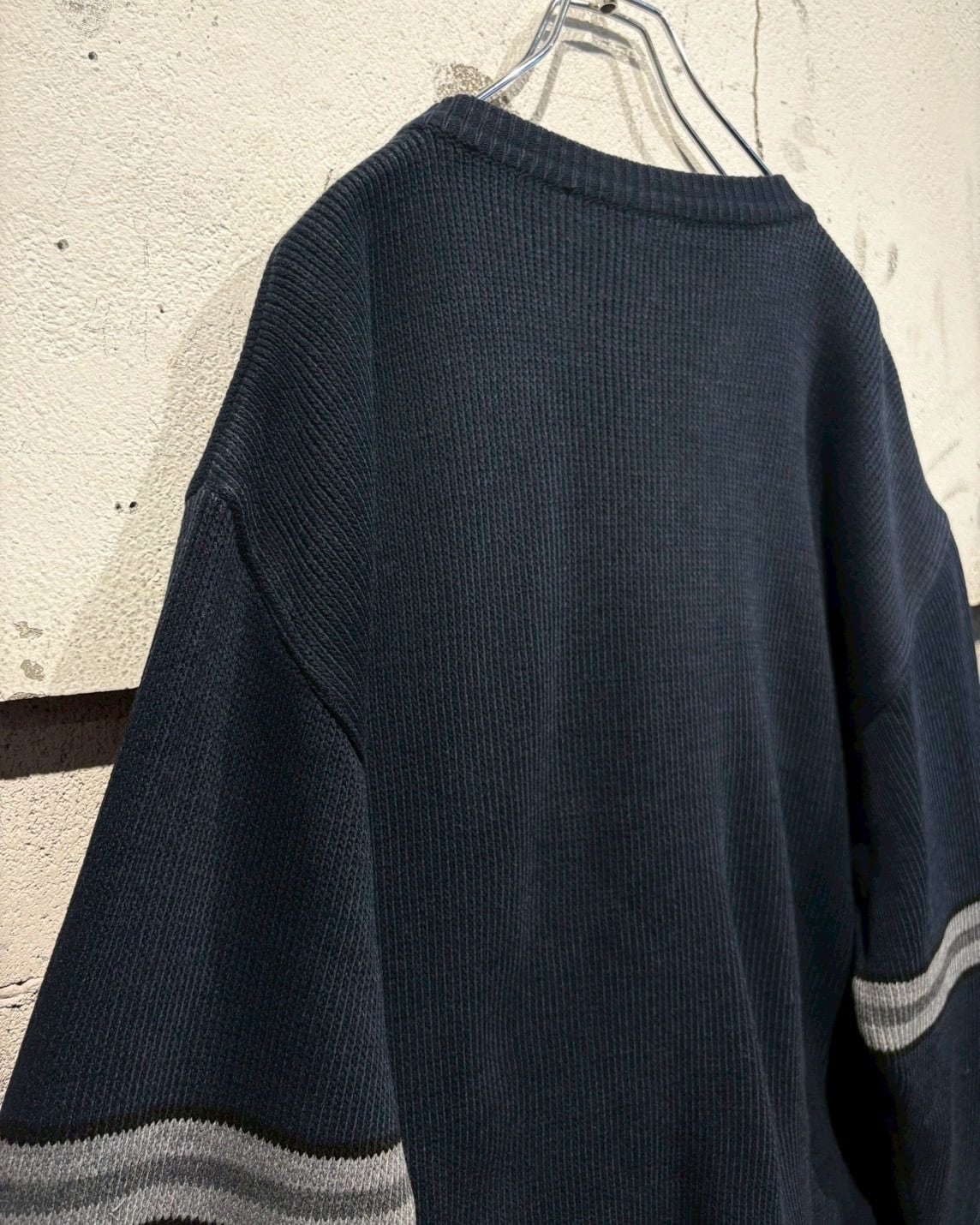 ネイビーをベースとした落ち着いたカラーリングで、胸元とアームに走るグレーのライン切り替えがシンプルな中にスポーティーなエッセンスを加え、90’sらしい空気感を纏っています。