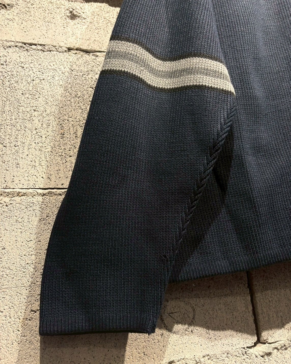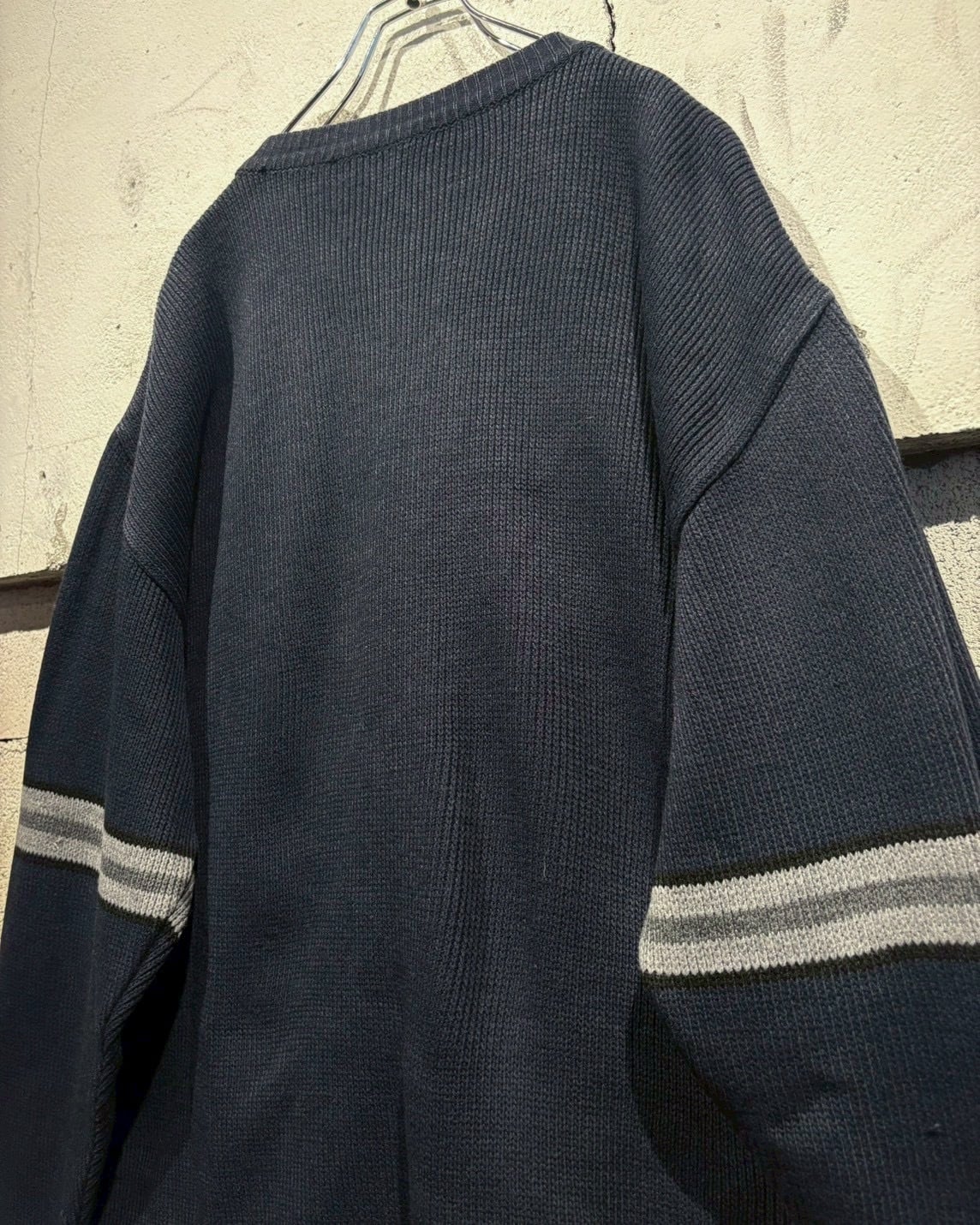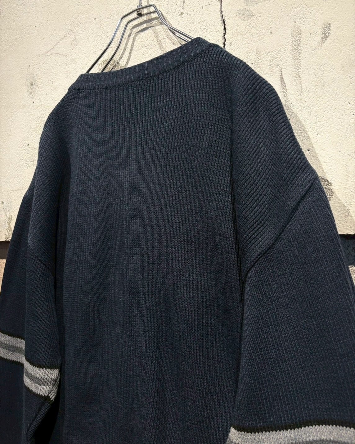 ネイビーをベースとした落ち着いたカラーリングで、胸元とアームに走るグレーのライン切り替えがシンプルな中にスポーティーなエッセンスを加え、90’sらしい空気感を纏っています。