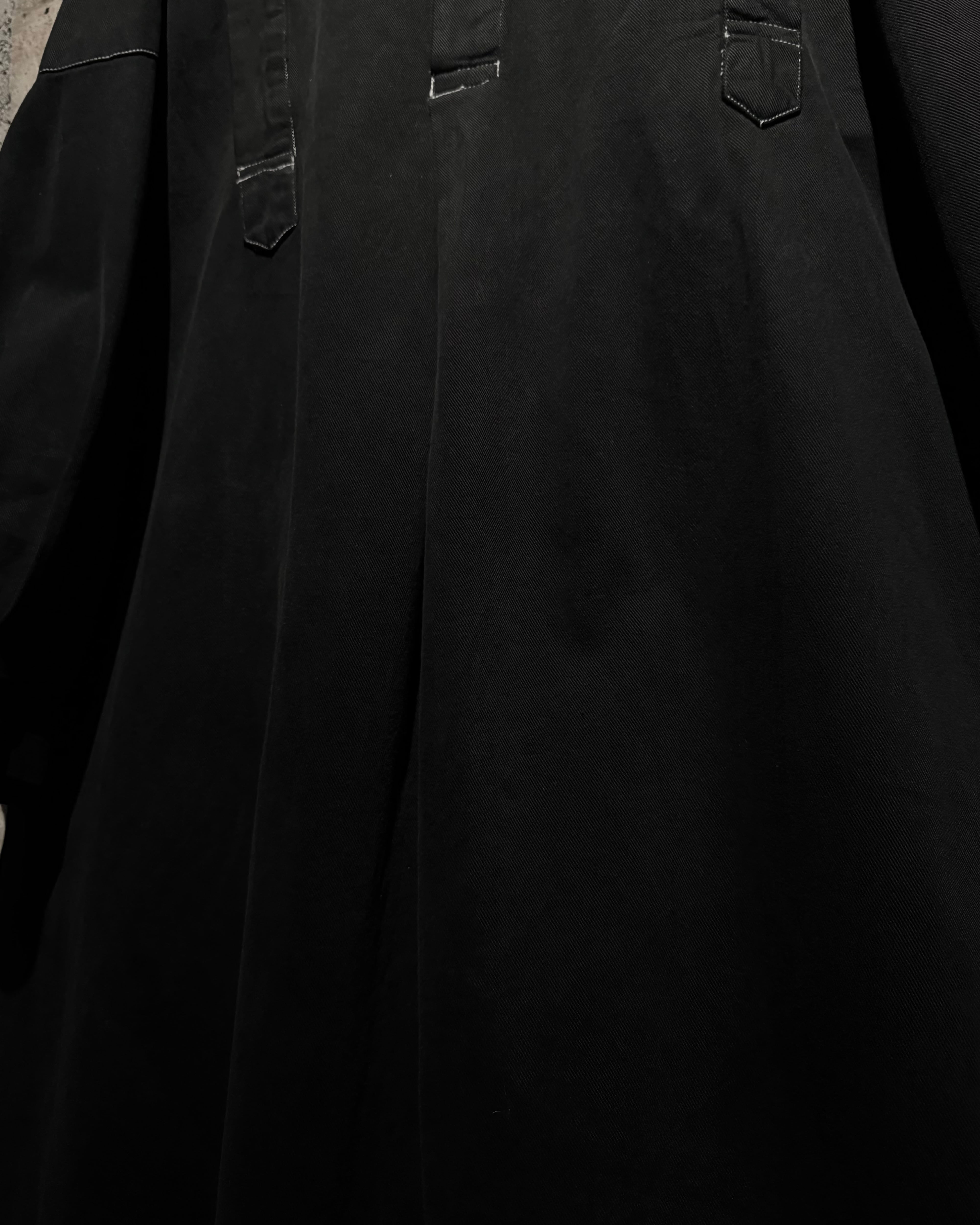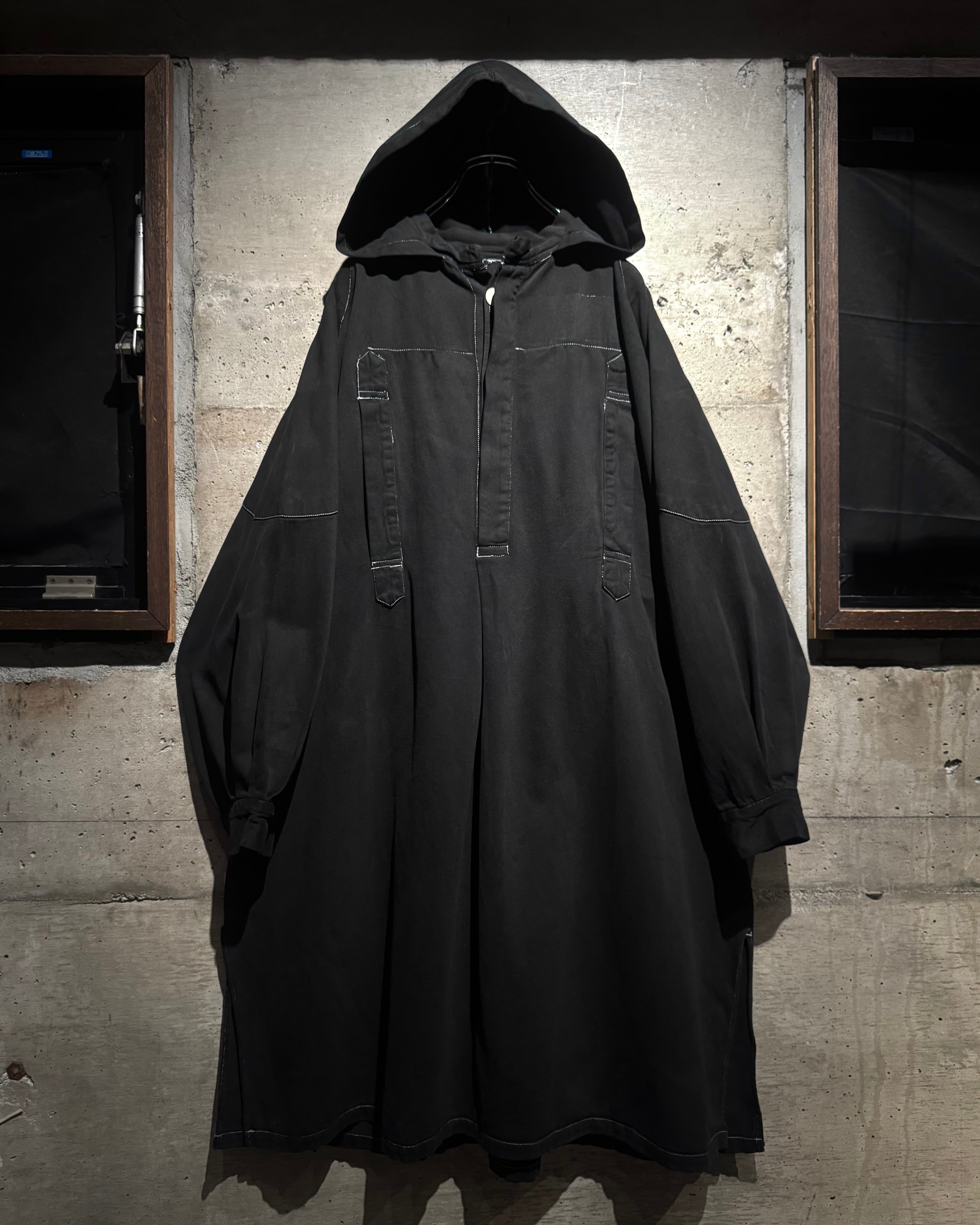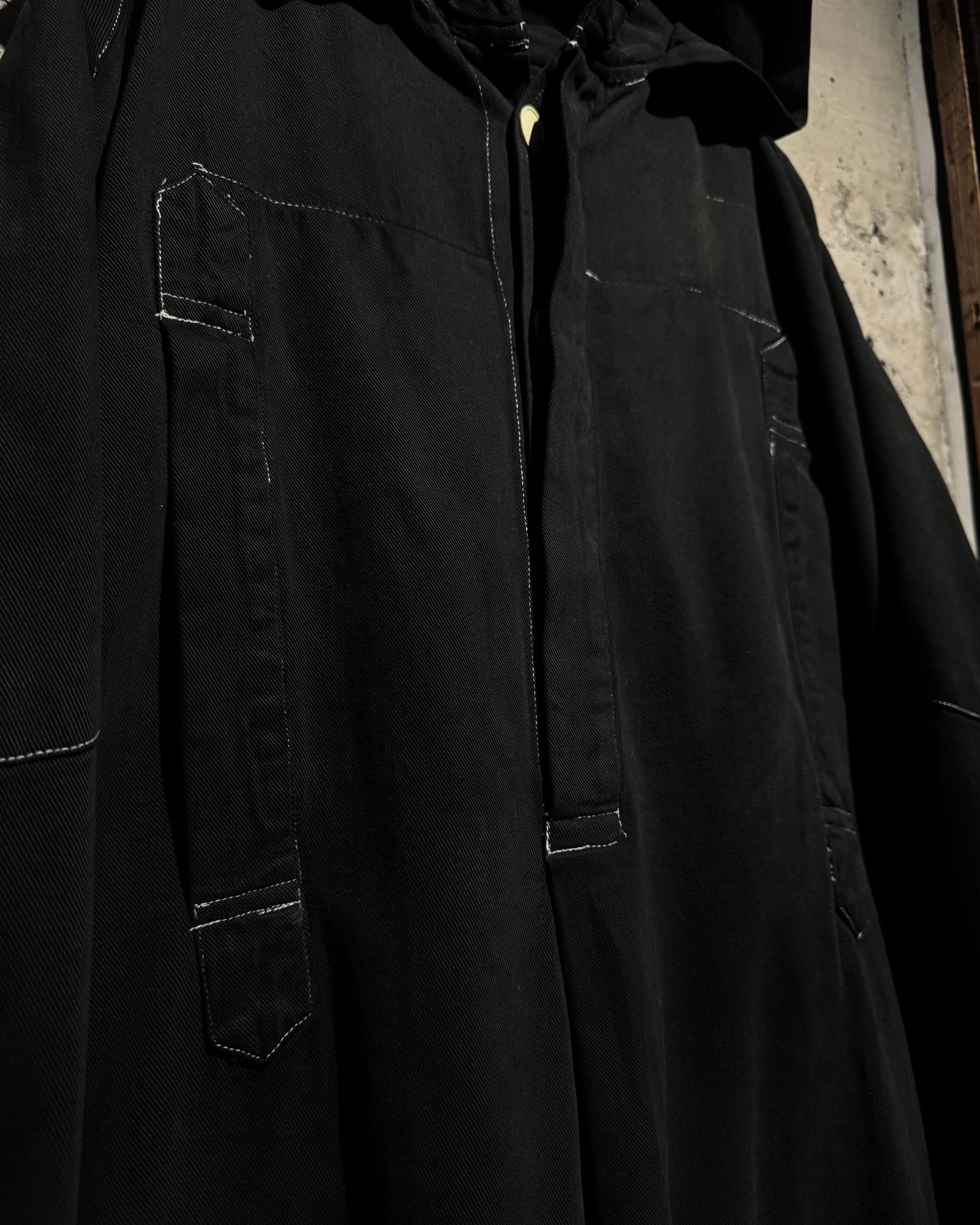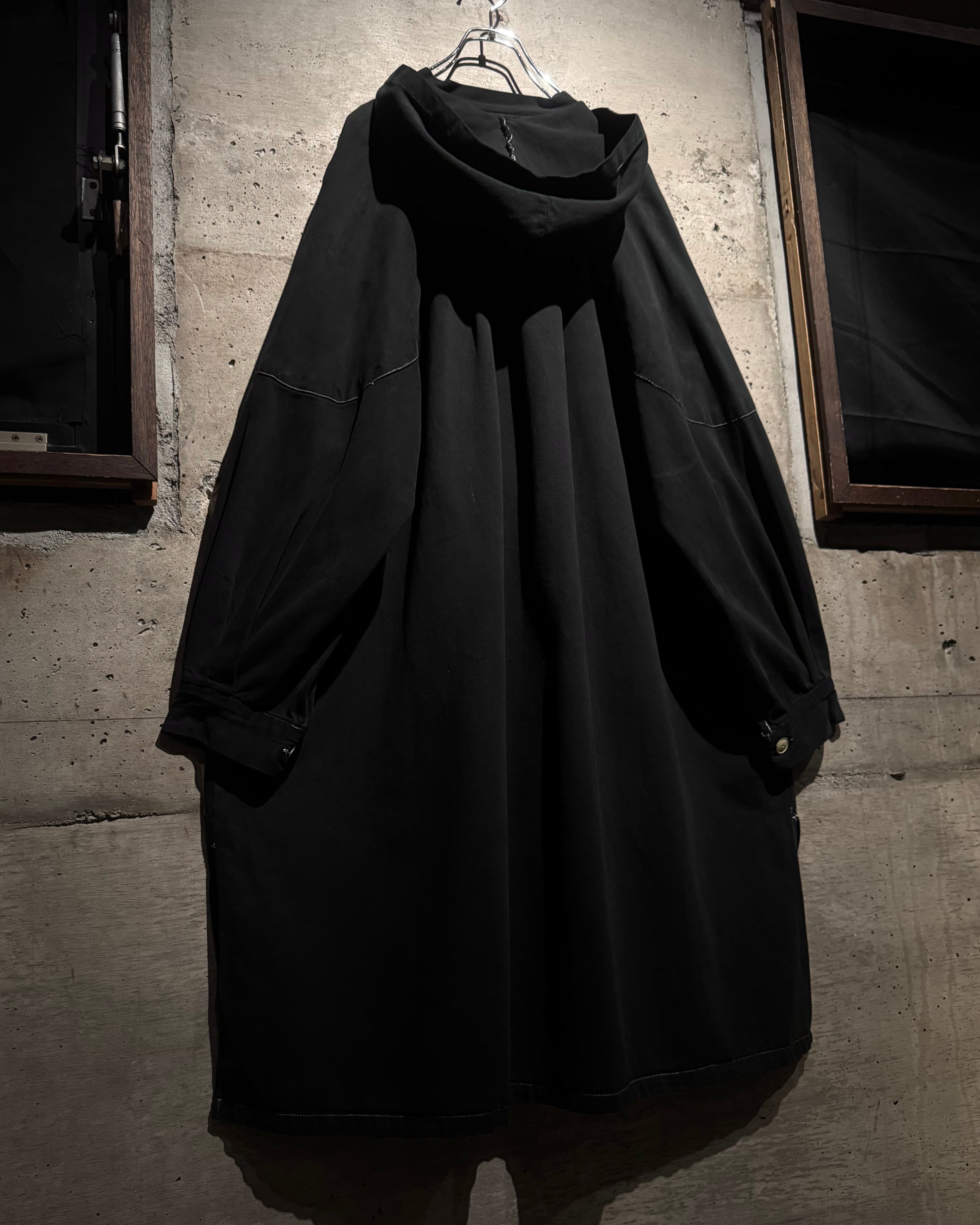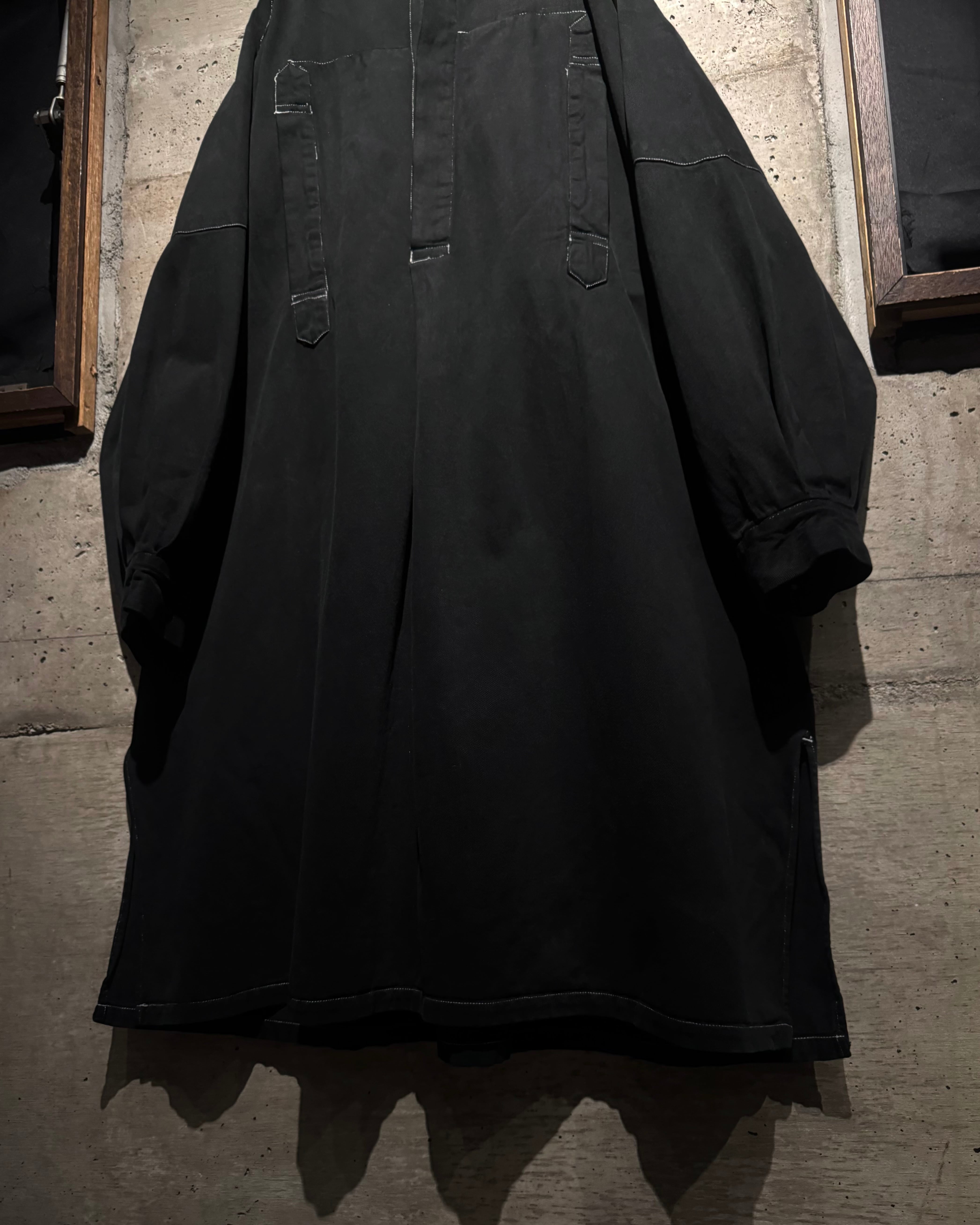 ガーメントダイによる無機質なブラックの佇まいが際立つ、オーバーシルエットのスモックコート。