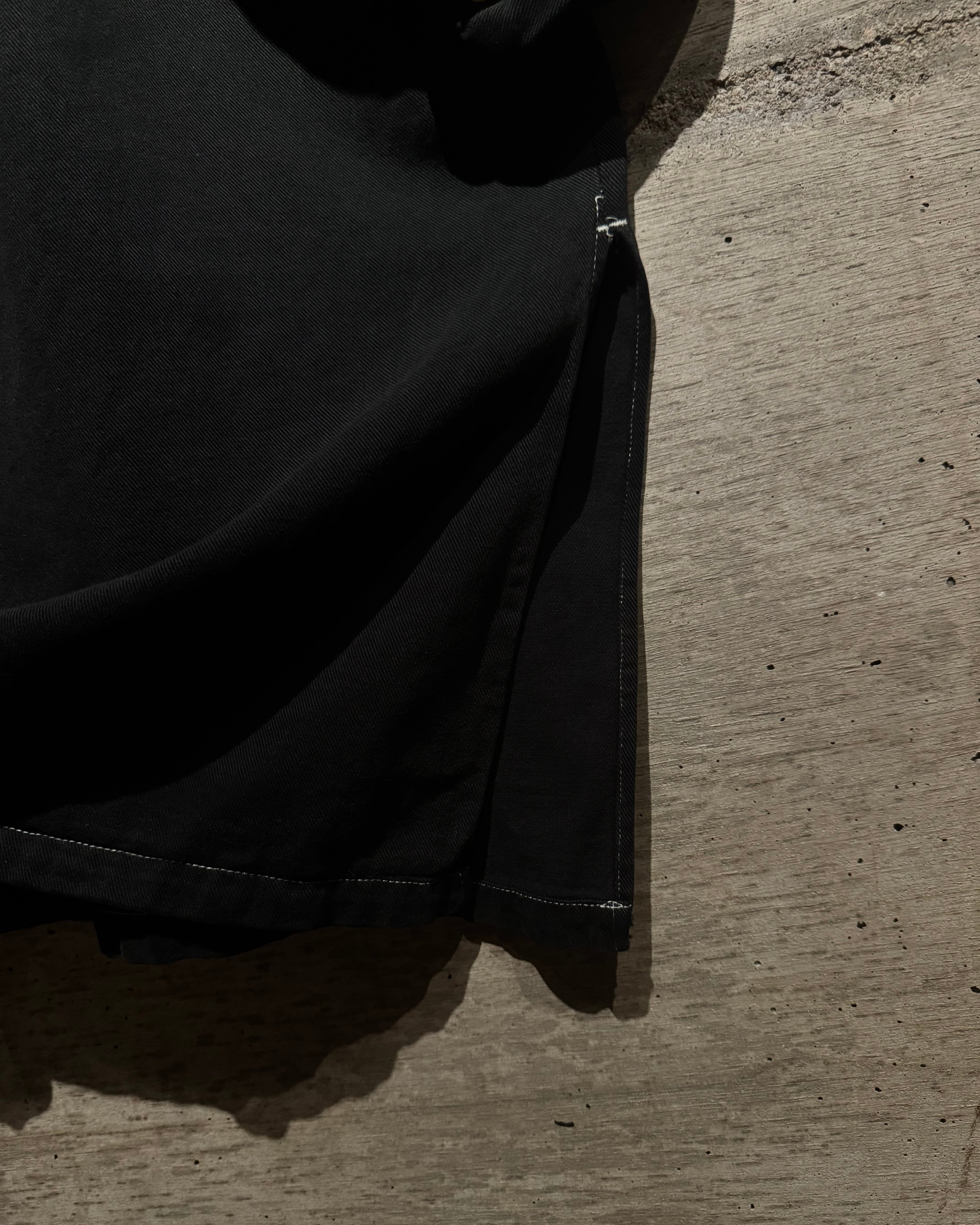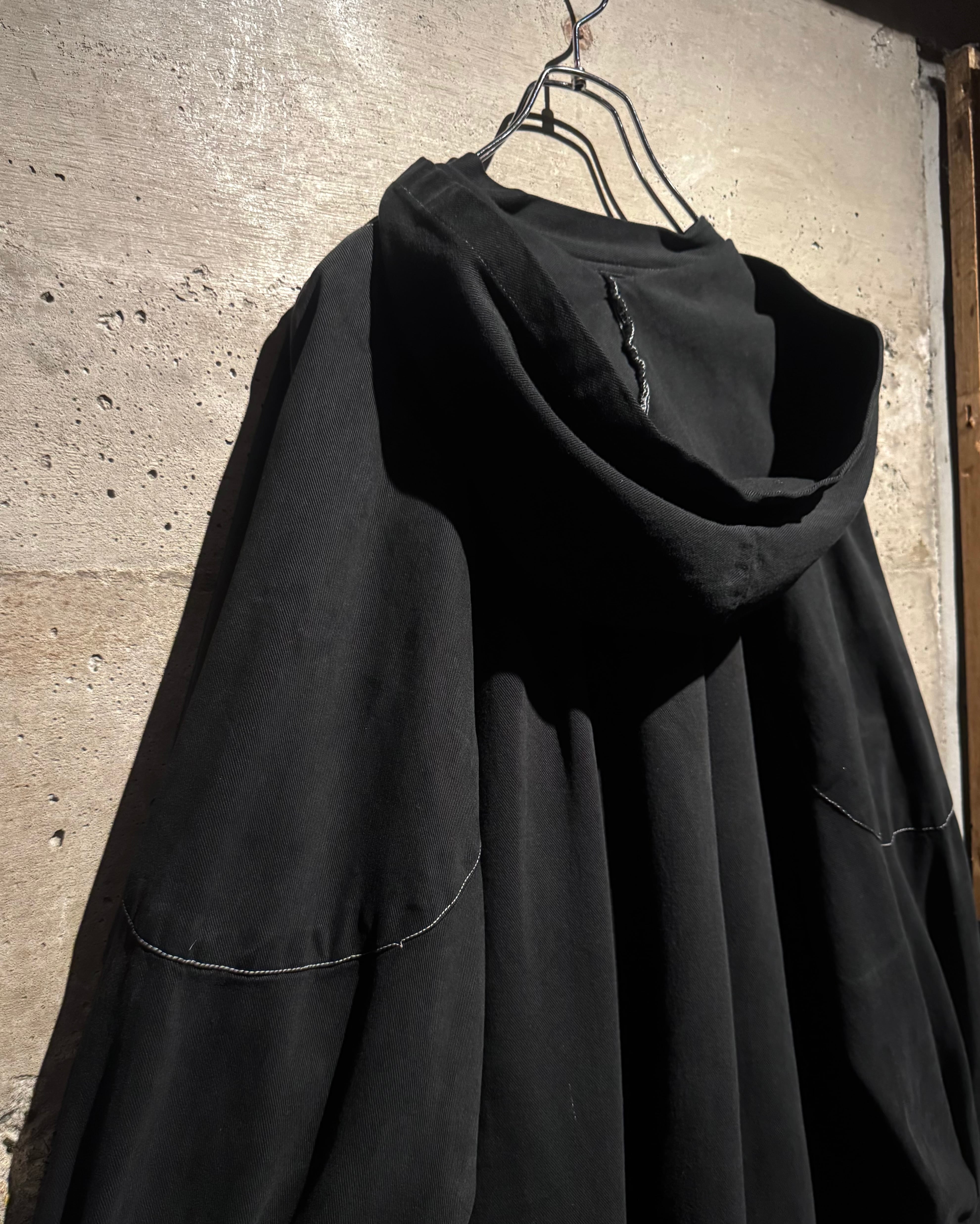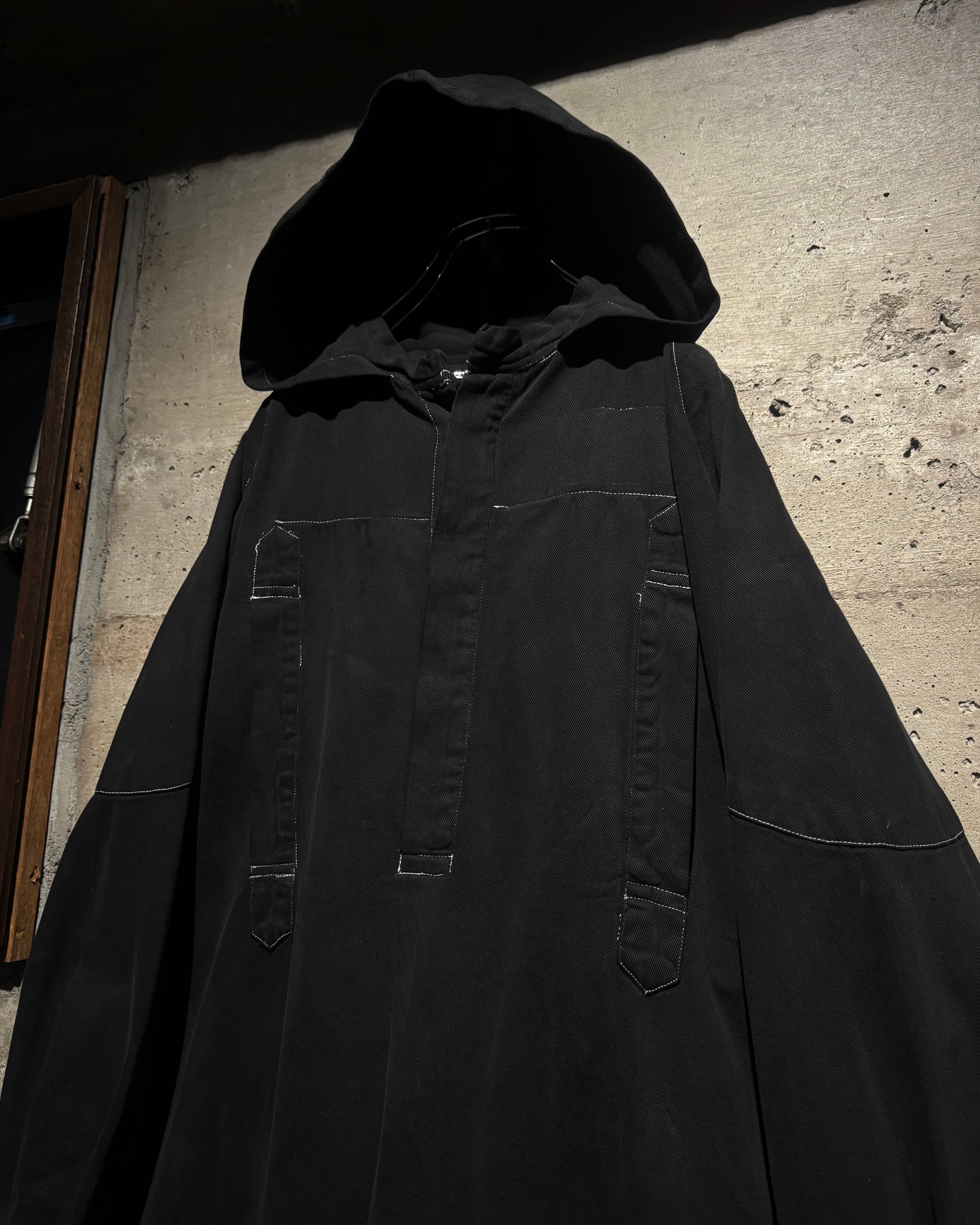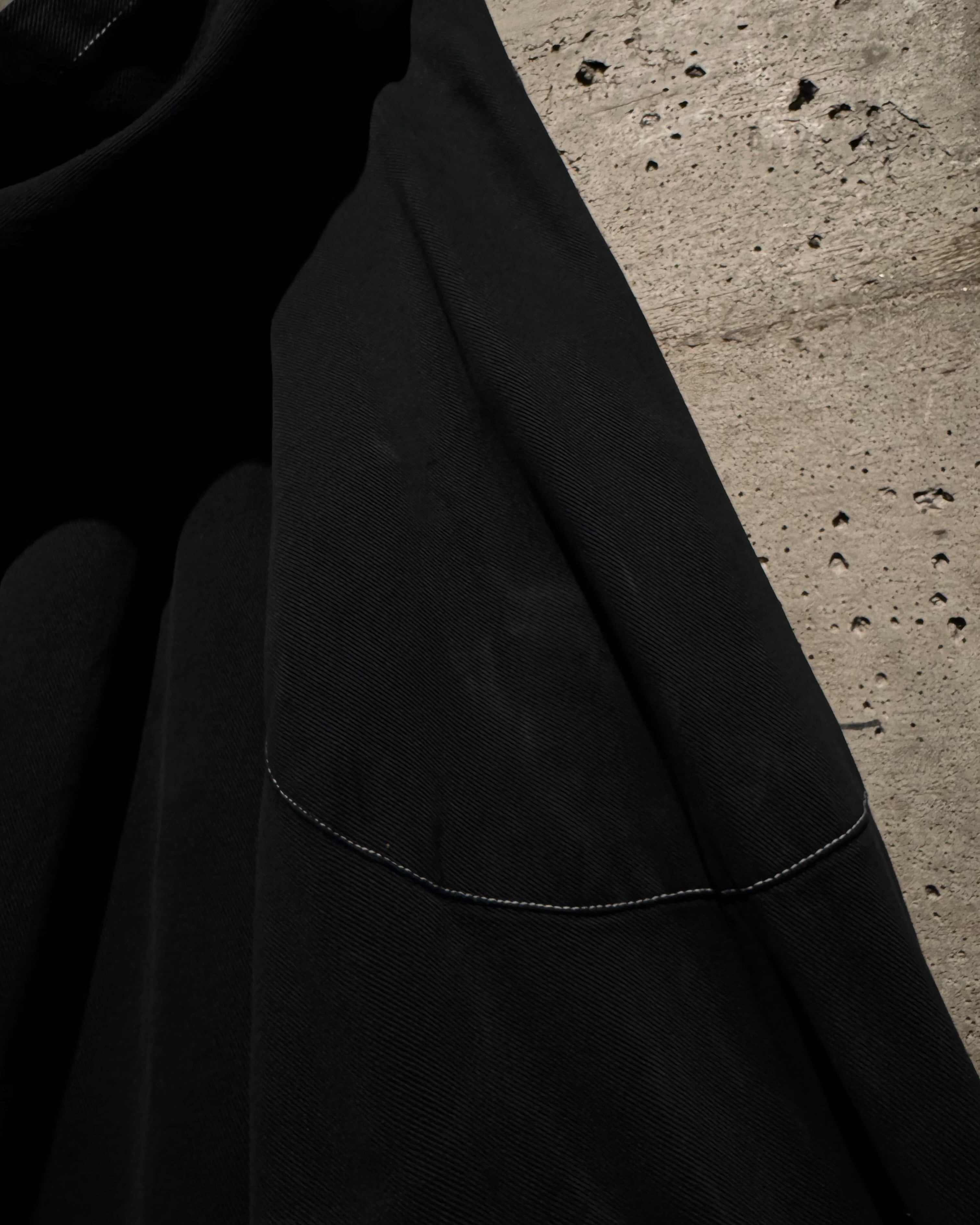 ガーメントダイによる無機質なブラックの佇まいが際立つ、オーバーシルエットのスモックコート。