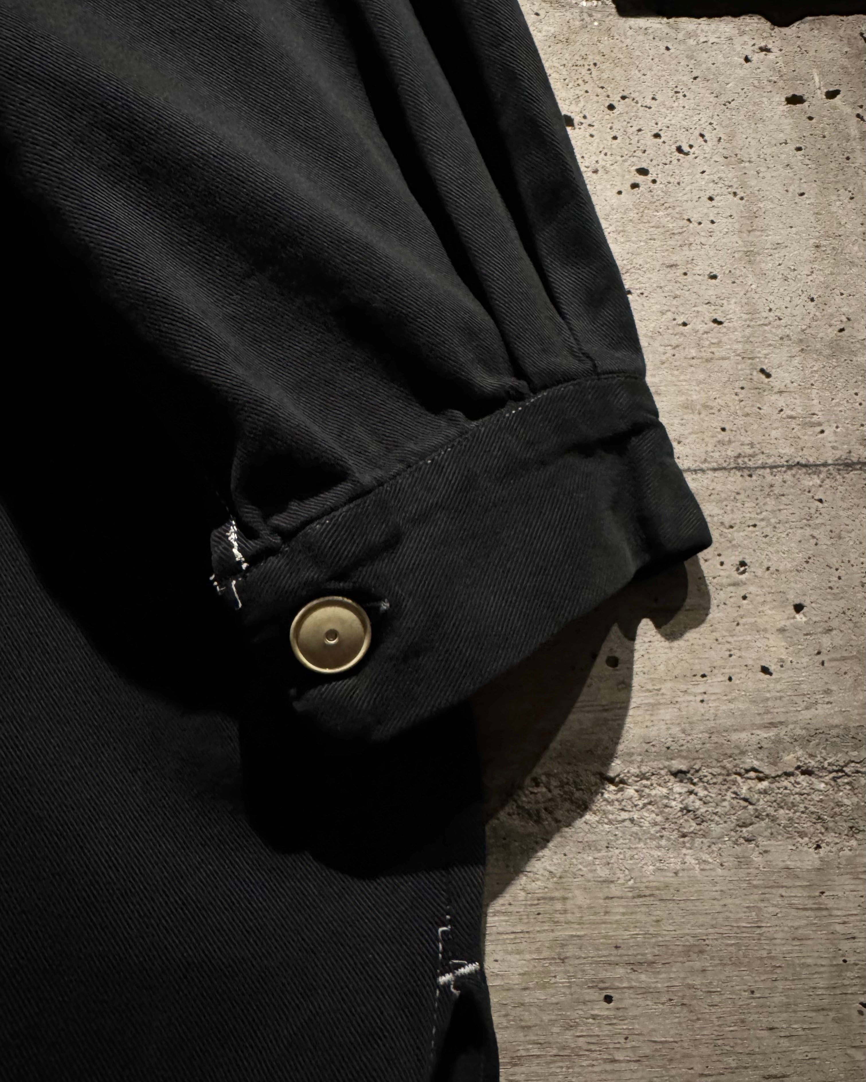ボディはハリとしなやかさを兼ね備えたコットンツイルを採用。フロントはハーフボタン仕様、比翼仕立てのミニマルなデザインで、無駄を削ぎ落としたソリッドなルックスに仕上がっています。