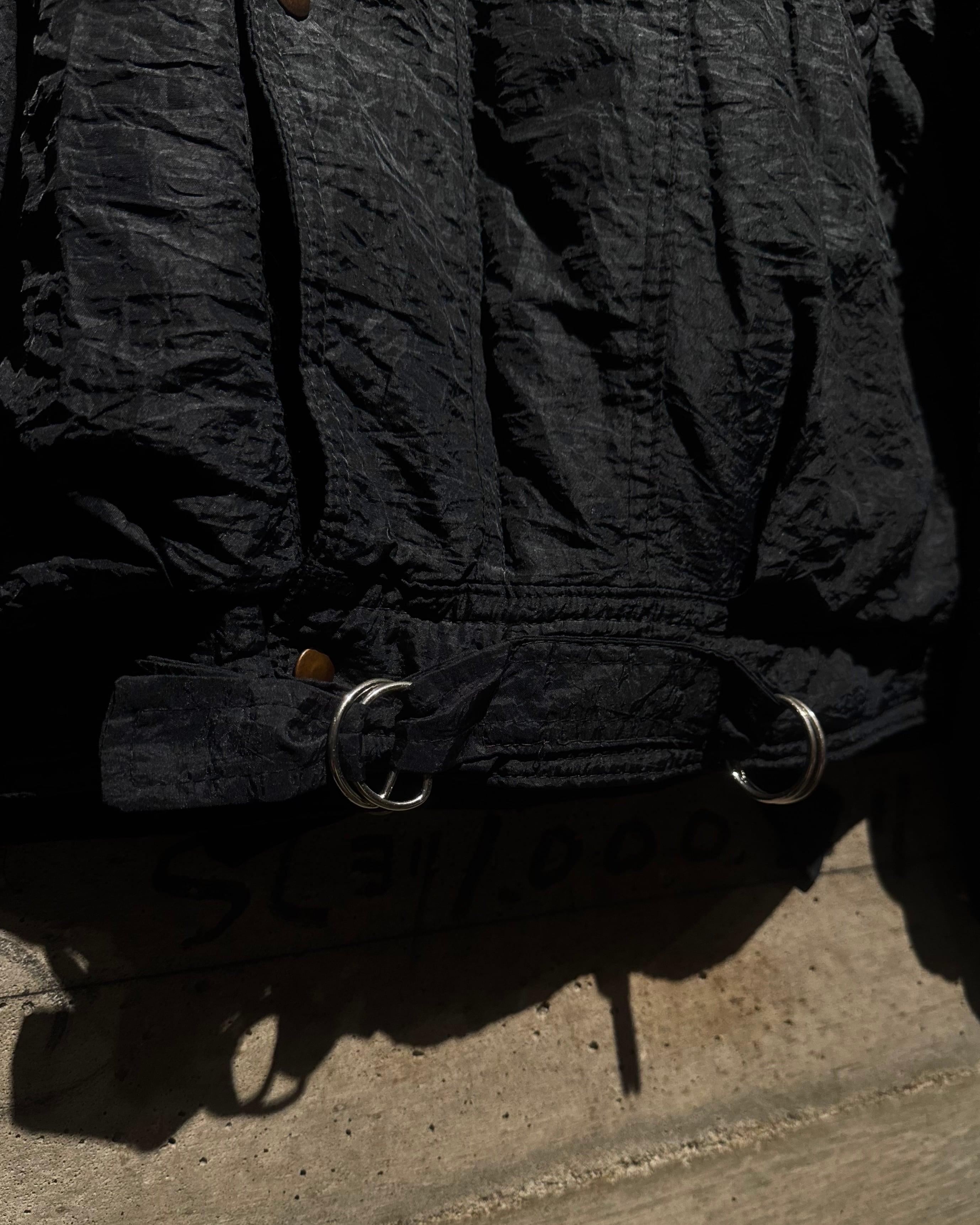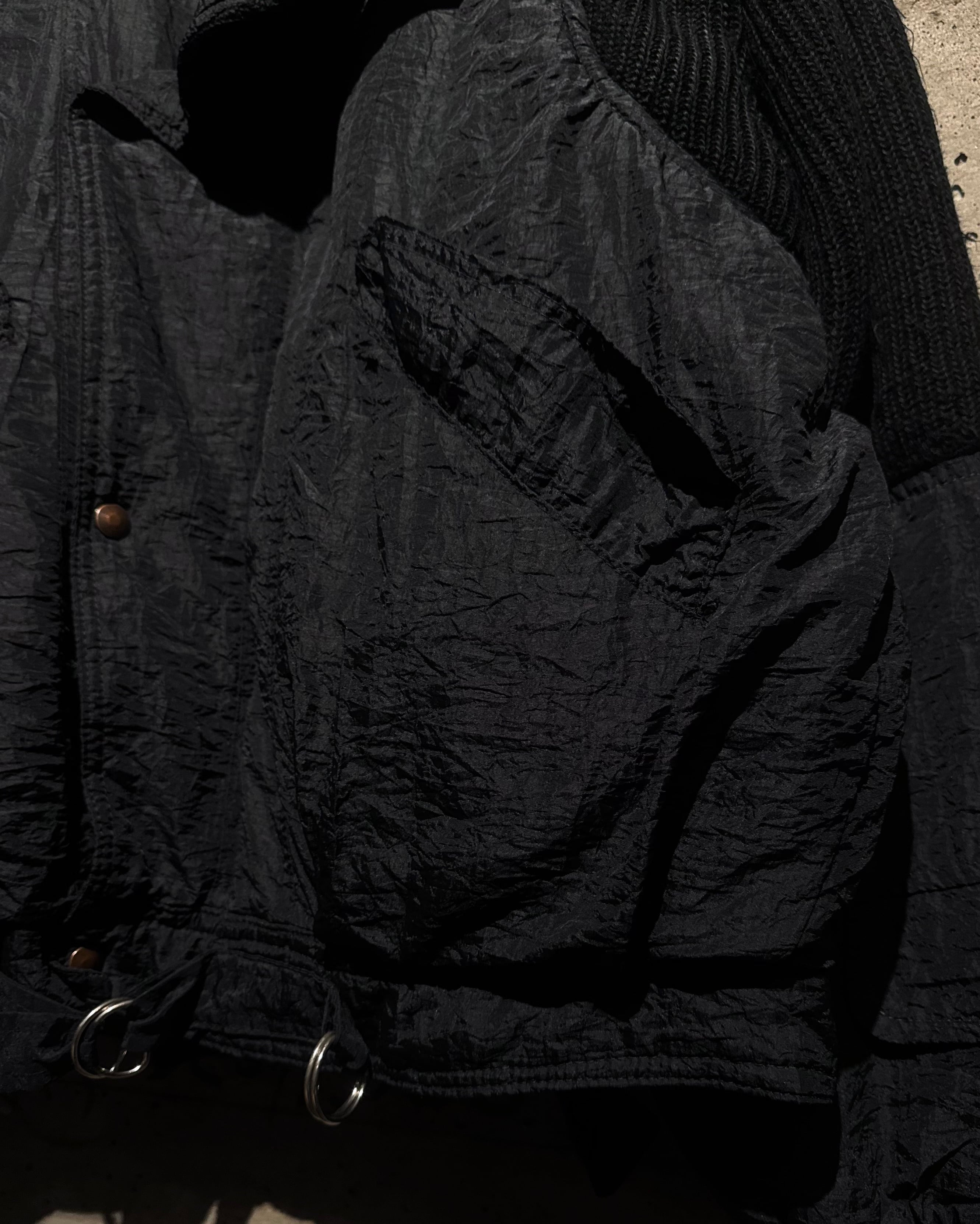 ブラックのワントーンで統一しつつ、ハイブリッドな素材使いによってアクセントをつけた、80'sユーロヴィンテージの2WAYナイロンジャケット。