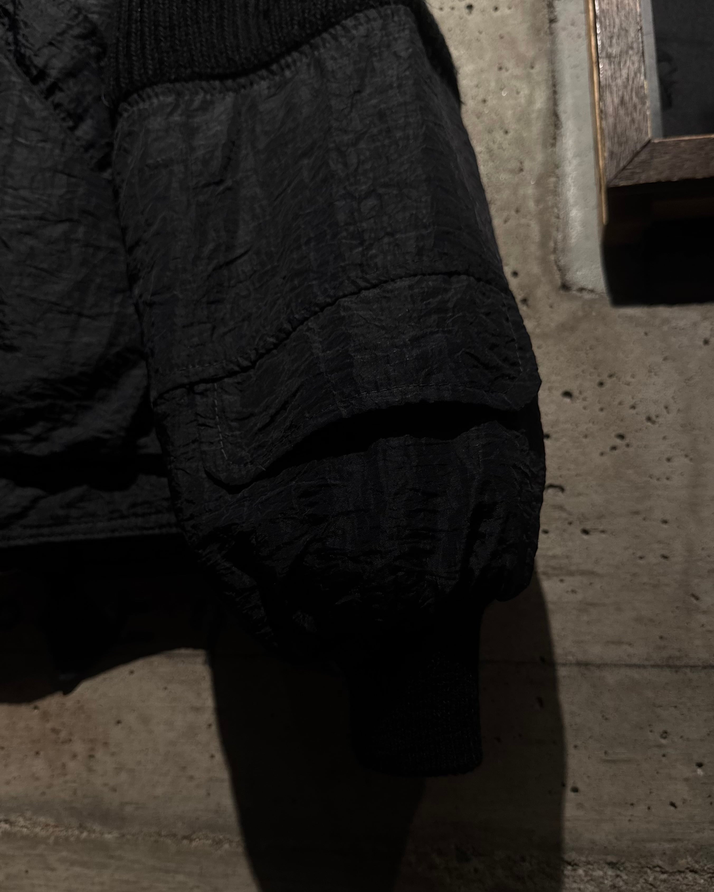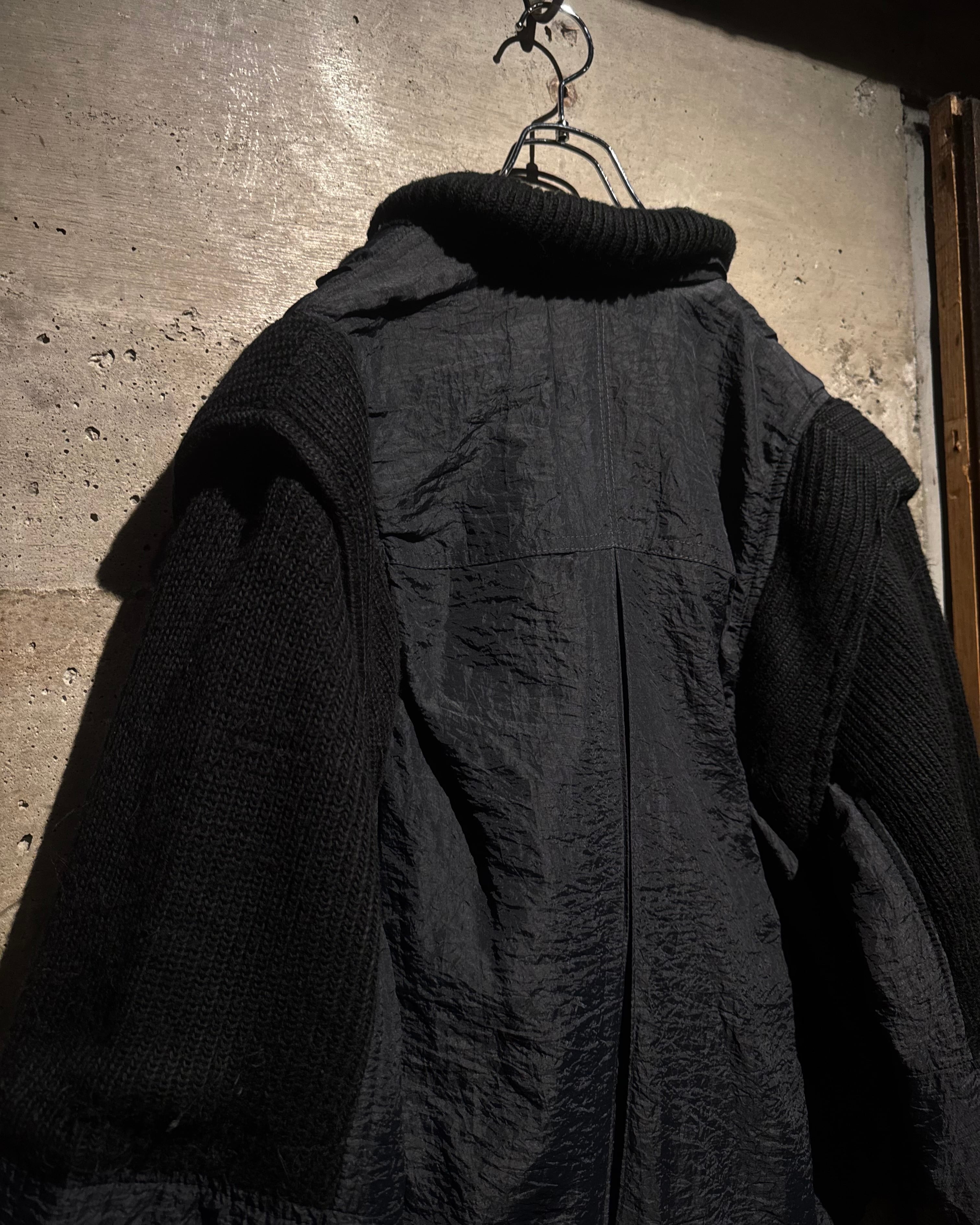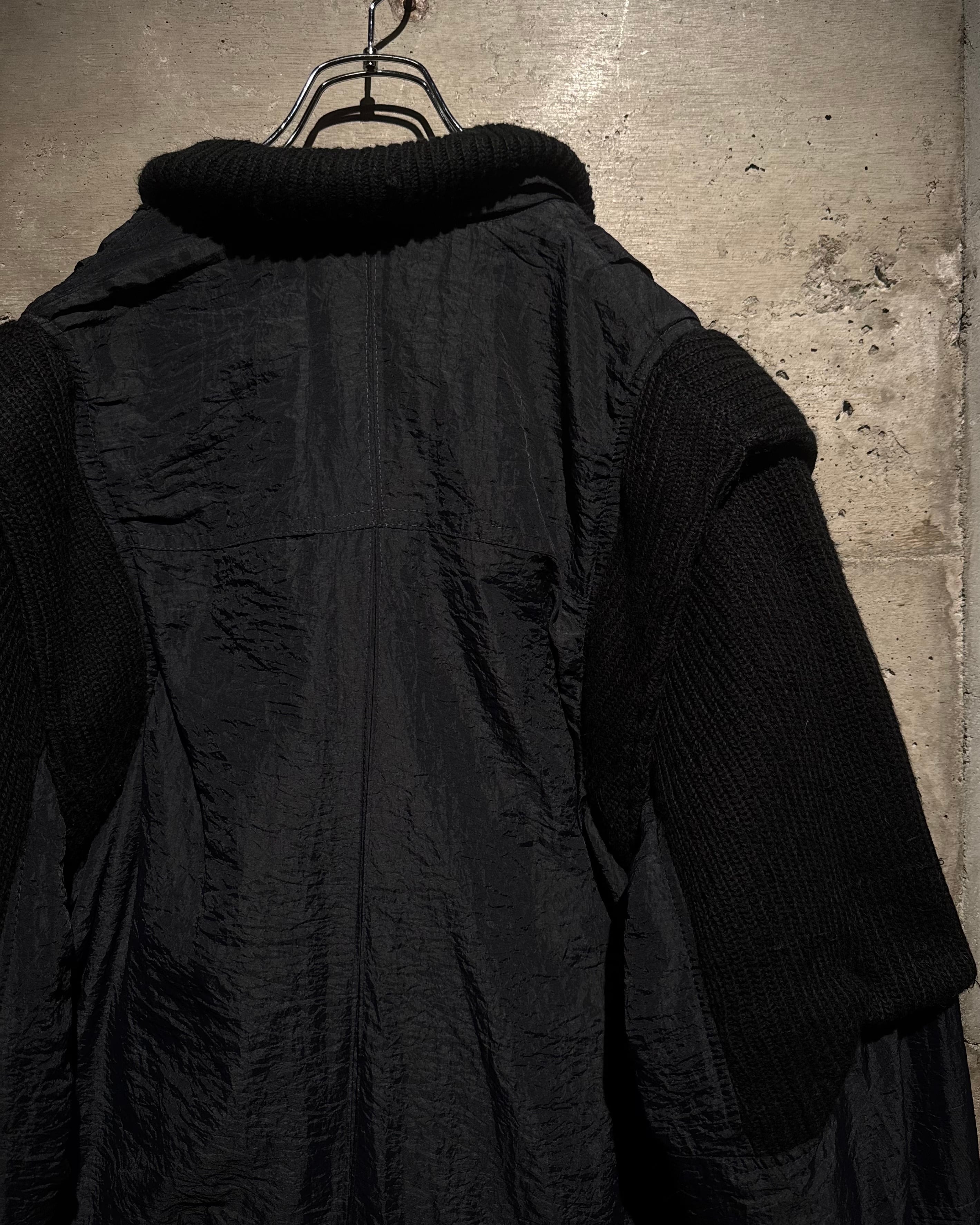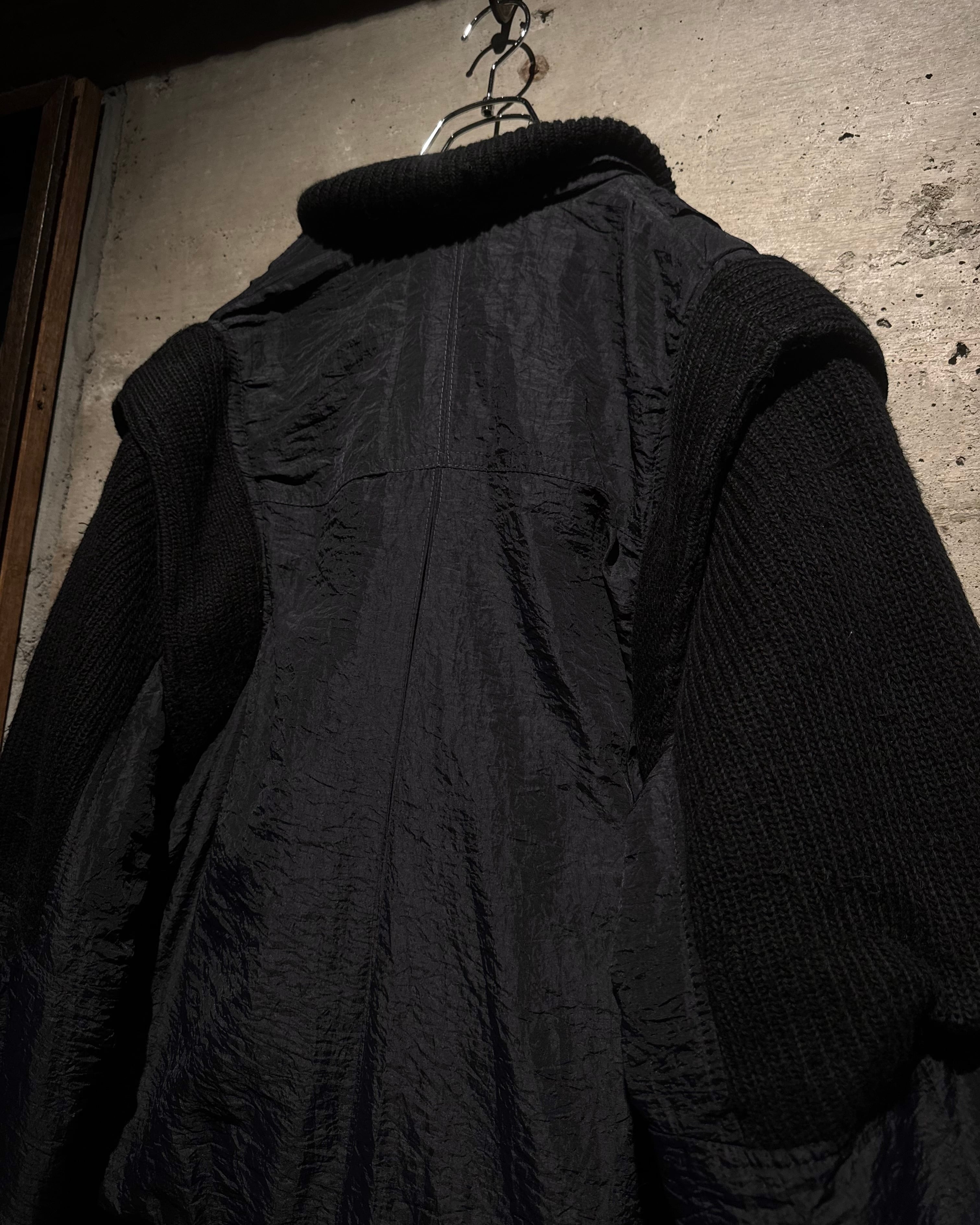 ボディには年代特有の光沢を帯びたナイロンファブリックを採用。アームと襟周りには肉厚なニットを大胆に切り替えを施し、ナイロン特有の光沢とシワ、ローゲージニットの編み地がコントラストを生み、ワントーンながらも奥行きのある表情に仕上がっています。