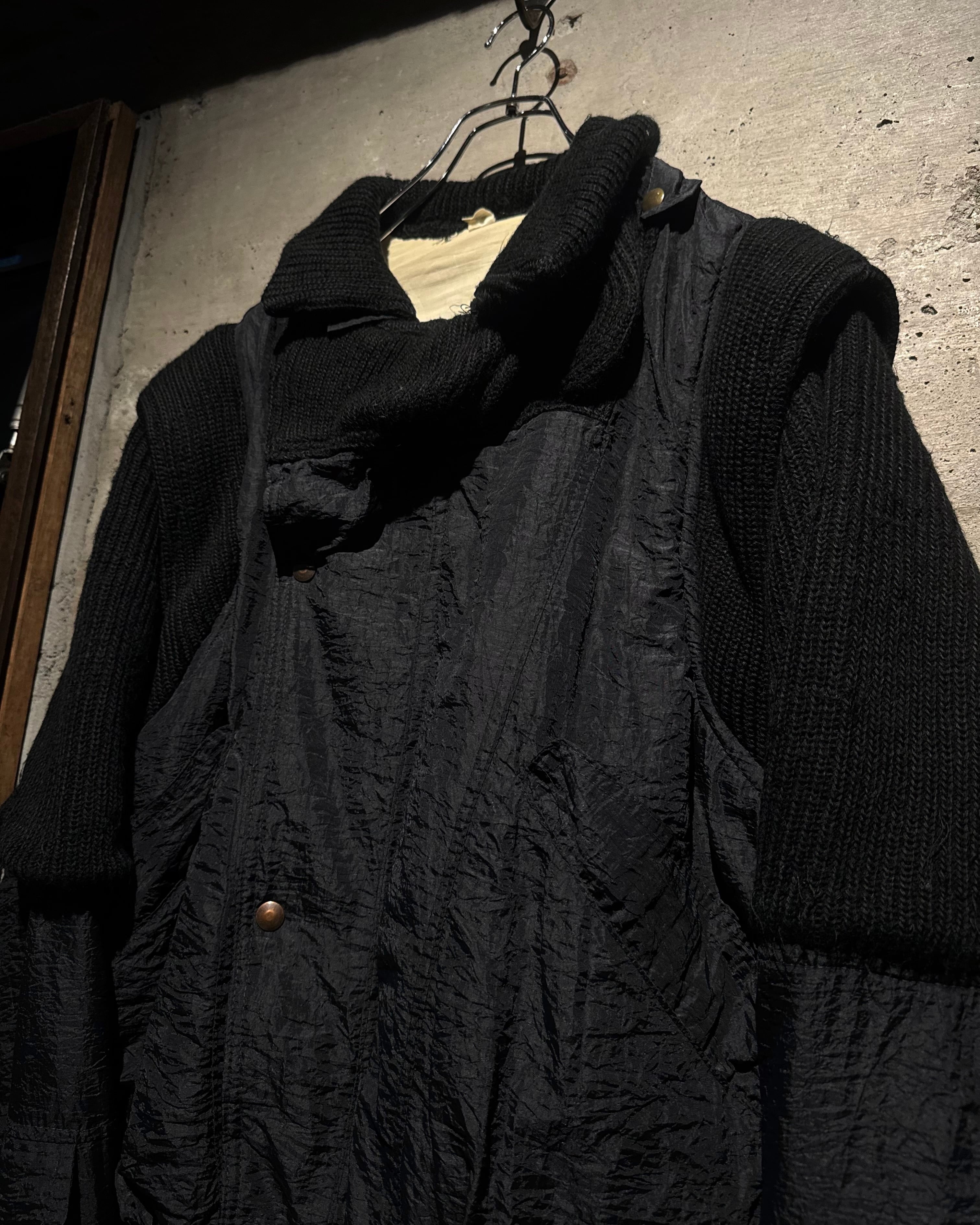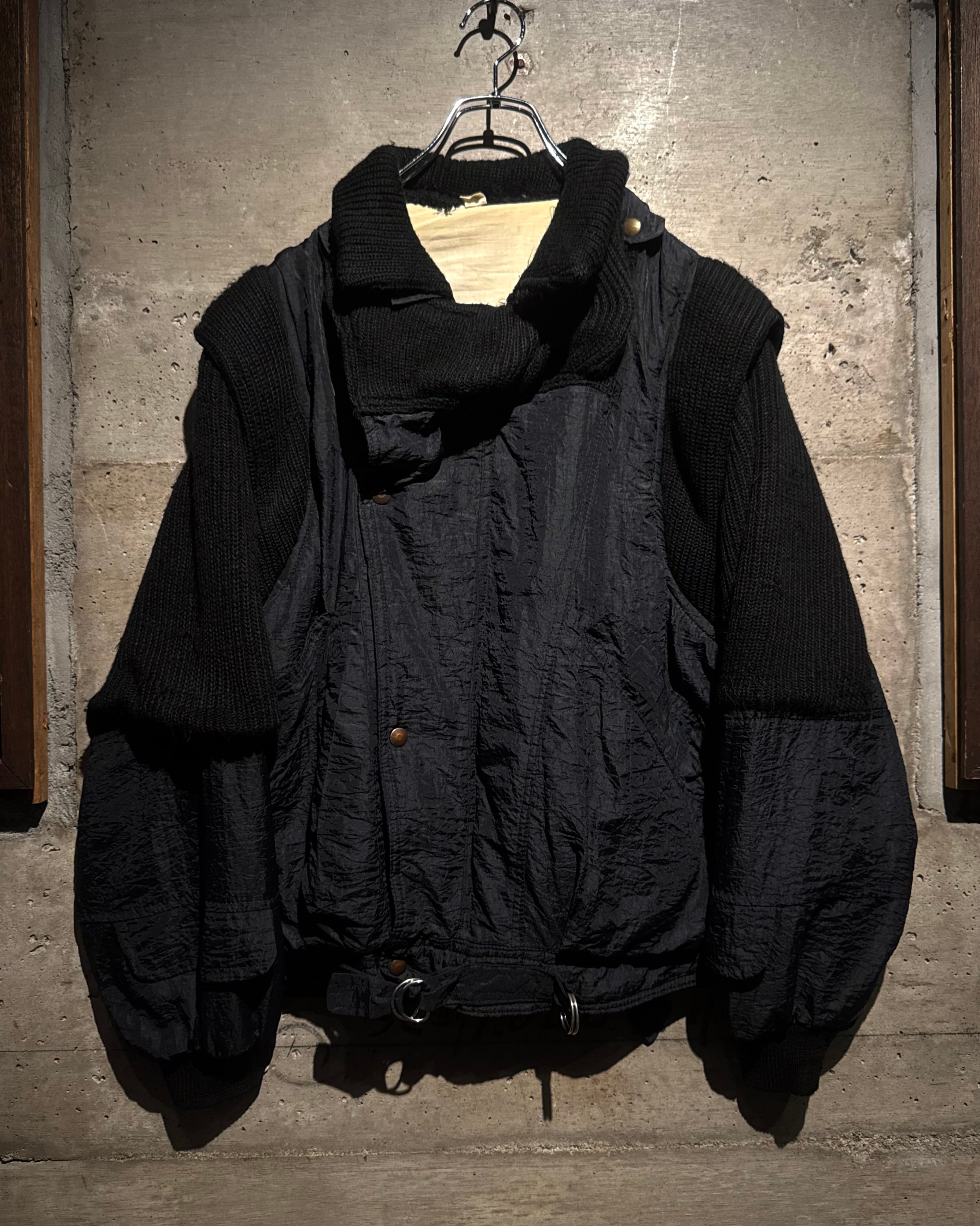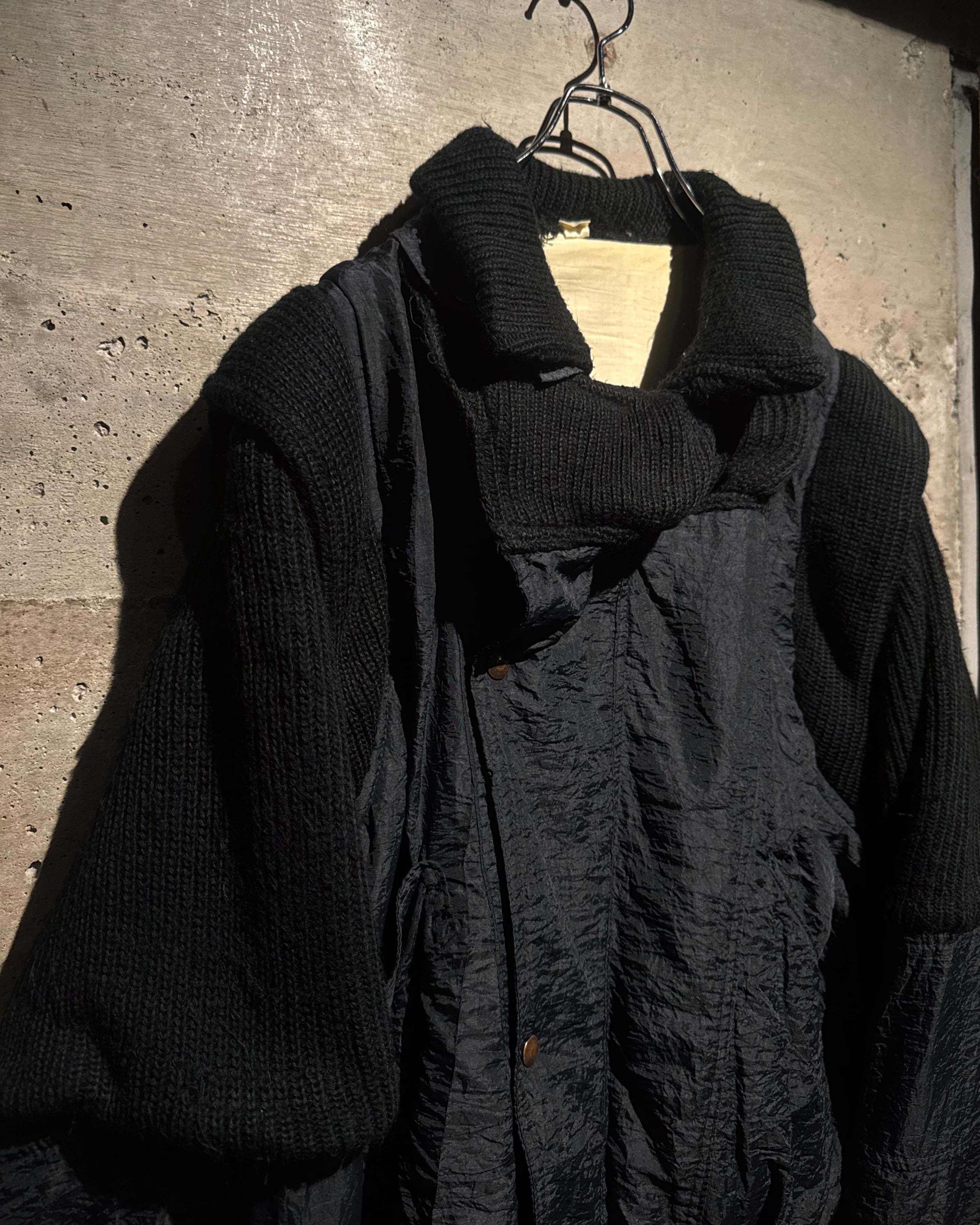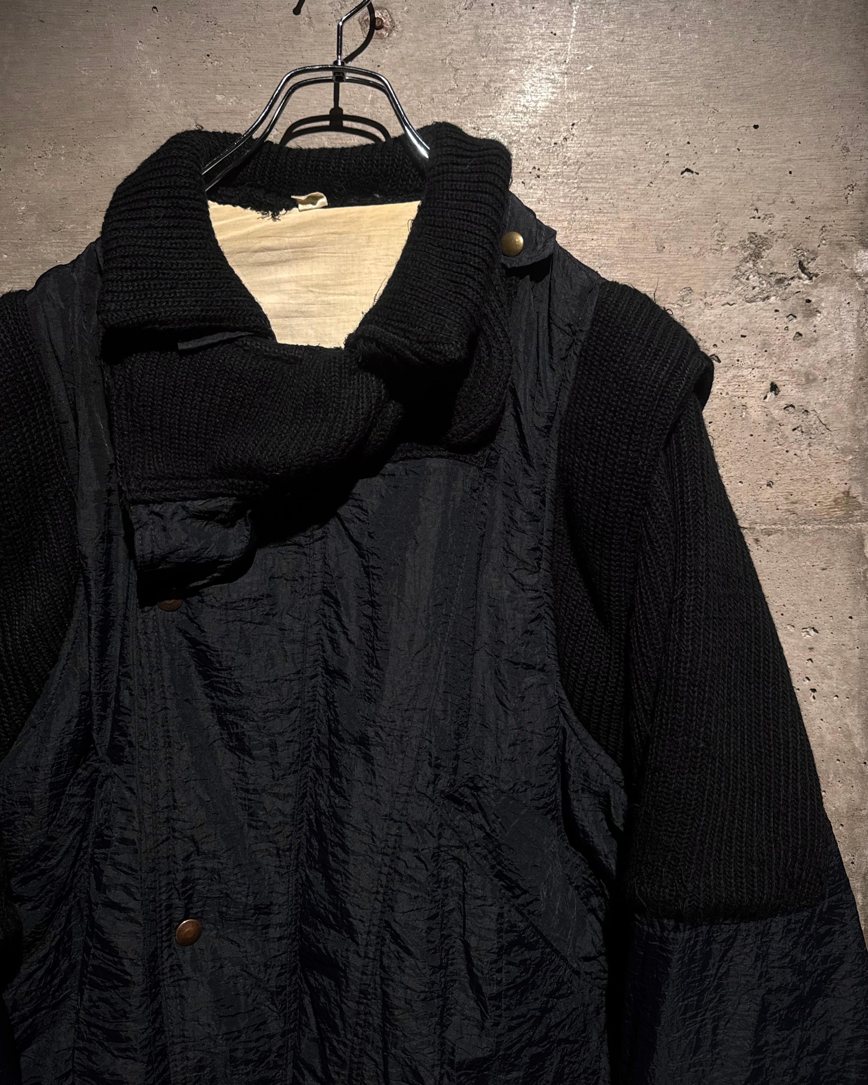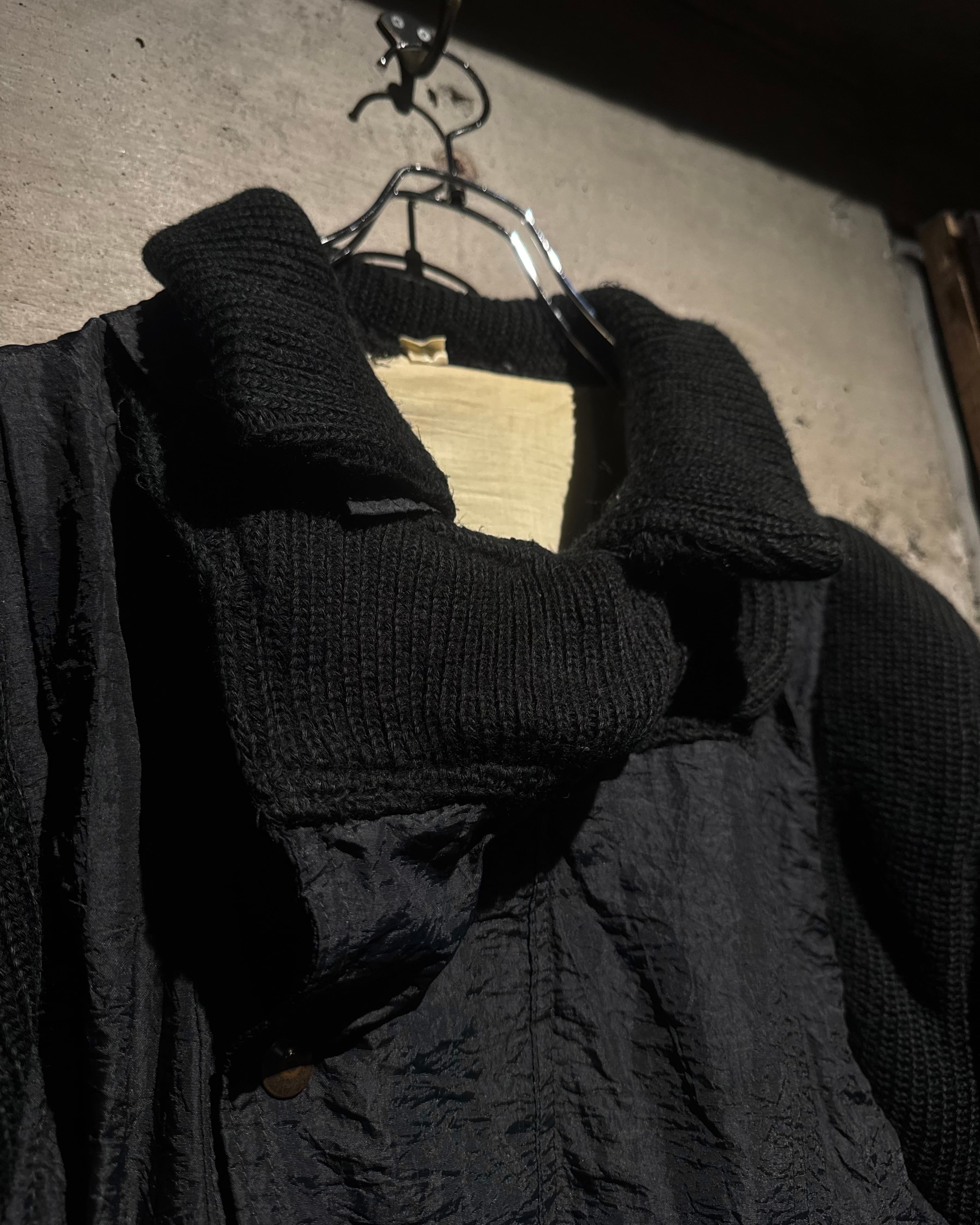 ボディには年代特有の光沢を帯びたナイロンファブリックを採用。アームと襟周りには肉厚なニットを大胆に切り替えを施し、ナイロン特有の光沢とシワ、ローゲージニットの編み地がコントラストを生み、ワントーンながらも奥行きのある表情に仕上がっています。