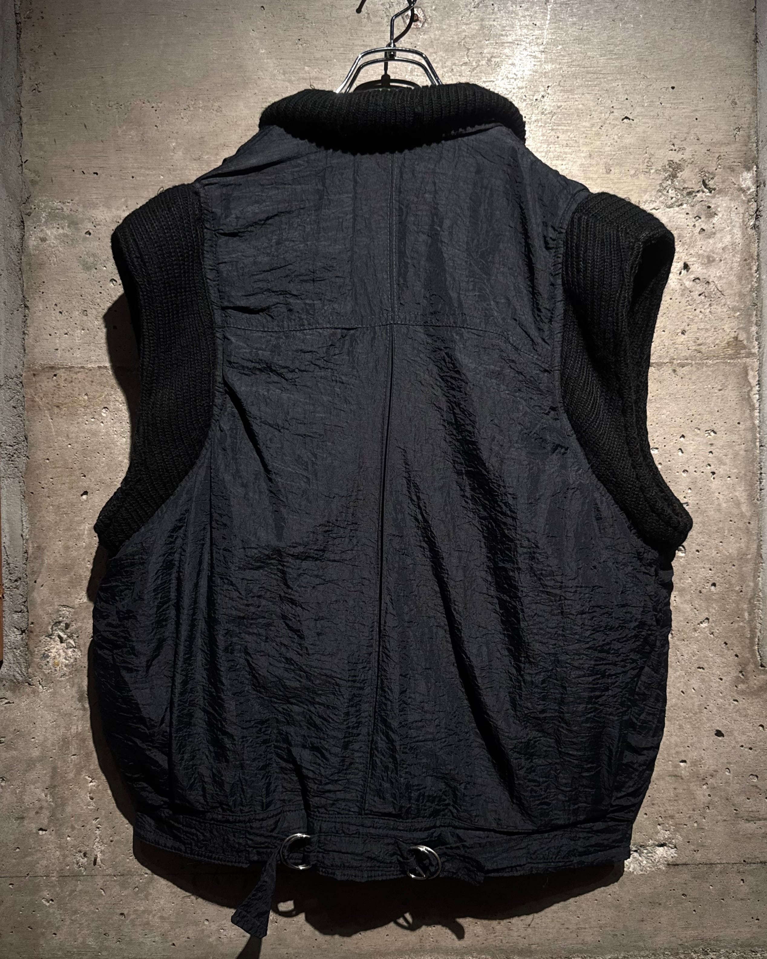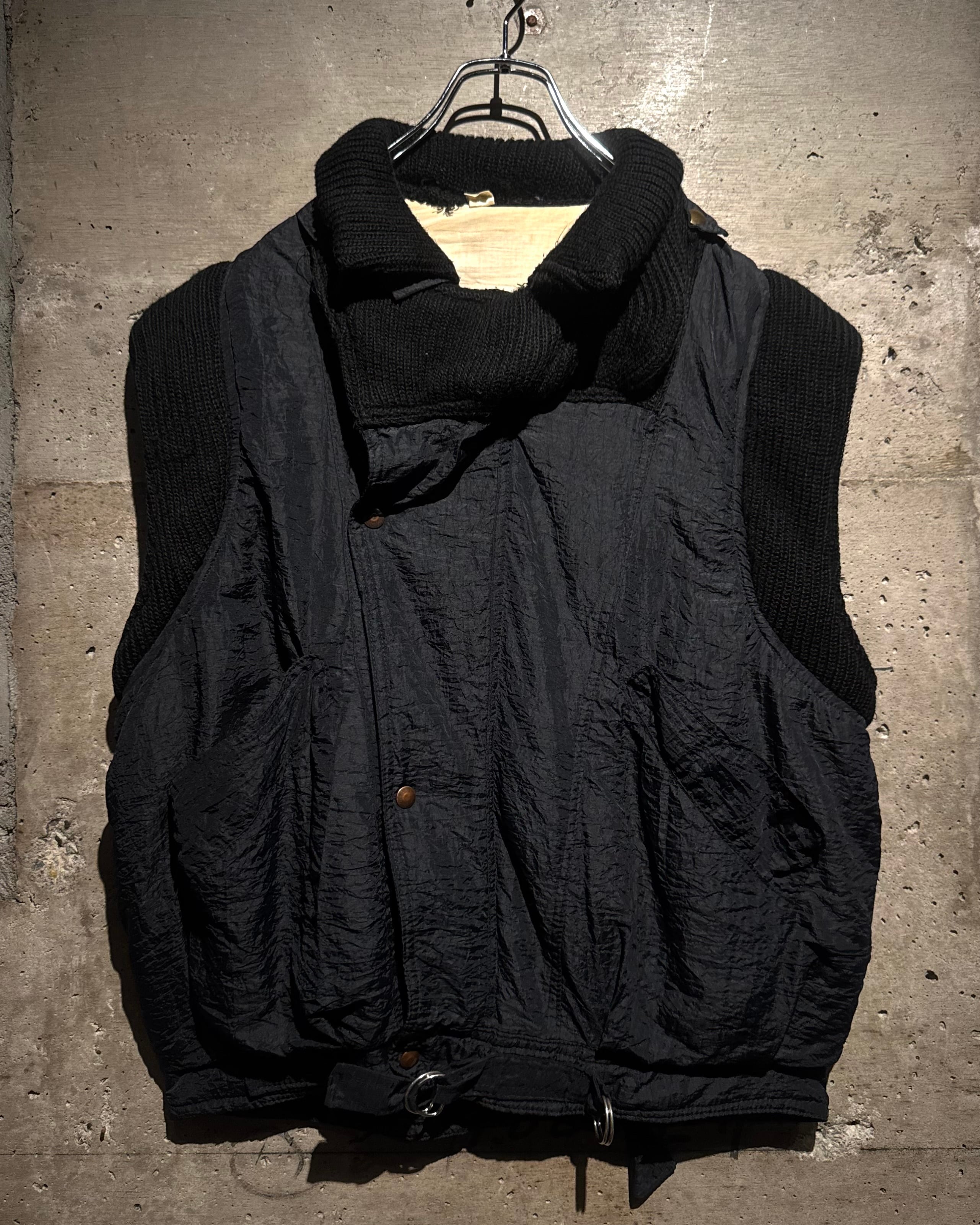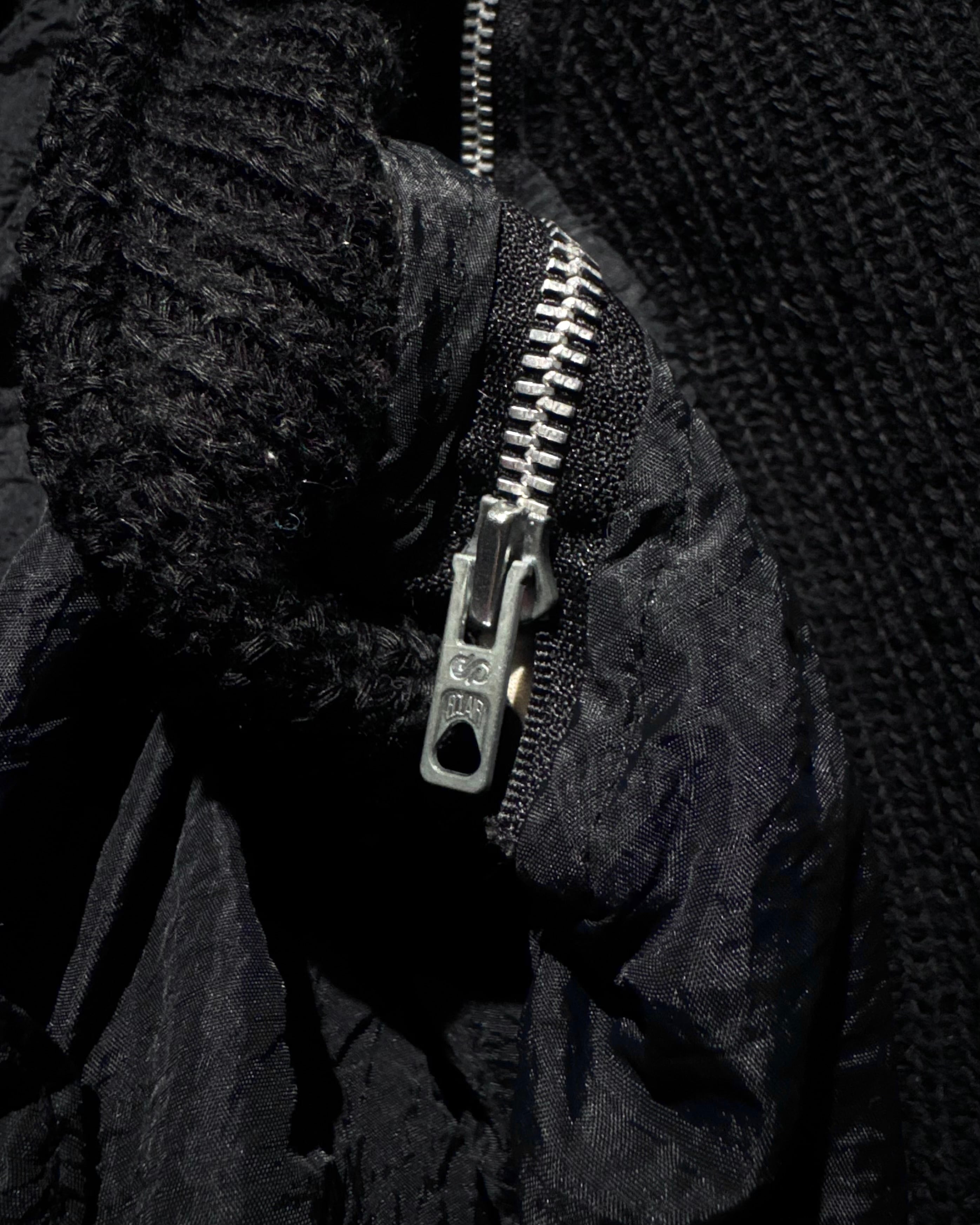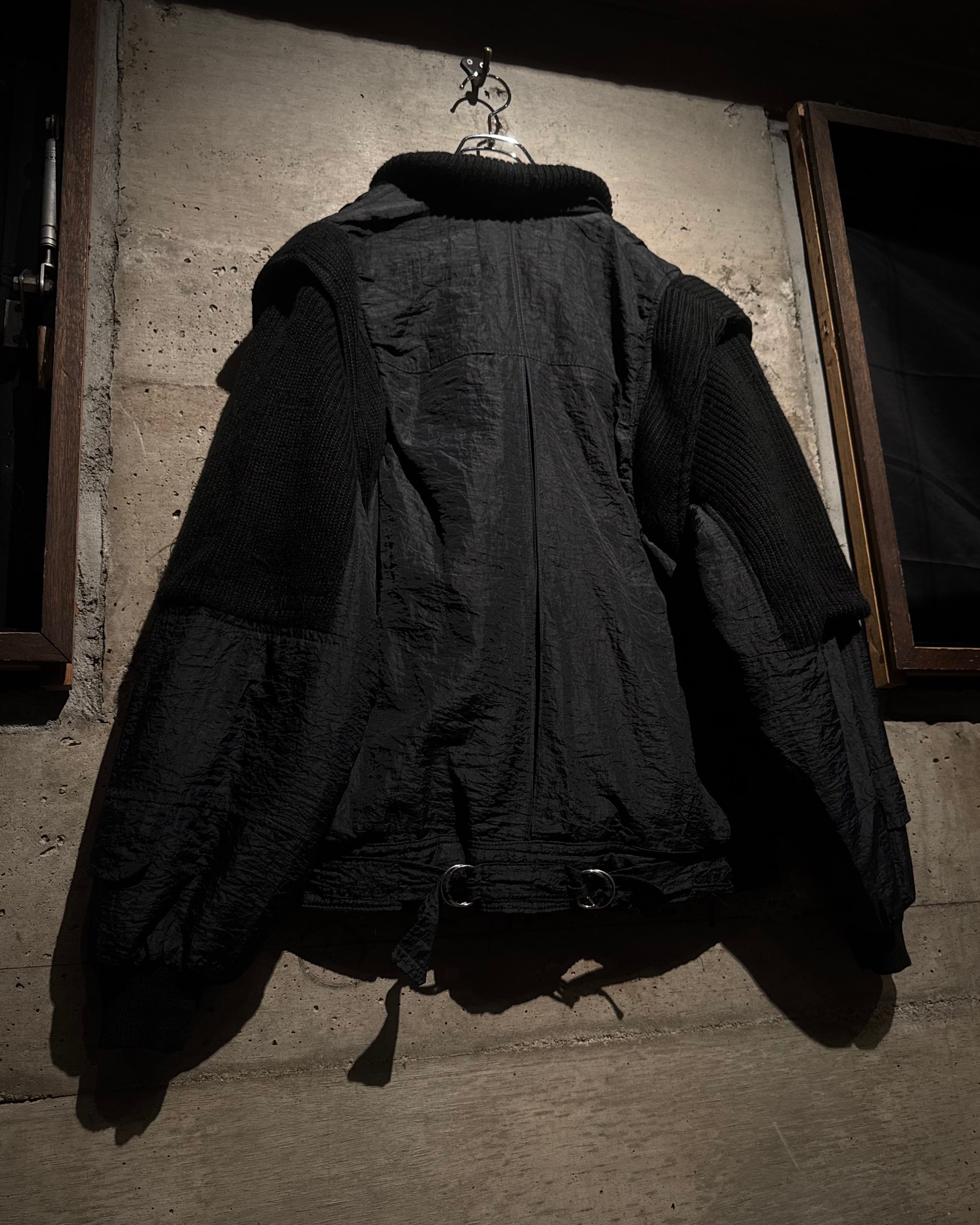 ボディには年代特有の光沢を帯びたナイロンファブリックを採用。アームと襟周りには肉厚なニットを大胆に切り替えを施し、ナイロン特有の光沢とシワ、ローゲージニットの編み地がコントラストを生み、ワントーンながらも奥行きのある表情に仕上がっています。