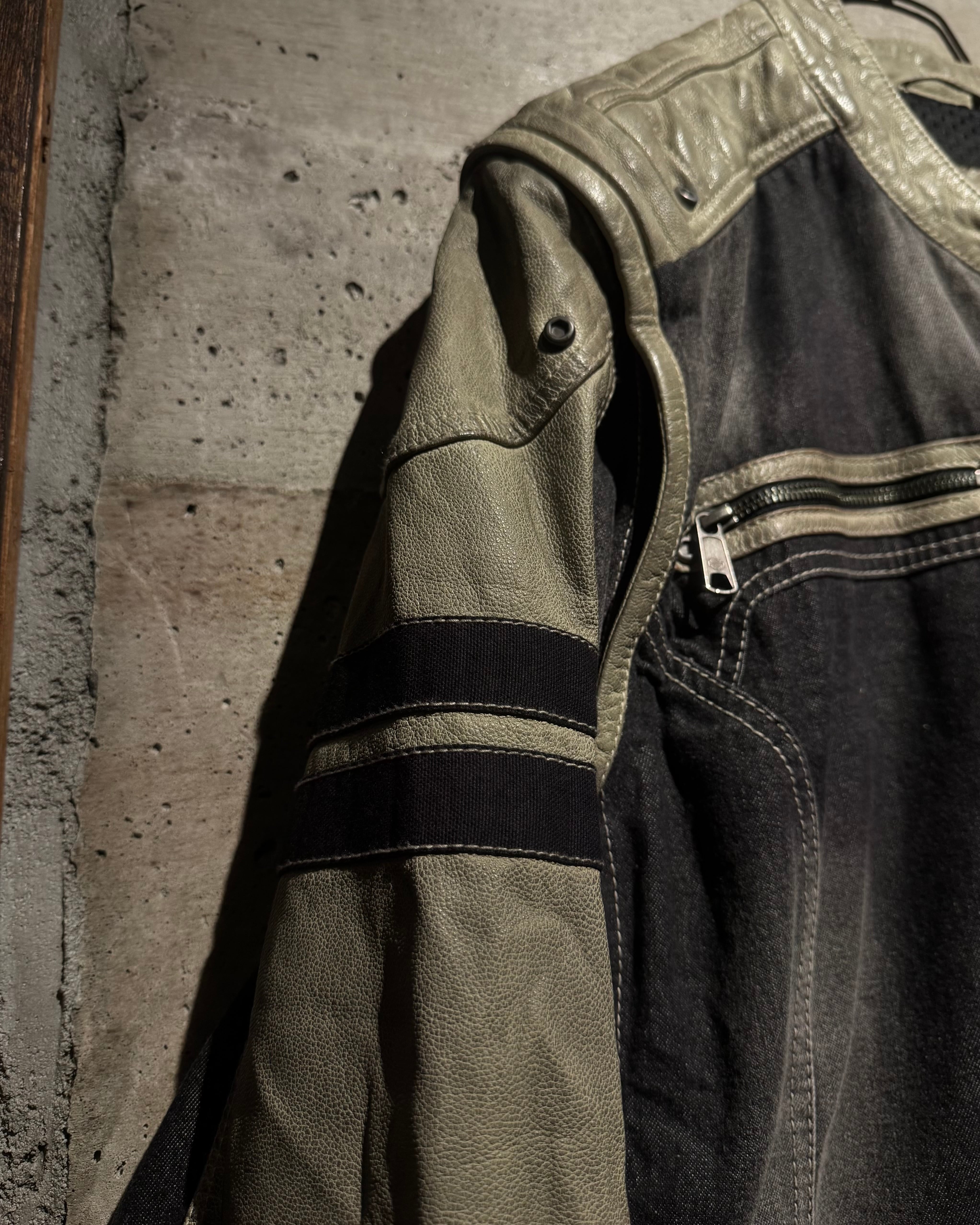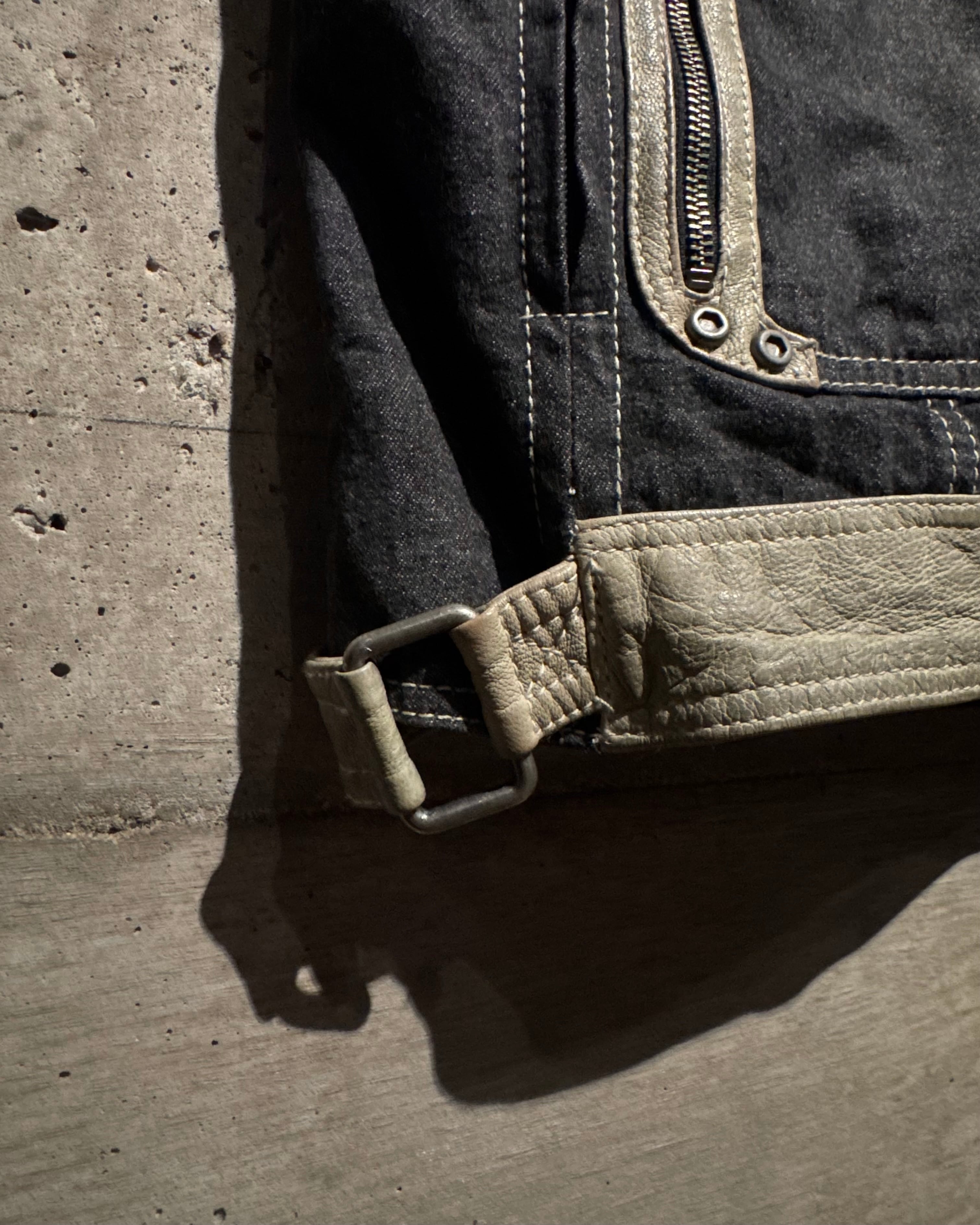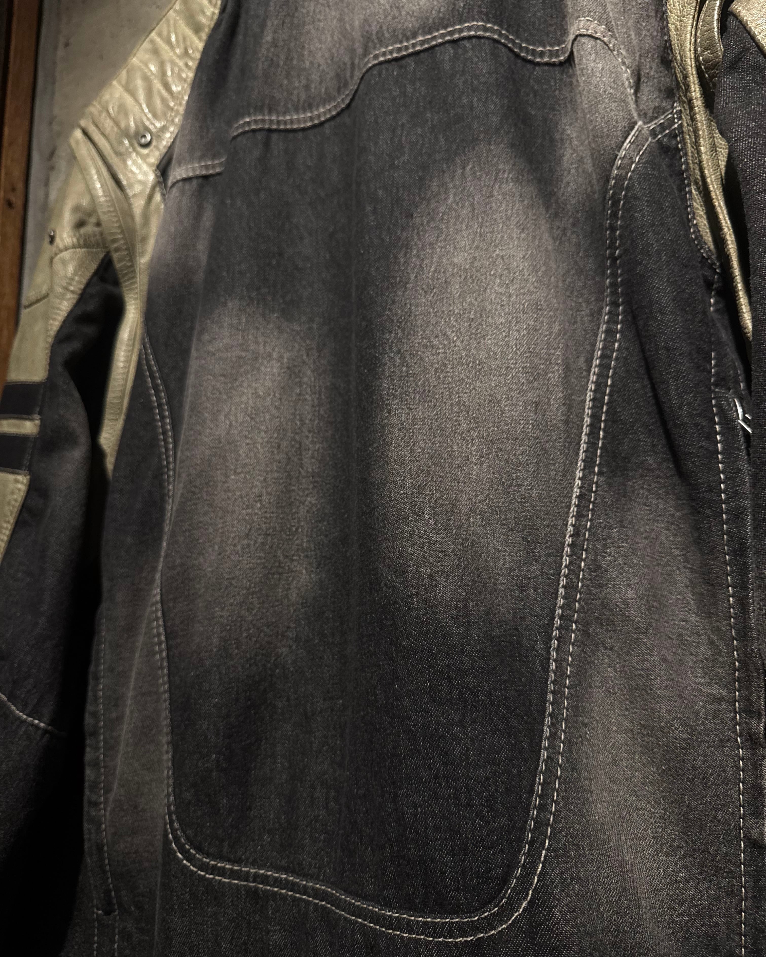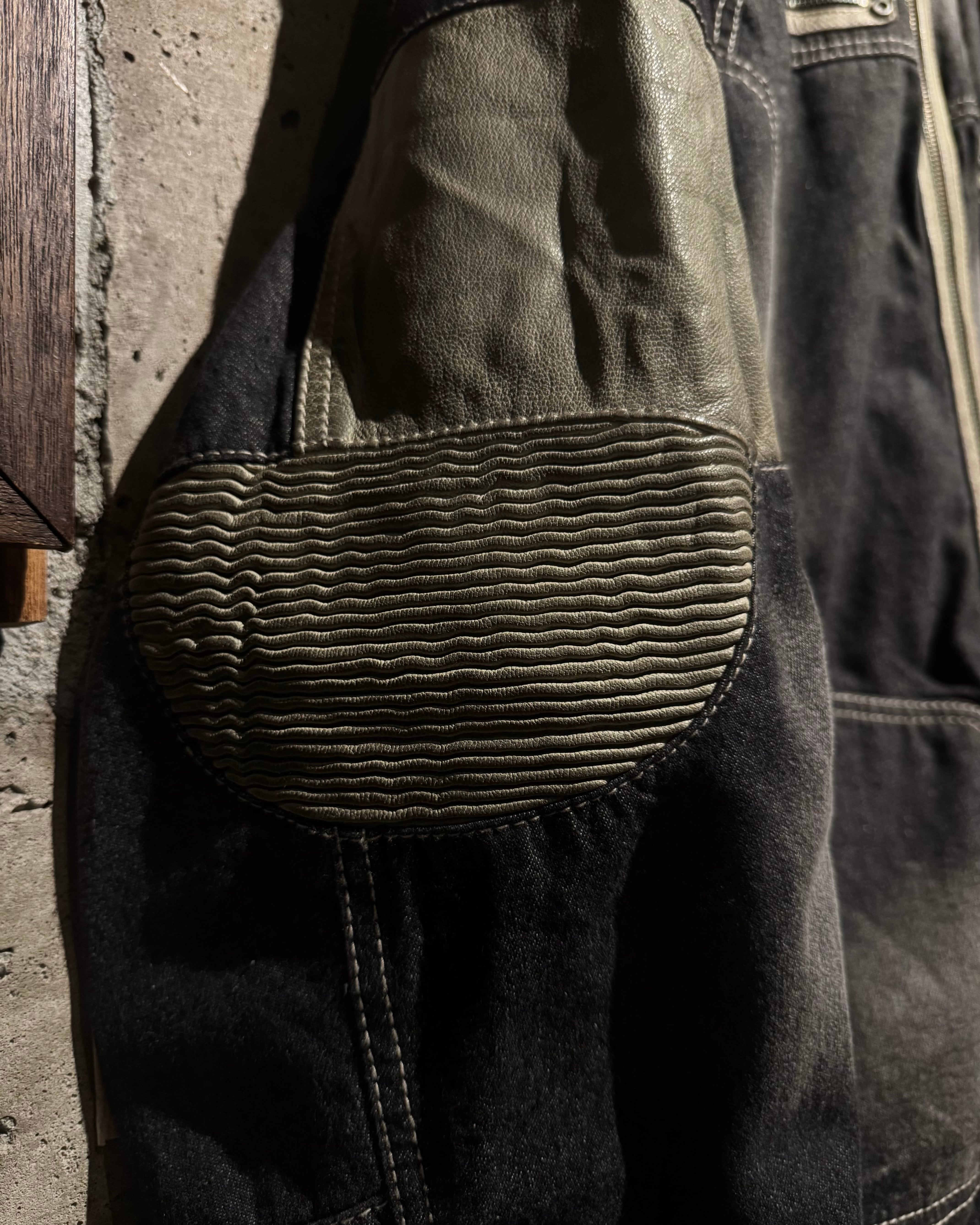 フェード感のあるブラックデニムをボディのベースに、ショルダー、アームやエルボー、裾部分。上質なゴートスキンレザーで切り替えた1着。