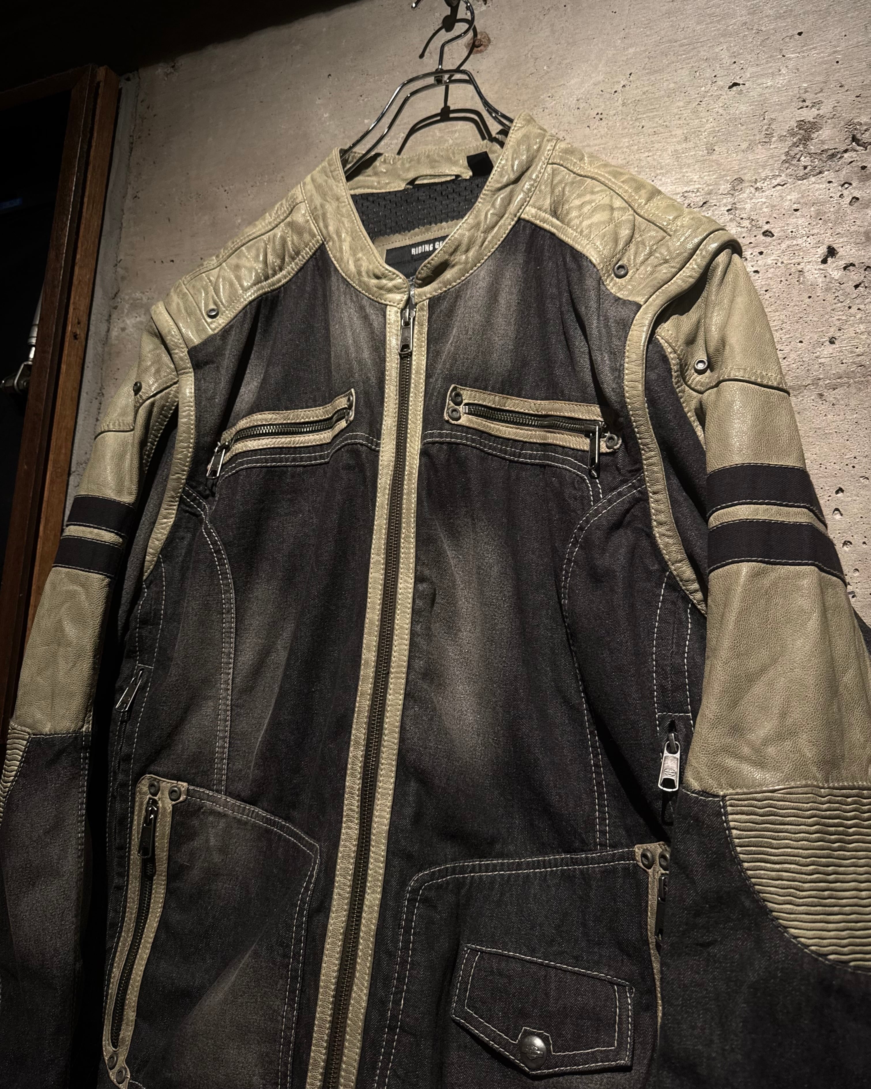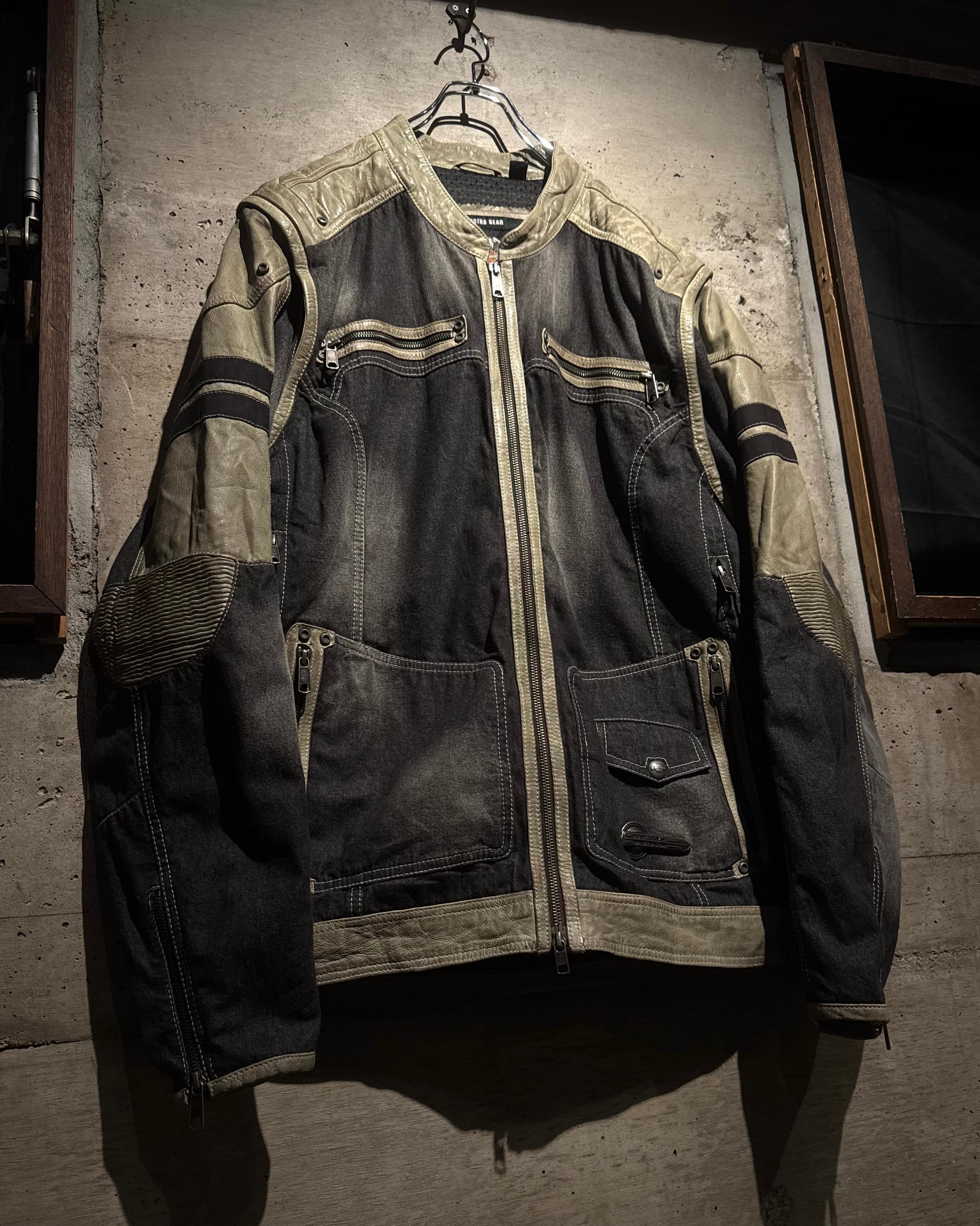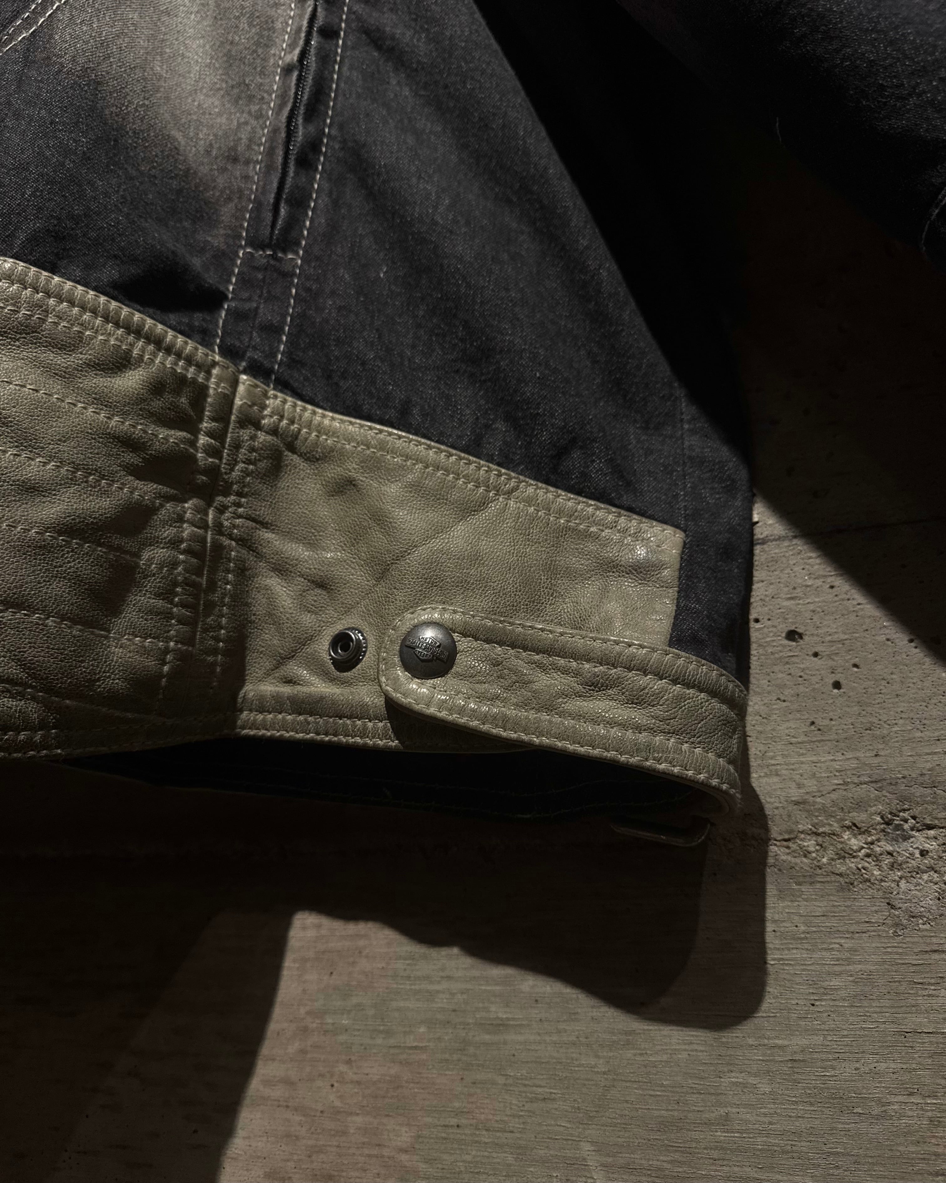 フェード感のあるブラックデニムをボディのベースに、ショルダー、アームやエルボー、裾部分。上質なゴートスキンレザーで切り替えた1着。
