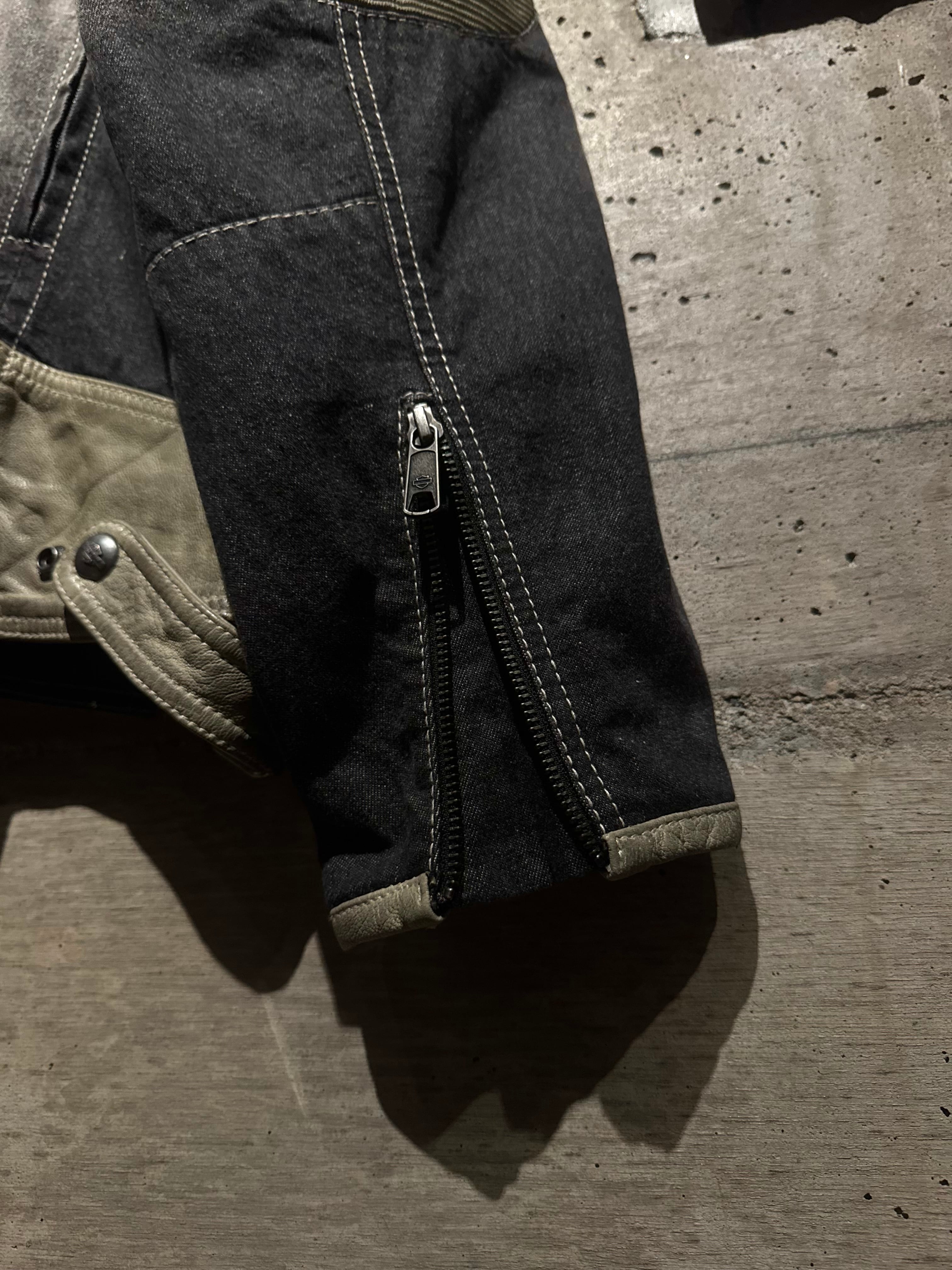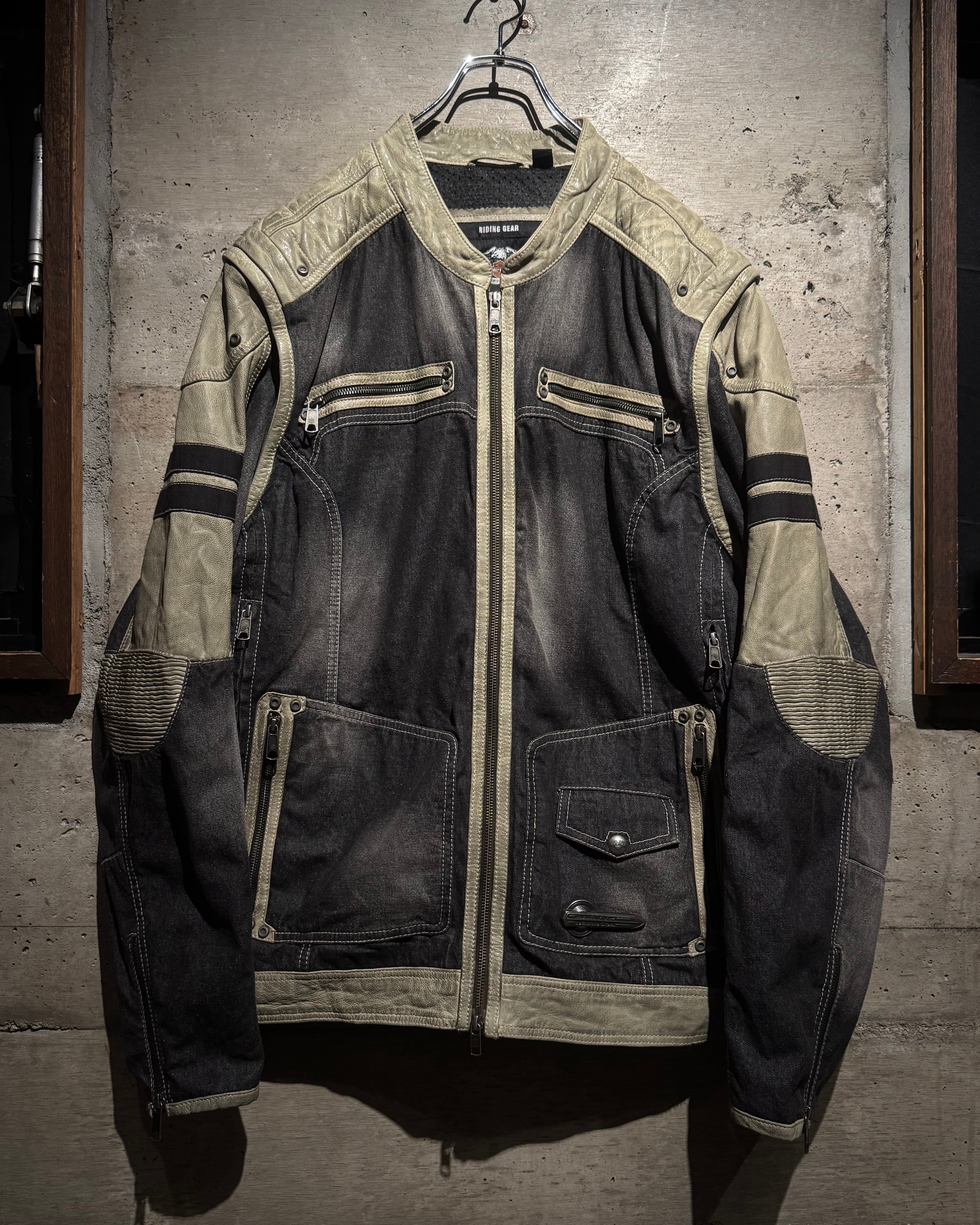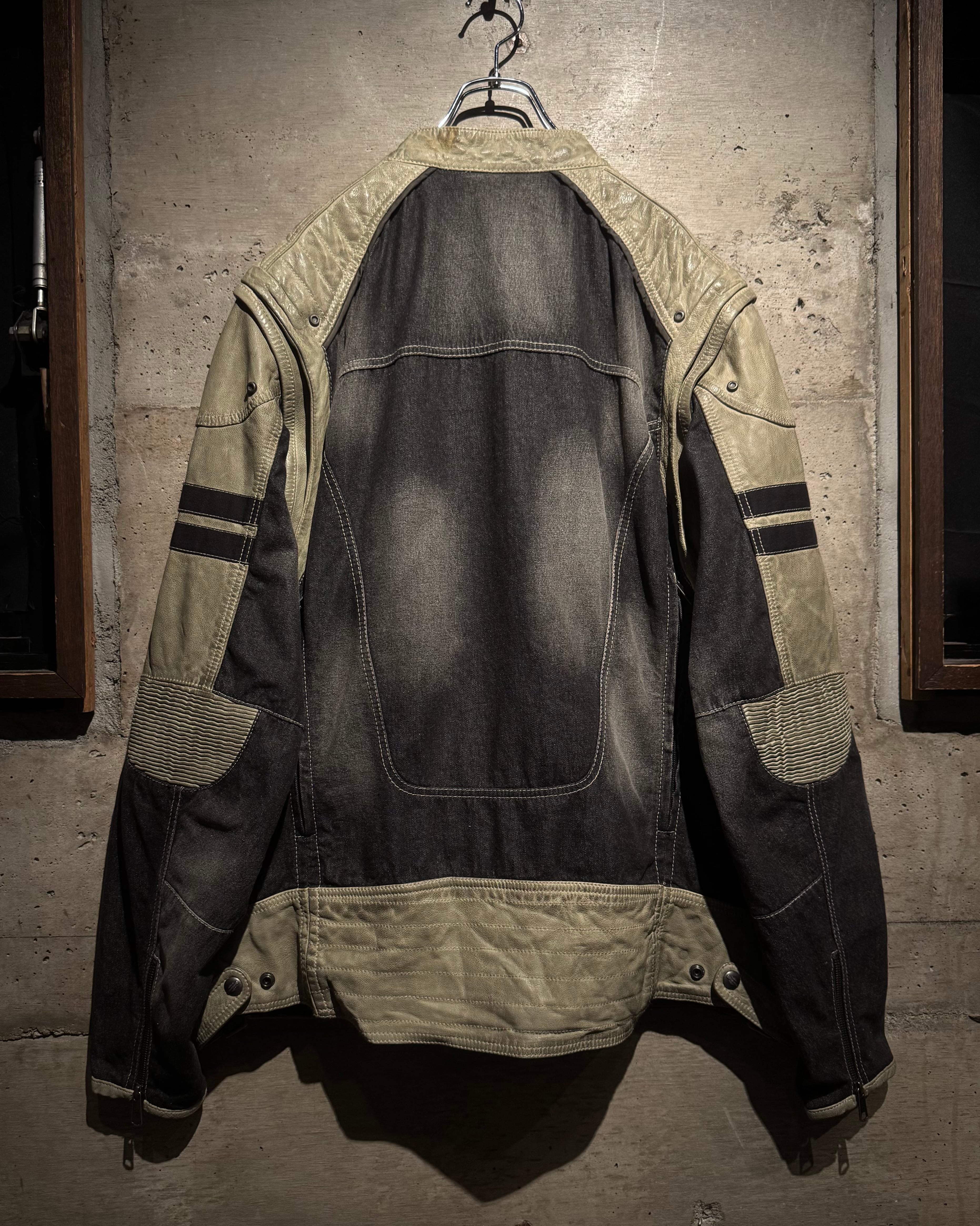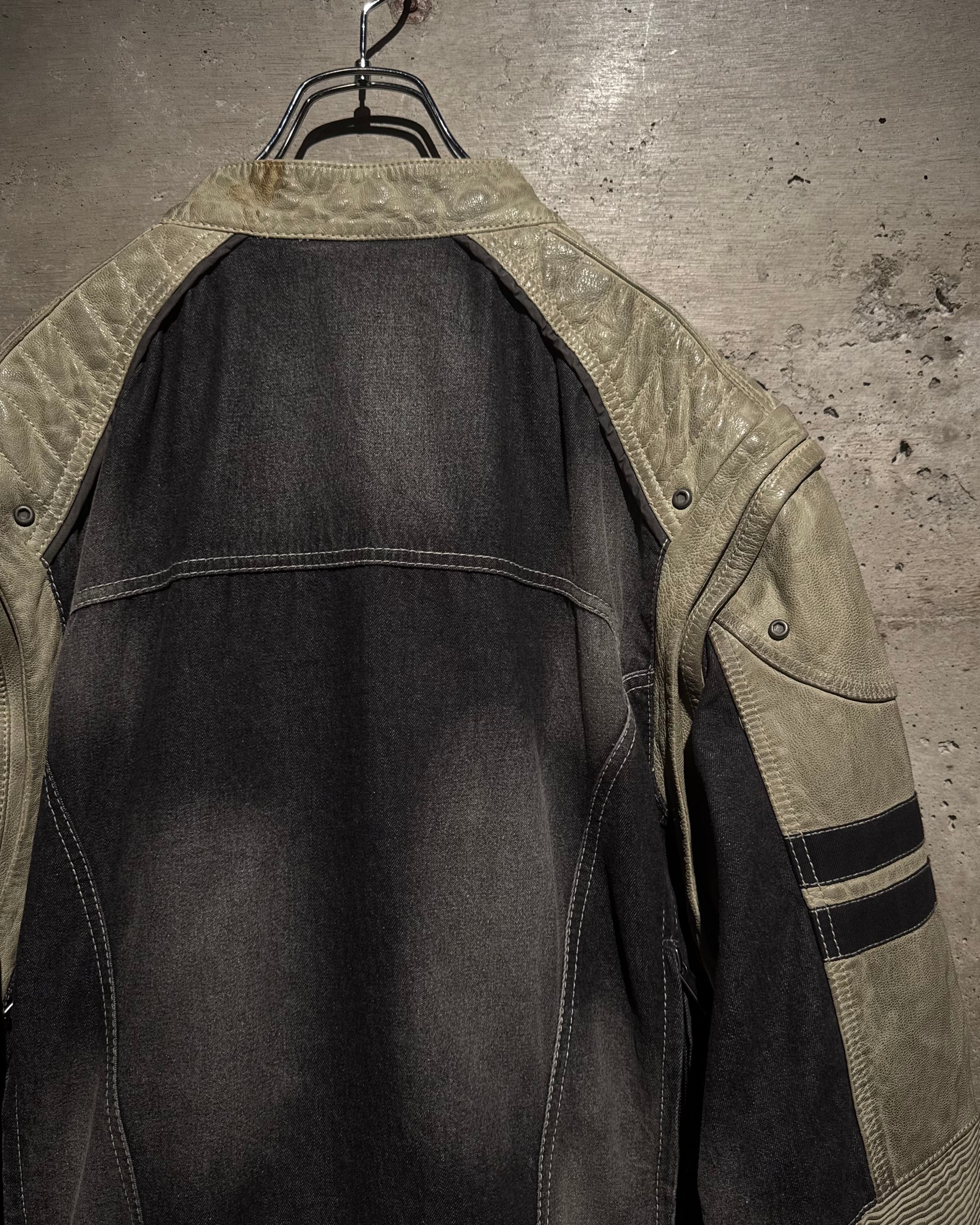フェード感のあるブラックデニムをボディのベースに、ショルダー、アームやエルボー、裾部分。上質なゴートスキンレザーで切り替えた1着。