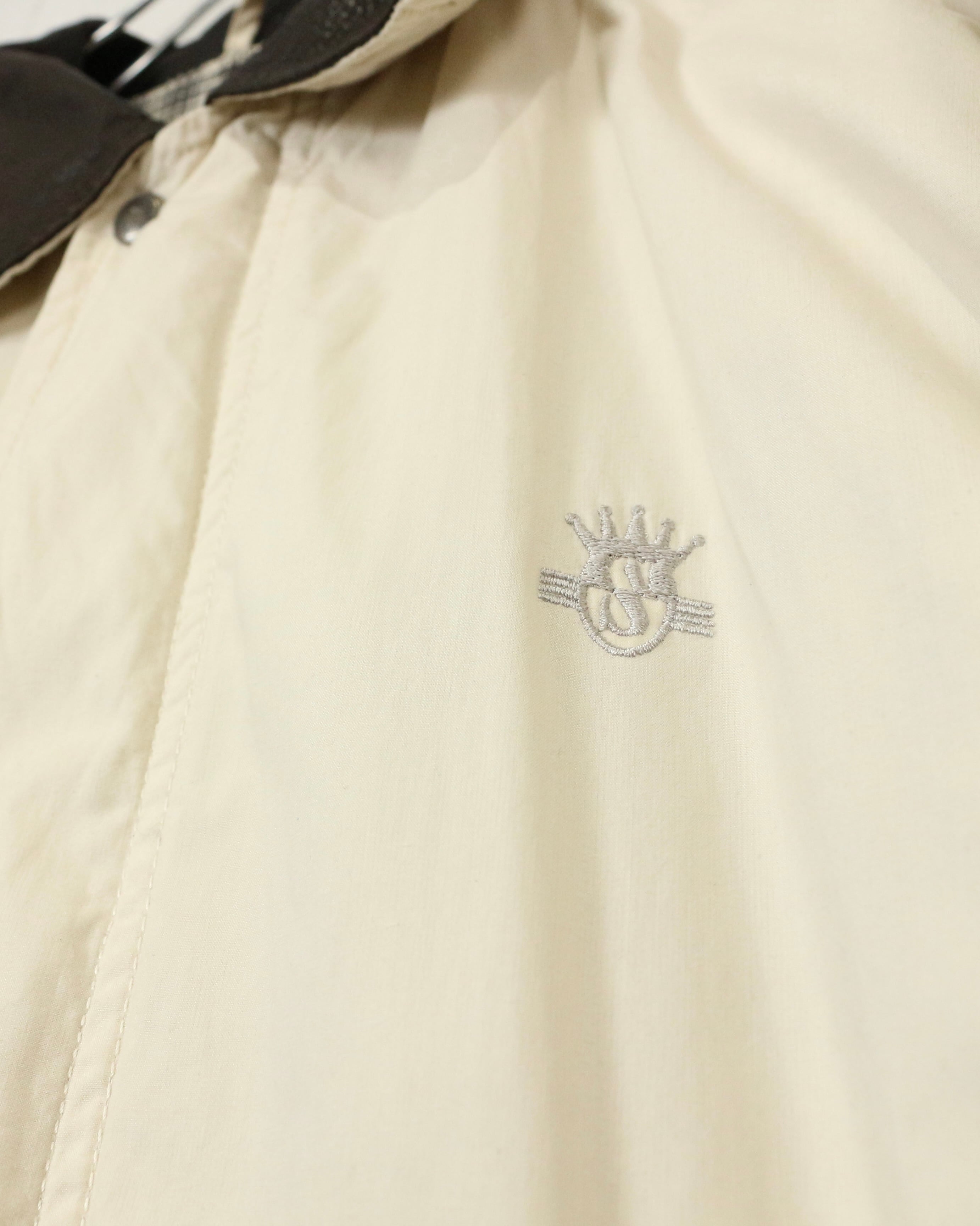 フロントはスナップボタン×ジップ仕様、胸元にはさりげなくブランドアイコンの刺繍を配置。ミニマルな表情ながら、レザー襟のディテールが確かな個性漂わせています。
