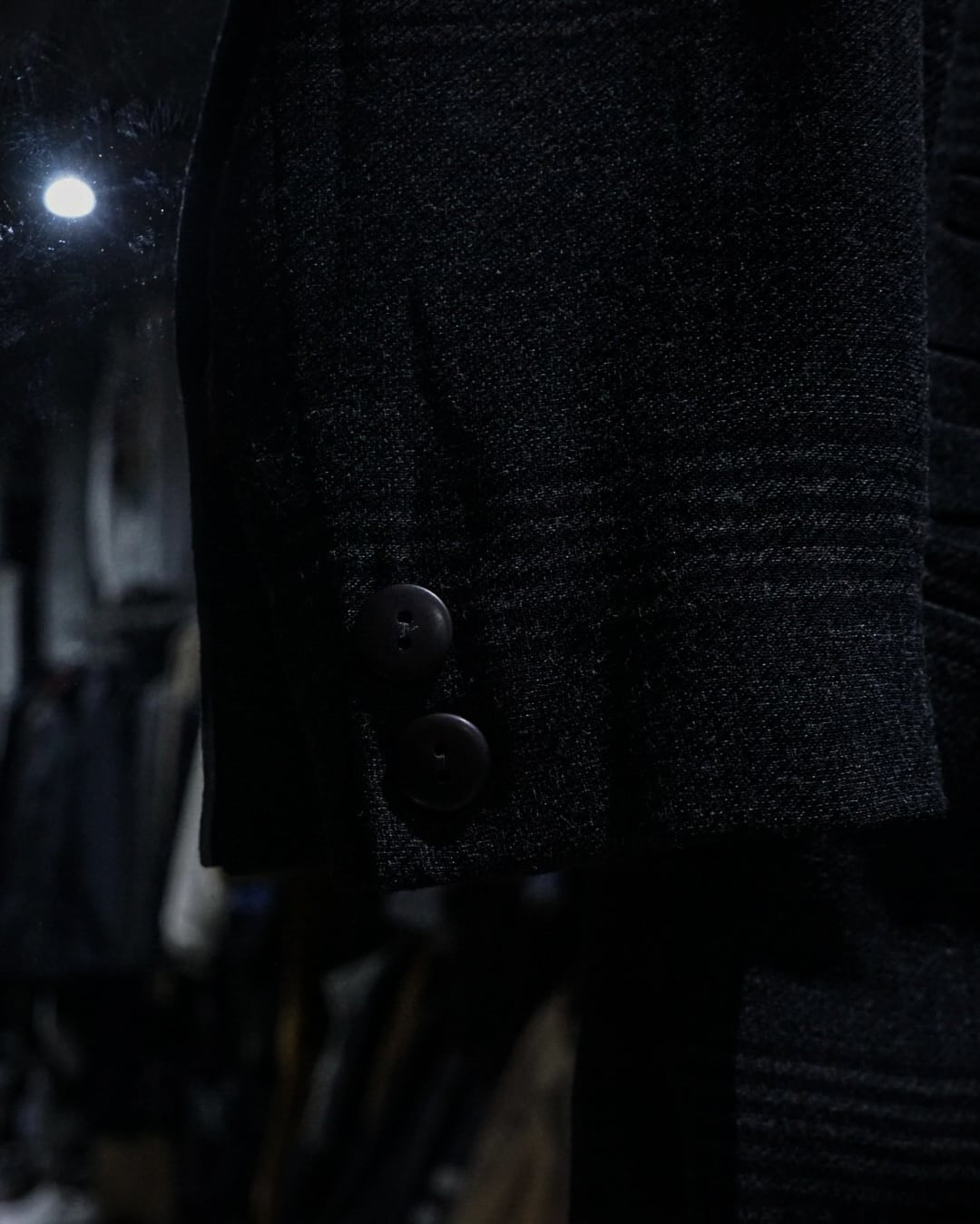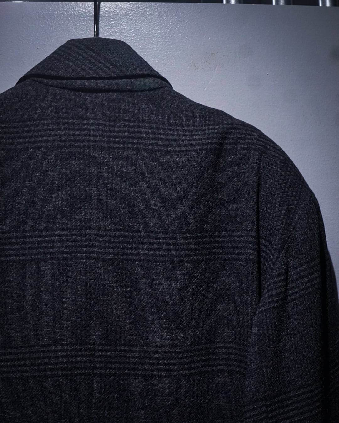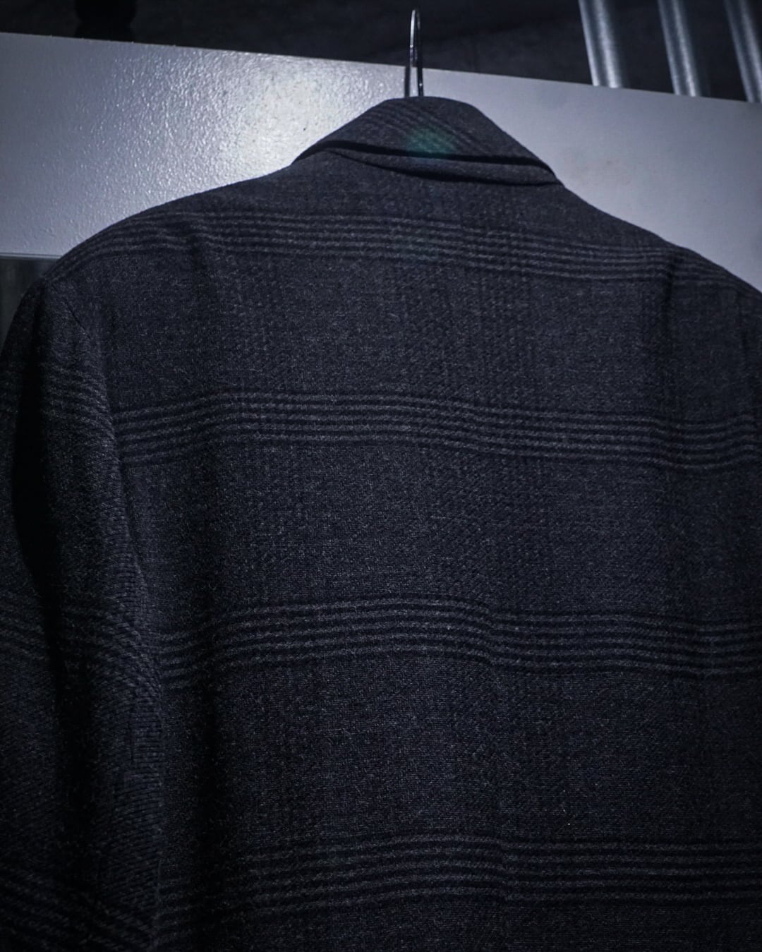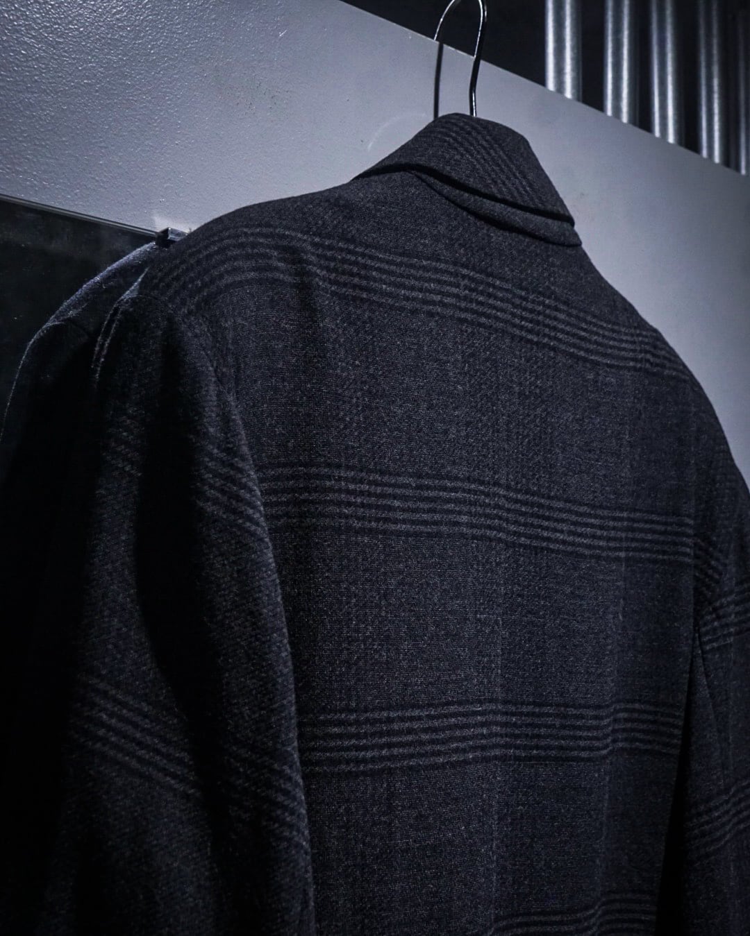 モノトーンカラーの織りで表現された繊細なチェックが奥行きある表情を演出。フロントはシングル仕様に端正なノッチドラペル、低めに設定されたポケット位置など、クラシックを踏襲しつつもモードな香りを漂わせています。