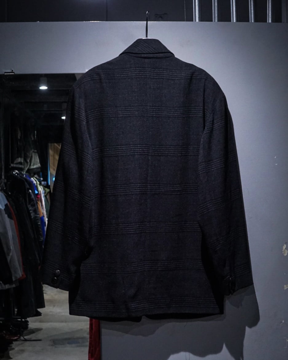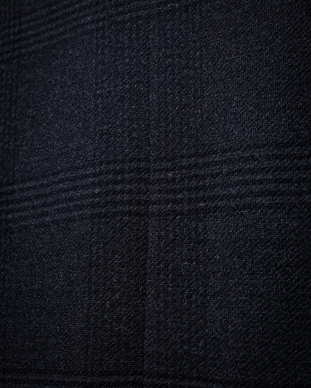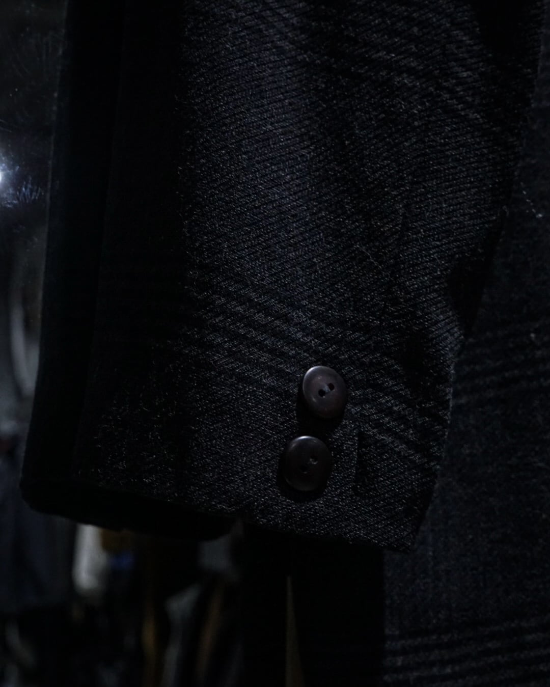 モノトーンカラーの織りで表現された繊細なチェックが奥行きある表情を演出。フロントはシングル仕様に端正なノッチドラペル、低めに設定されたポケット位置など、クラシックを踏襲しつつもモードな香りを漂わせています。