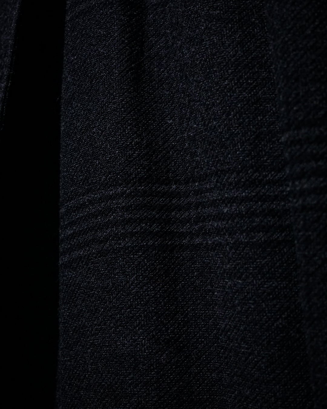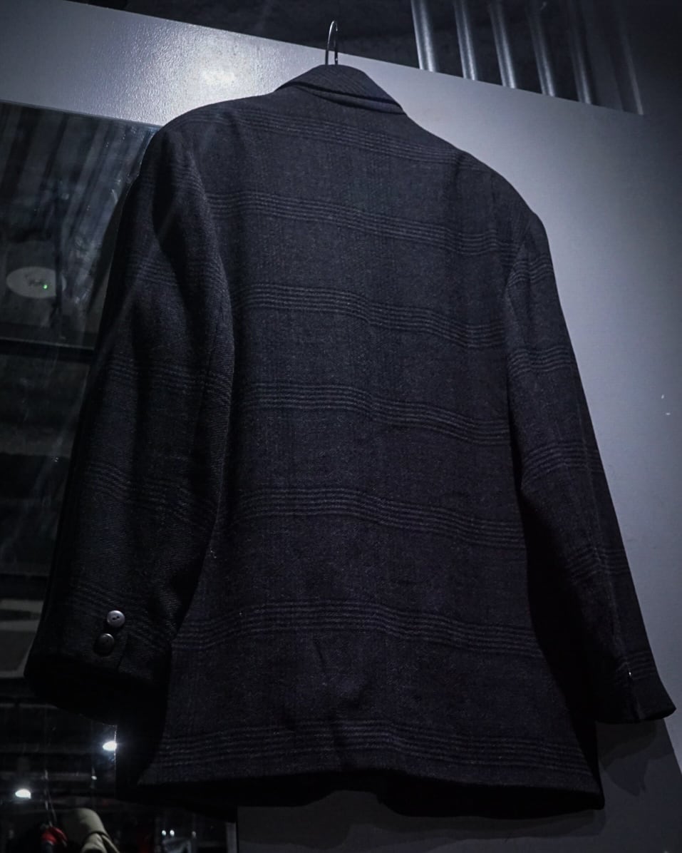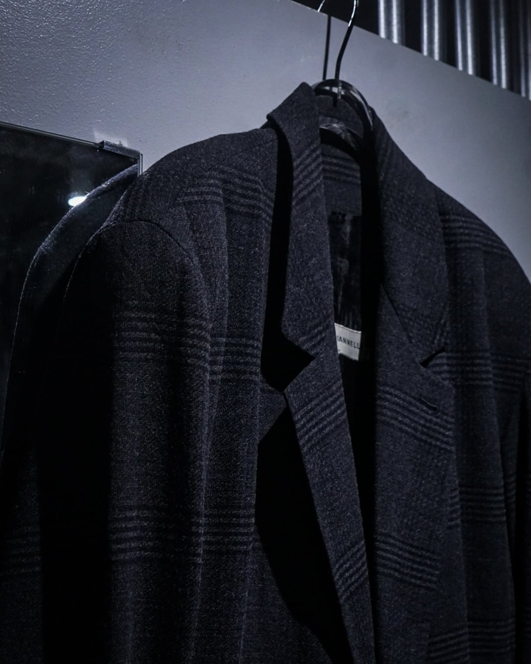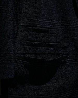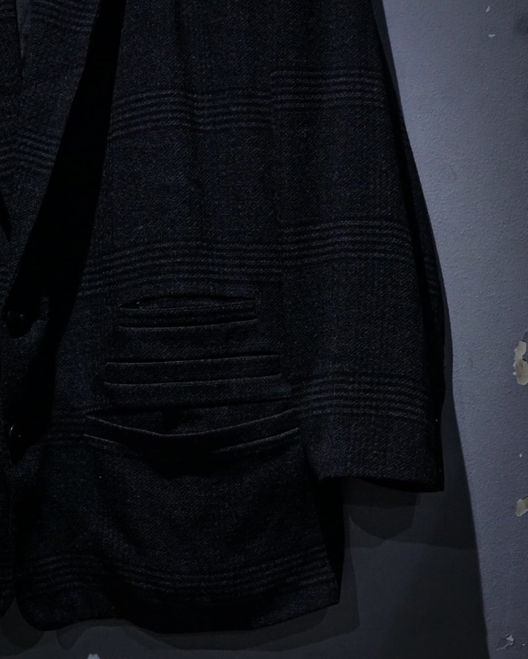 モノトーンカラーの織りで表現された繊細なチェックが奥行きある表情を演出。フロントはシングル仕様に端正なノッチドラペル、低めに設定されたポケット位置など、クラシックを踏襲しつつもモードな香りを漂わせています。