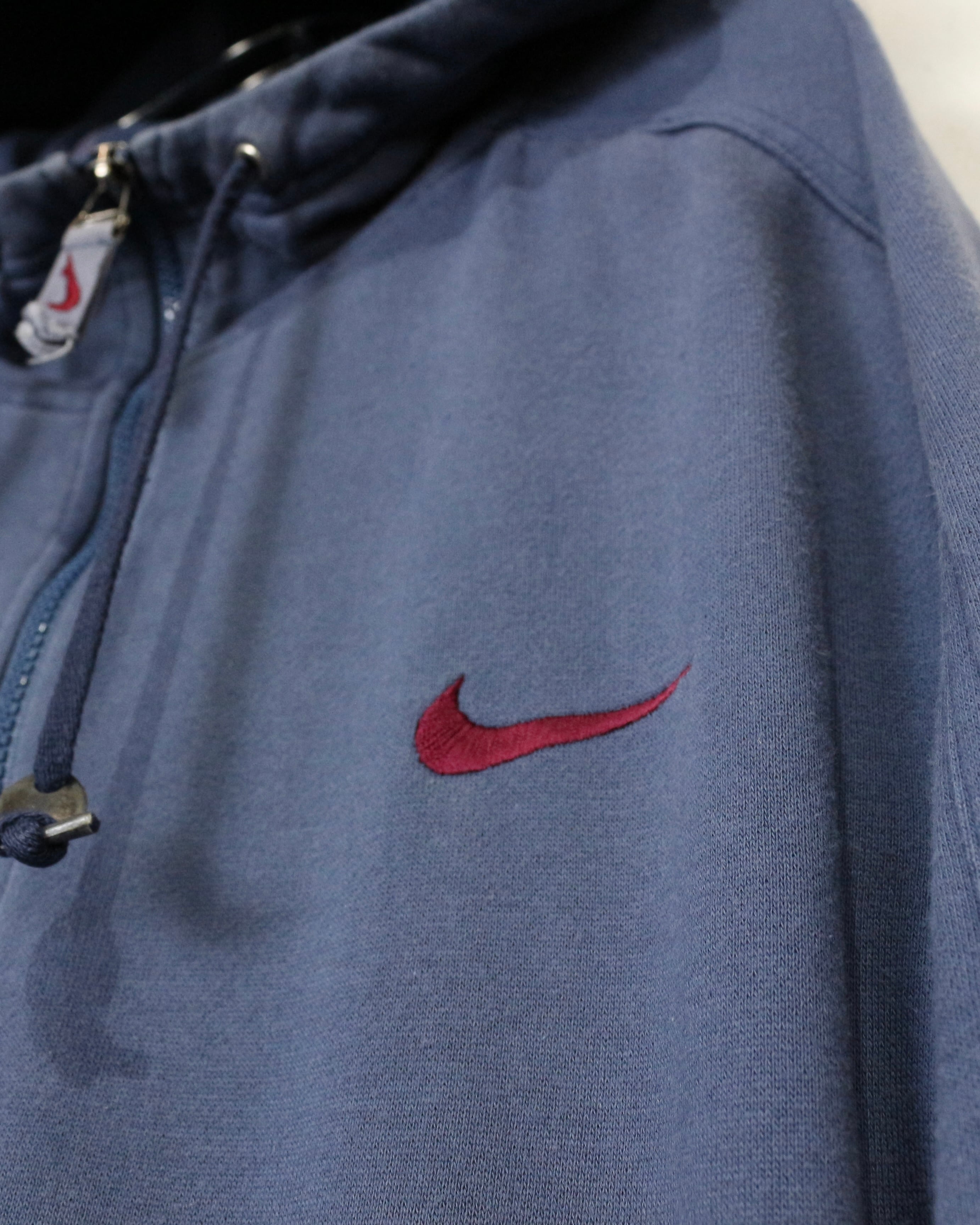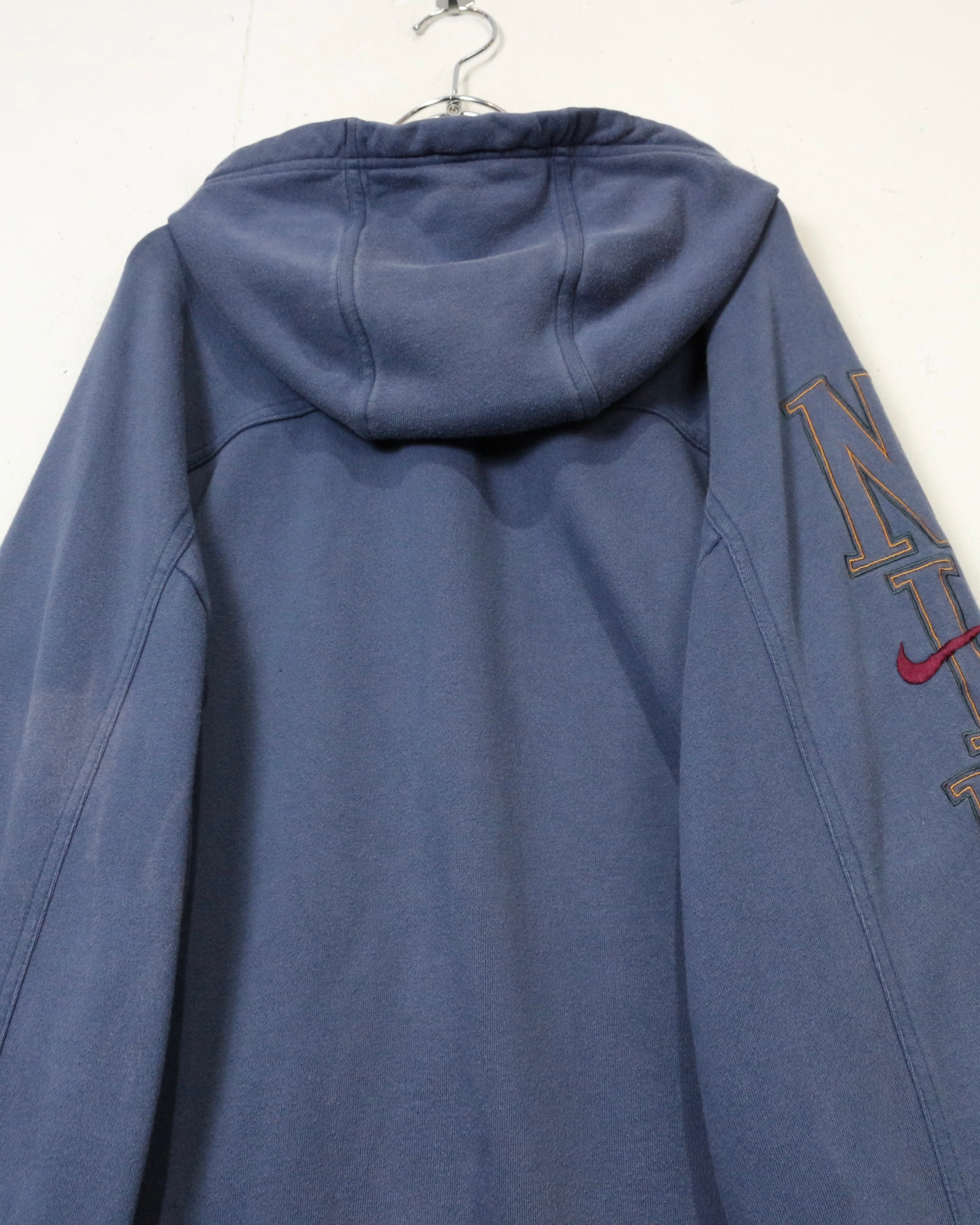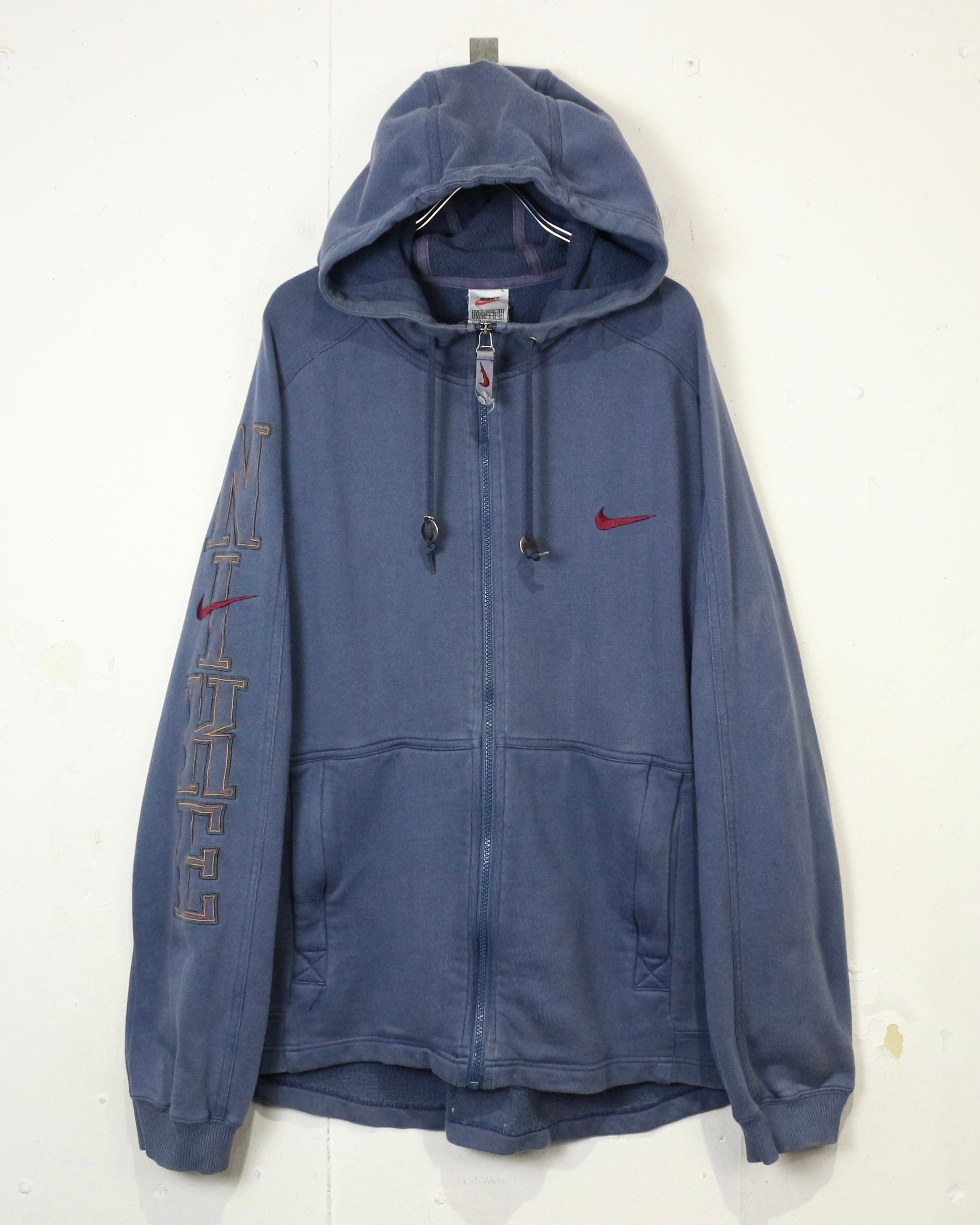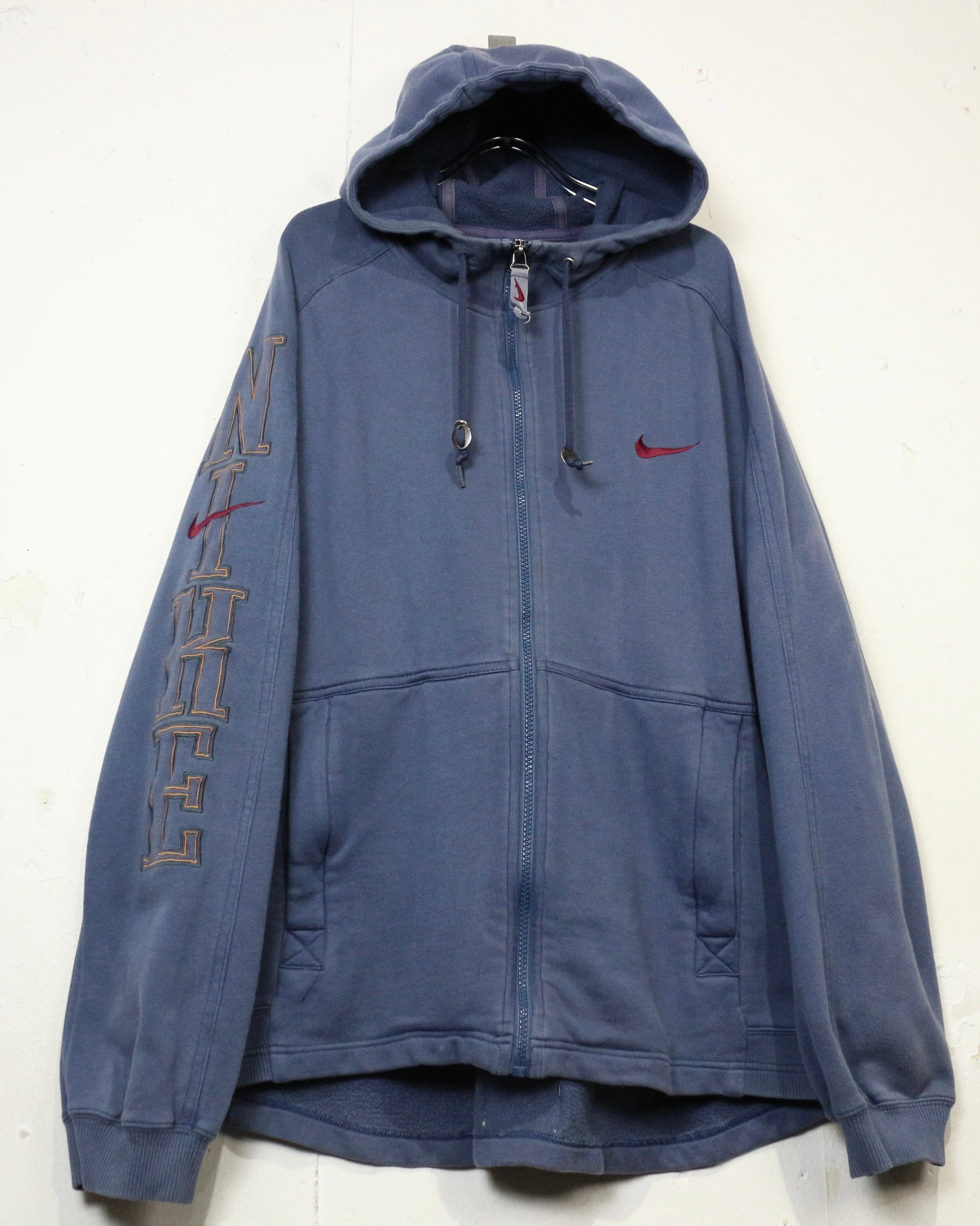 ロゴの存在感と経年変化の味わいを兼ね備えた、今の空気感にハマる“NIKE”のジップアップフーディです。