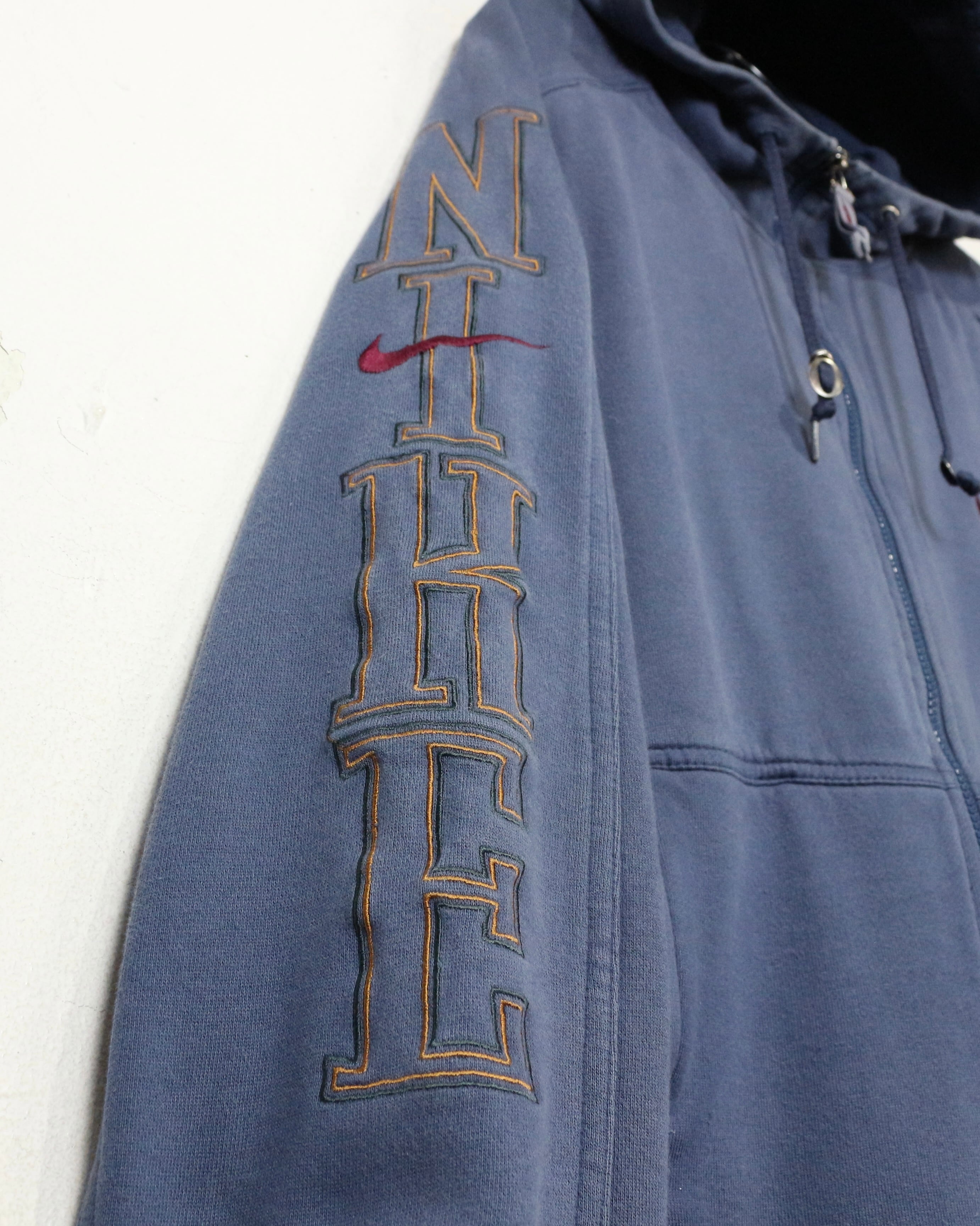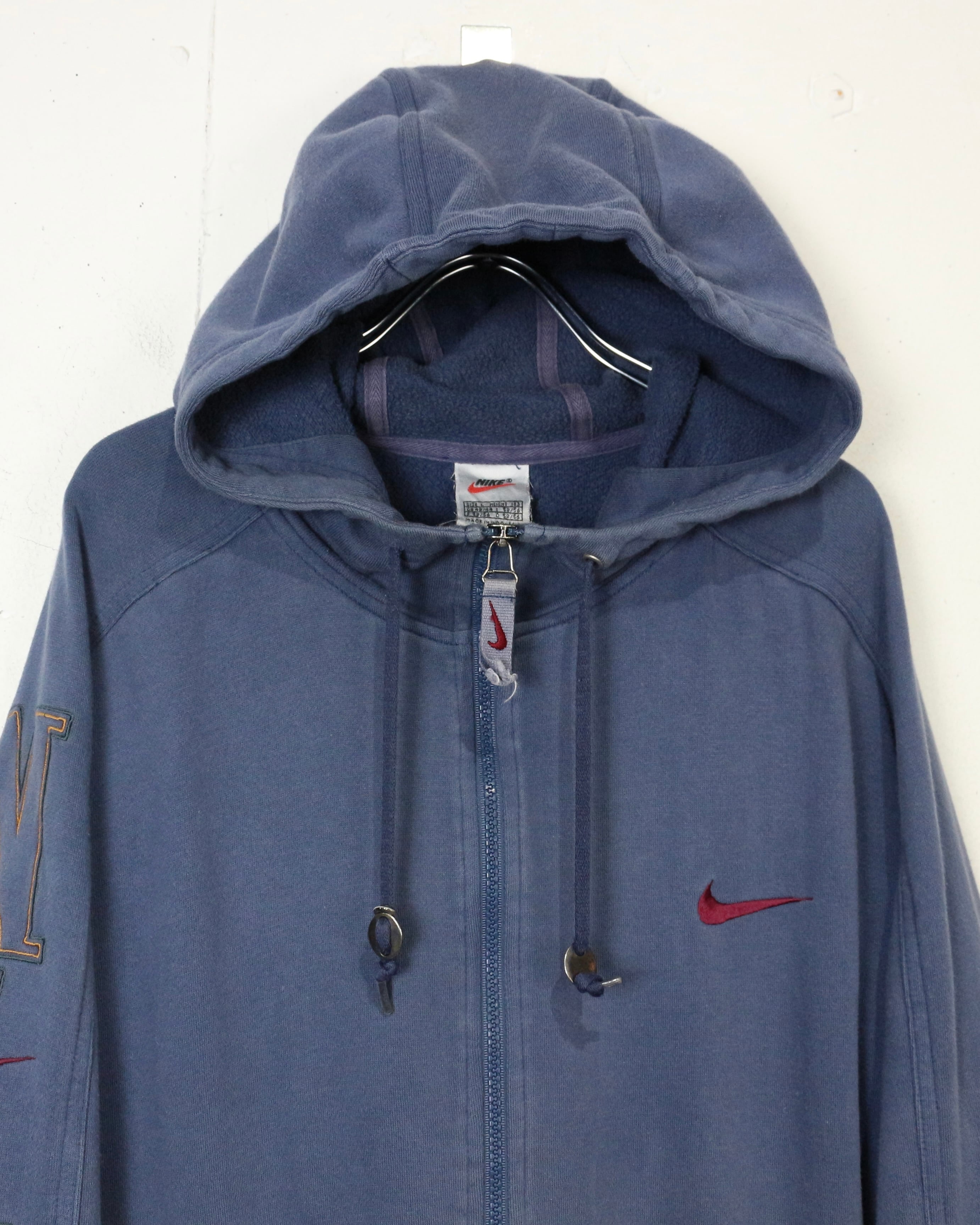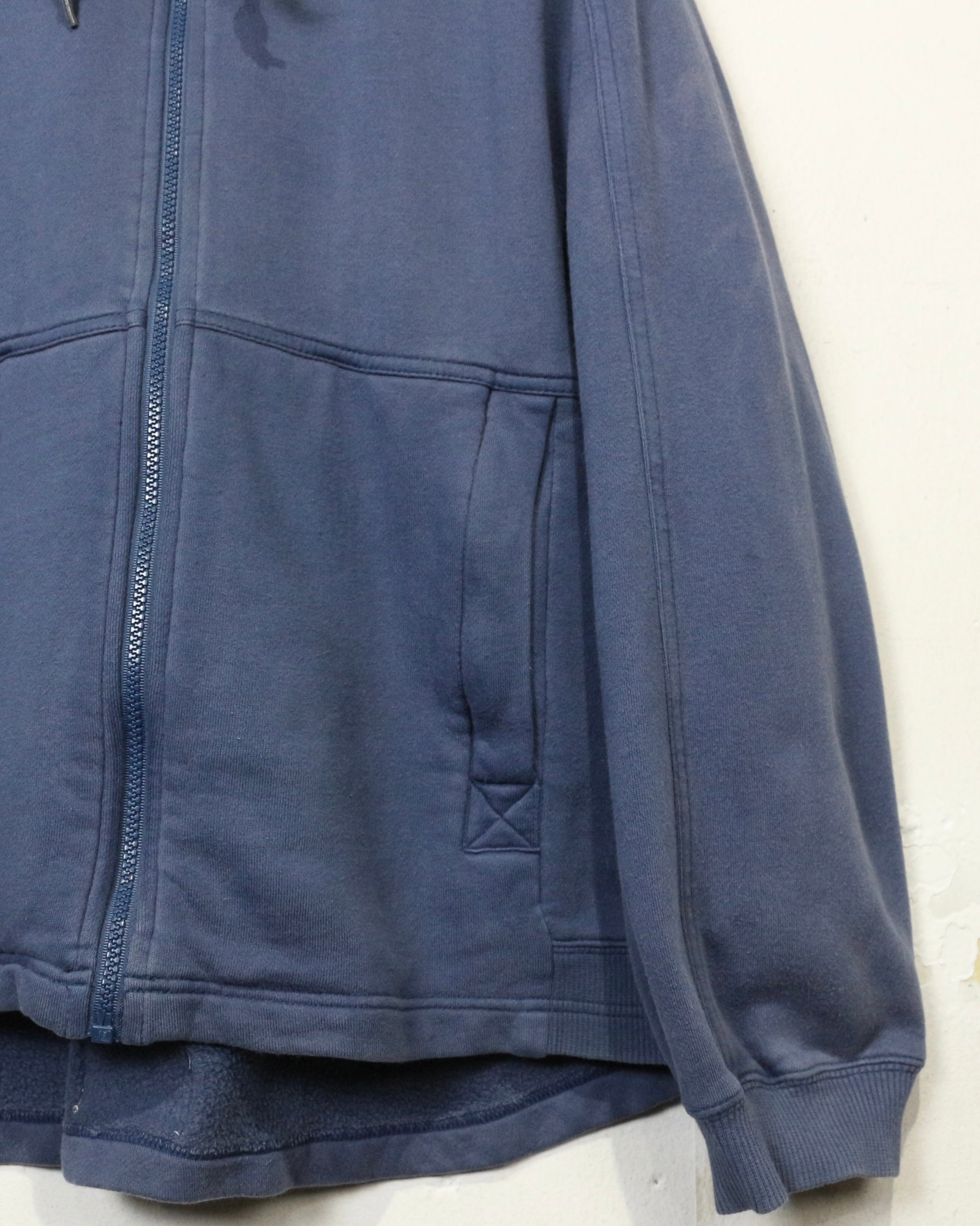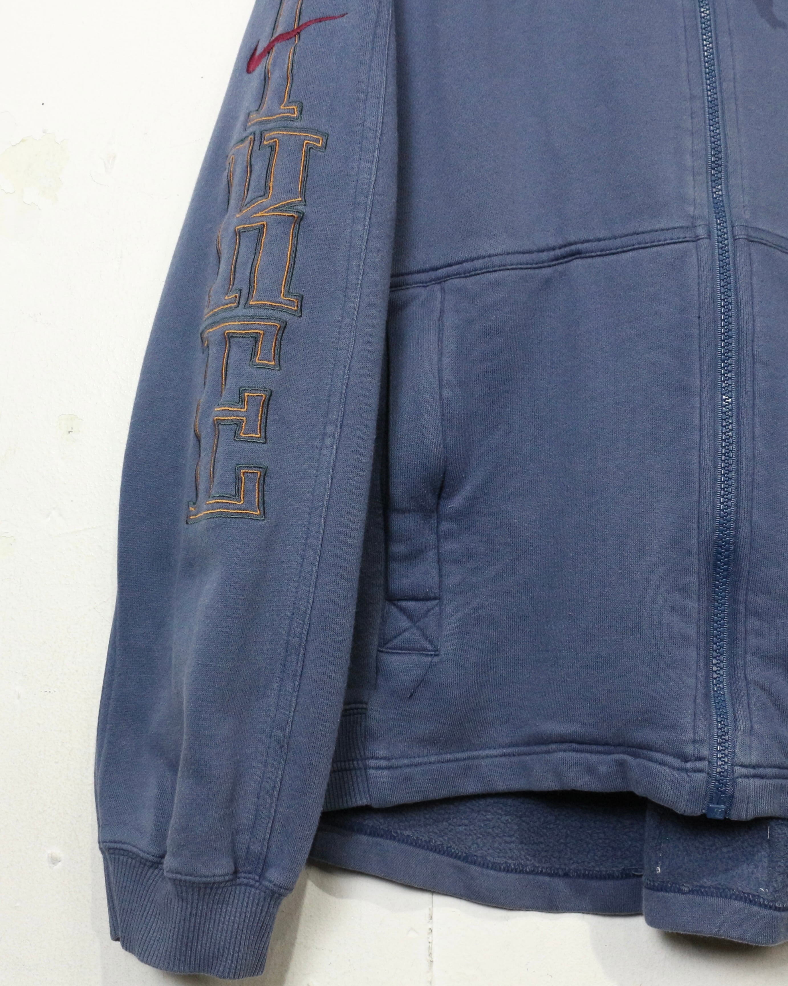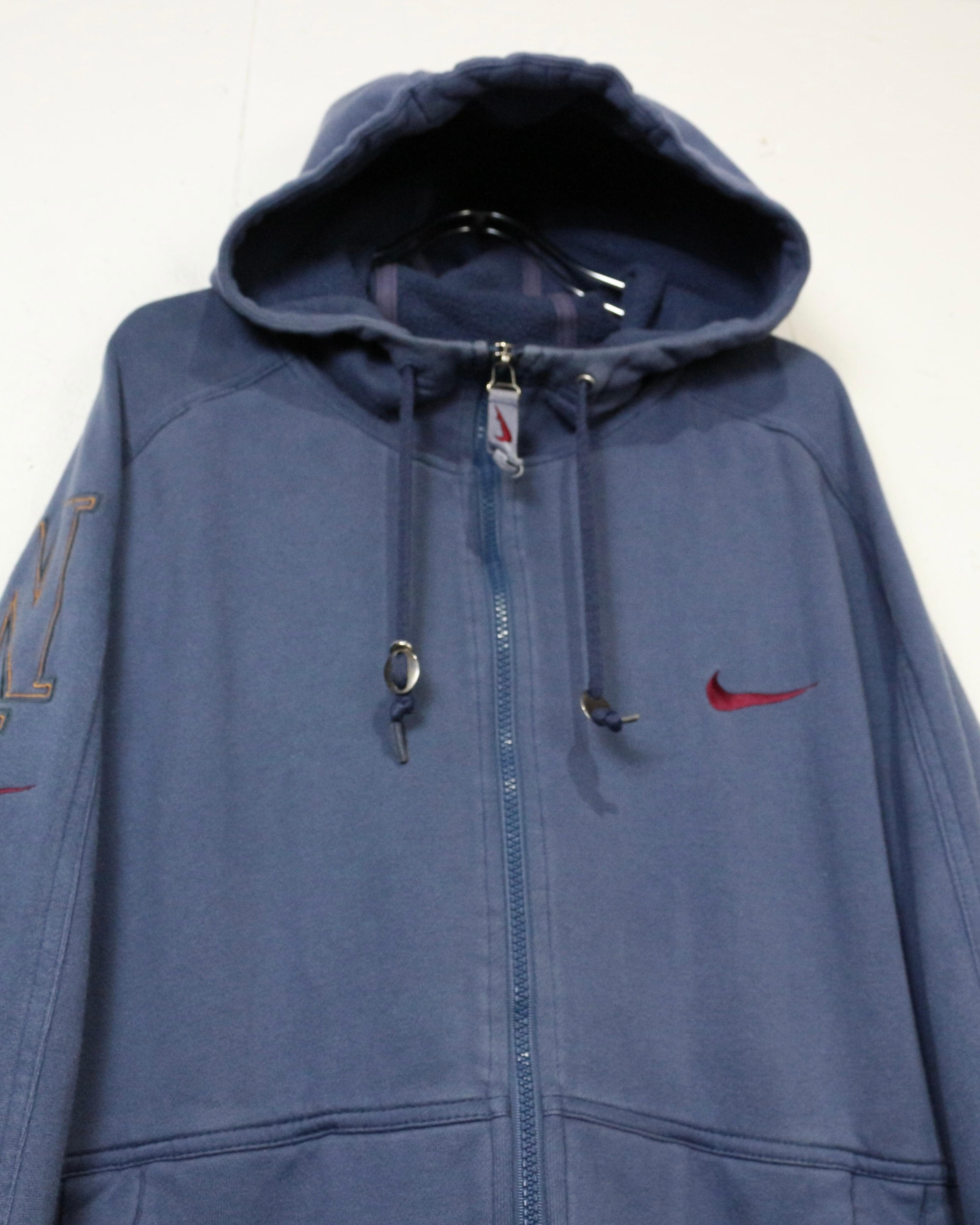 ロゴの存在感と経年変化の味わいを兼ね備えた、今の空気感にハマる“NIKE”のジップアップフーディです。