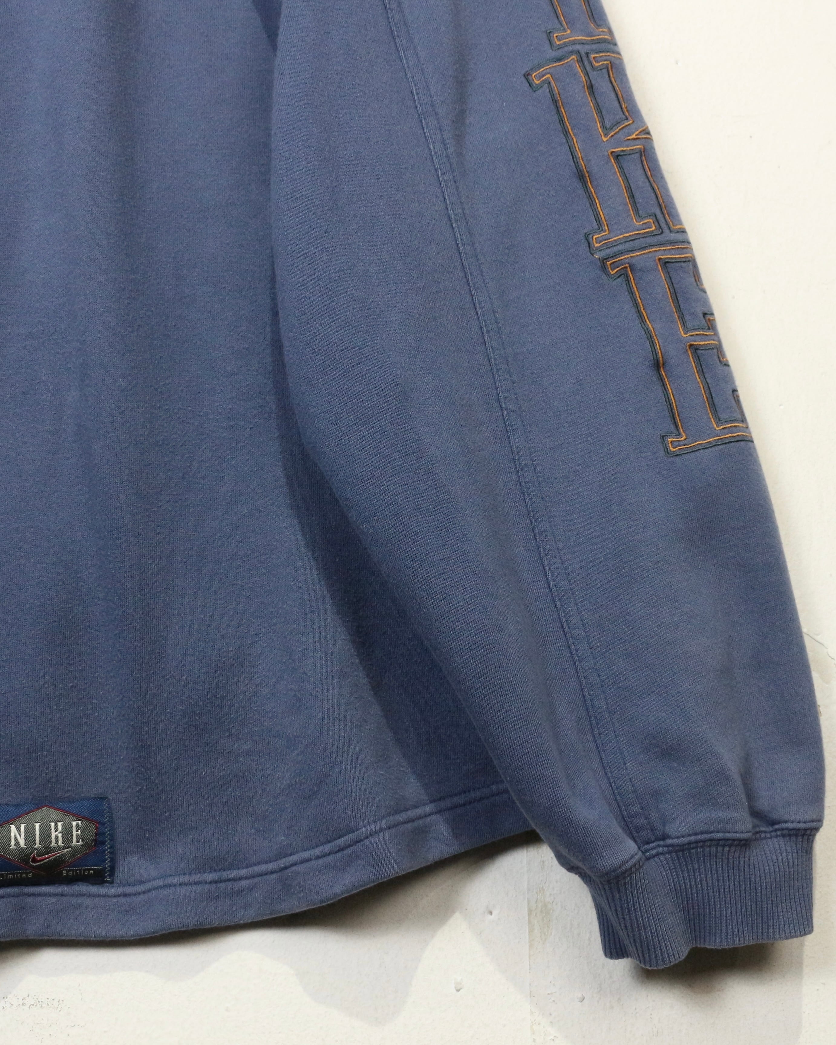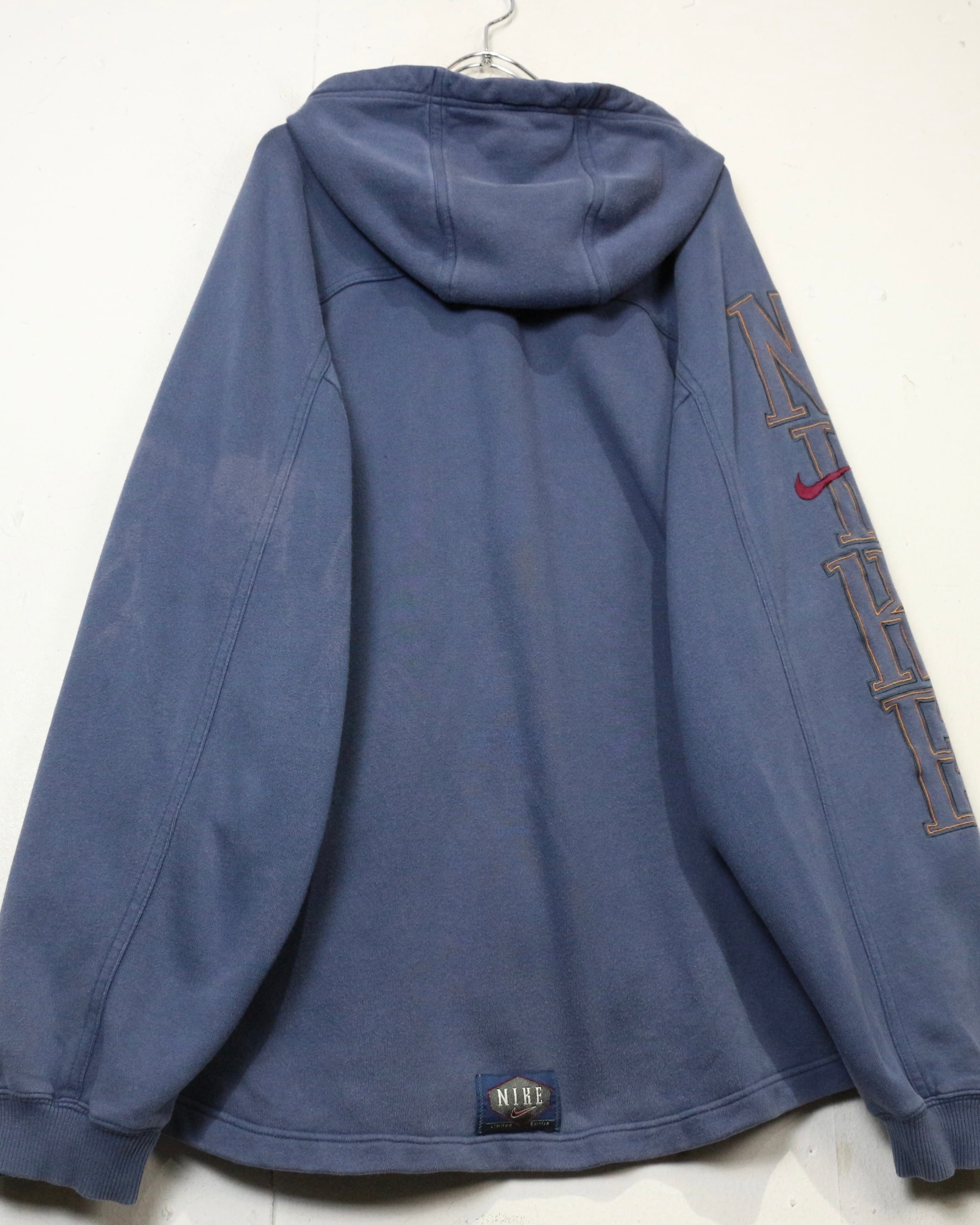 胸元にはレッドのスウォッシュロゴ刺繍、袖には立体的に縁取られた“NIKE”のロゴを配置。さらにバック裾には“NIKE Limited Edition”のパッチが付き、前後左右どこから見ても抜かりないロゴワークが魅力です。