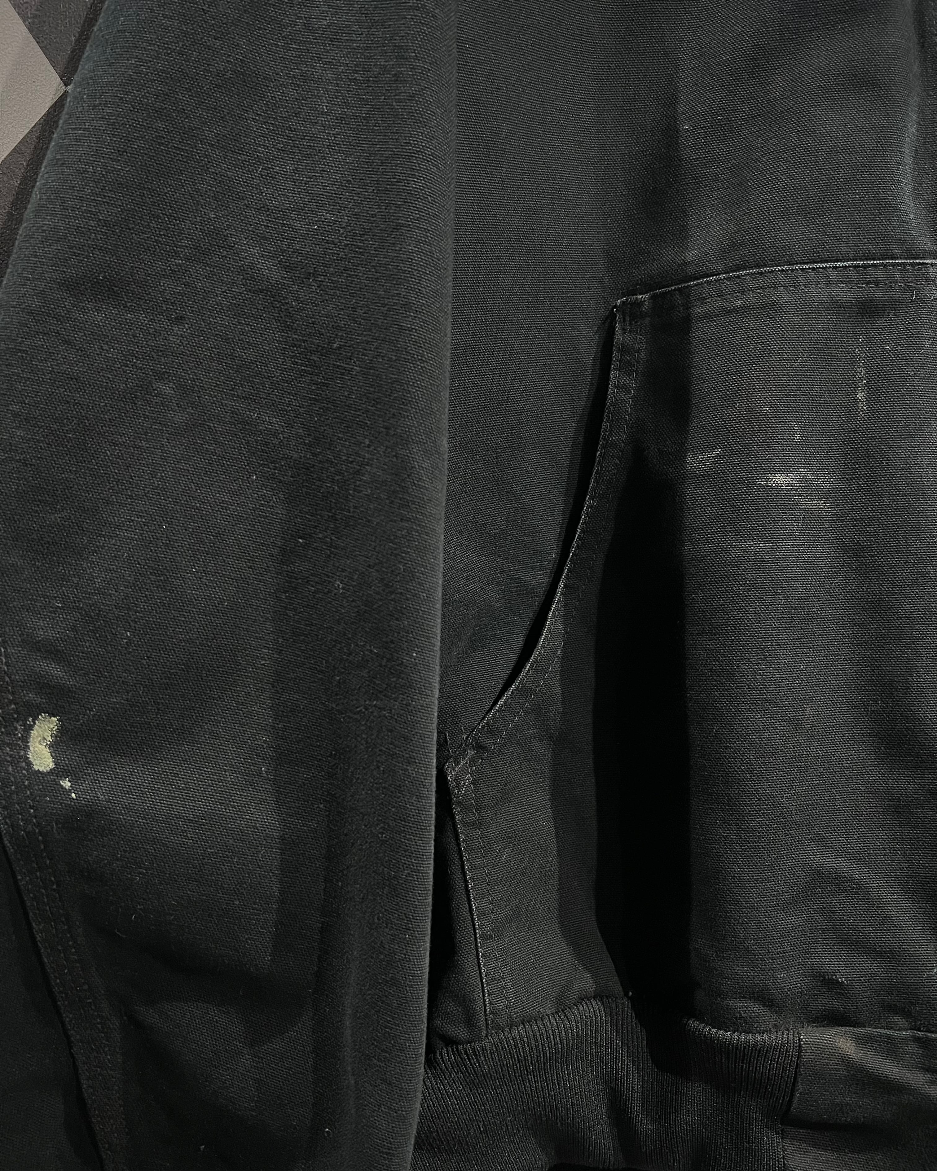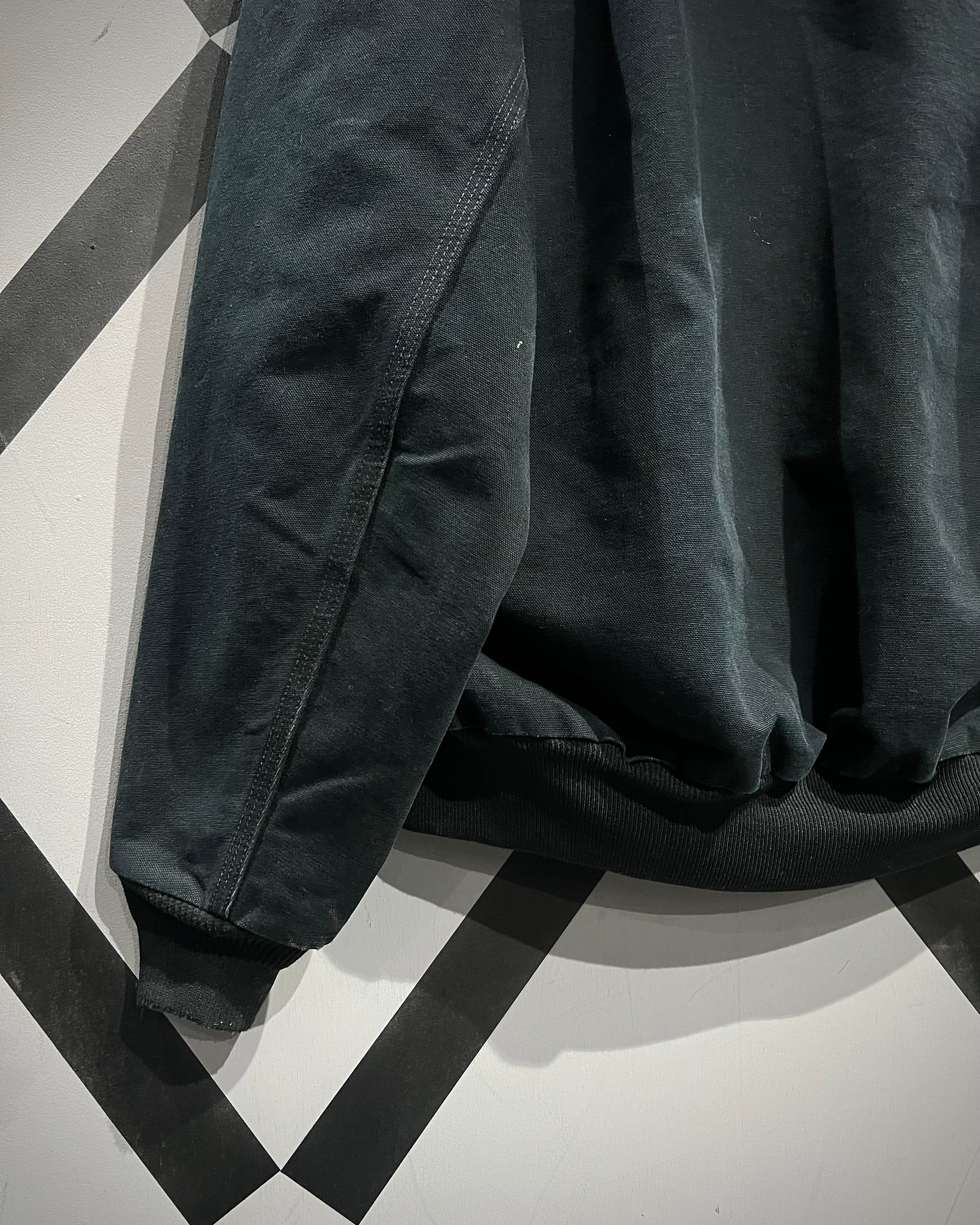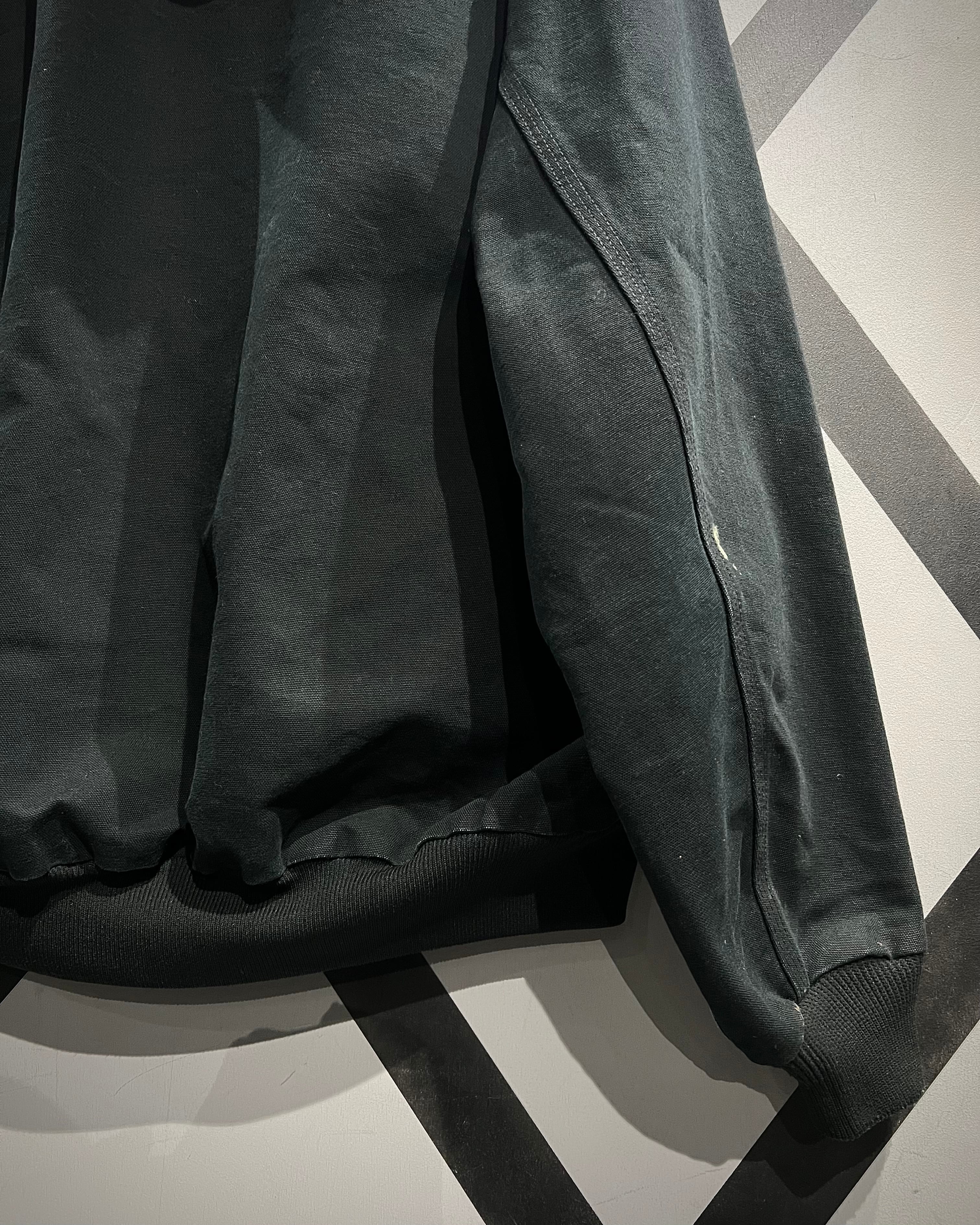 ボディには肉厚でハリのあるダック地を採用。ブラックがフェードし、墨黒へと変化した色味に、リアルなペンキ飛びやアタリが重なり、唯一無二のエイジングが雰囲気を漂わせています。