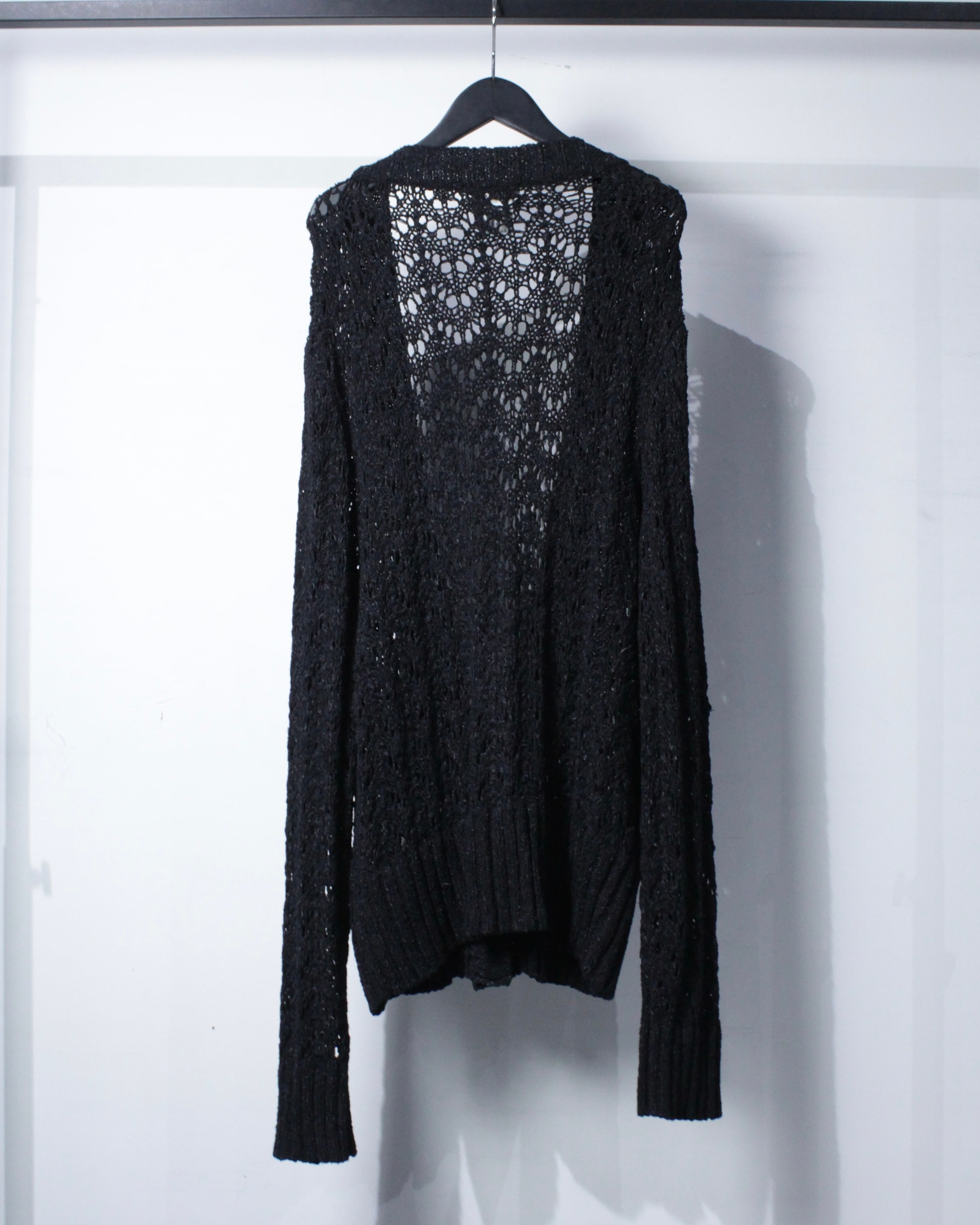 全面に施された透かし編みが印象的な一着。インナーの色や質感をそのままデザインとして取り込み、レイヤード次第で表情を変える作りが服好きの心をくすぐります。