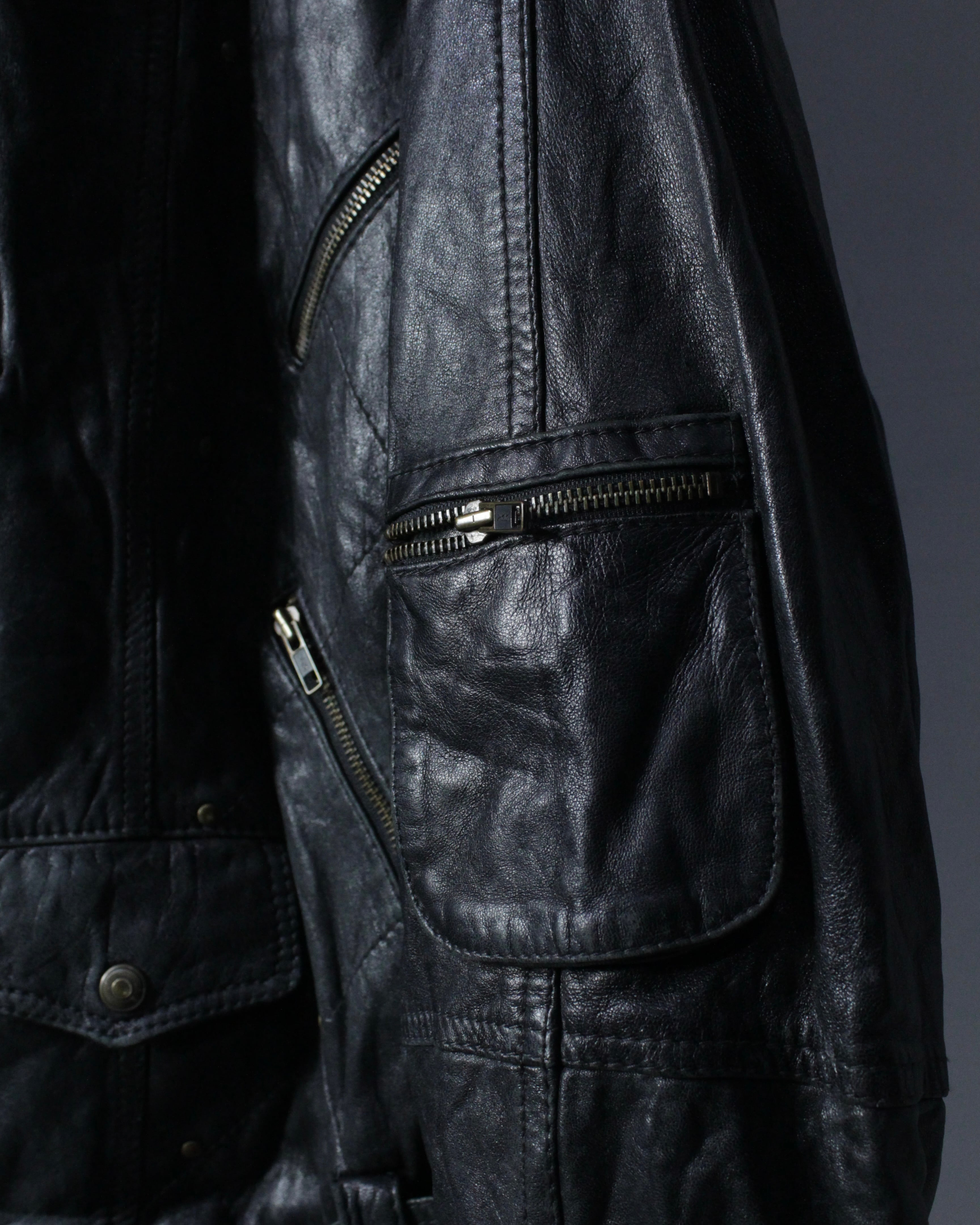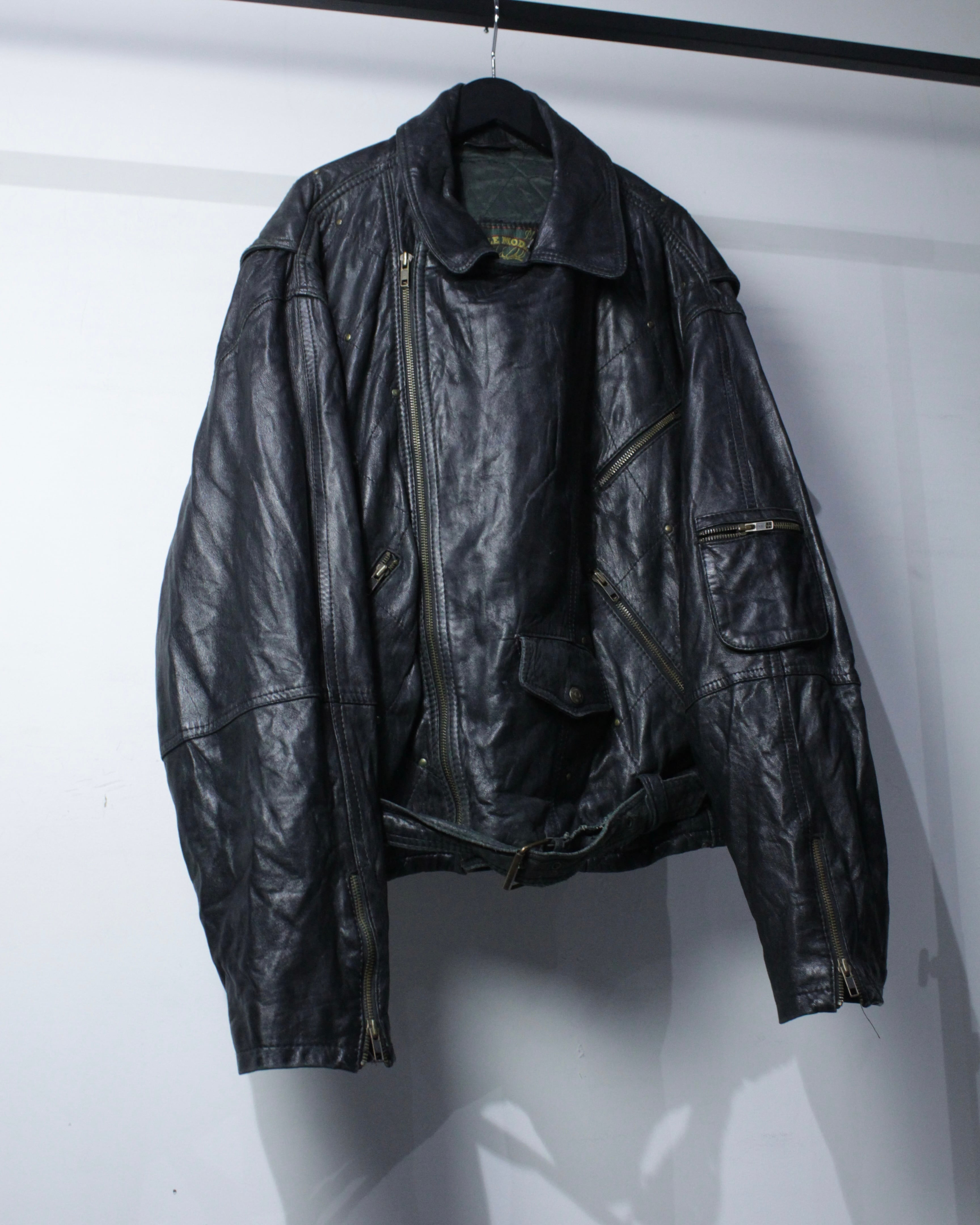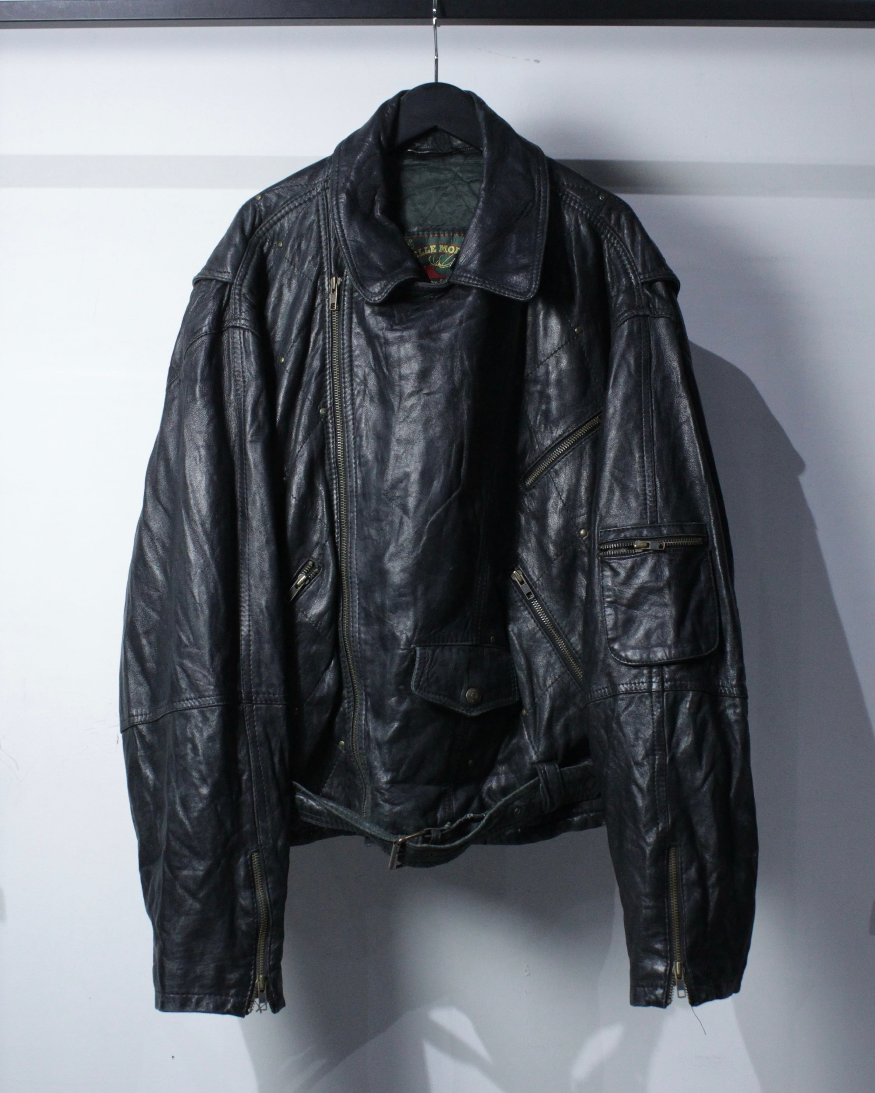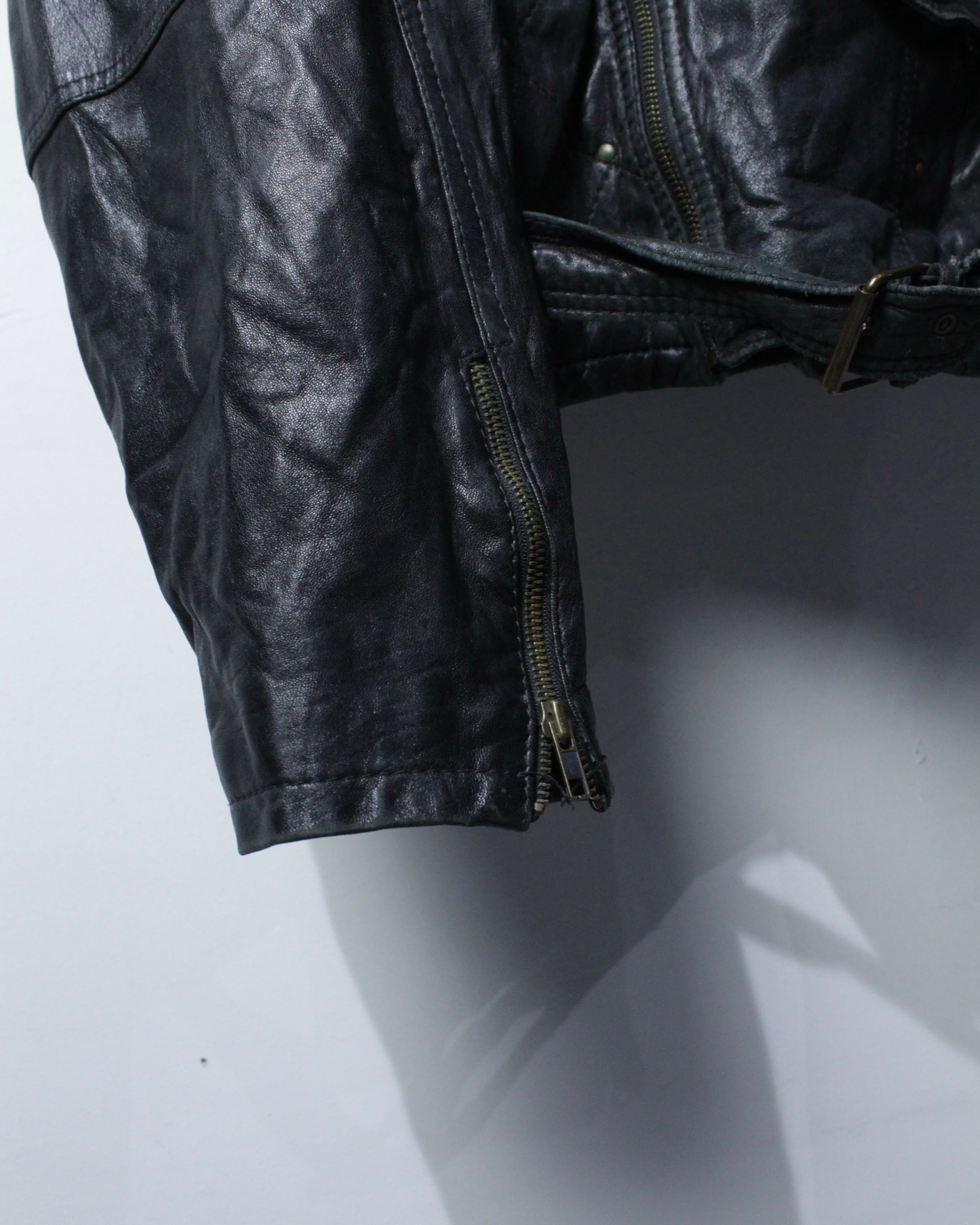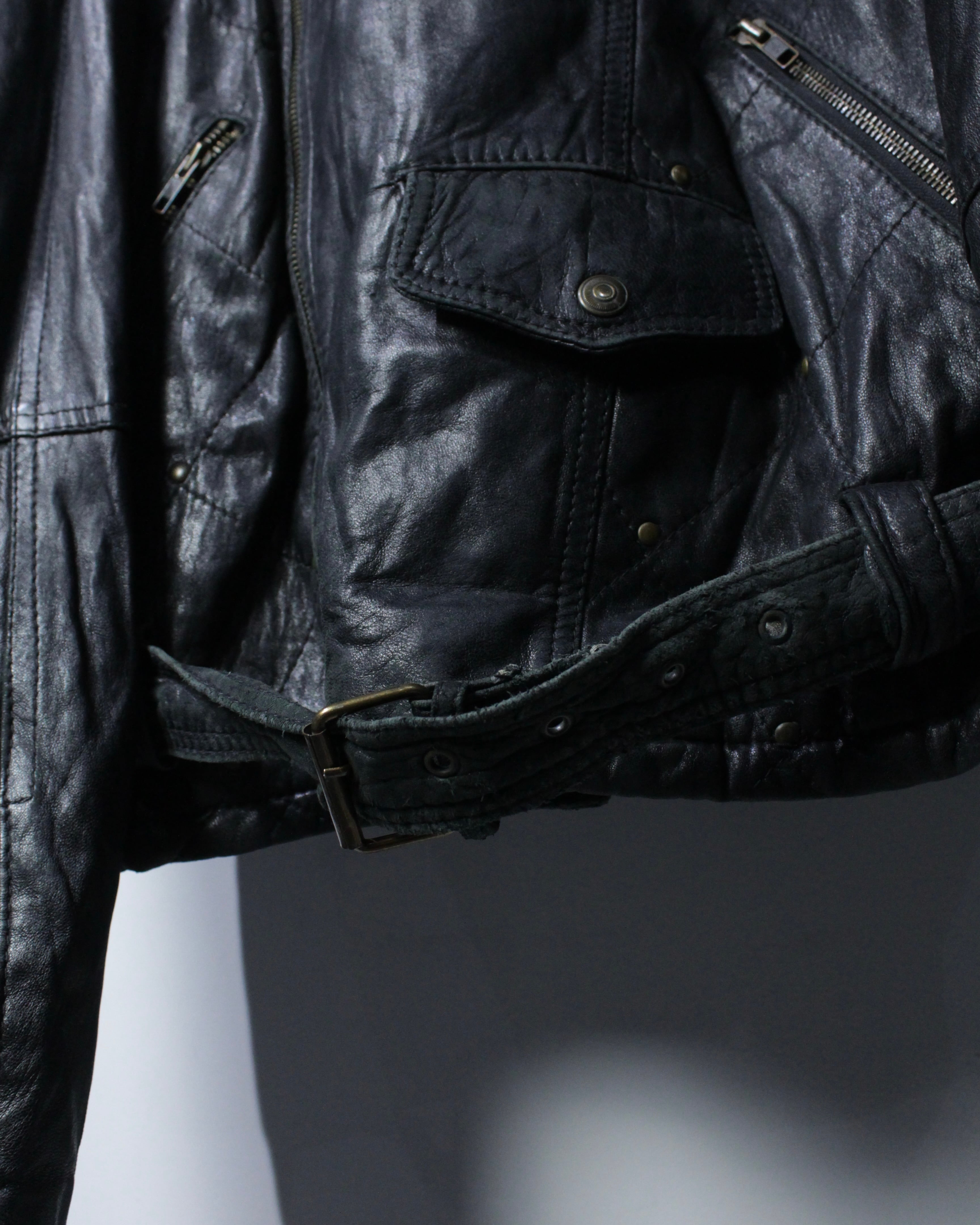 フロントは王道のダブル仕様。アシンメトリーに走るジップ、複数のジップポケット、ウエストベルトといったクラシックなディテールが揃い、ライダース本来の迫力をしっかりと主張。