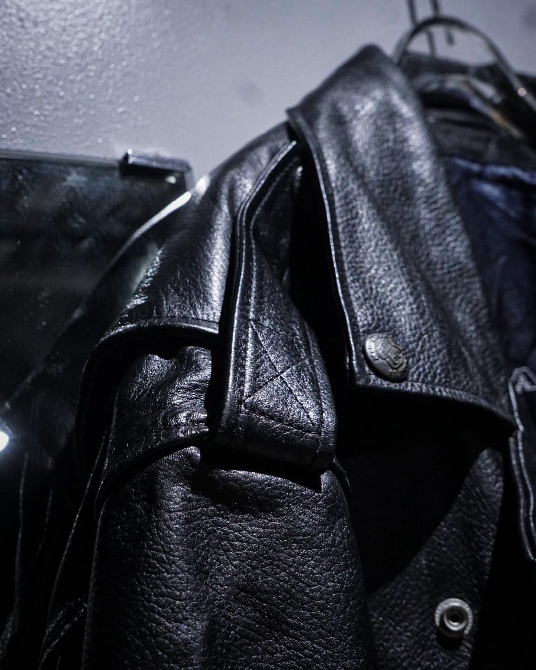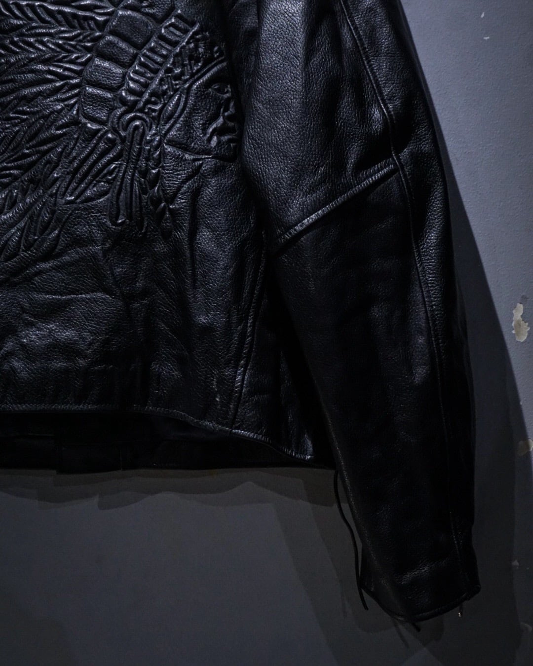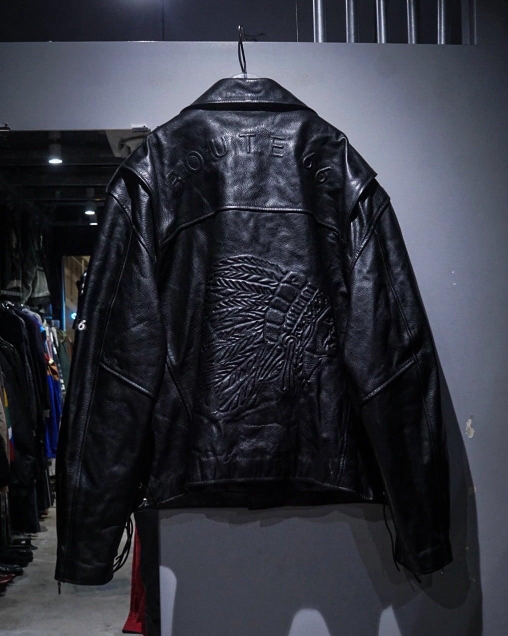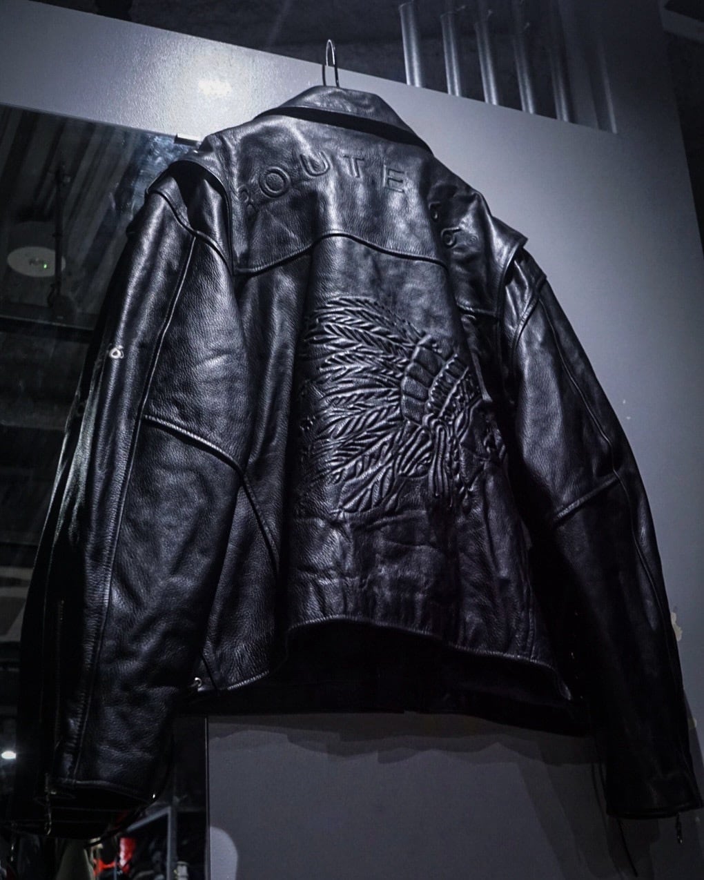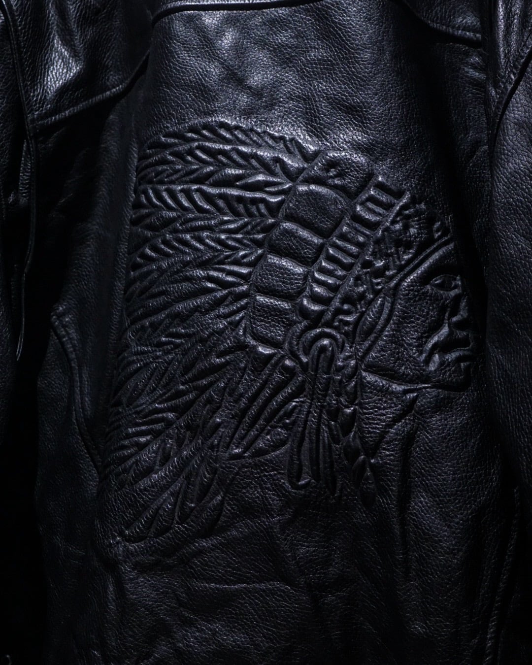 背面に、インディアンヘッドのエンボスを大胆に配置した1着。羽根の一本一本まで立体的に型押しされ、ブラックレザーの陰影によって浮かび上がる迫力ある表情に仕上げられています。