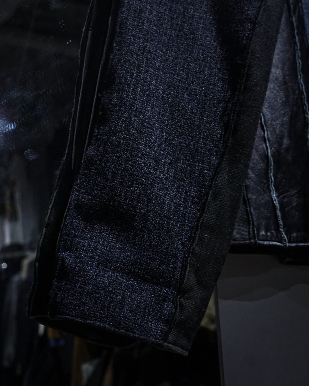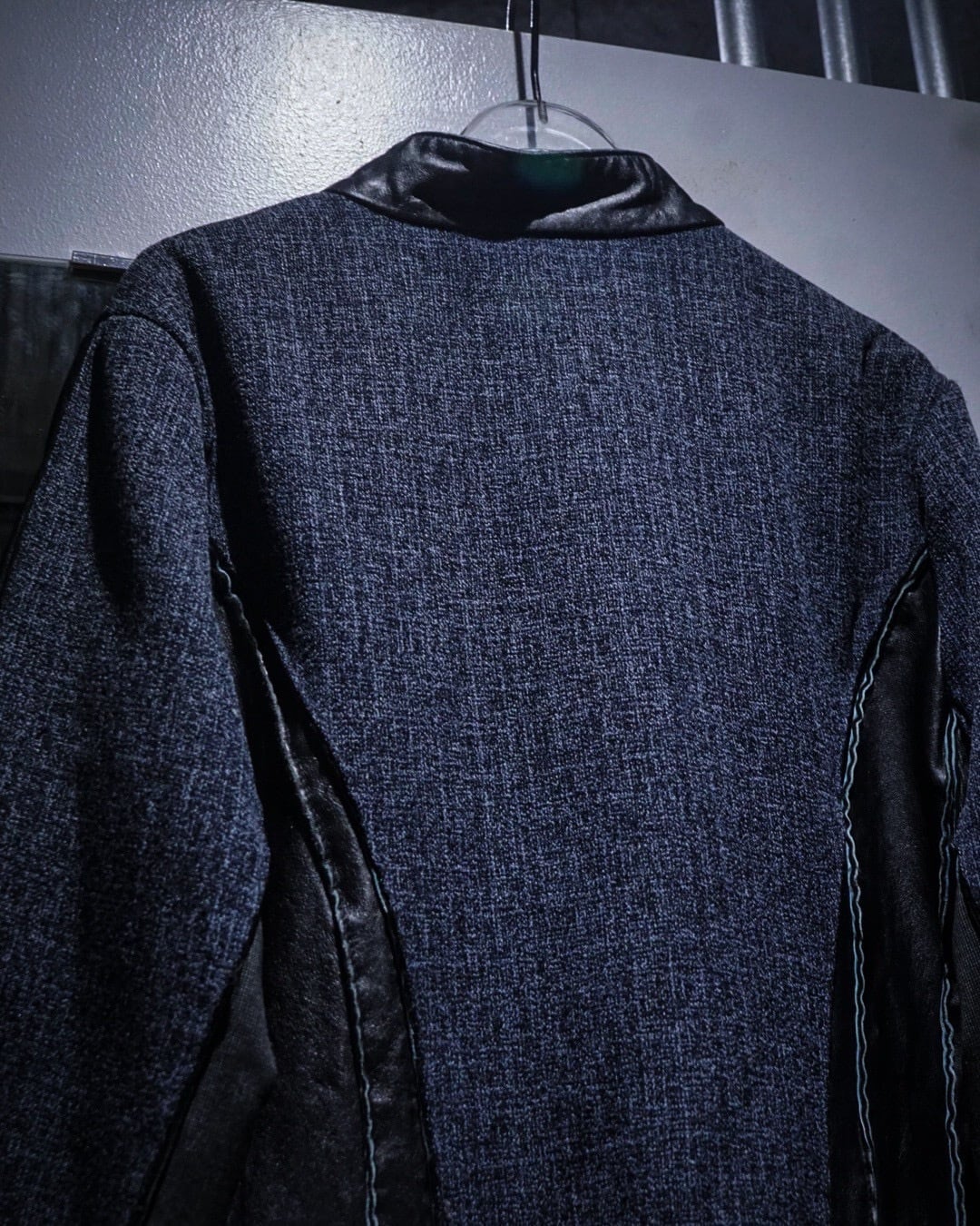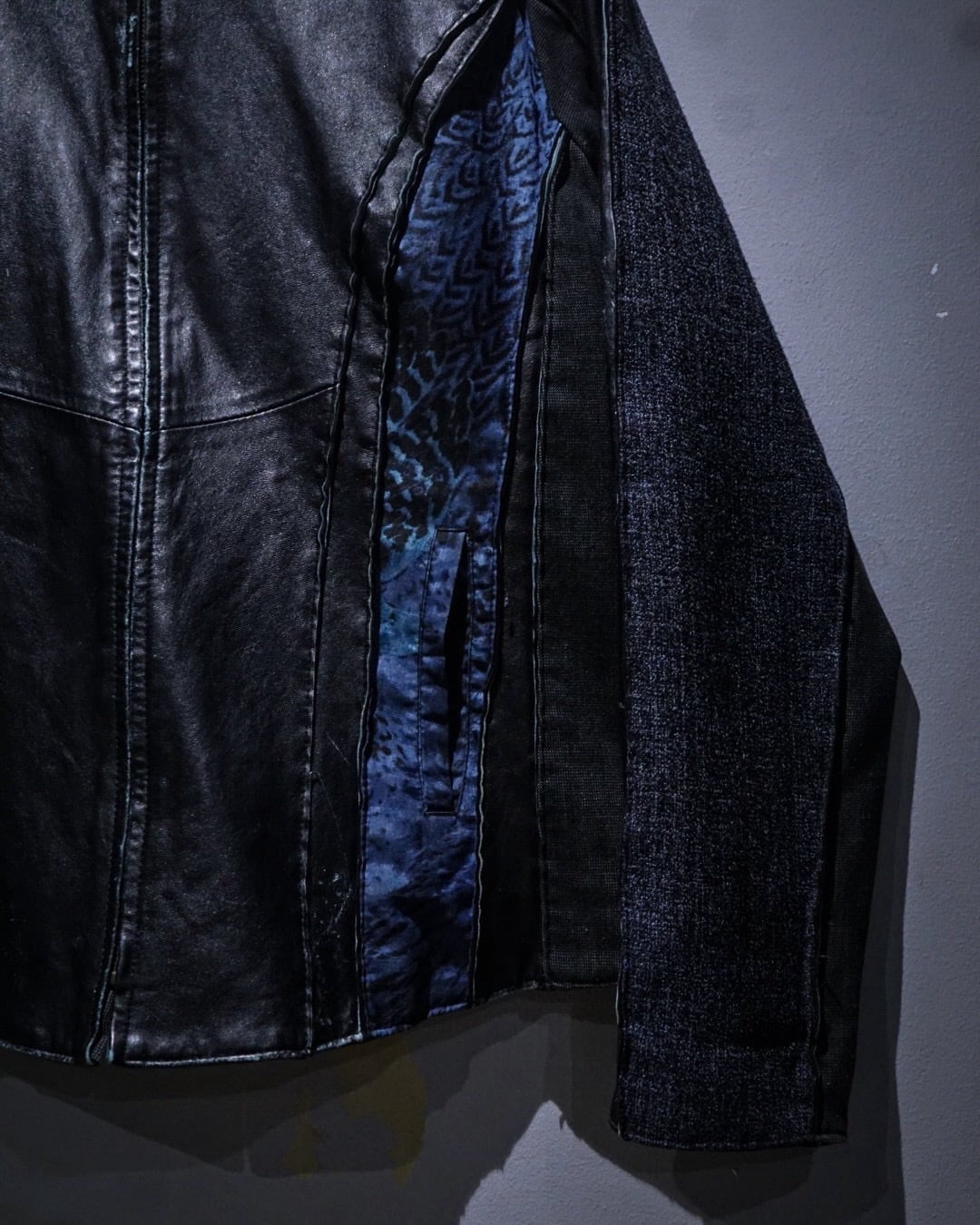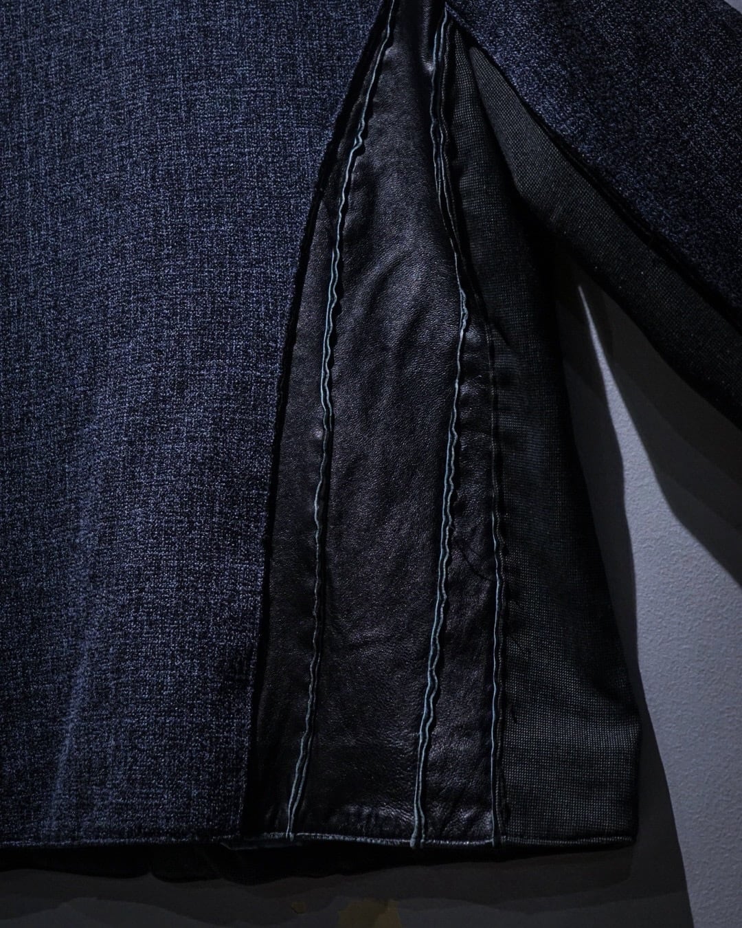 ポリを用いた軽やかなボディをベースに、前身頃から背面にかけてハリのある上質なレザーを切り替えたジャケット。