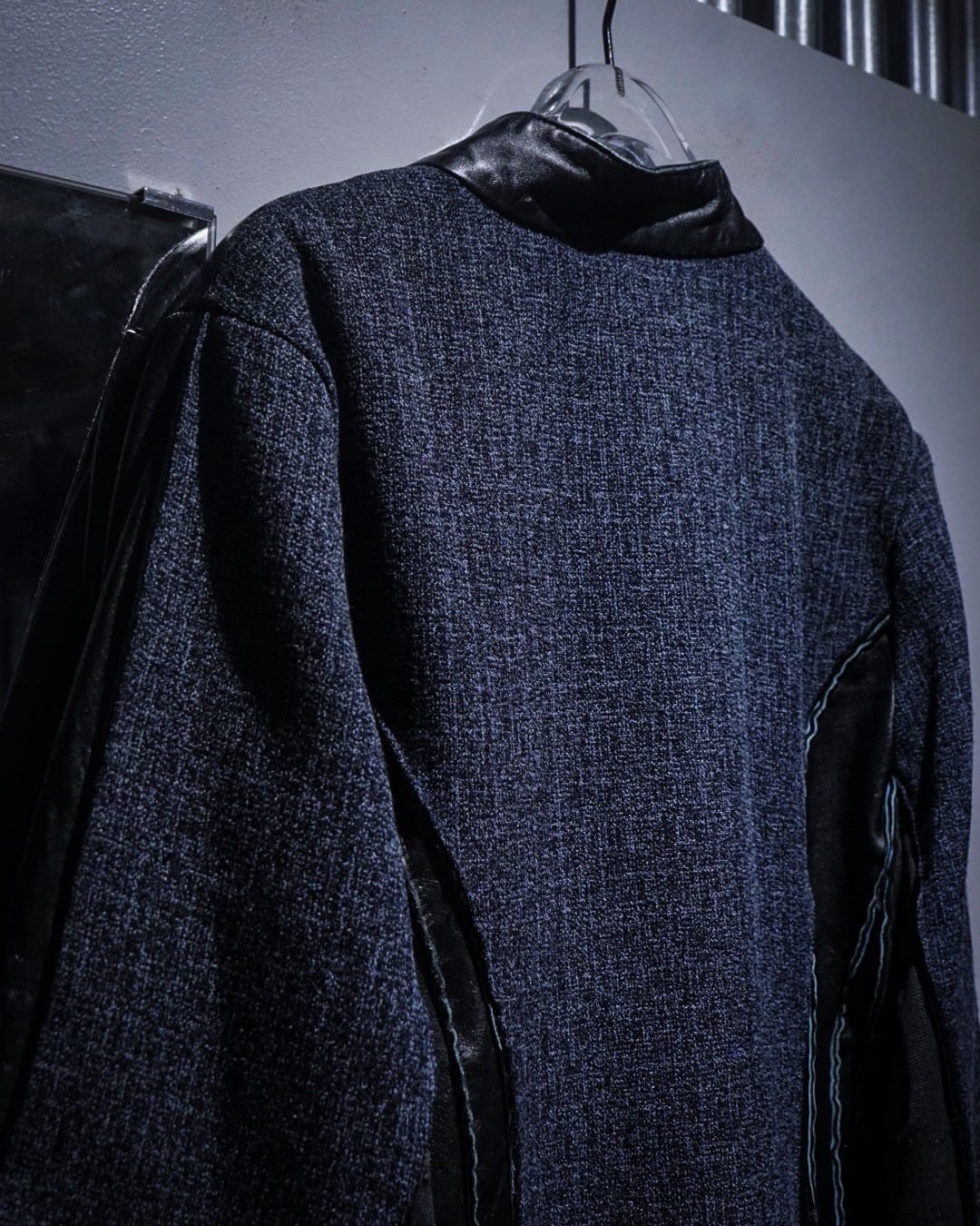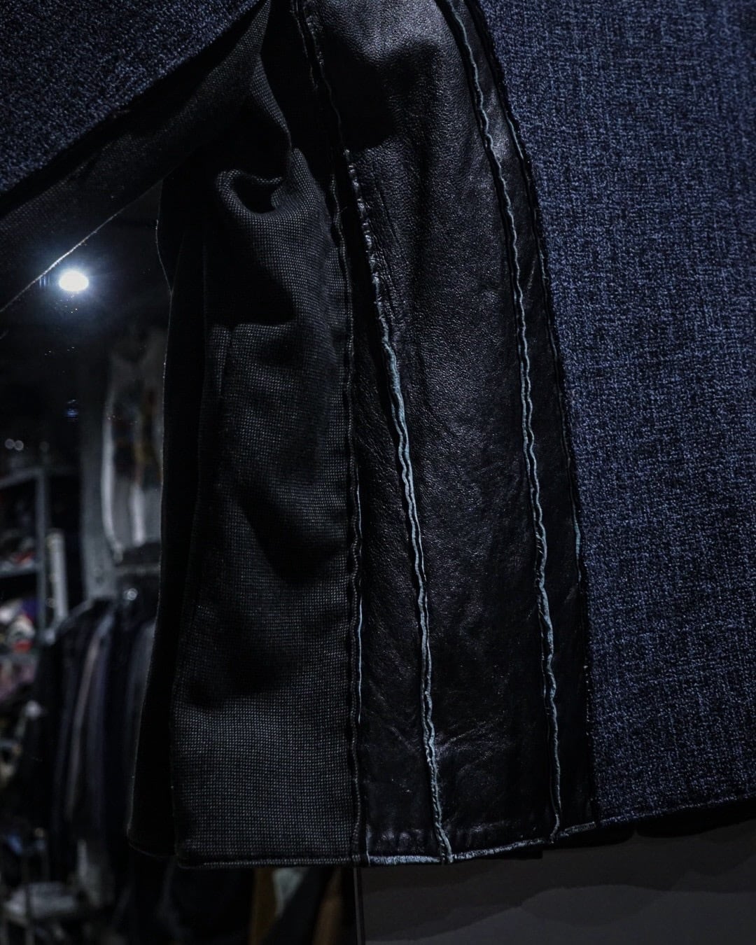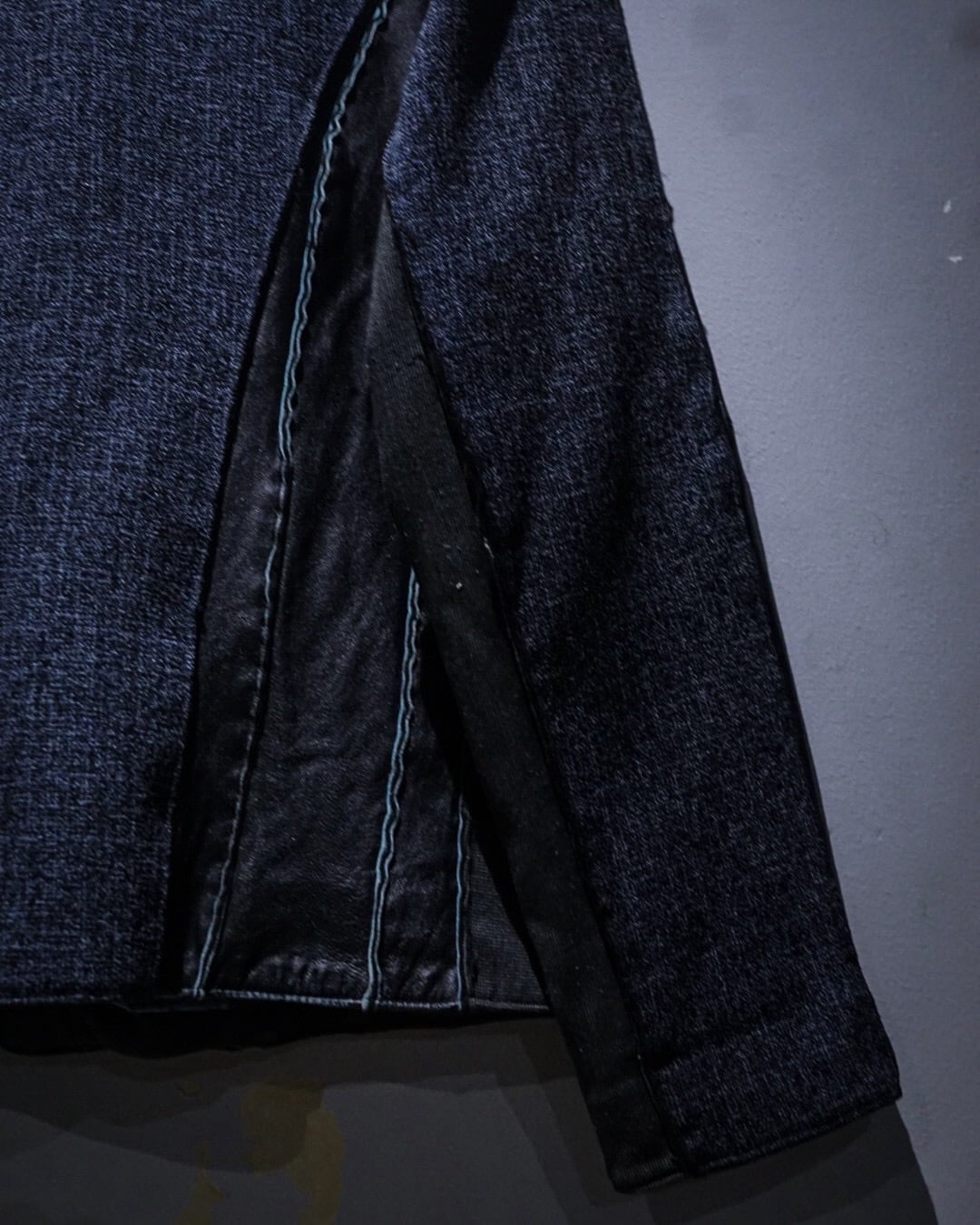 ポリを用いた軽やかなボディをベースに、前身頃から背面にかけてハリのある上質なレザーを切り替えたジャケット。