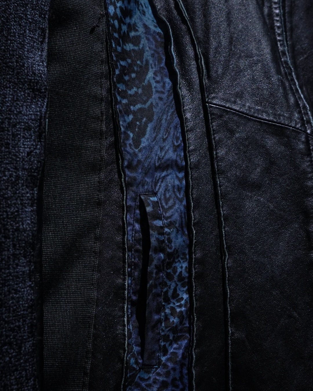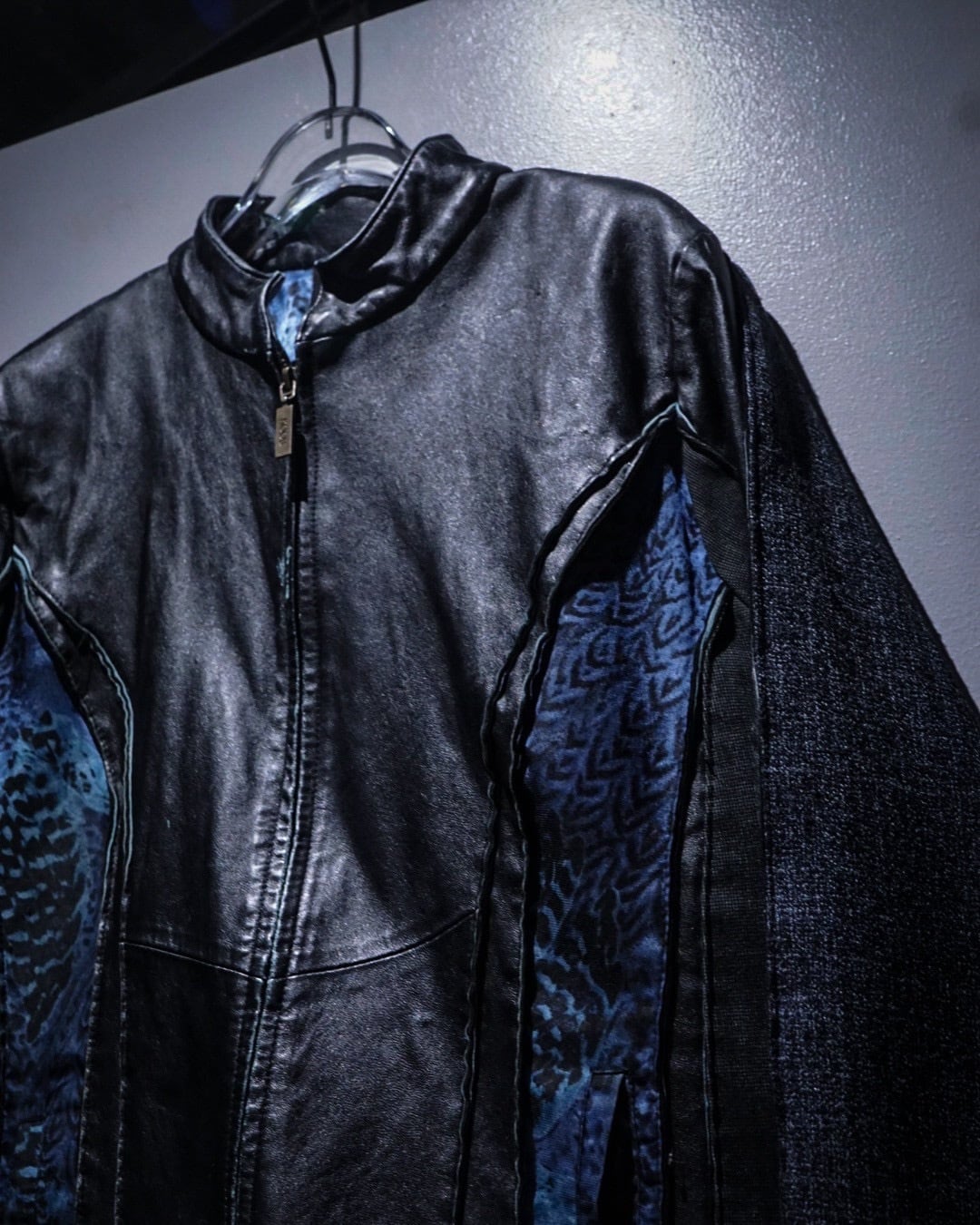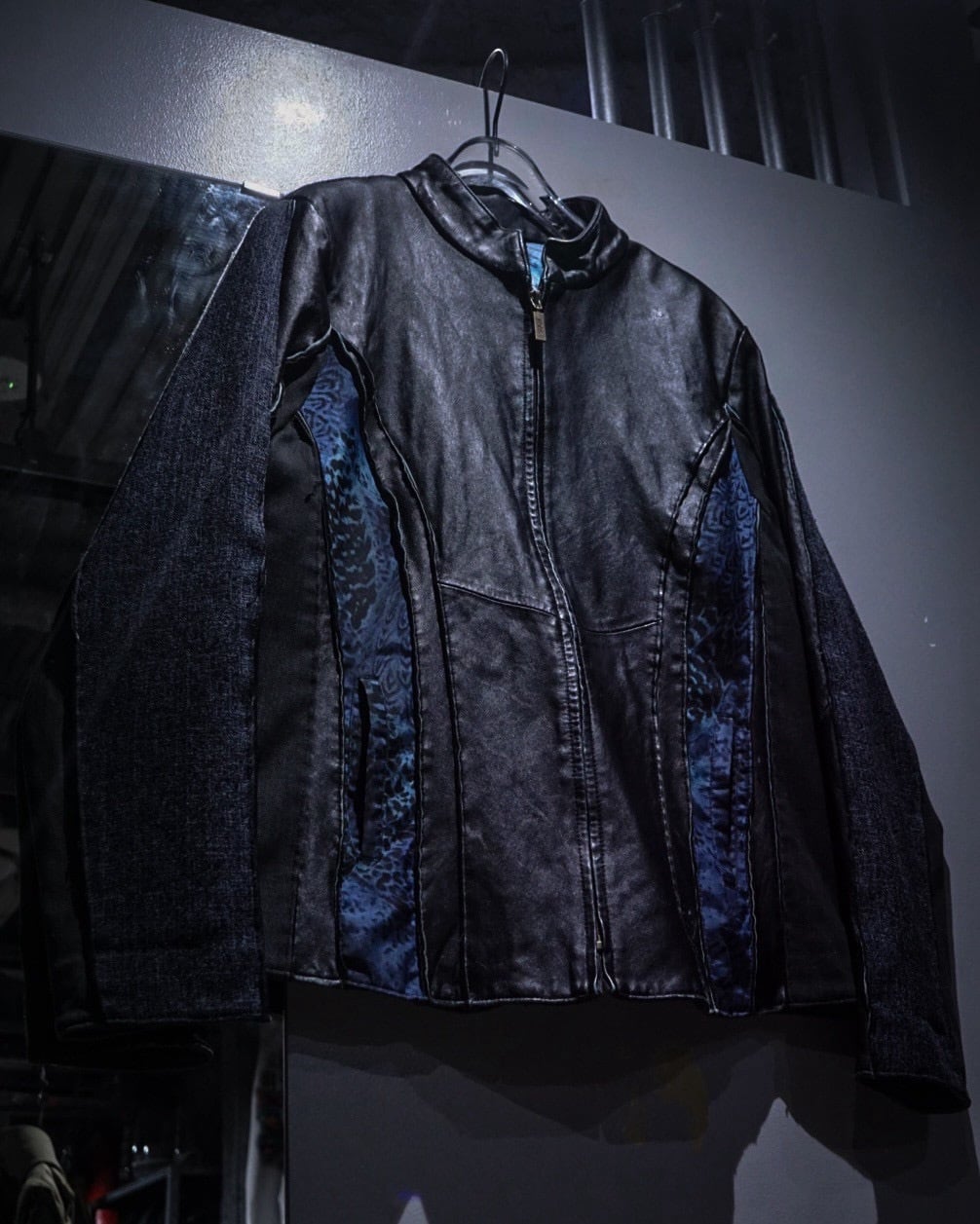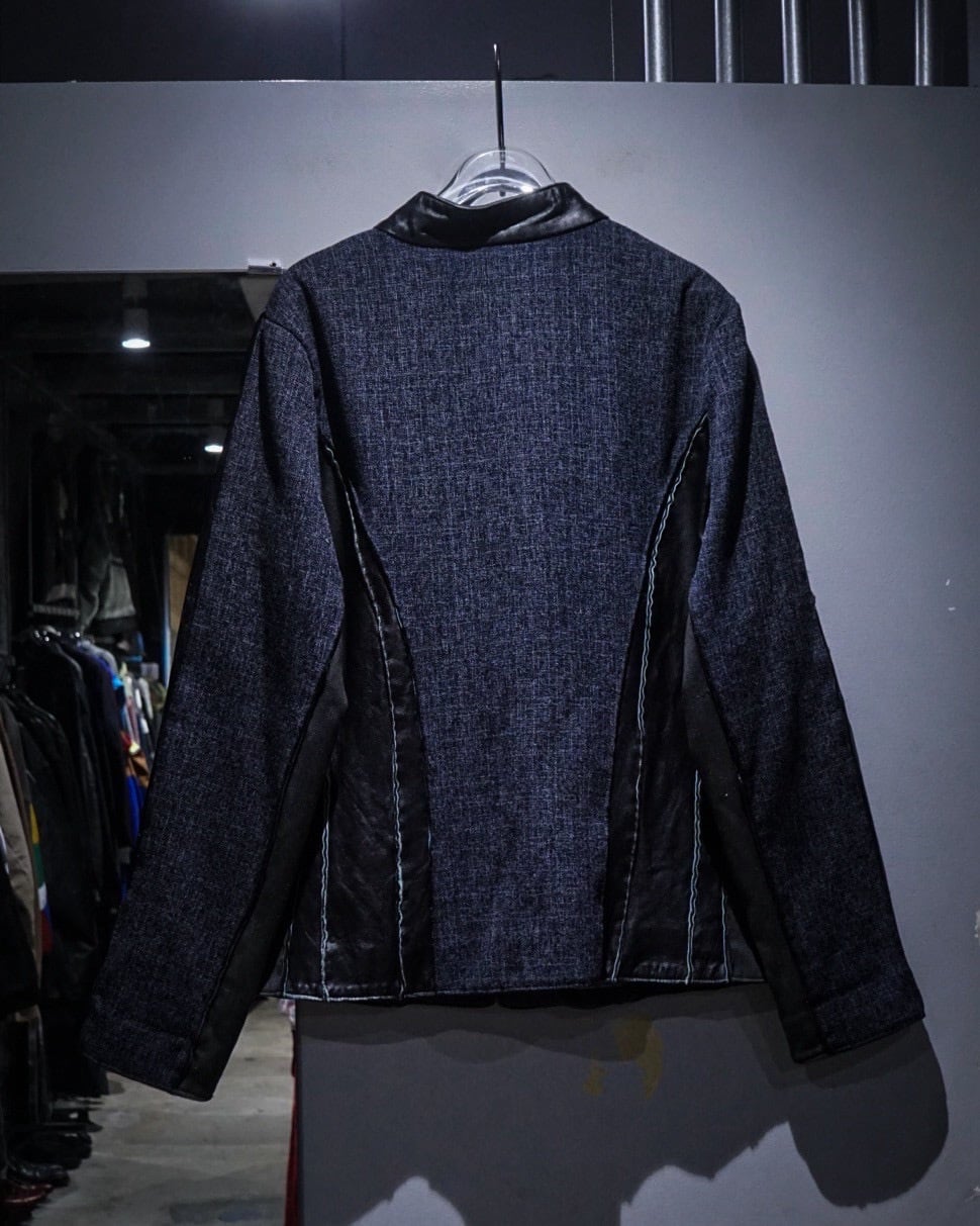 ポリを用いた軽やかなボディをベースに、前身頃から背面にかけてハリのある上質なレザーを切り替えたジャケット。