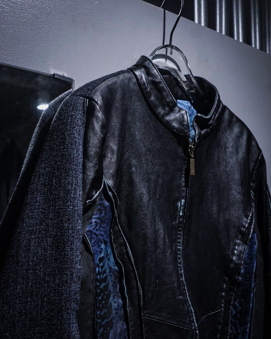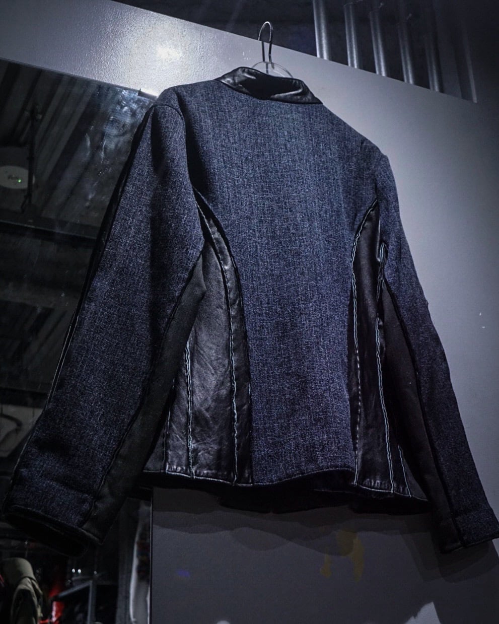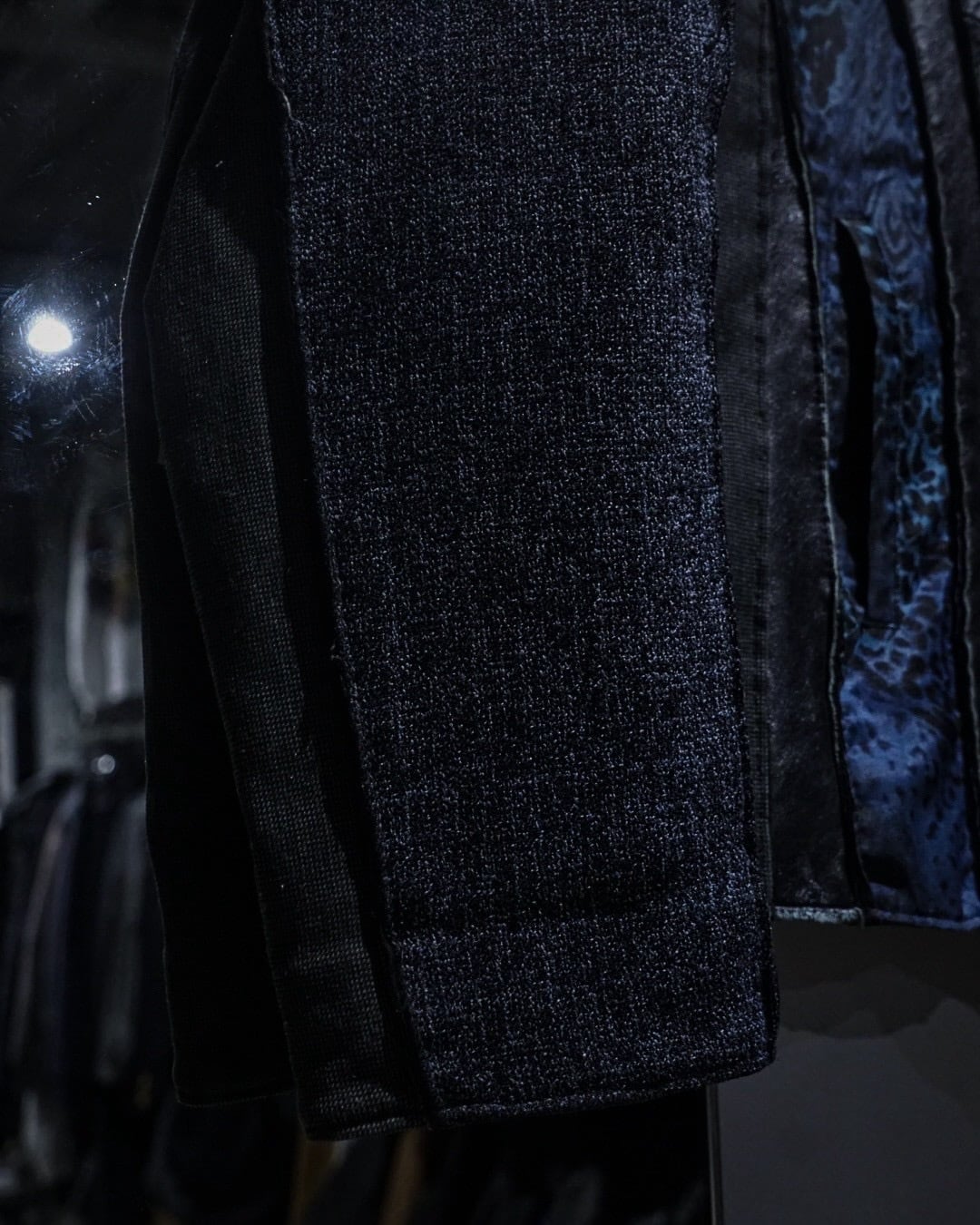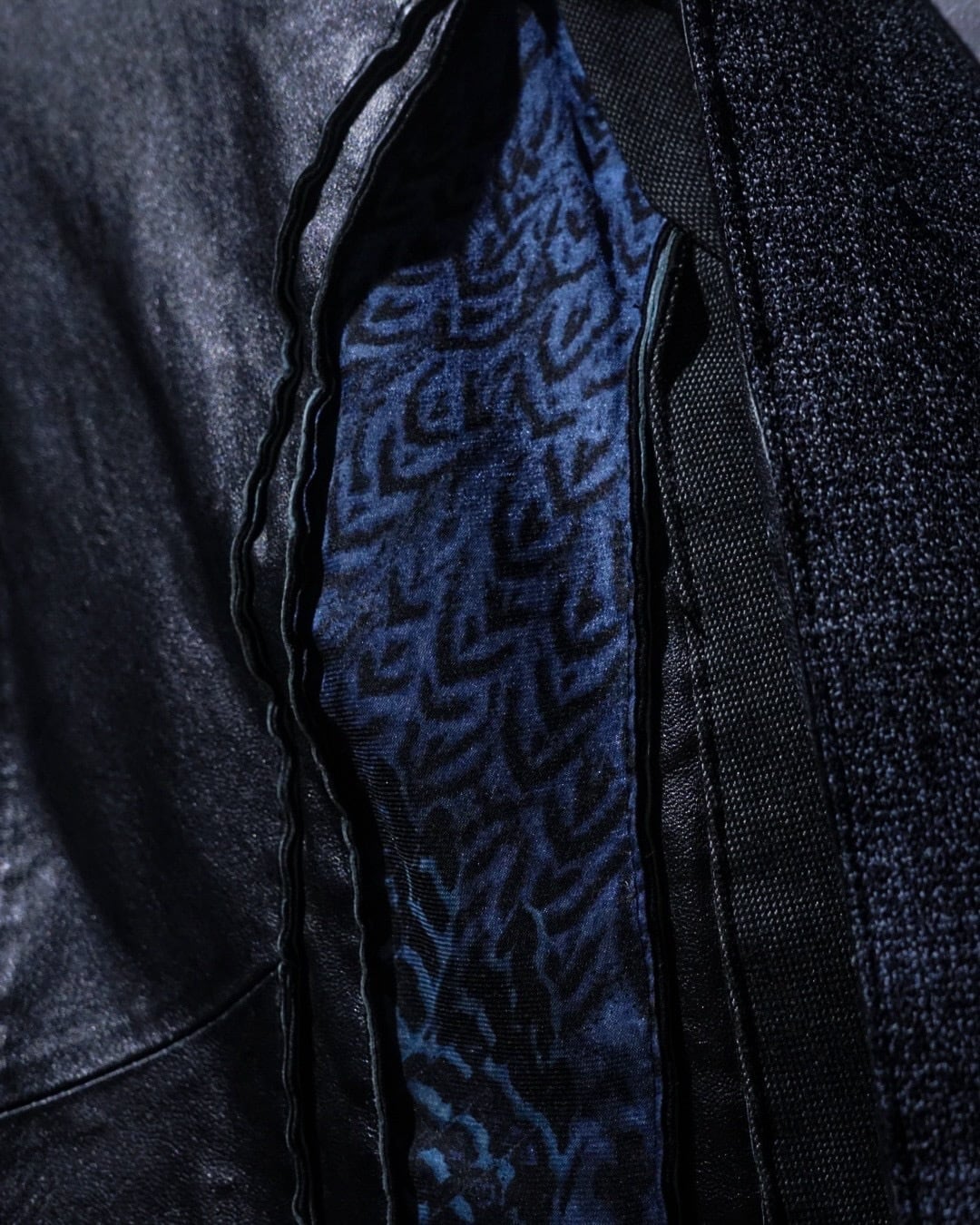 更に青×黒の抽象柄も切り替えられ、切り替え部分はインサイドアウトのデザインに仕上げられていたりと、このブランドならではの作り込みの精巧さに服好きの心ど真ん中を射抜かれます。ブランドネームが刻まれたジップトップも◎
