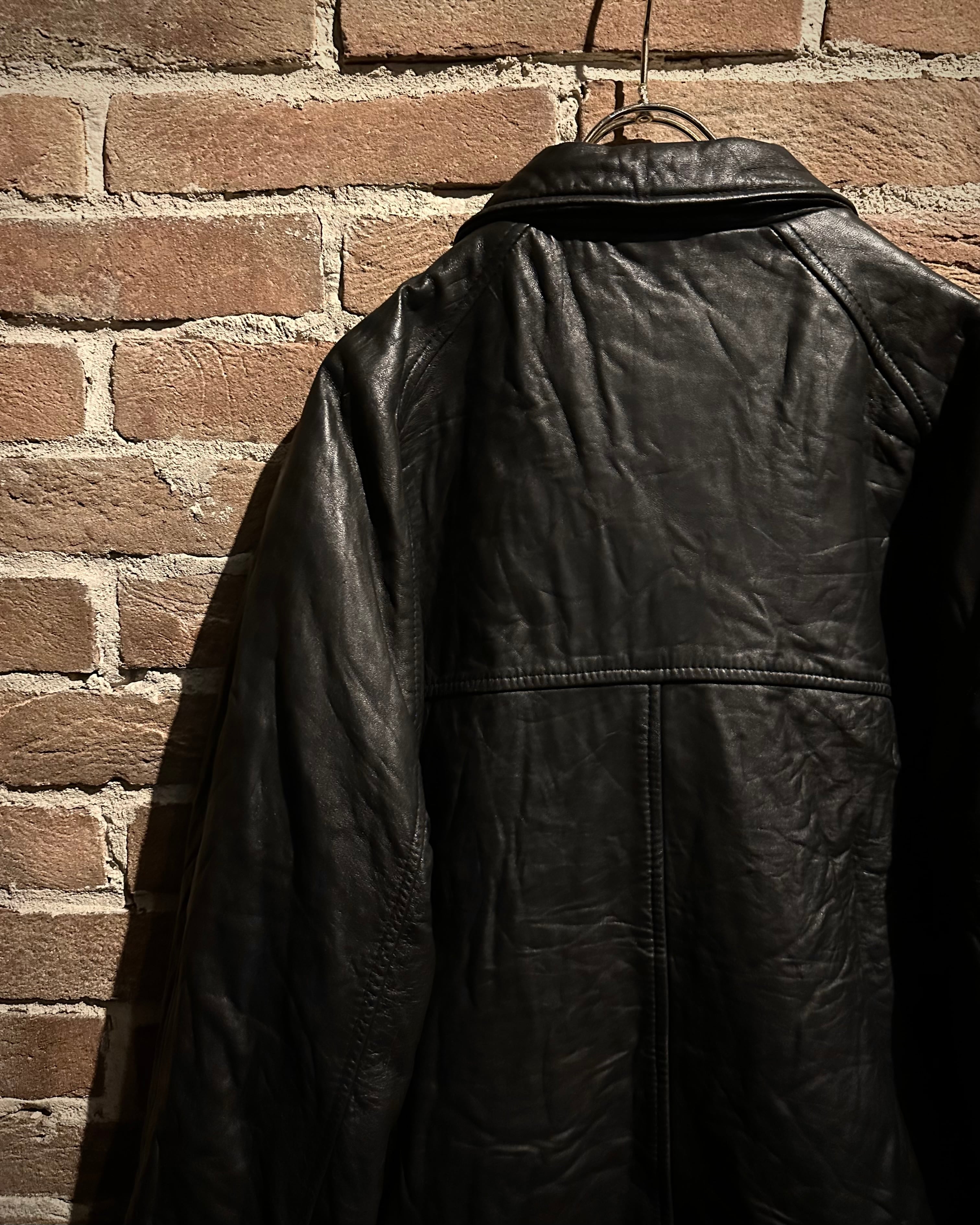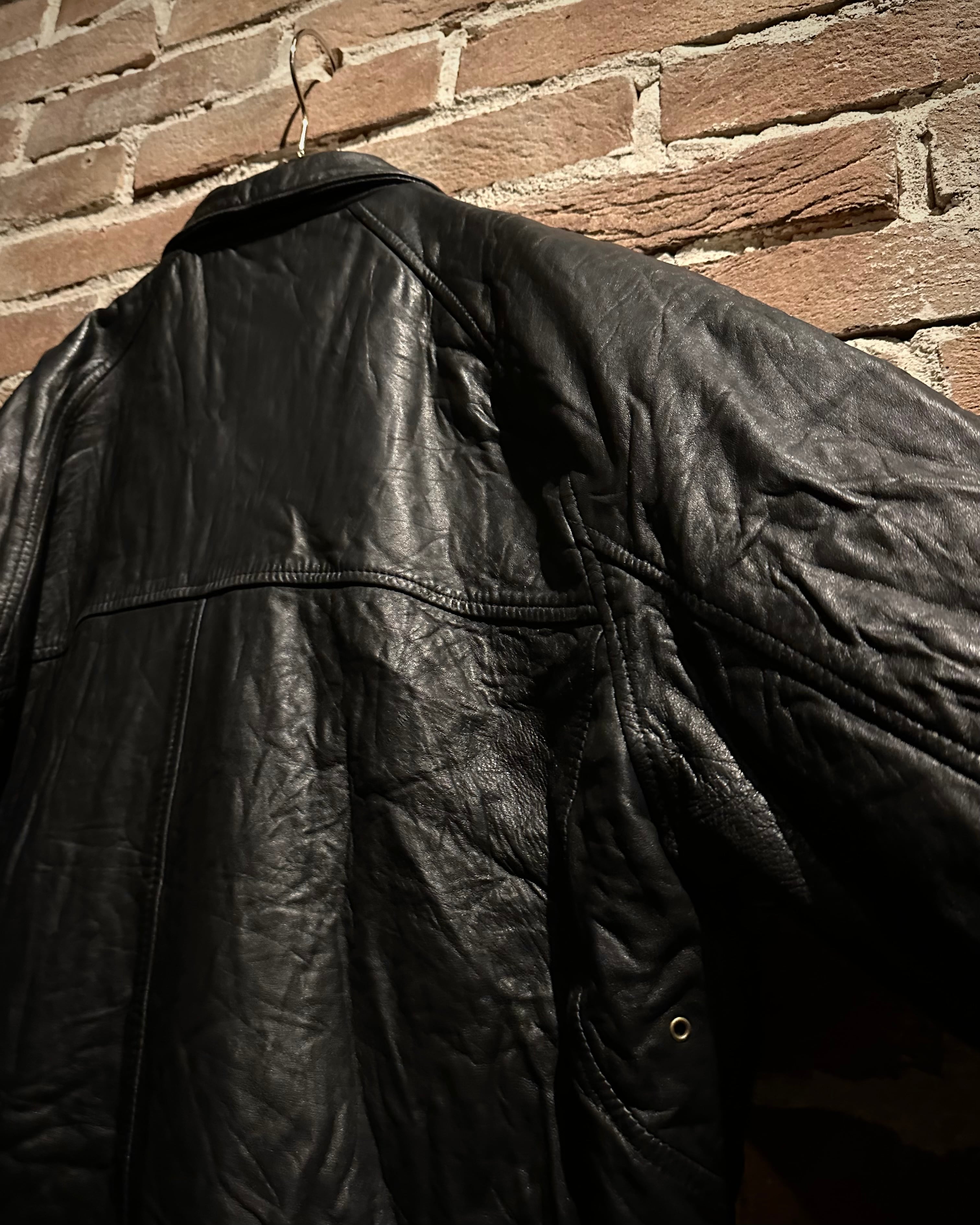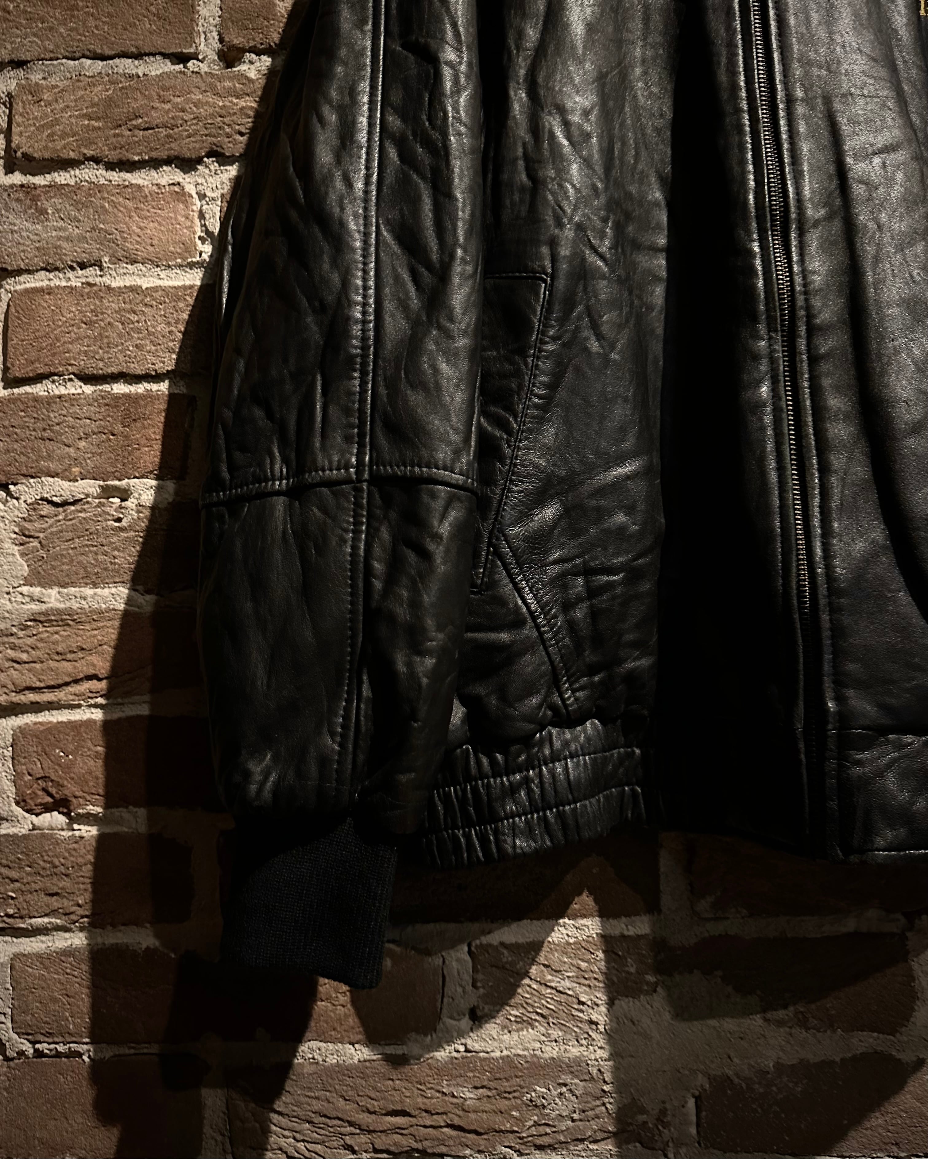 ブラックレザー特有の鈍い艶感と、着込まれることで生まれた自然なシワが深みのある表情を演出。身体に沿うように馴染み、リアルレザーならではの存在感と経年変化を楽しめます。