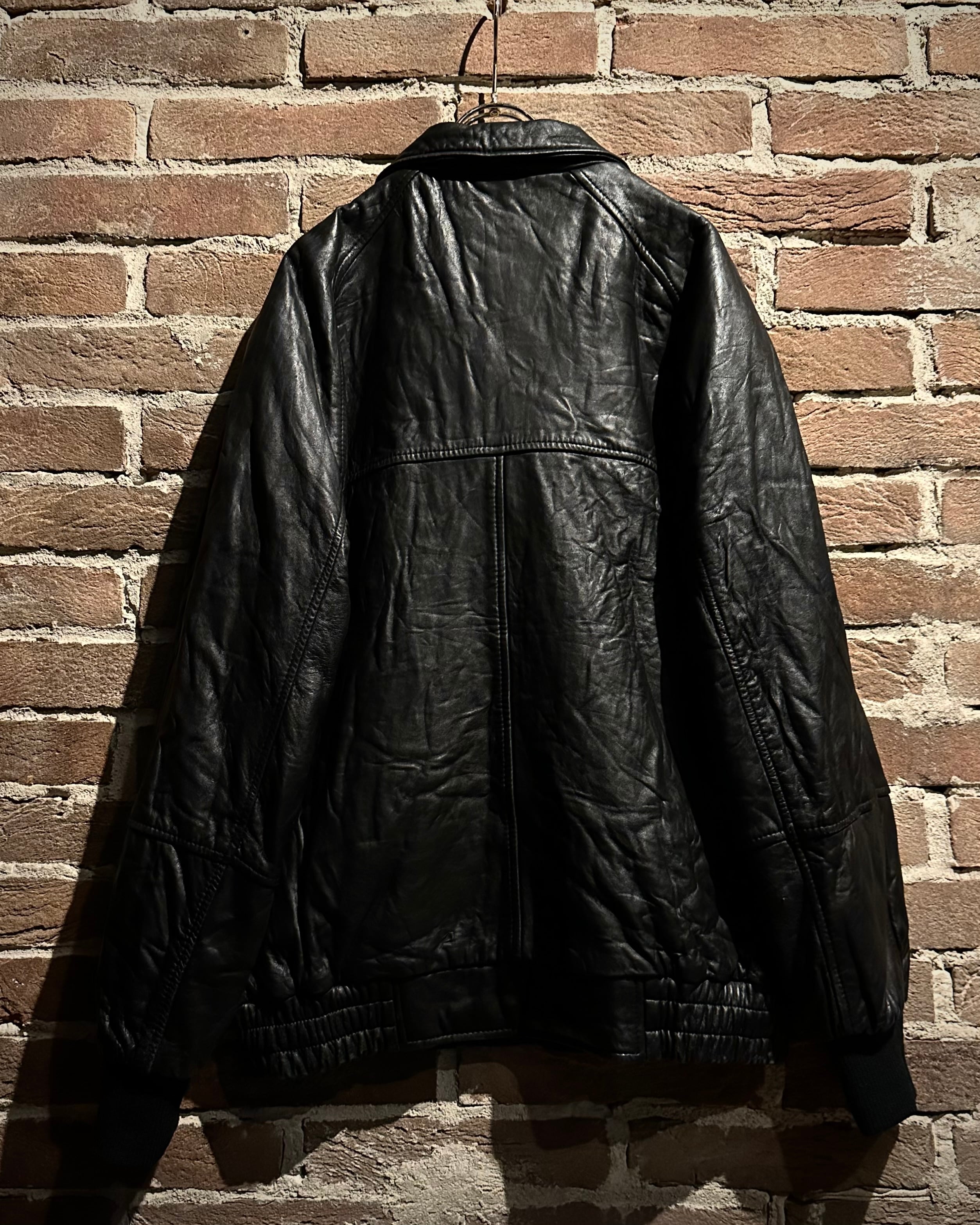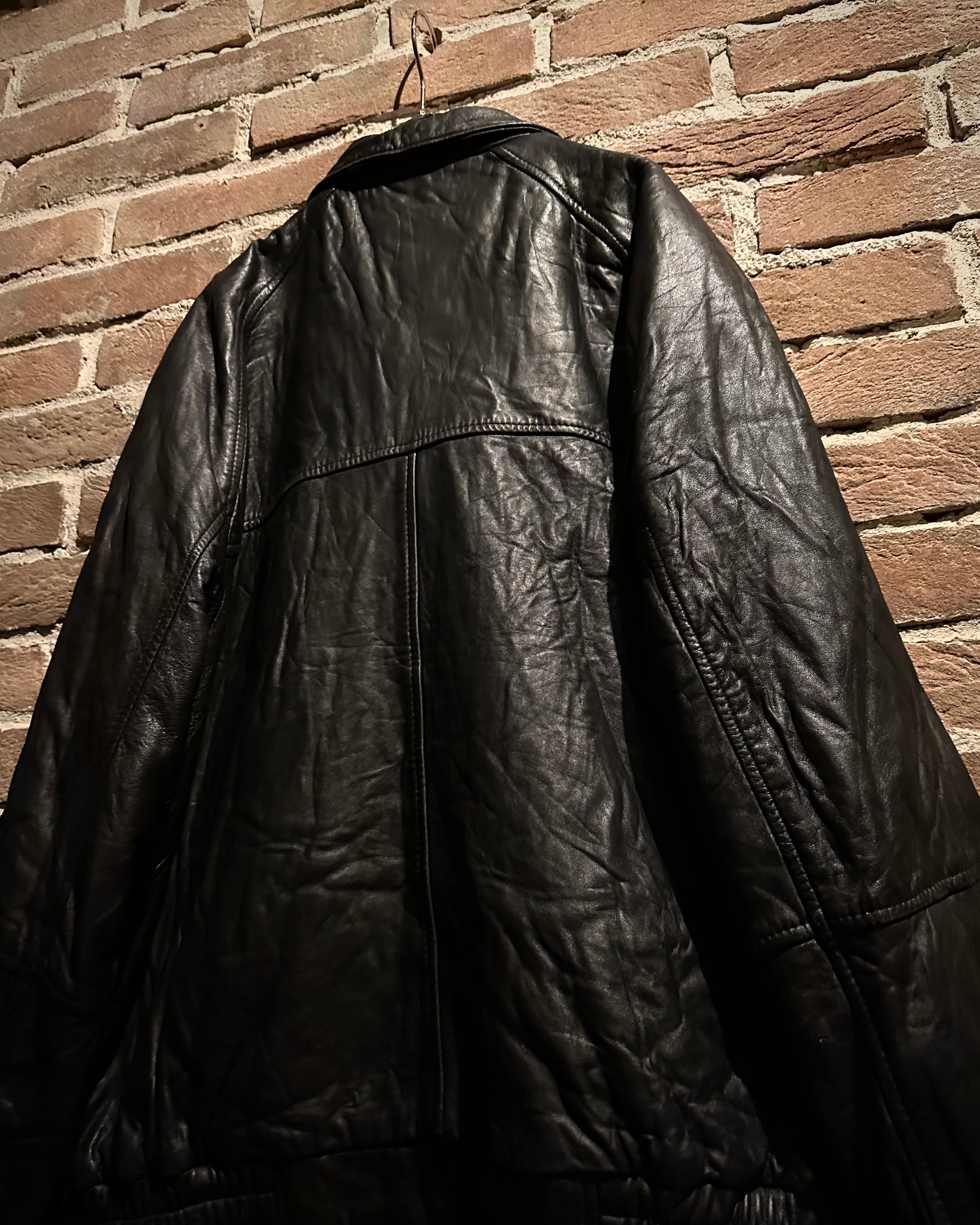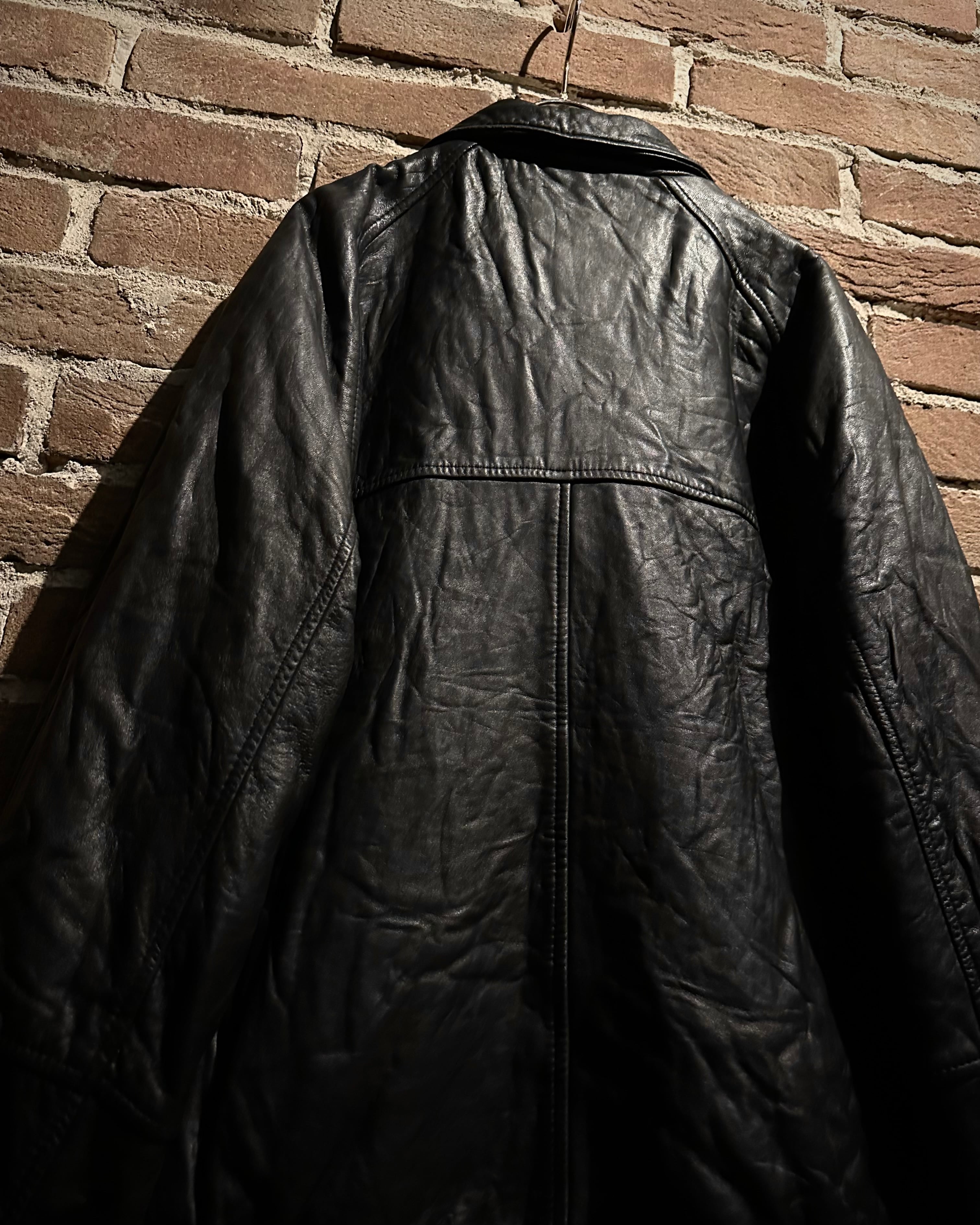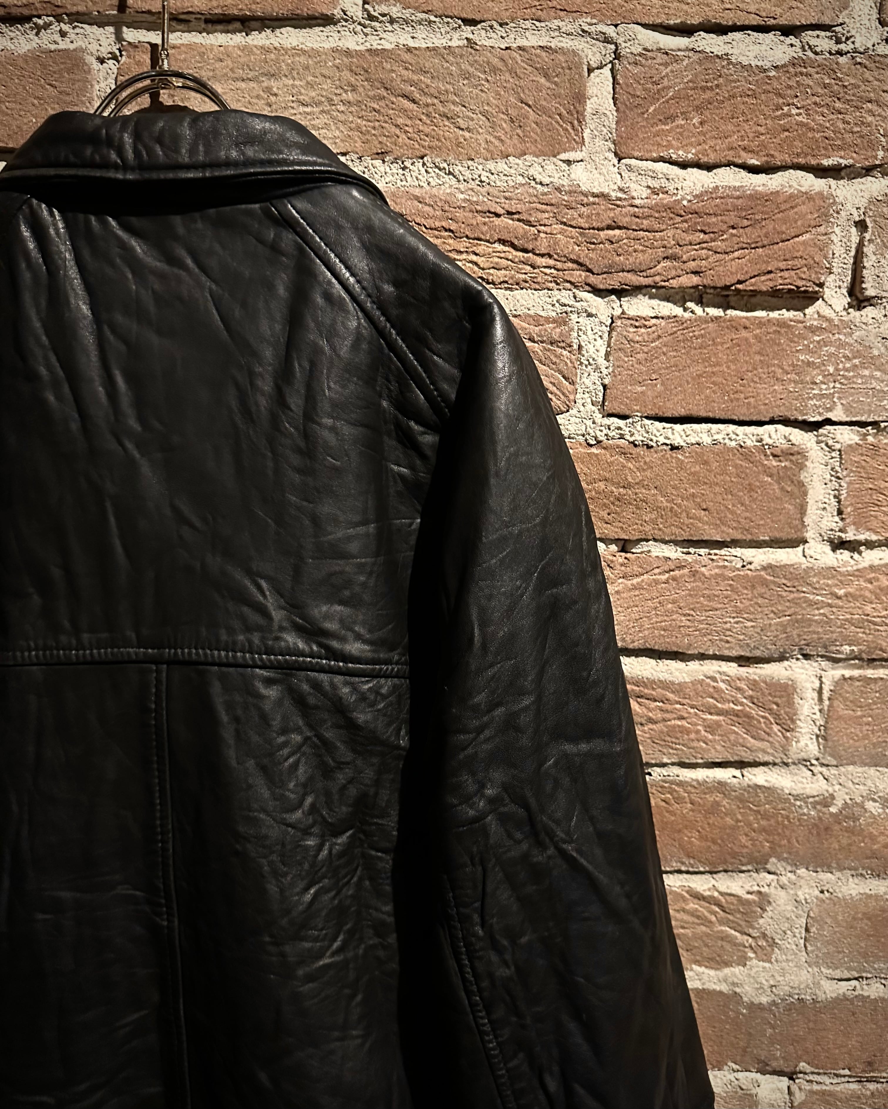 ブラックレザー特有の鈍い艶感と、着込まれることで生まれた自然なシワが深みのある表情を演出。身体に沿うように馴染み、リアルレザーならではの存在感と経年変化を楽しめます。
