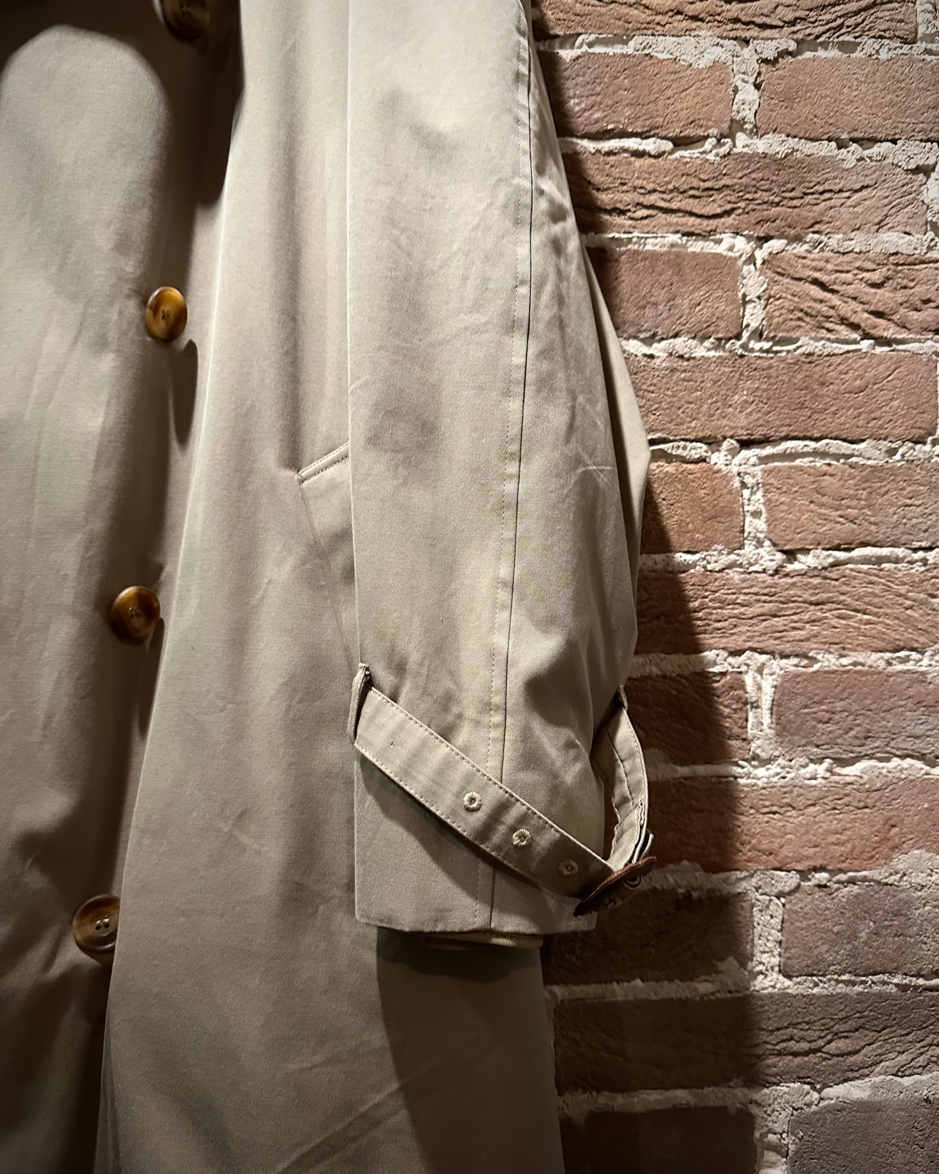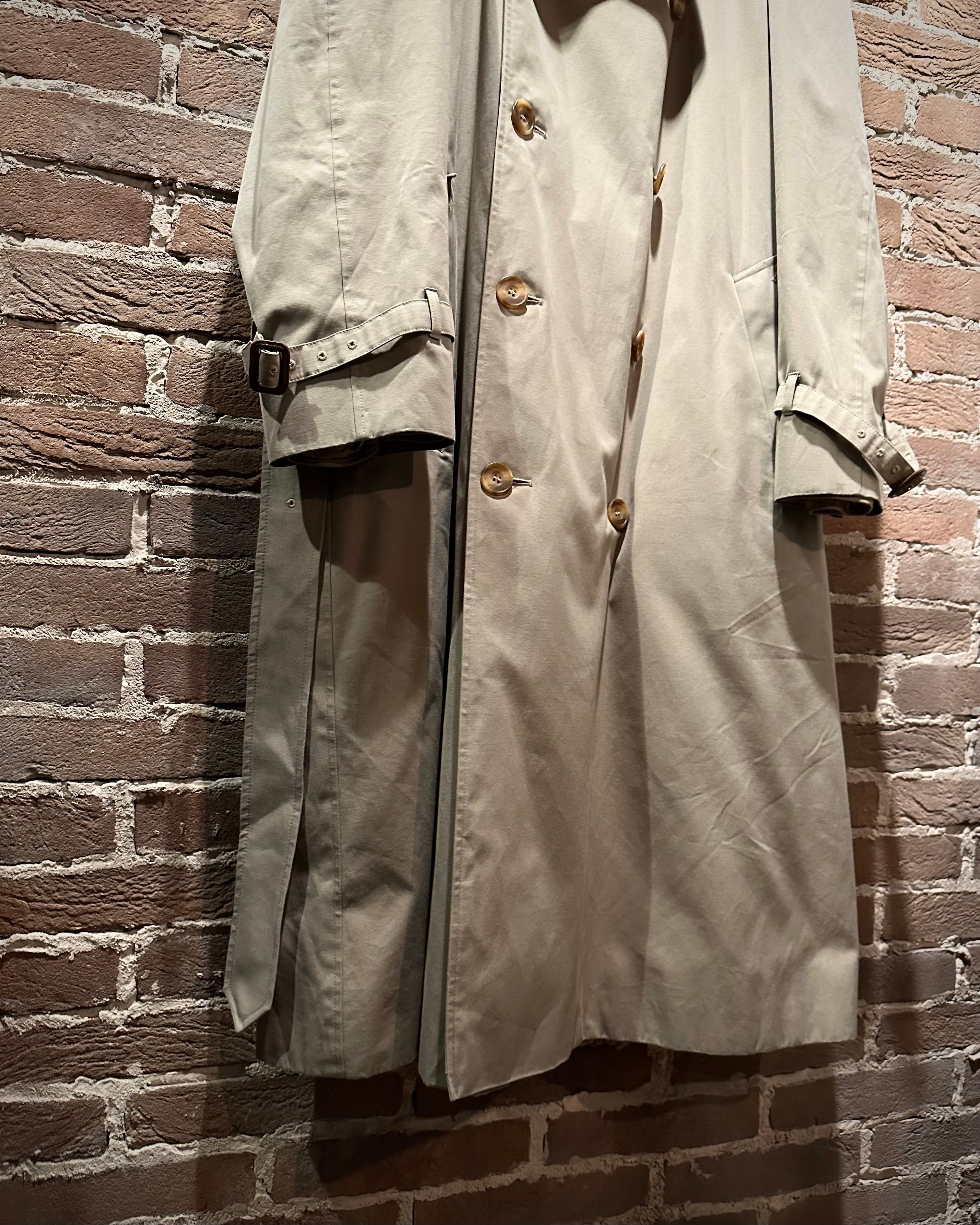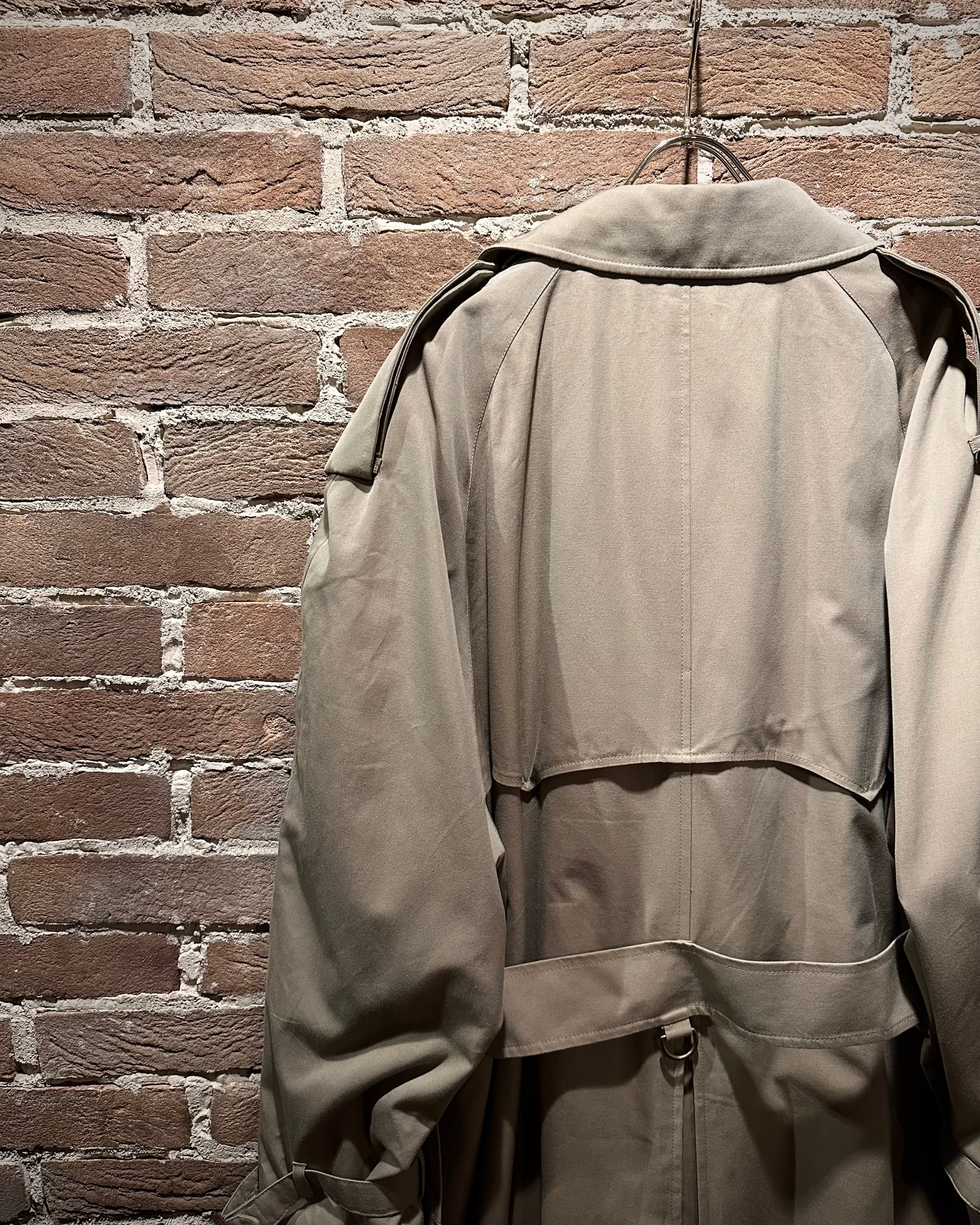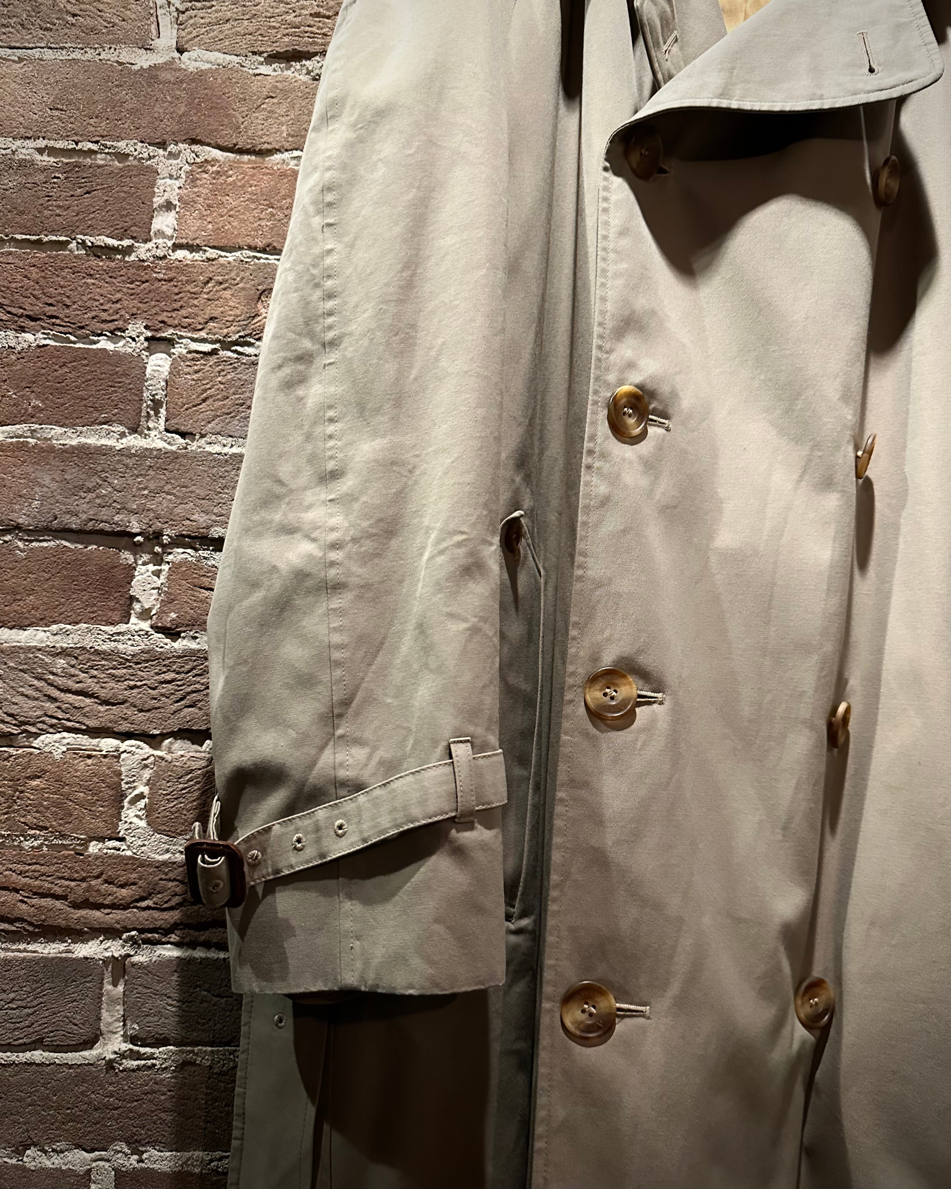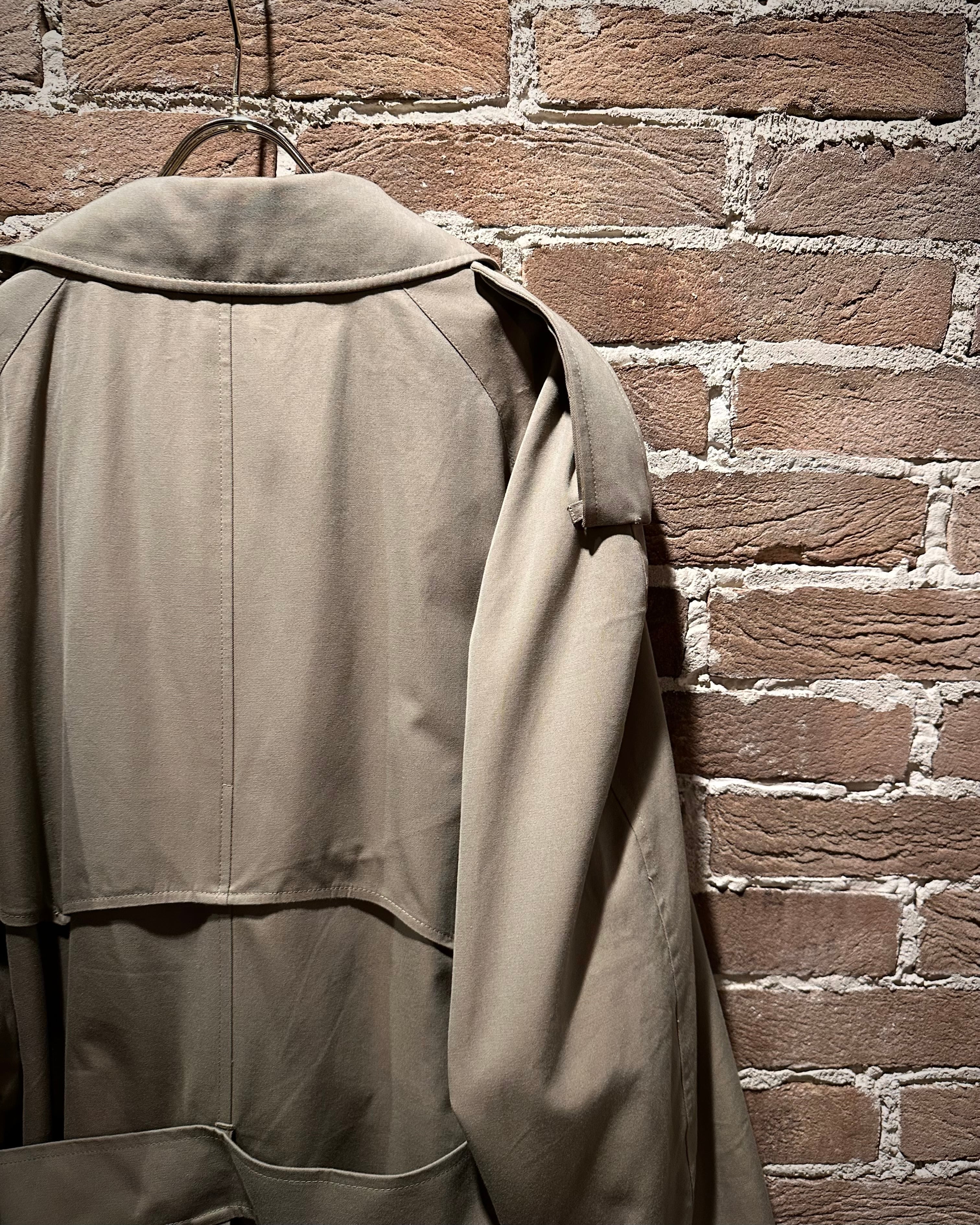 フロントはダブル仕様。エポレットやストームシールドなど、トレンチの王道ディテールも抜かりなく、取り外し可能なライナーとベルトを備えた完品コンディション。3シーズン活躍してくれる実用性も兼備しています。