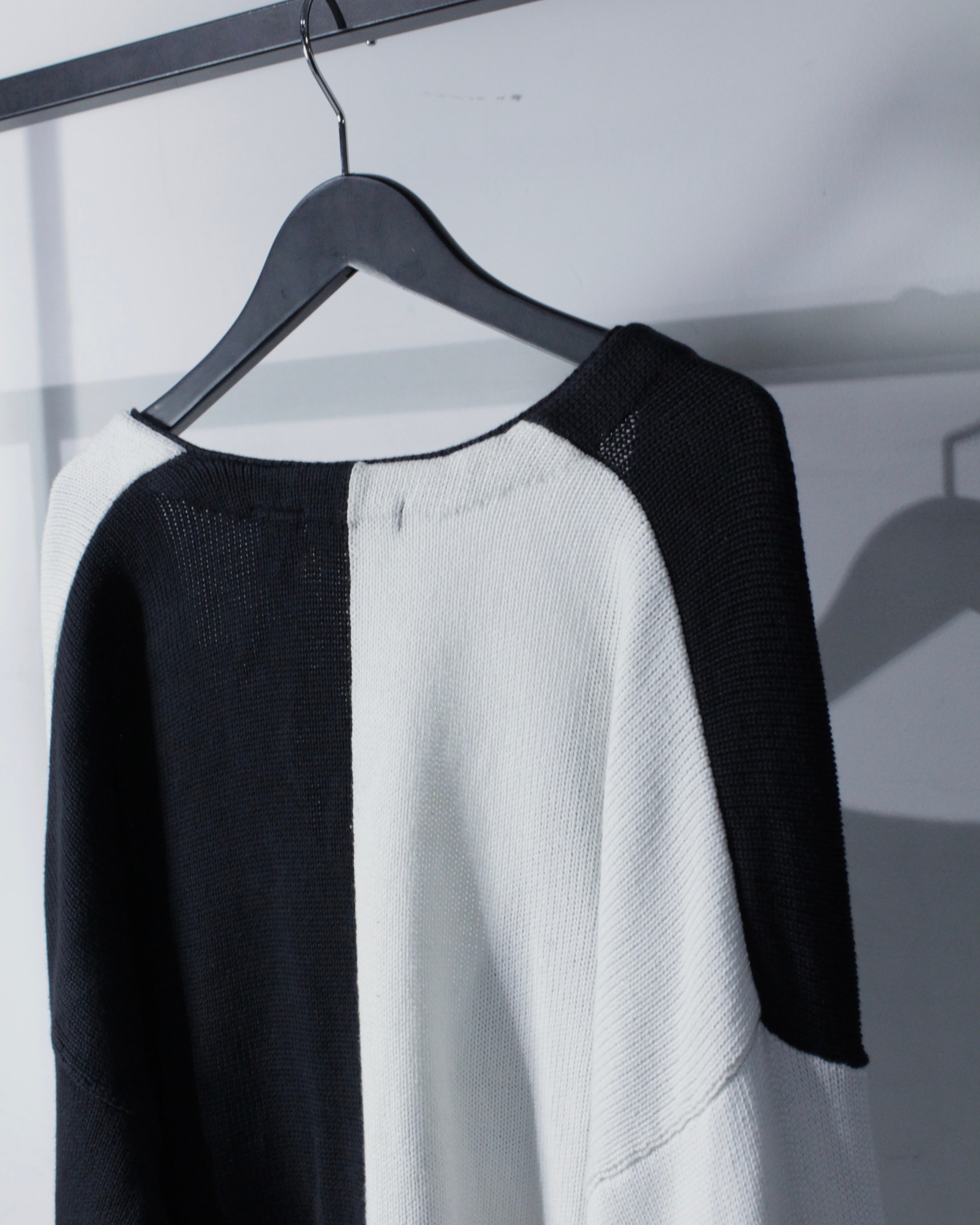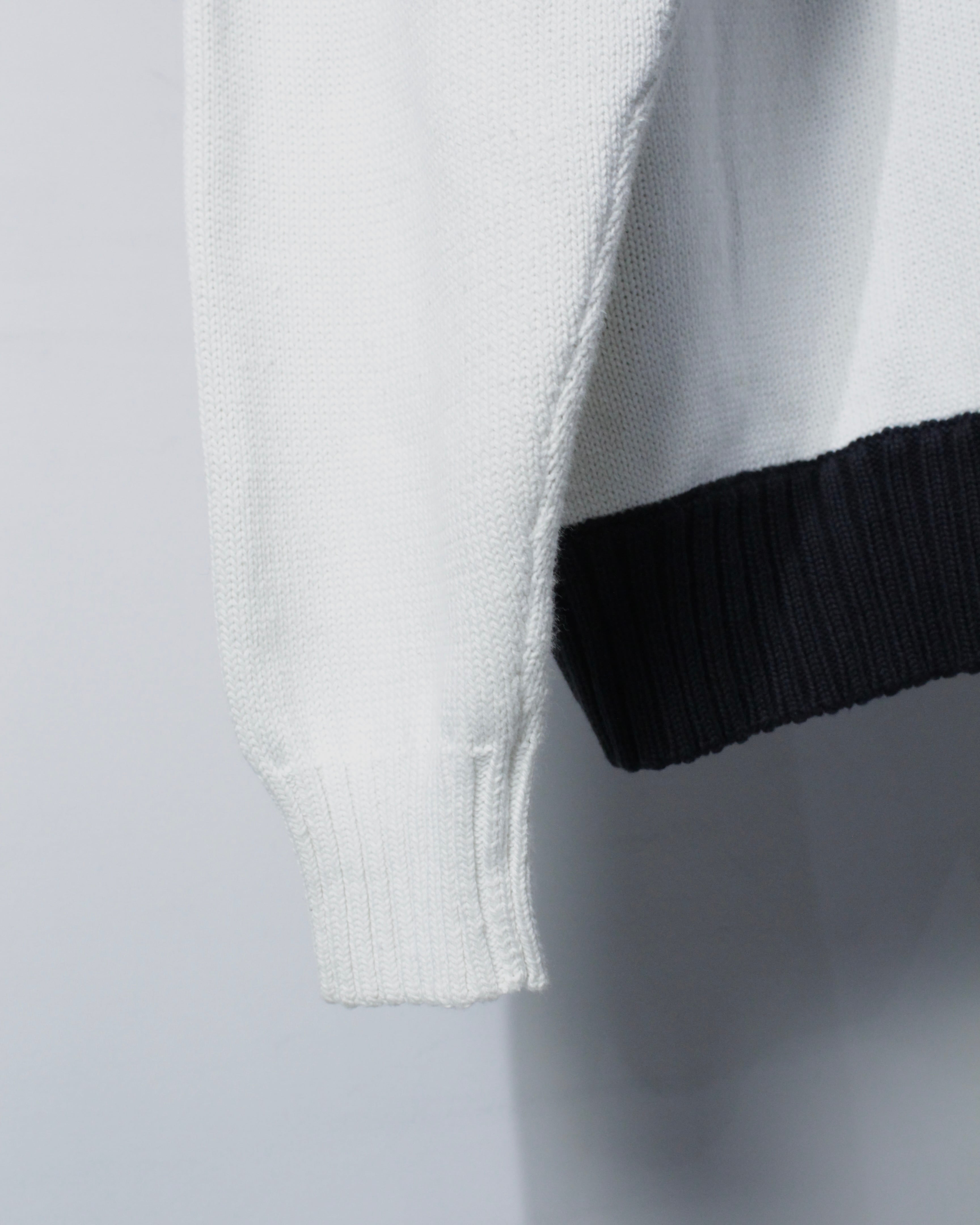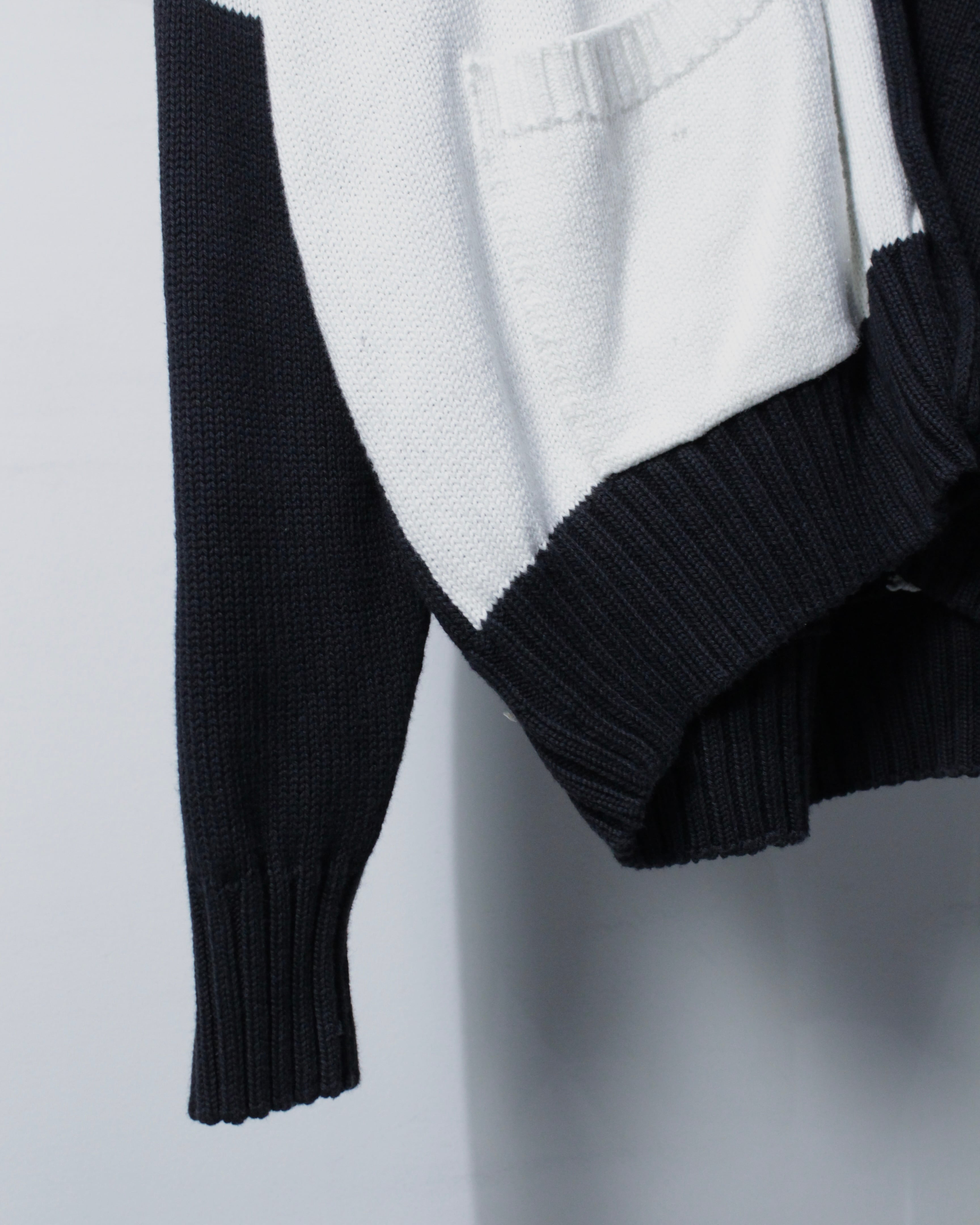ブラックとホワイトを大胆に切り替えたブロッキングデザインが目を惹く1着。左右で表情の異なるコントラストは、シンプルでありながら確かな存在感を放つ仕上がりに。