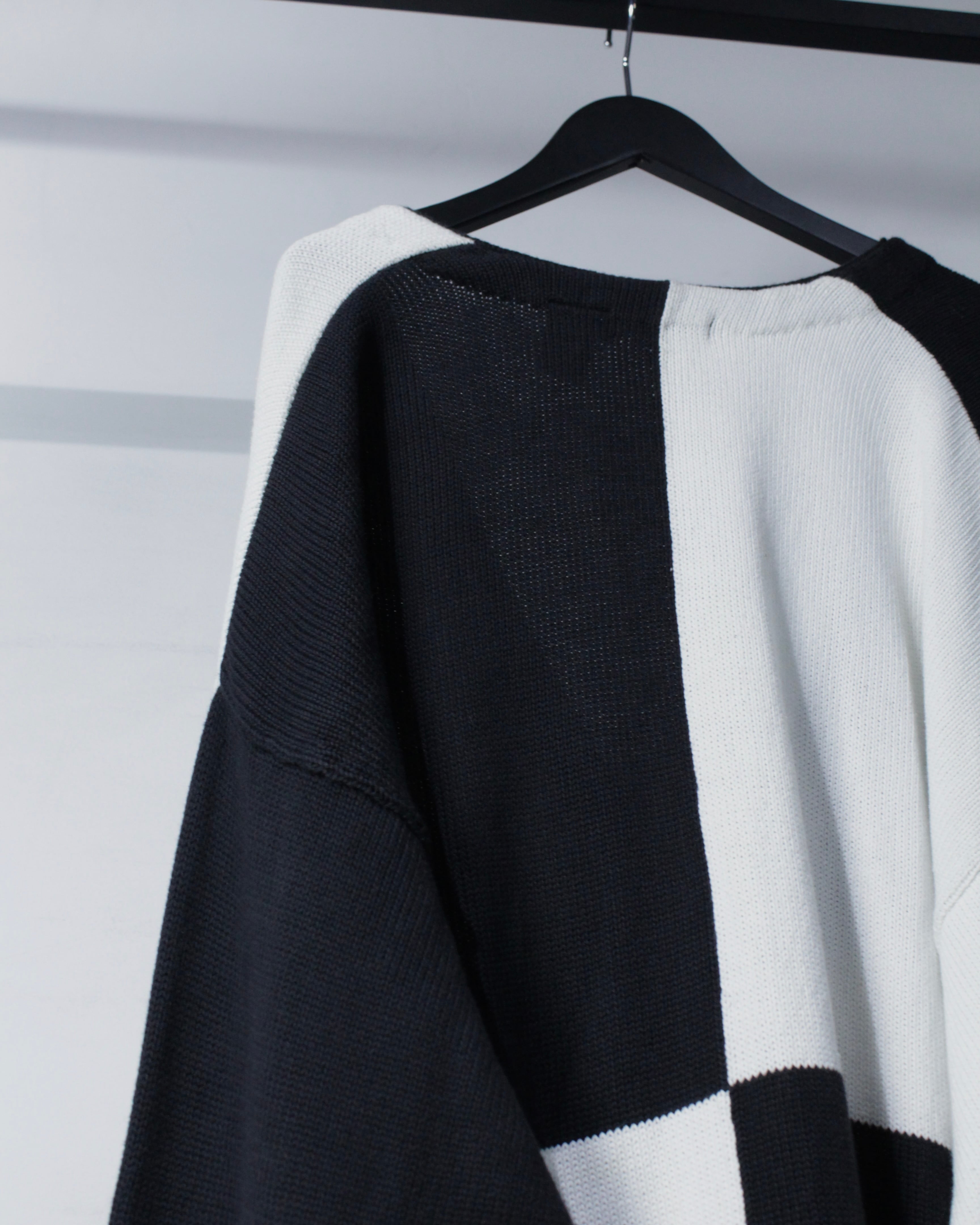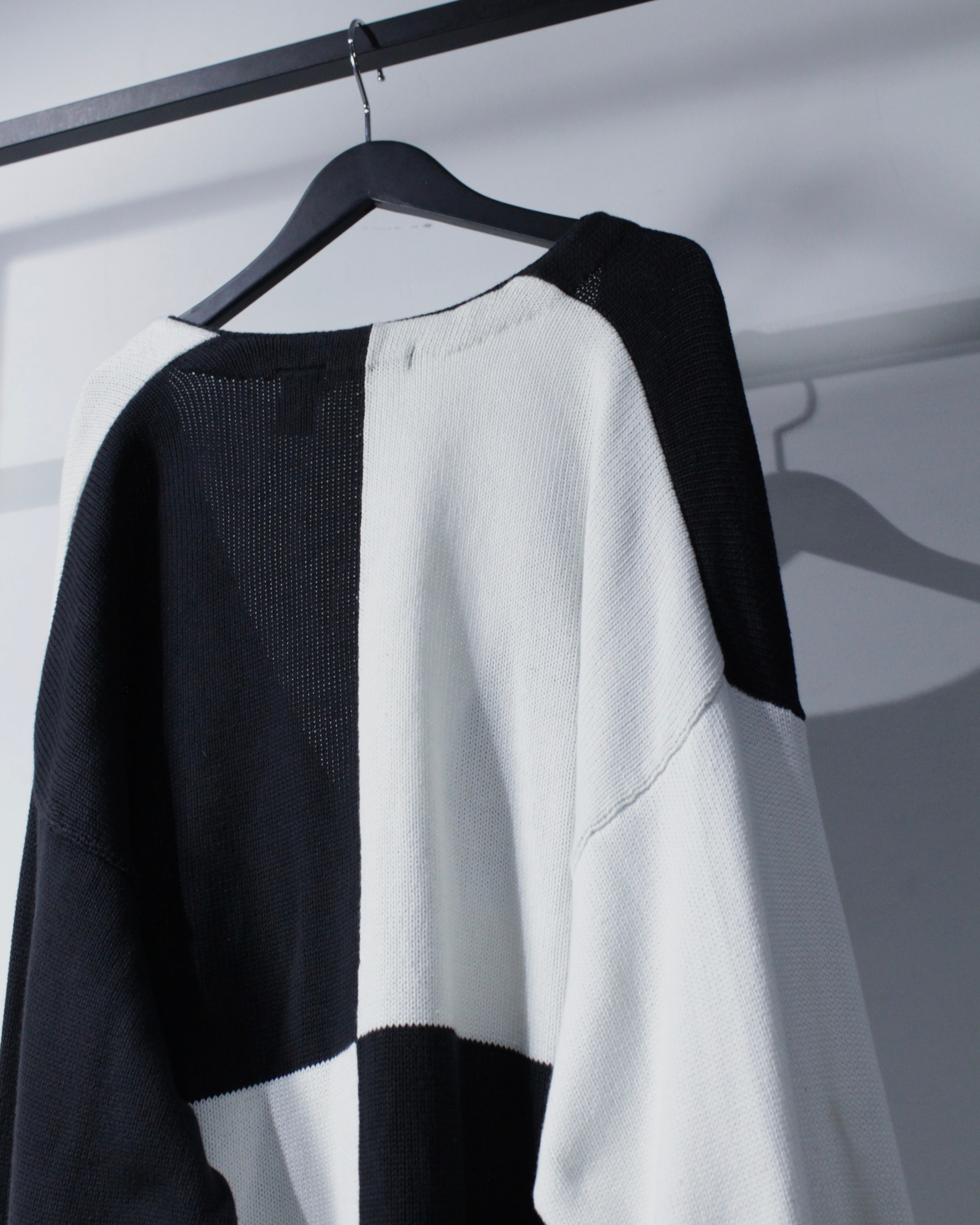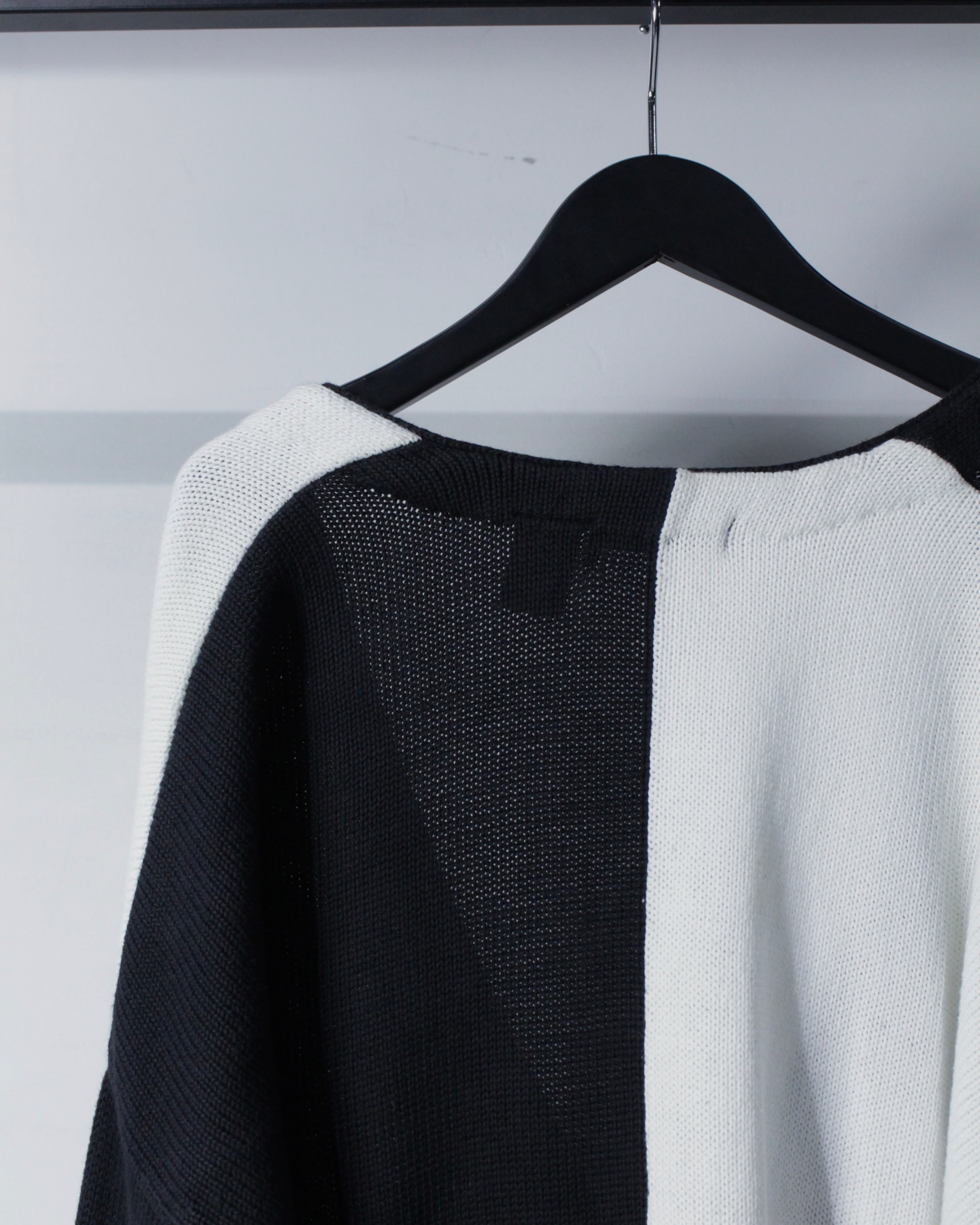 ブラックとホワイトを大胆に切り替えたブロッキングデザインが目を惹く1着。左右で表情の異なるコントラストは、シンプルでありながら確かな存在感を放つ仕上がりに。