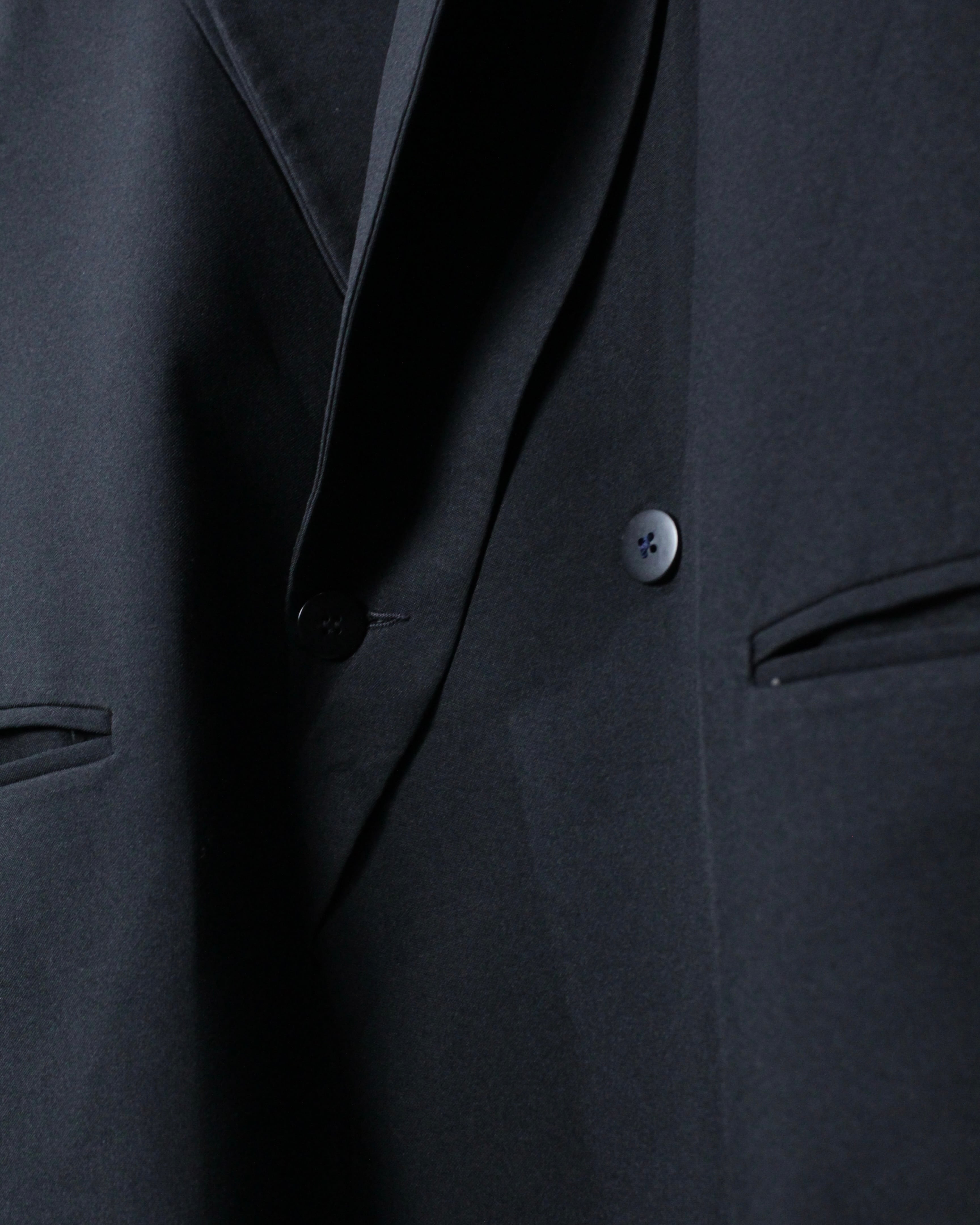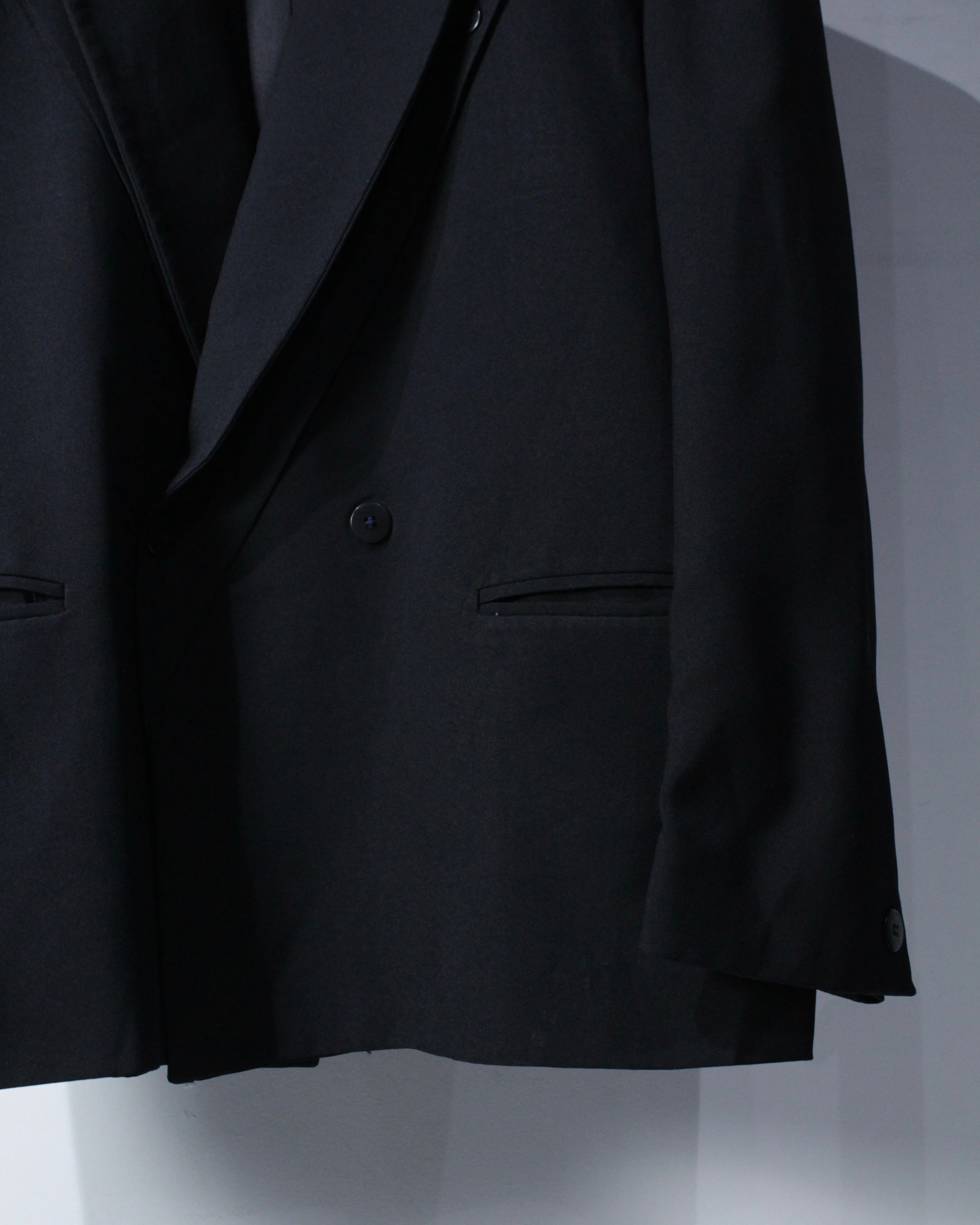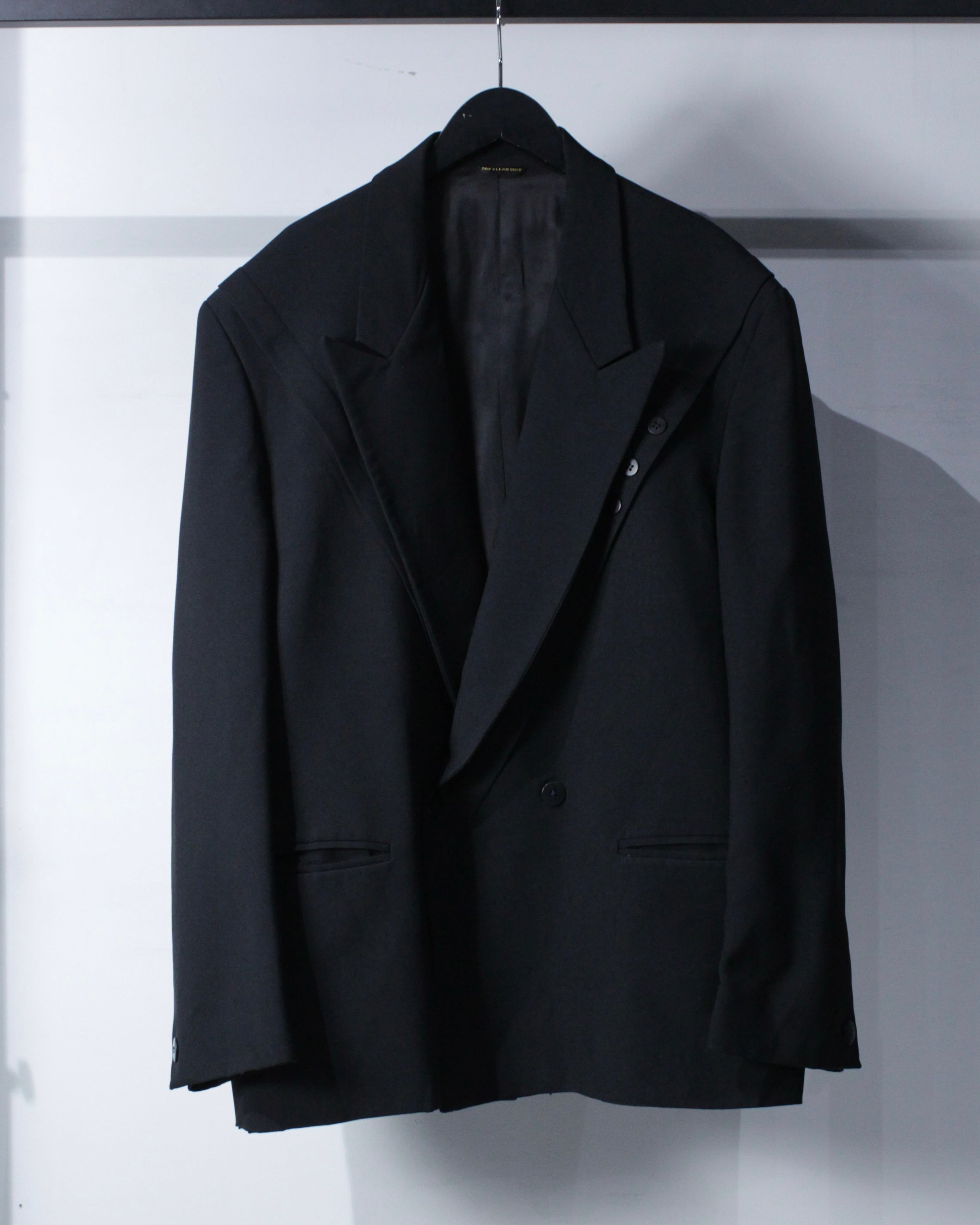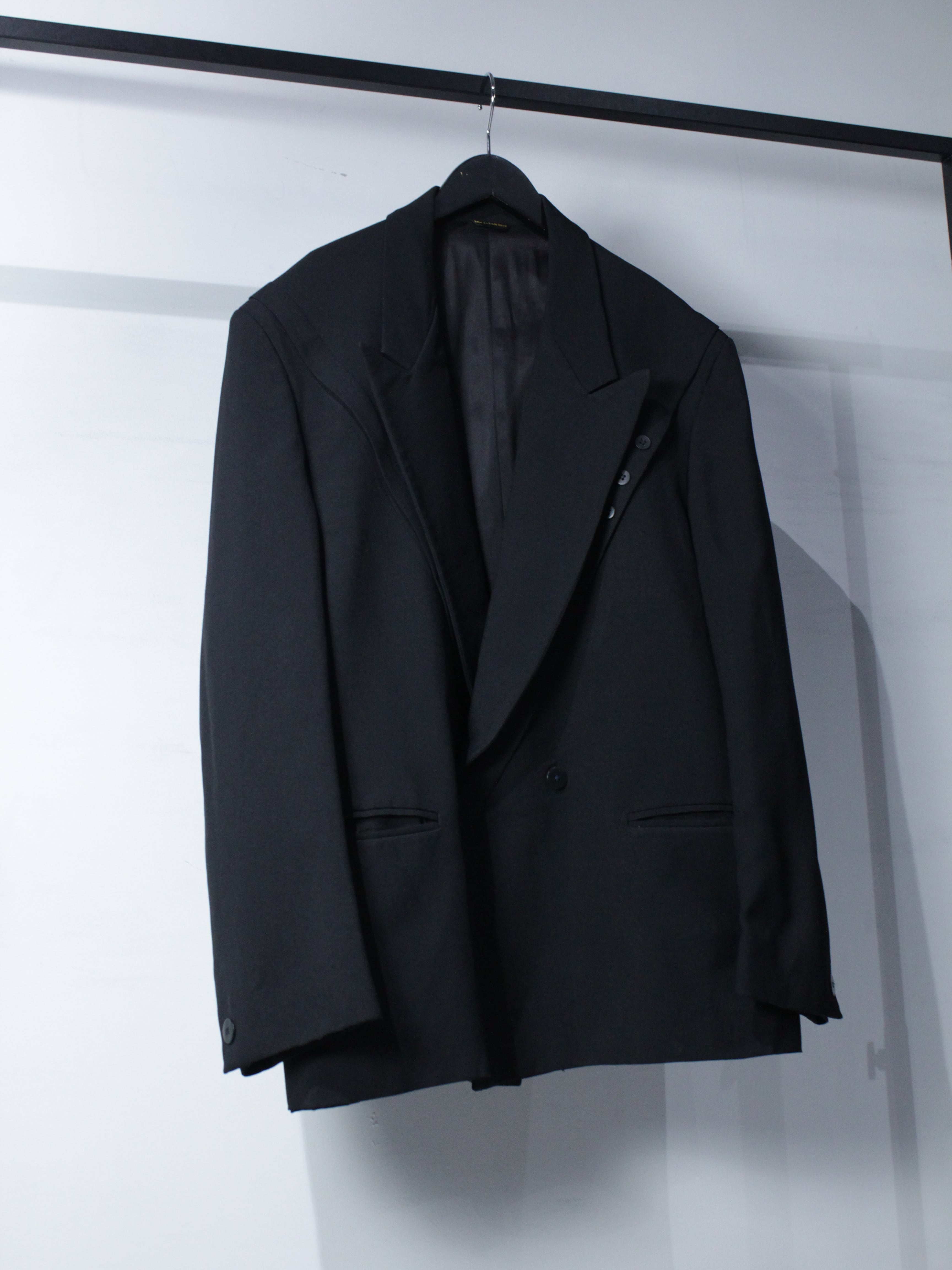 フロントはクラシックなダブルブレスト。鋭角に伸びるピークドラペルが力強さと色気を演出し、胸元に自然な立体感を生み出します。