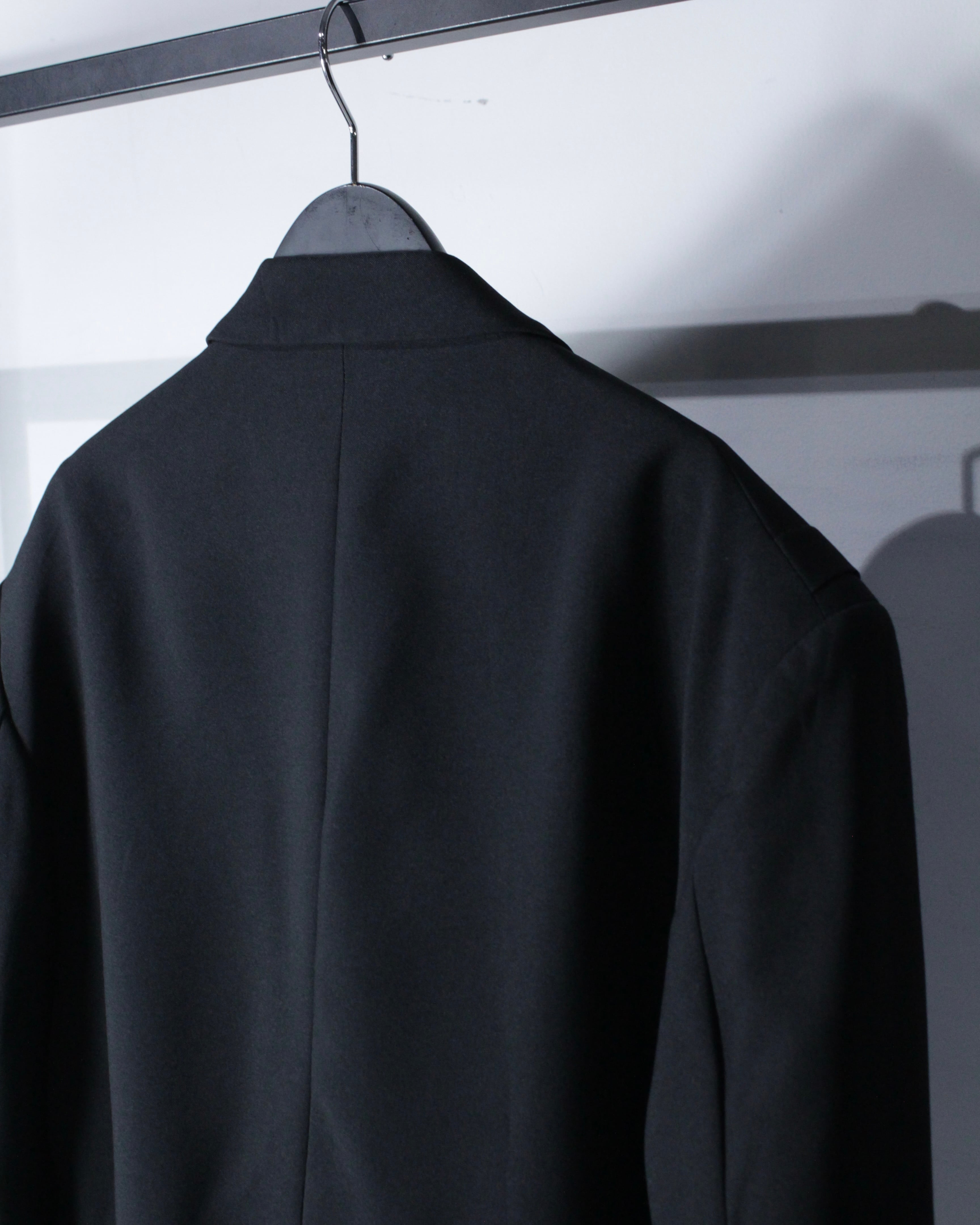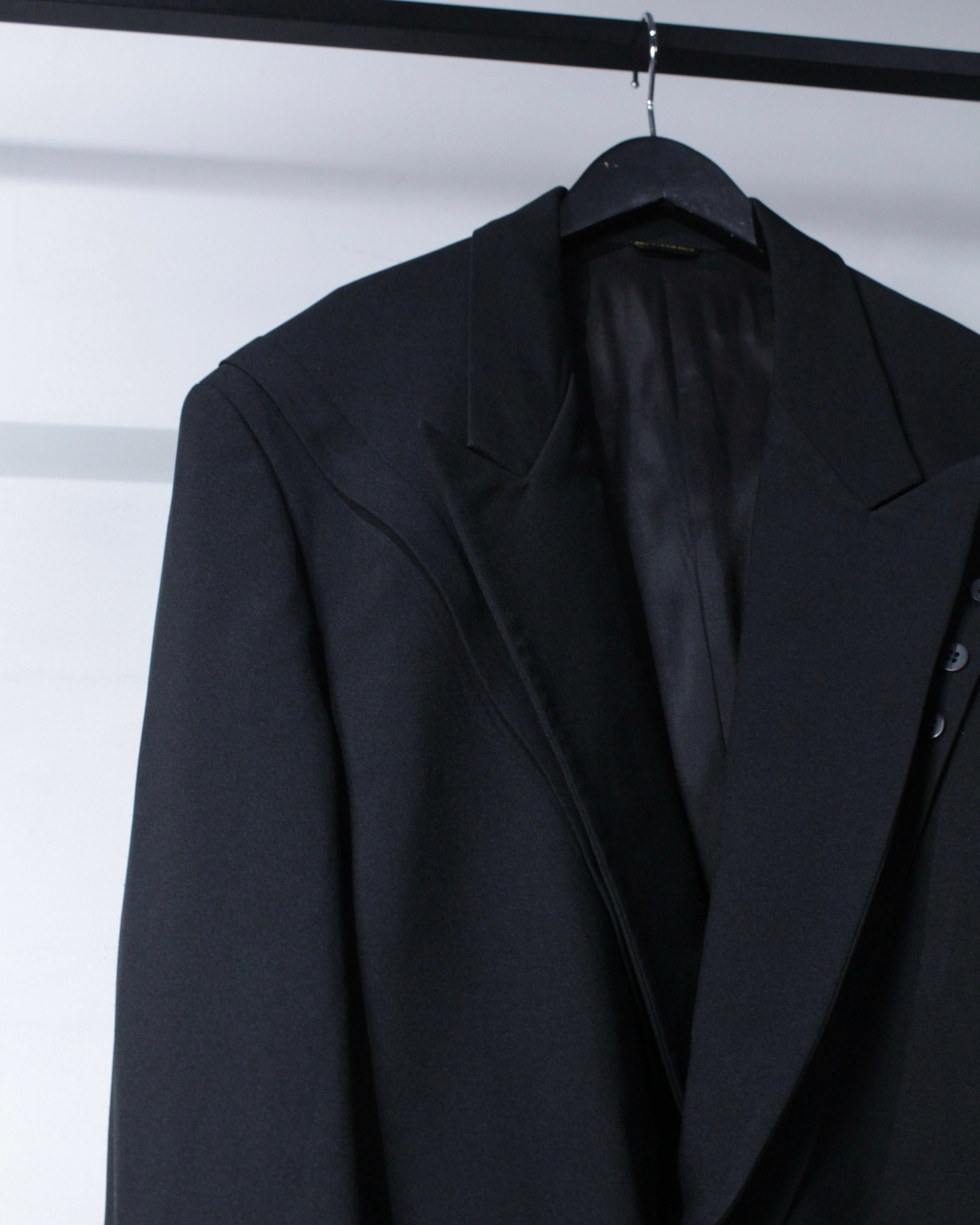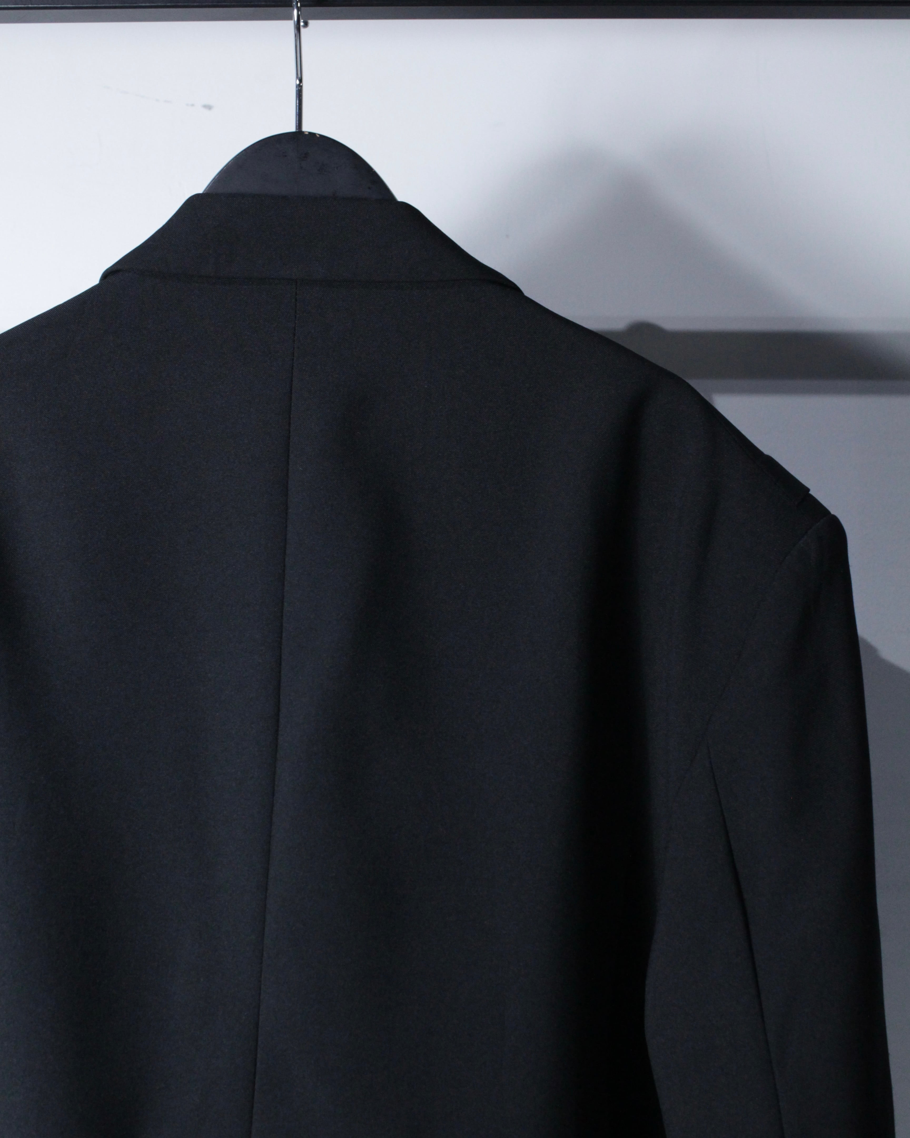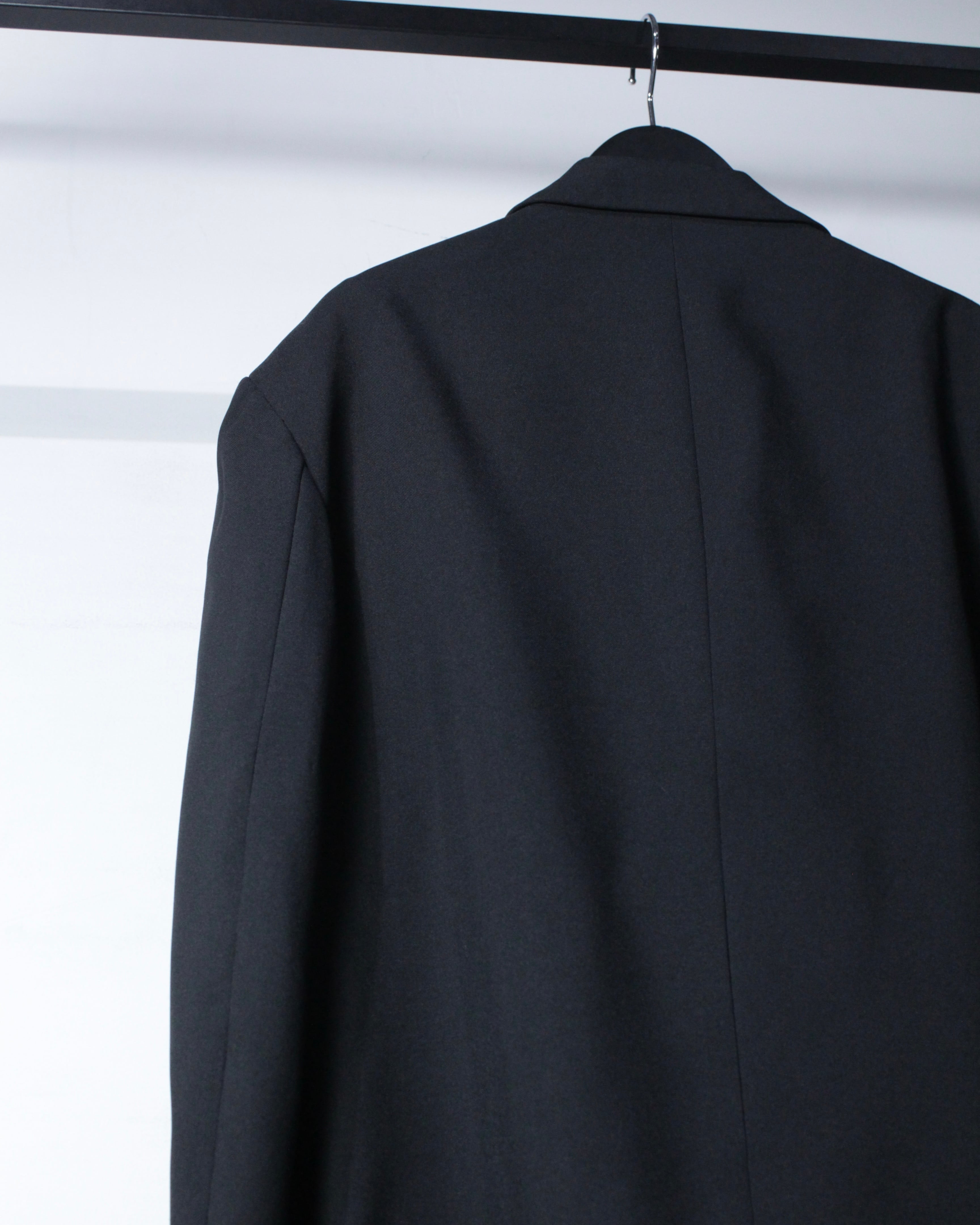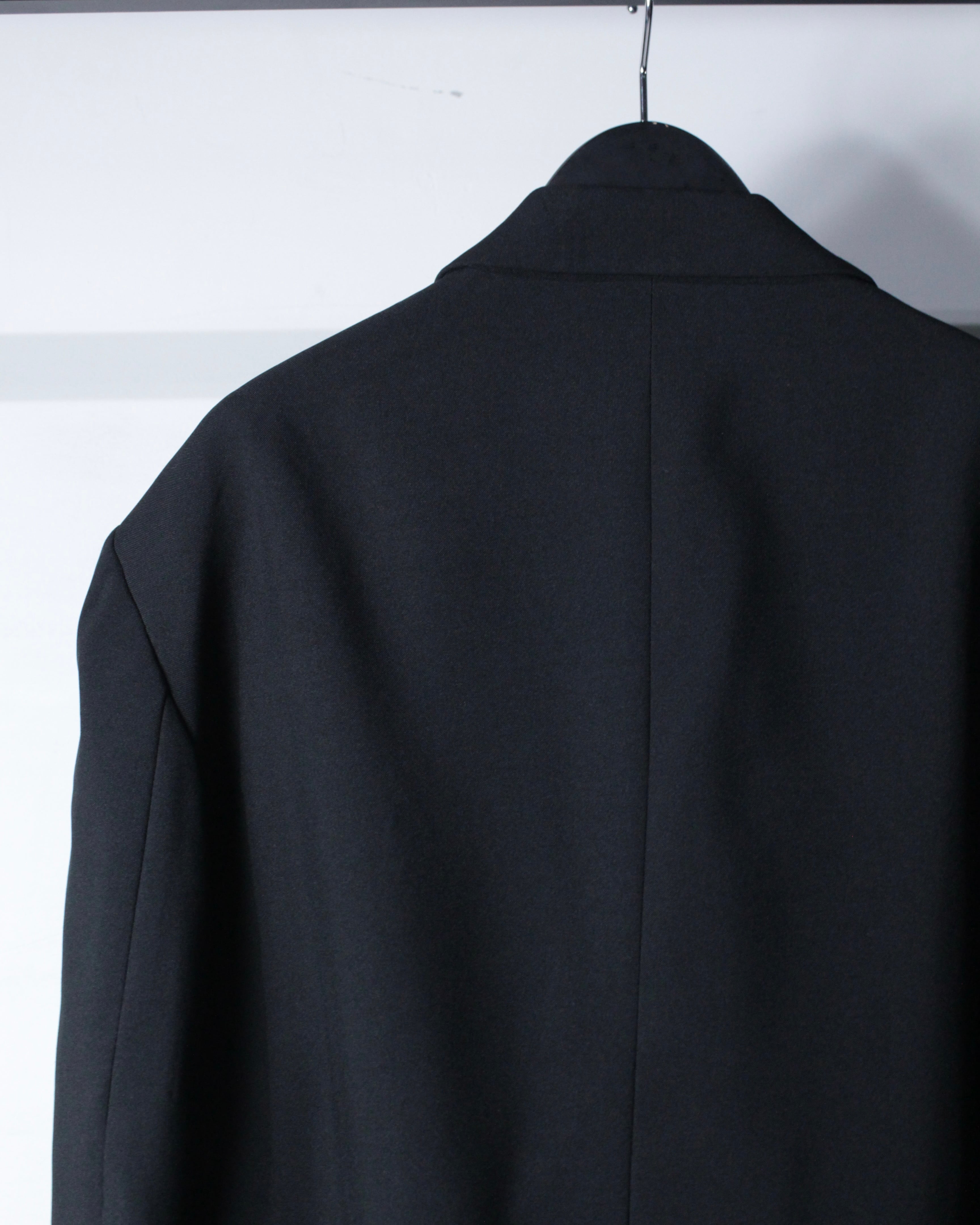 さらにラペル付近にさりげなく施された切り替えディテールが、この1着の最大の個性。シンプルなブラックの中にアクセントを加え、デザインとしての完成度を一段引き上げています。