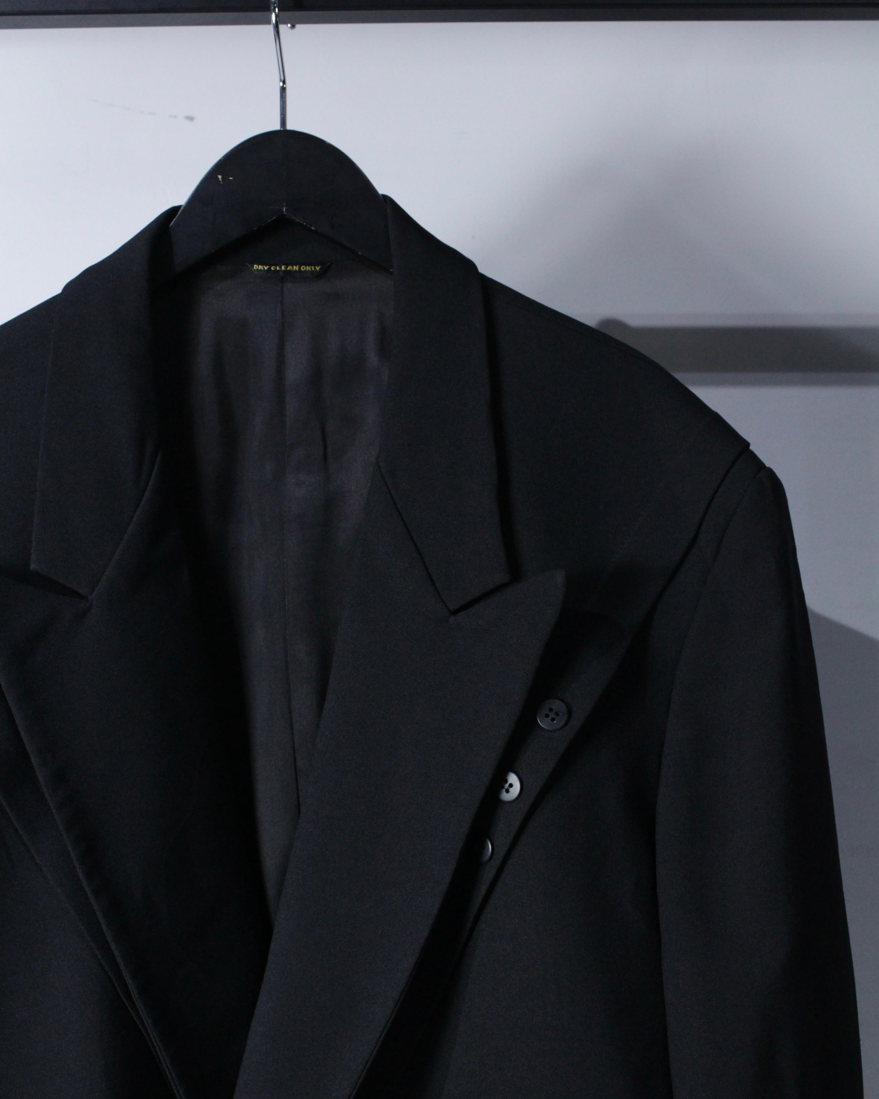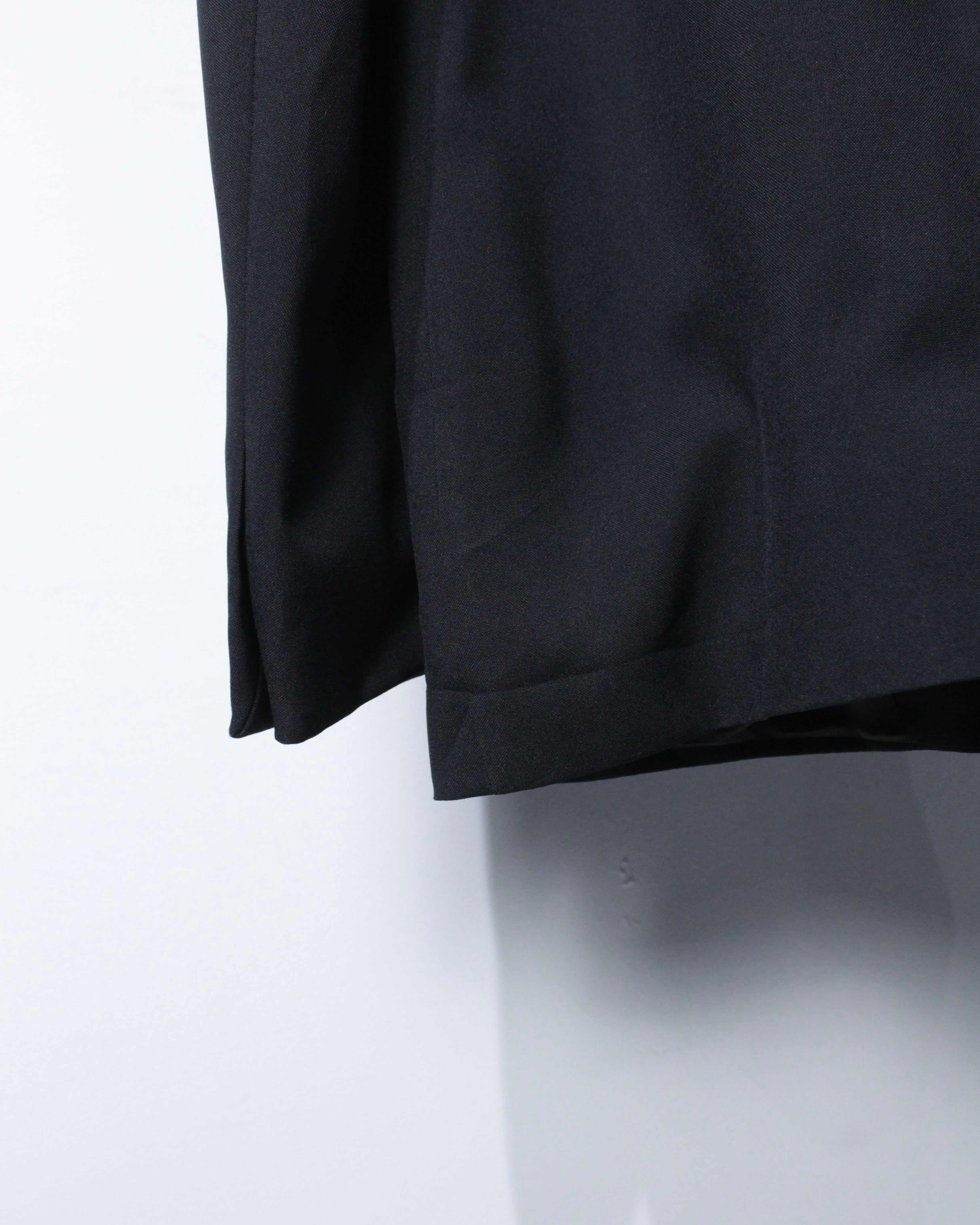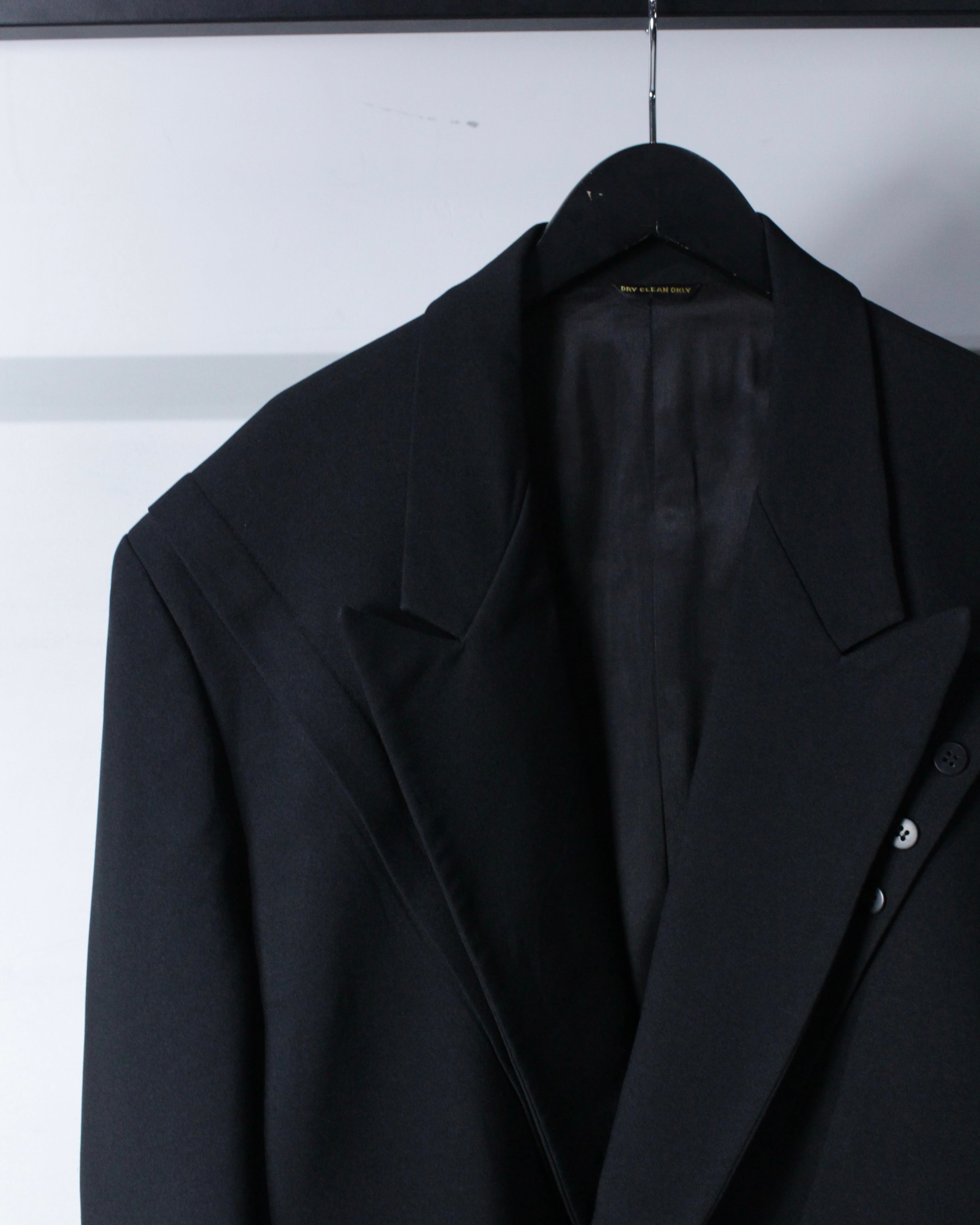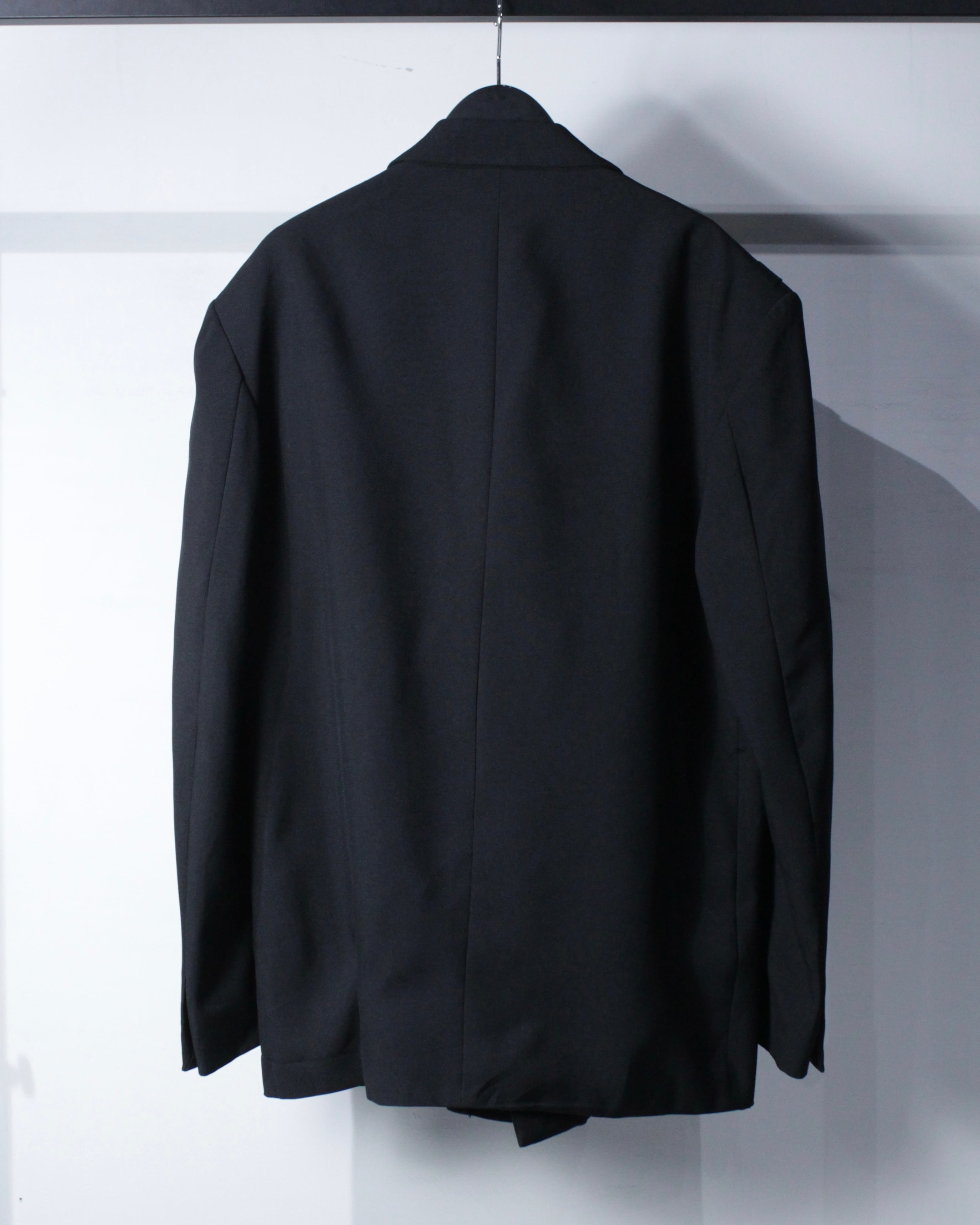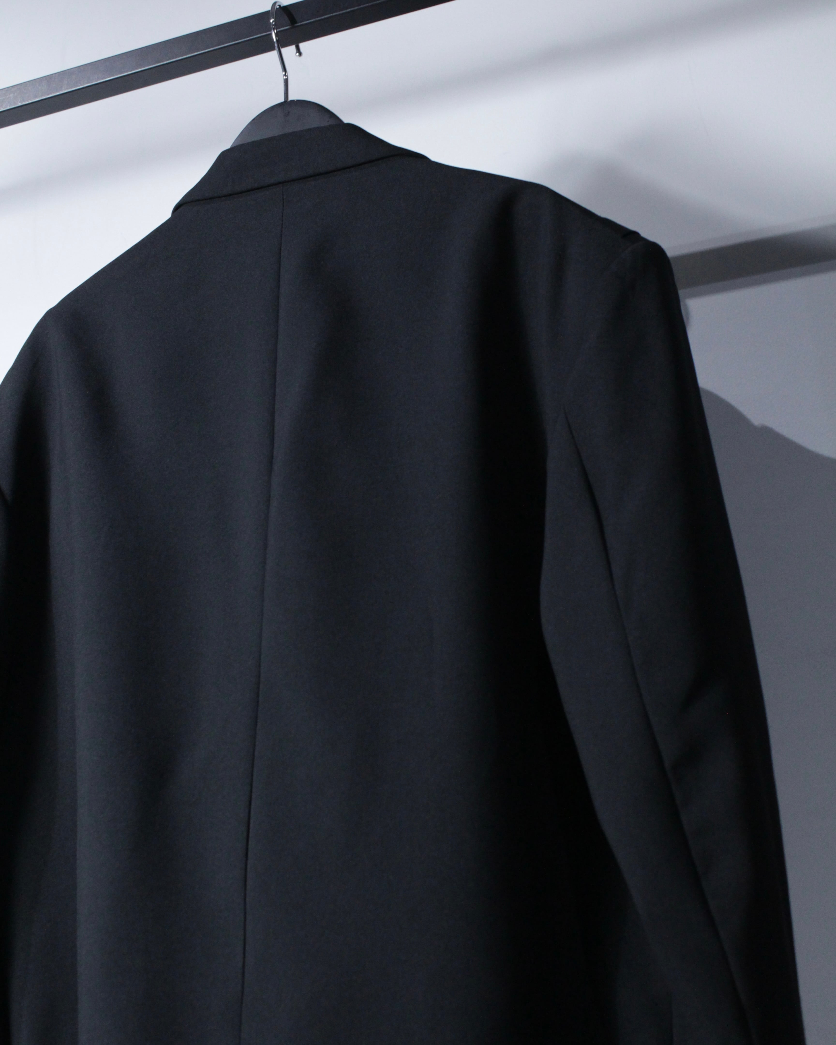 さらにラペル付近にさりげなく施された切り替えディテールが、この1着の最大の個性。シンプルなブラックの中にアクセントを加え、デザインとしての完成度を一段引き上げています。