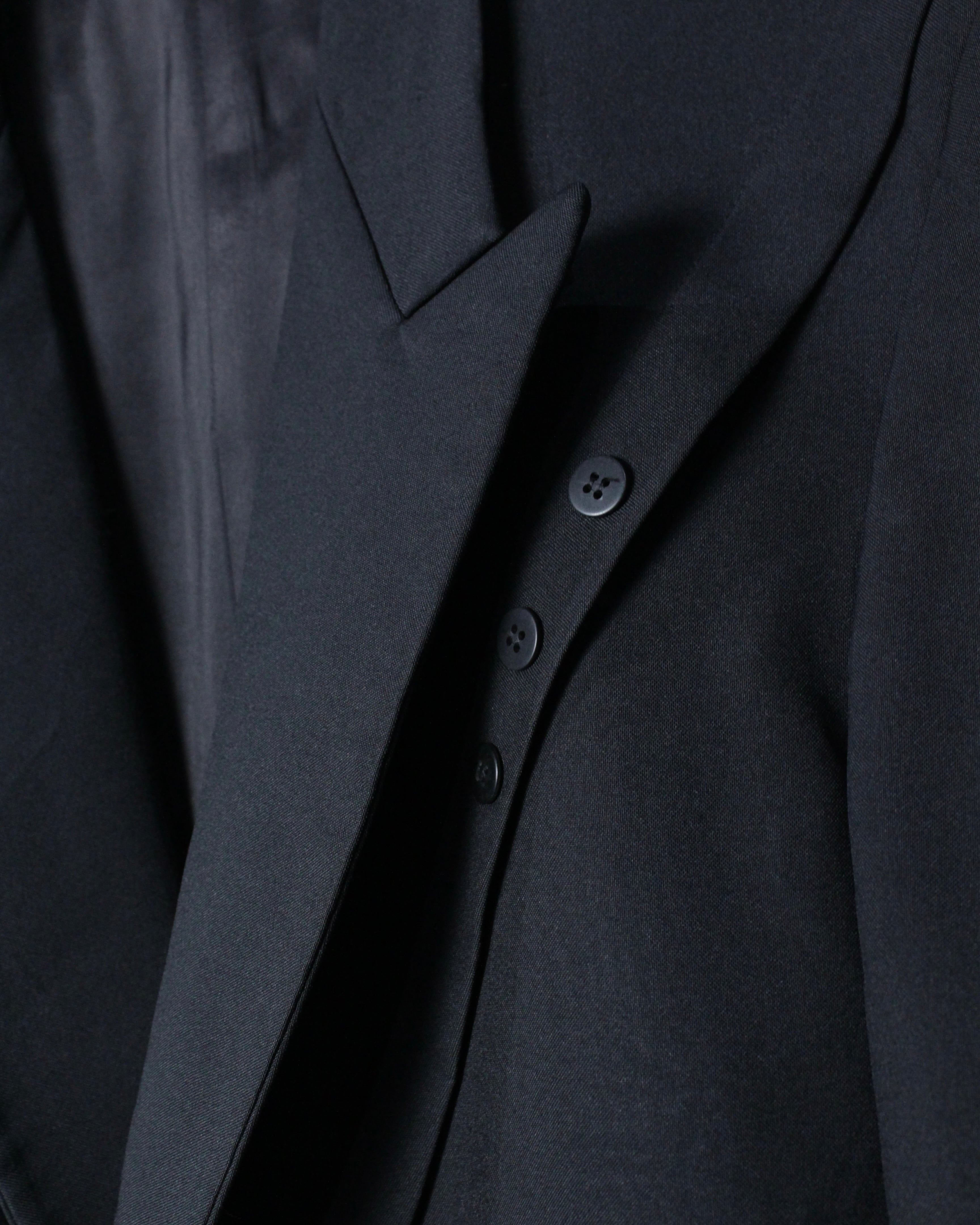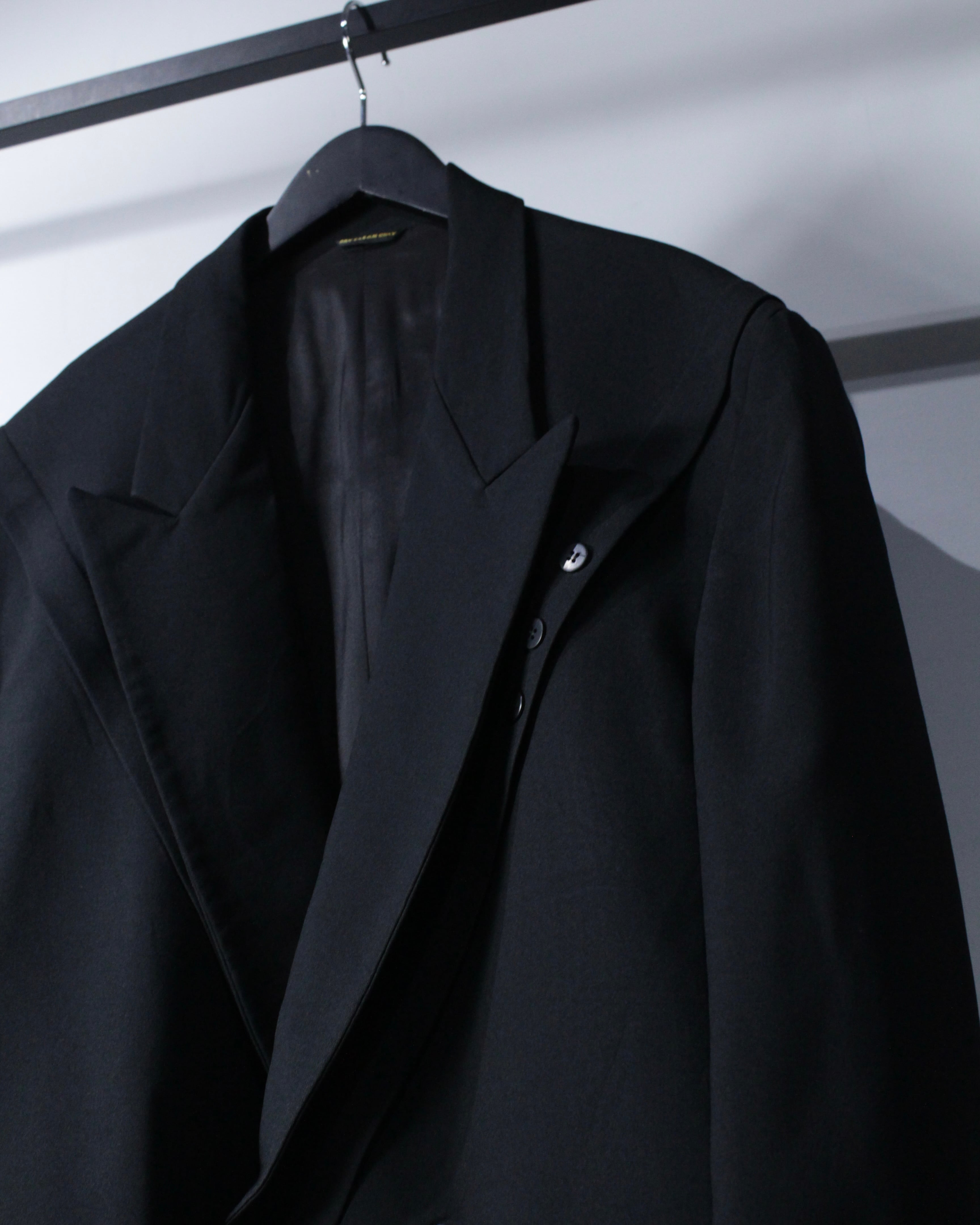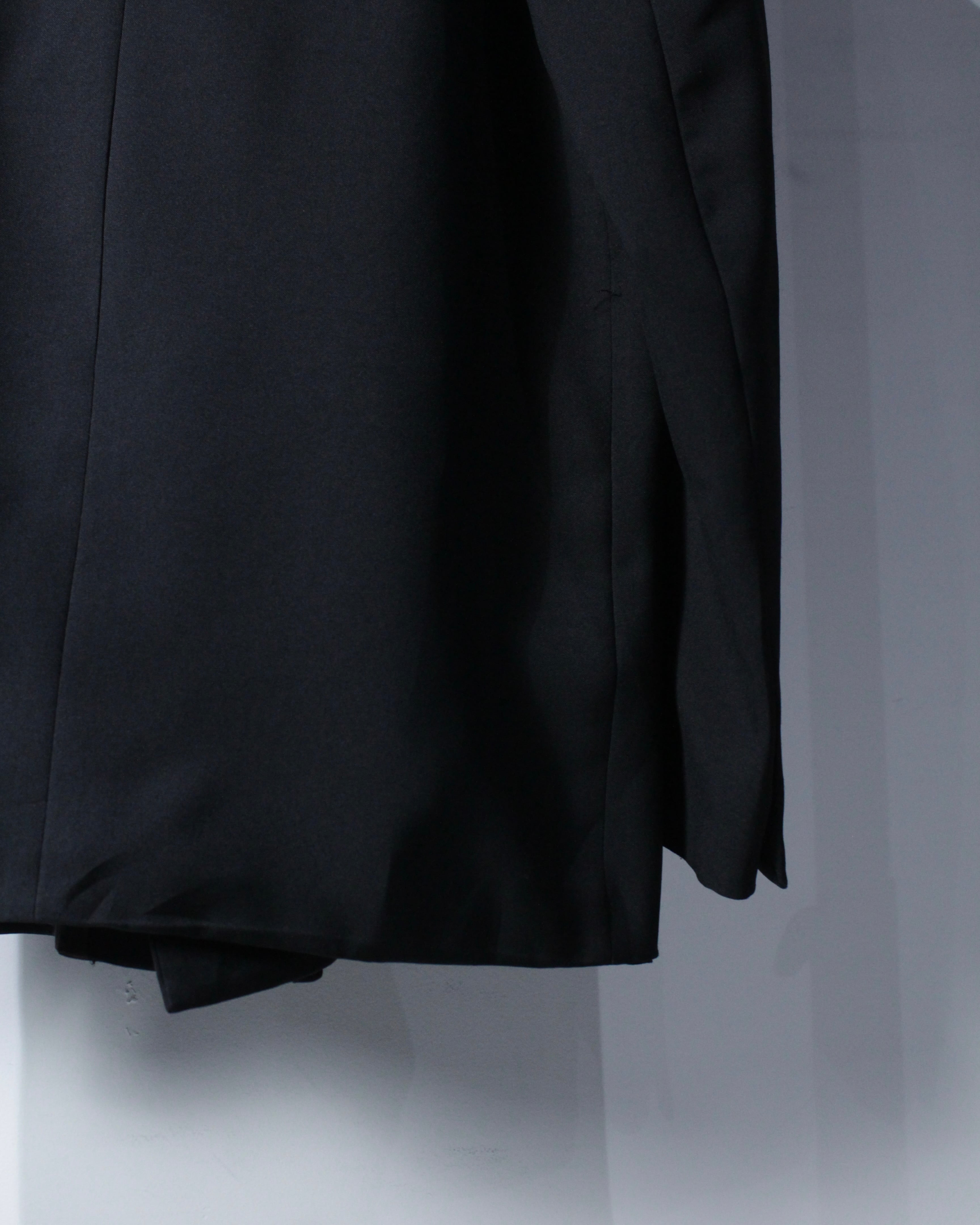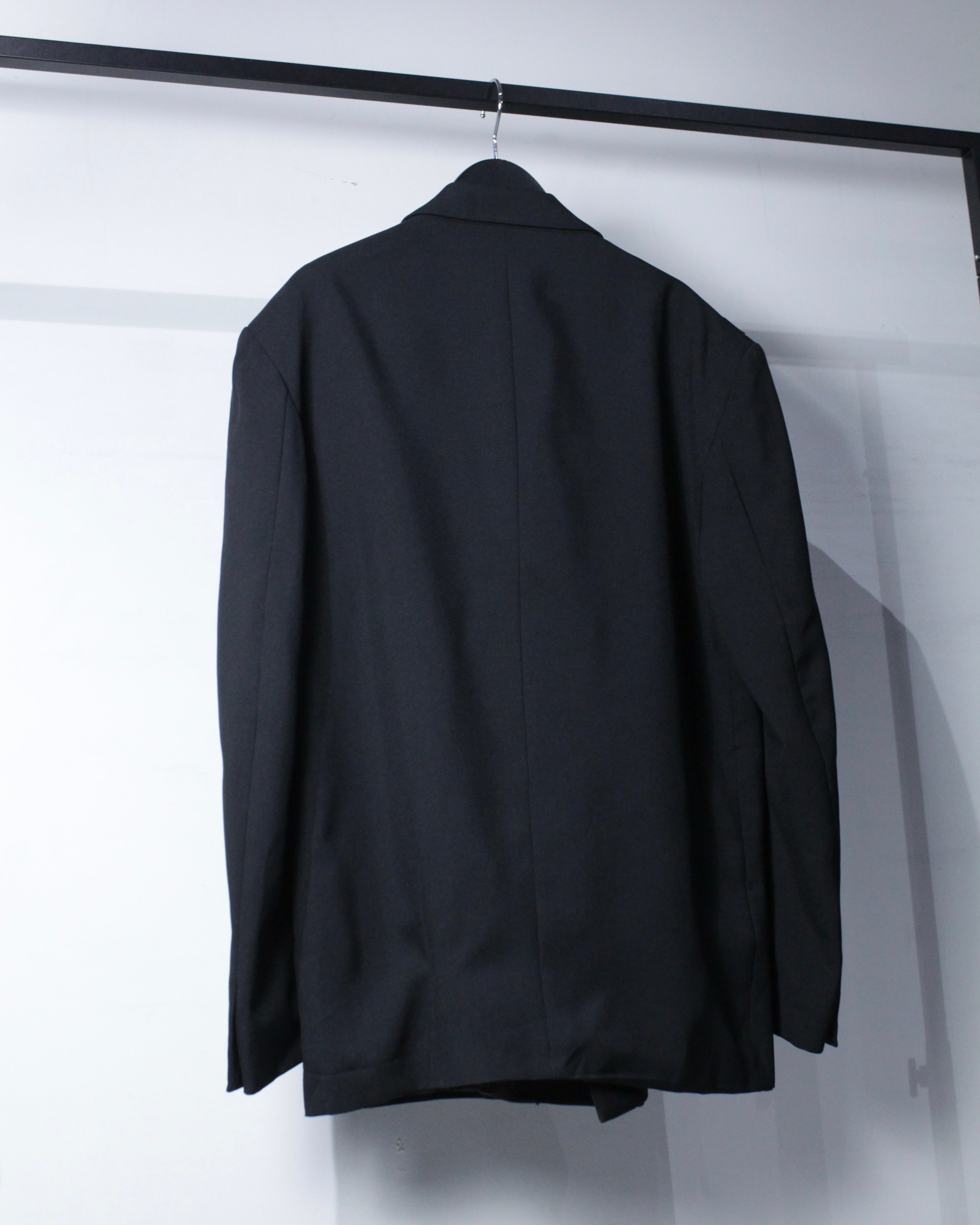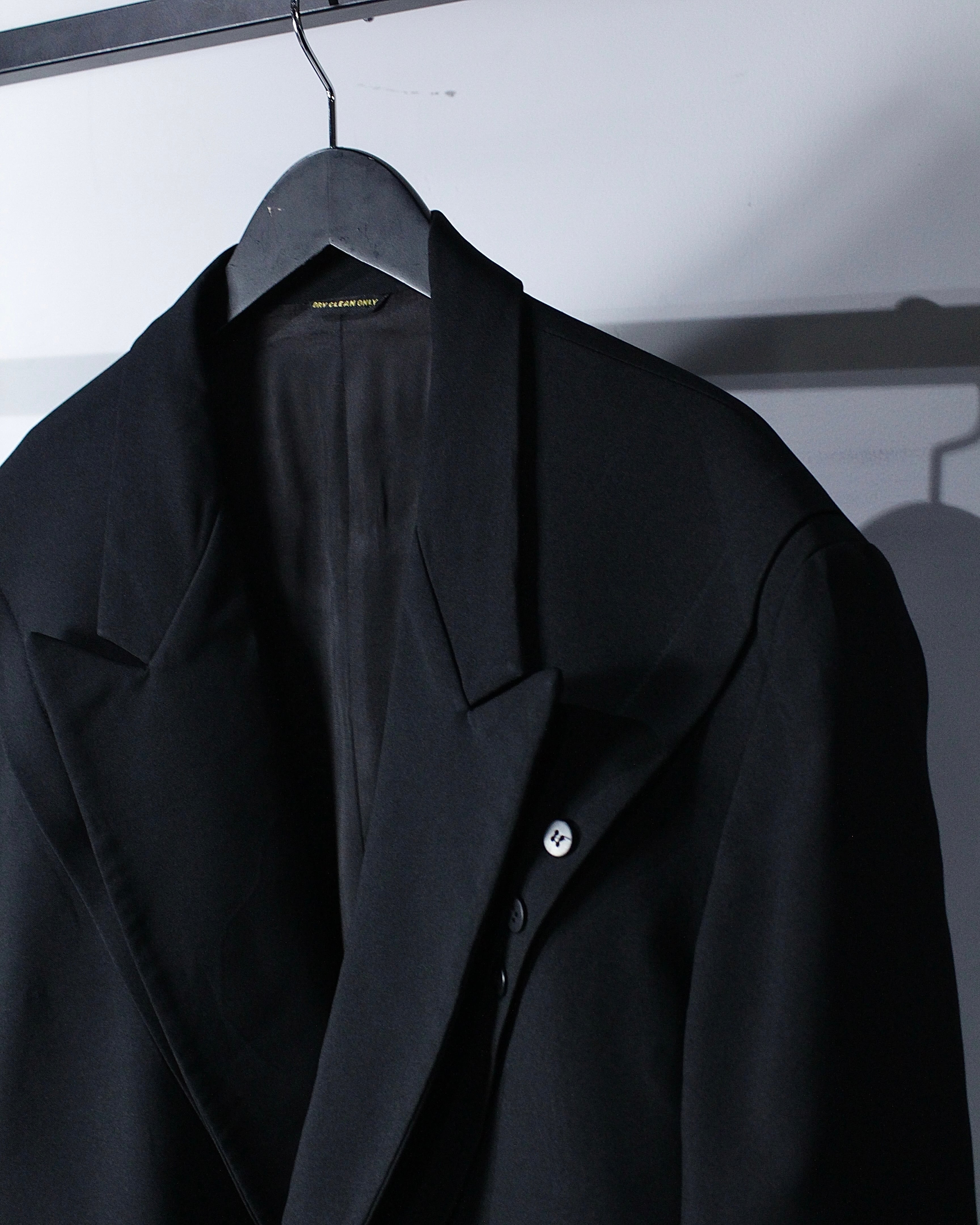 さらにラペル付近にさりげなく施された切り替えディテールが、この1着の最大の個性。シンプルなブラックの中にアクセントを加え、デザインとしての完成度を一段引き上げています。