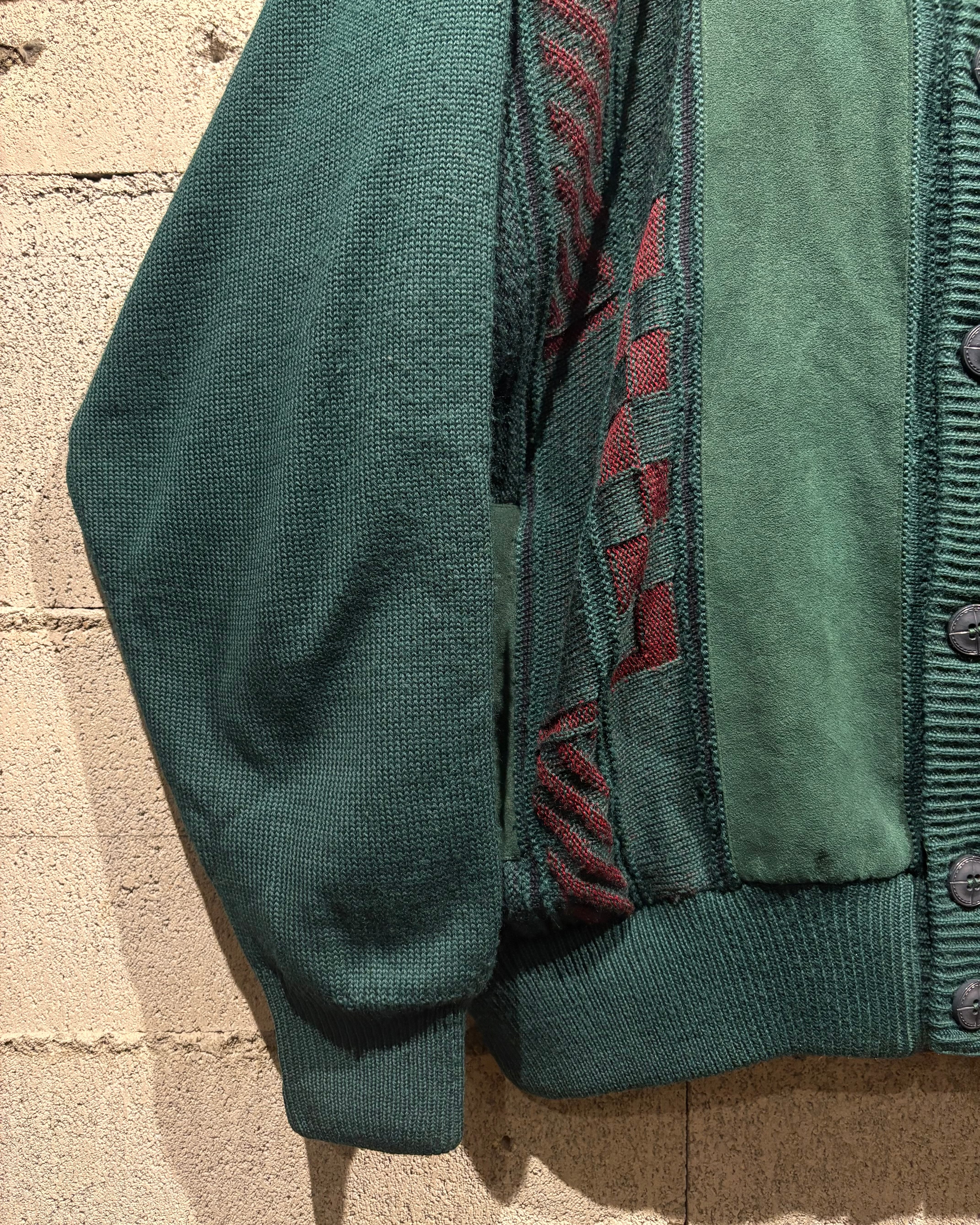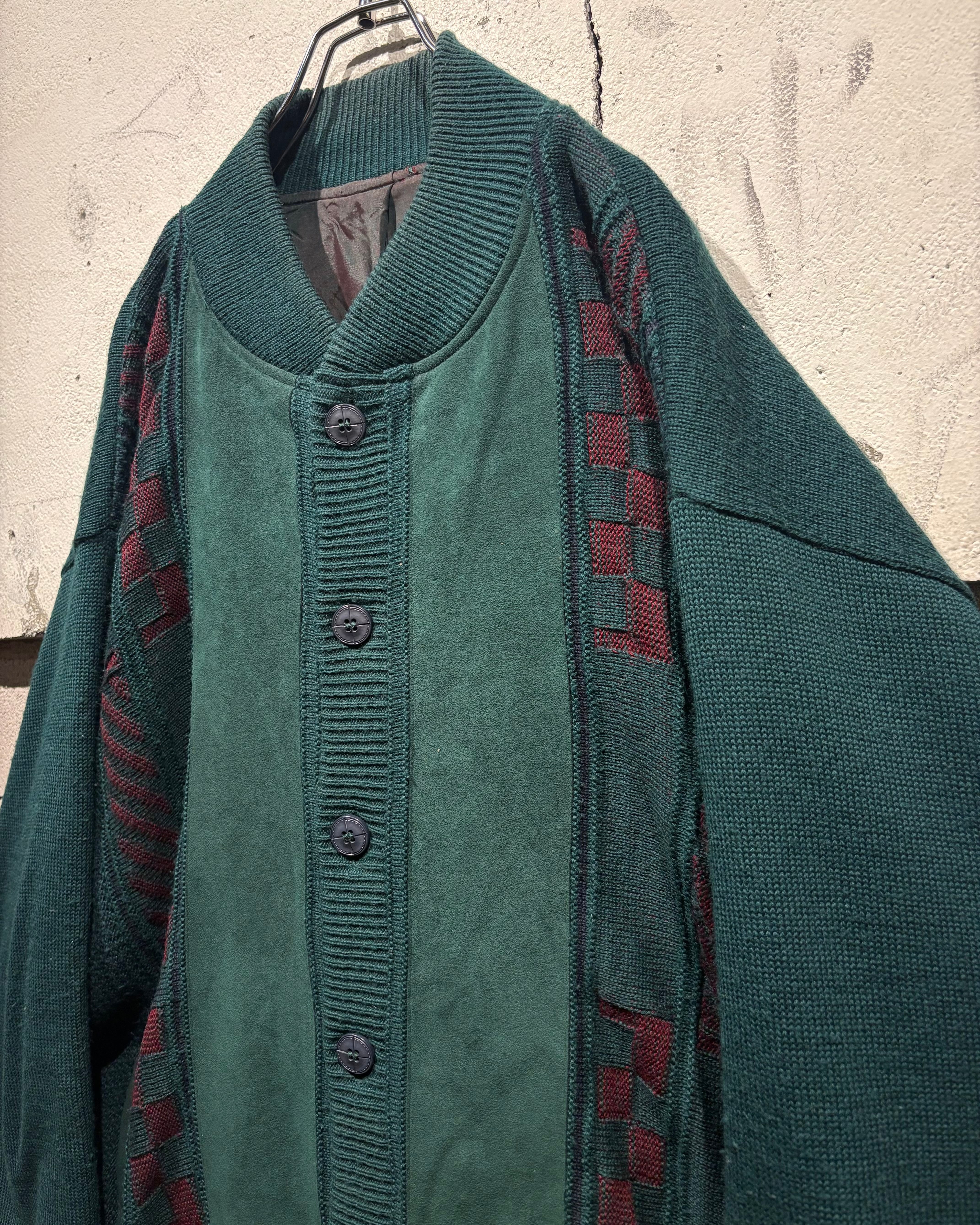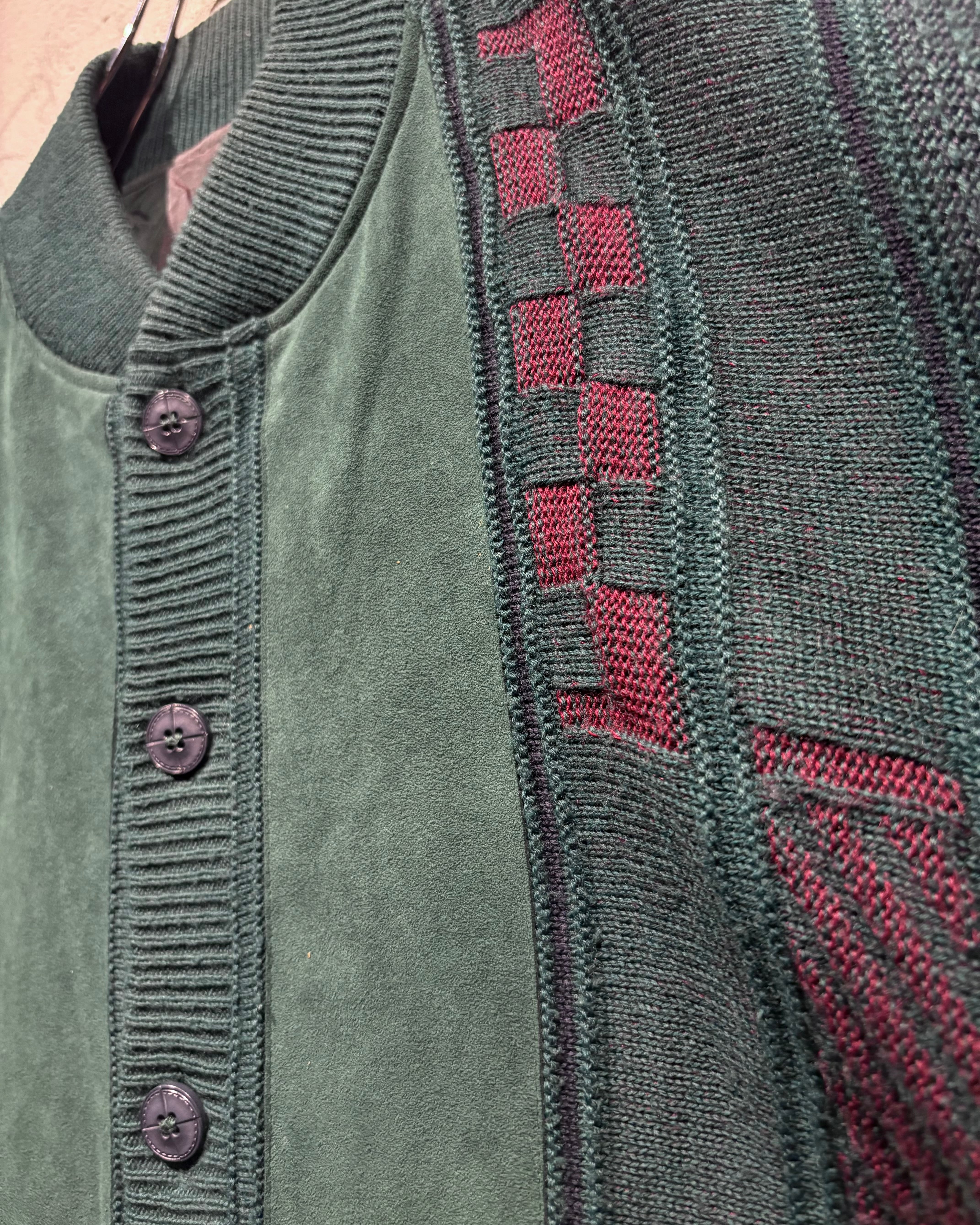 深みのあるグリーンカラーが印象的な、異素材を切り替えたニットジャケットをご紹介いたします。