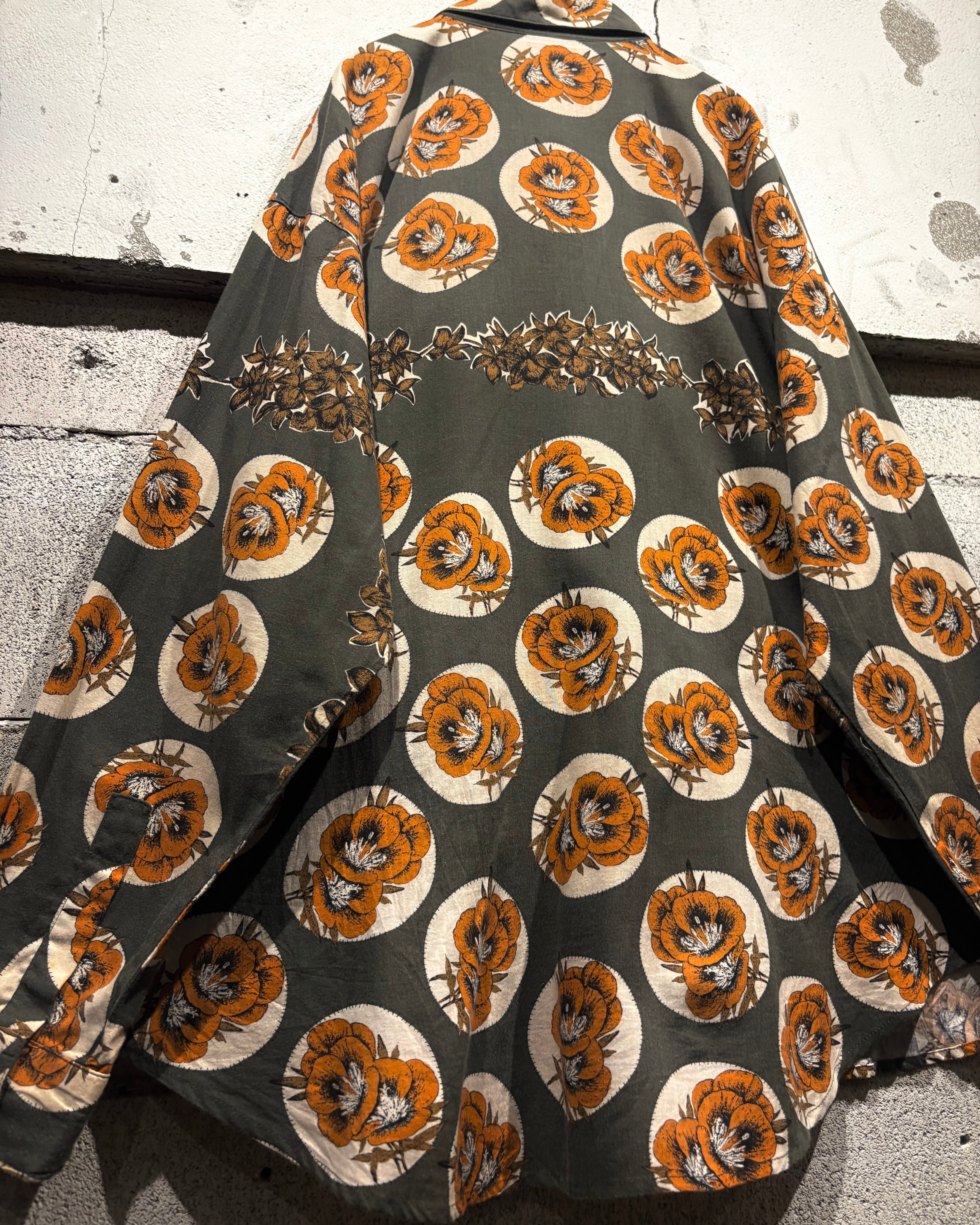 落ち着いたグレーのボディをベースに、円形に収められたオレンジの花柄を総柄で配置。さらに前立てと胸元にはボタニカルモチーフを縦に切り替え、リズム感のあるデザインに仕上げられています。