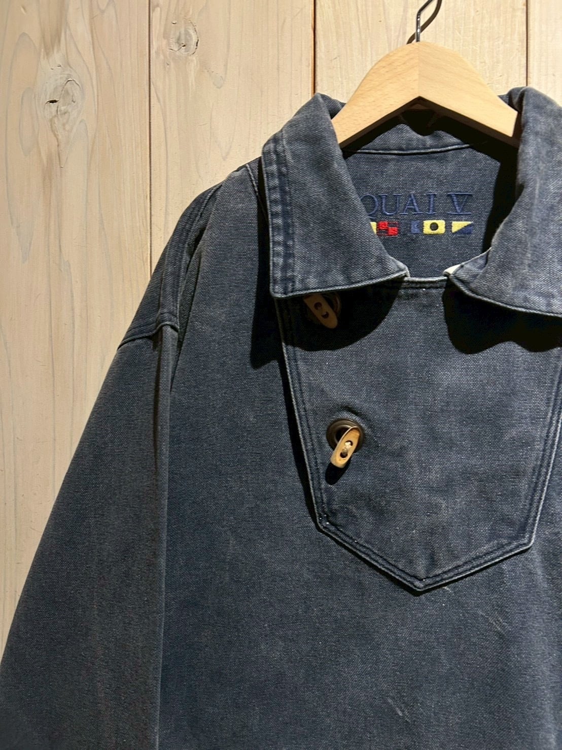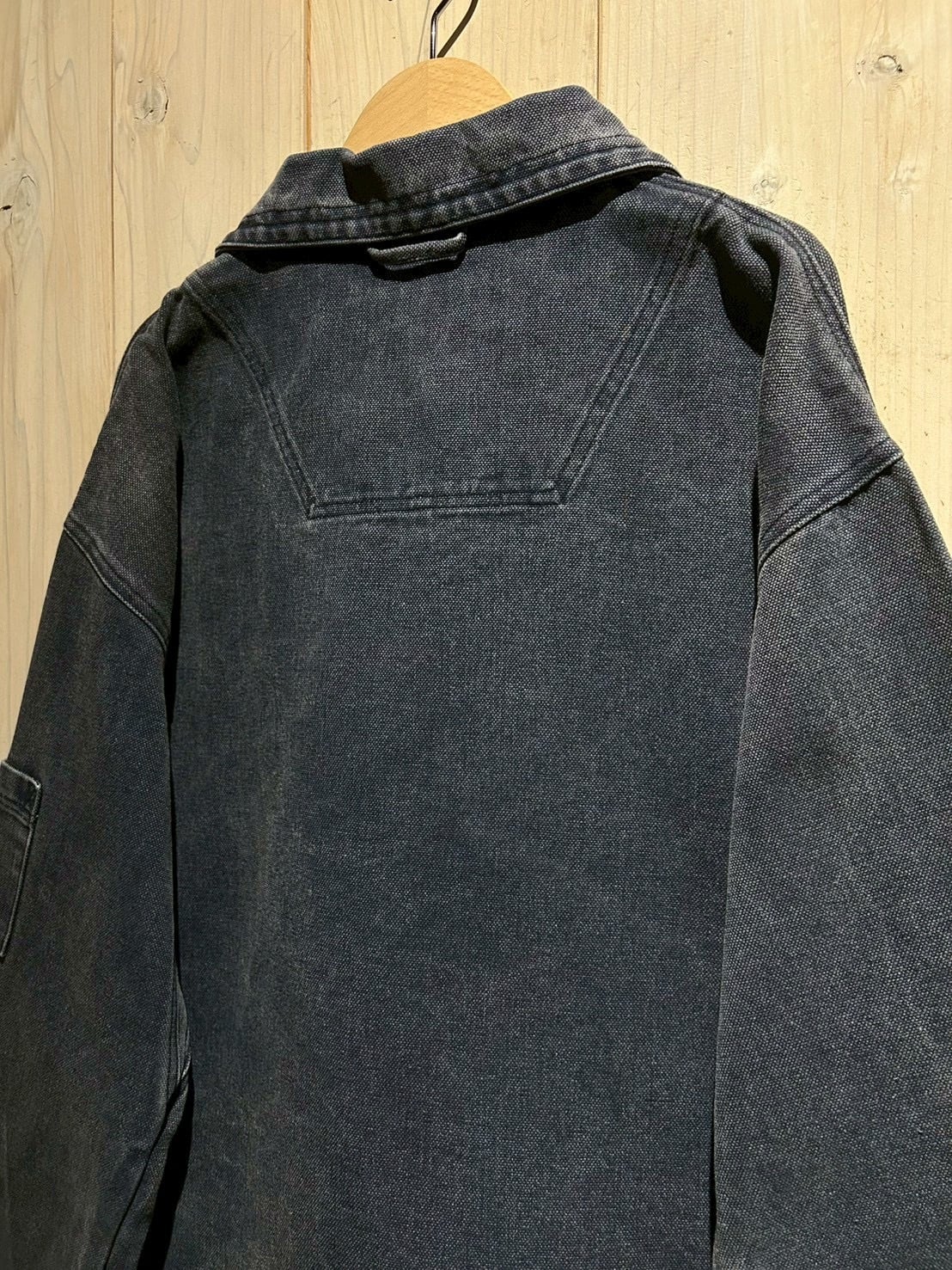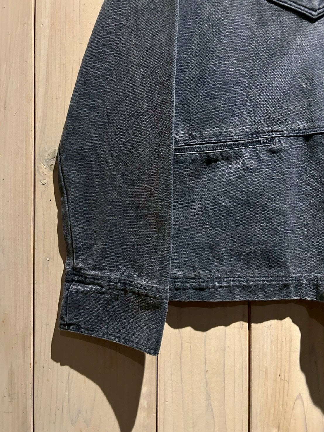 しっかりと打ち込まれた100%コットンのダックファブリックを採用し、肉厚でタフ、着込むほどにフェードしていく風合いが魅力。スモーキーなネイビーの色味が経年変化によるアタリと相まって、既に抜群の雰囲気を醸し出しています。