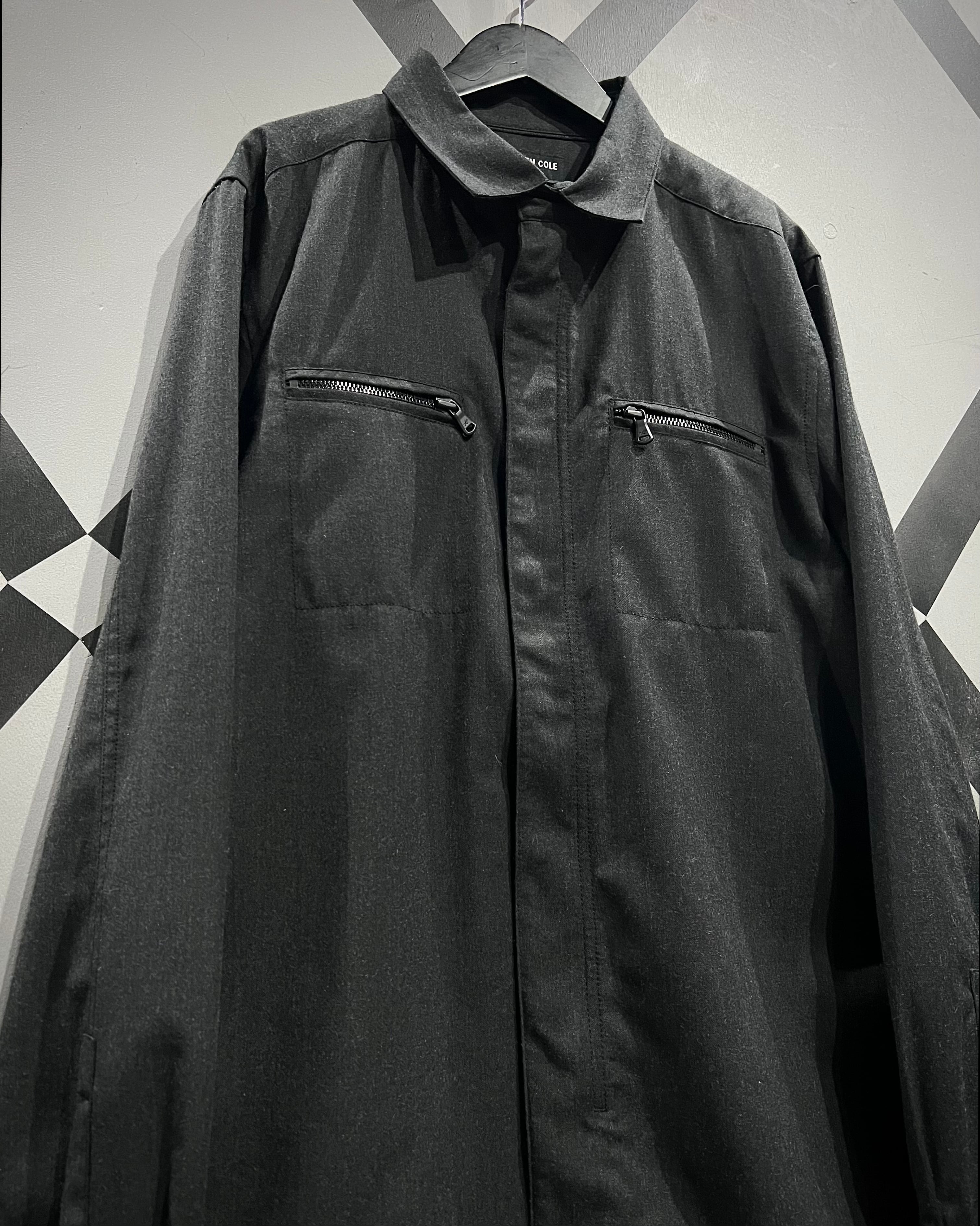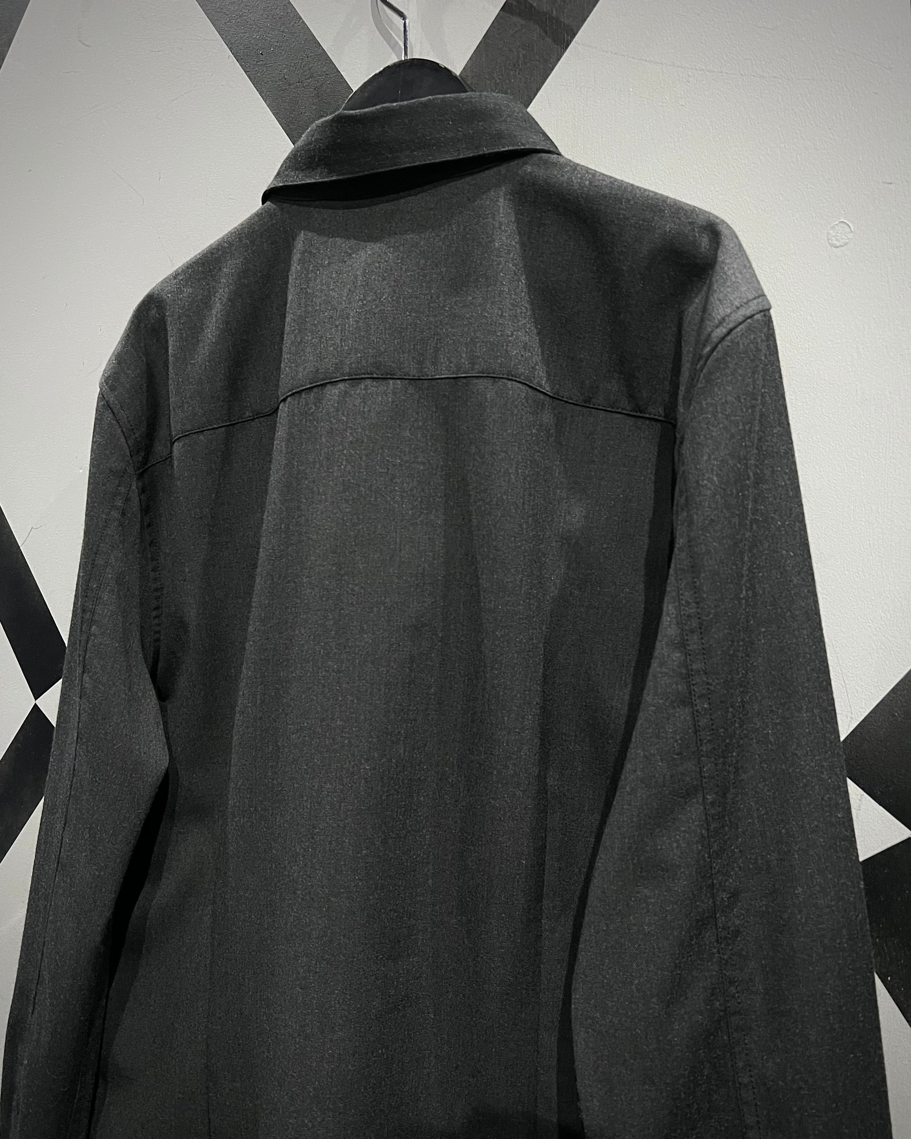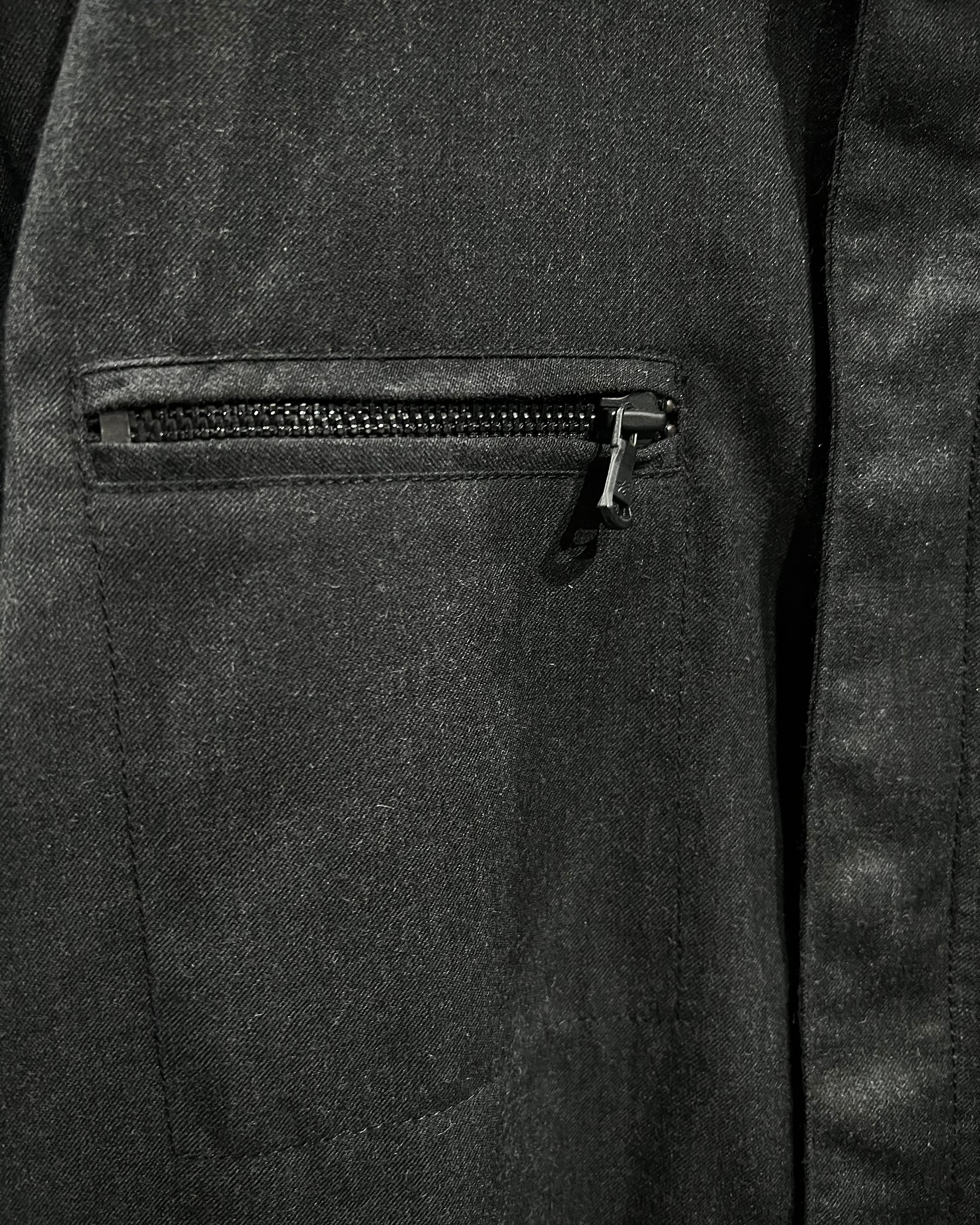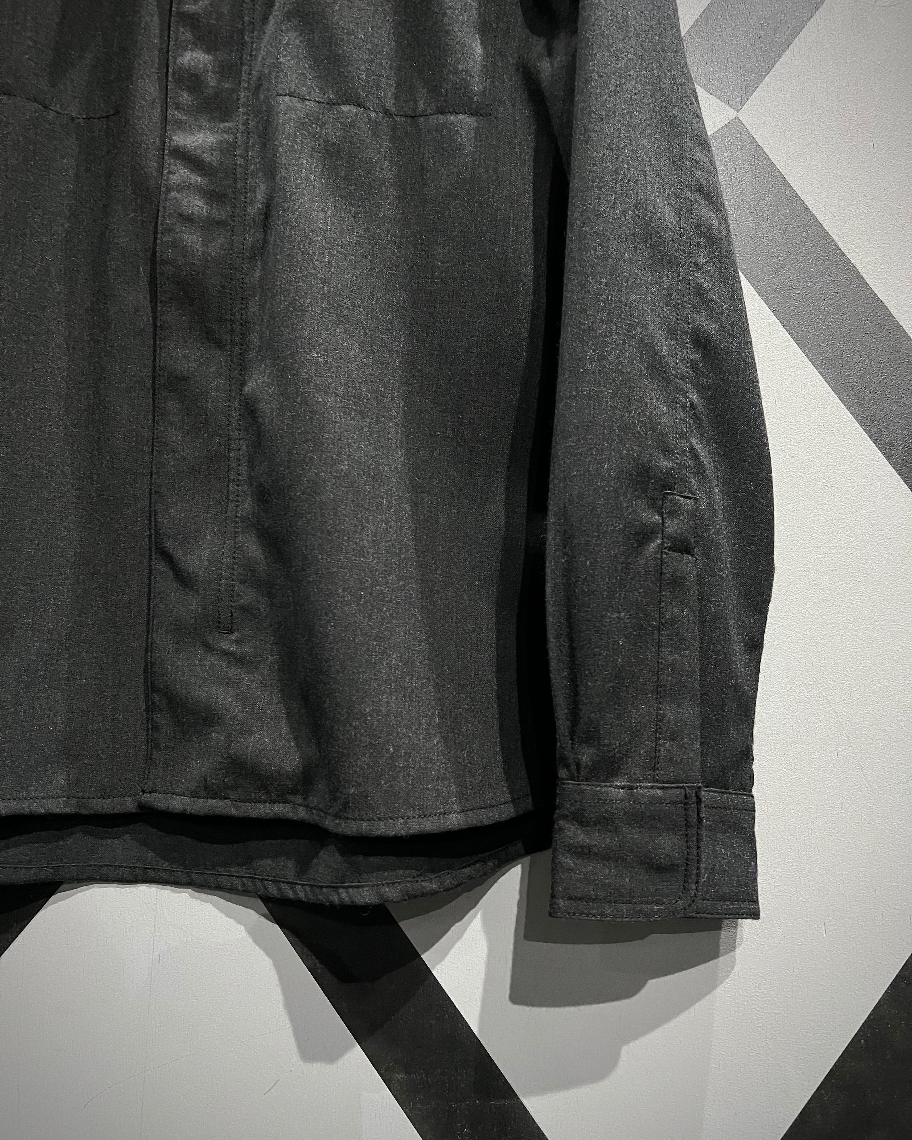 フロントは比翼仕立て、胸元には横向きに配されたジップポケットを2つ配置し、機能美とデザイン性を両立した1着。ブラックのジップがさりげないアクセントとなり、シンプルな中にエッジを効かせています。
