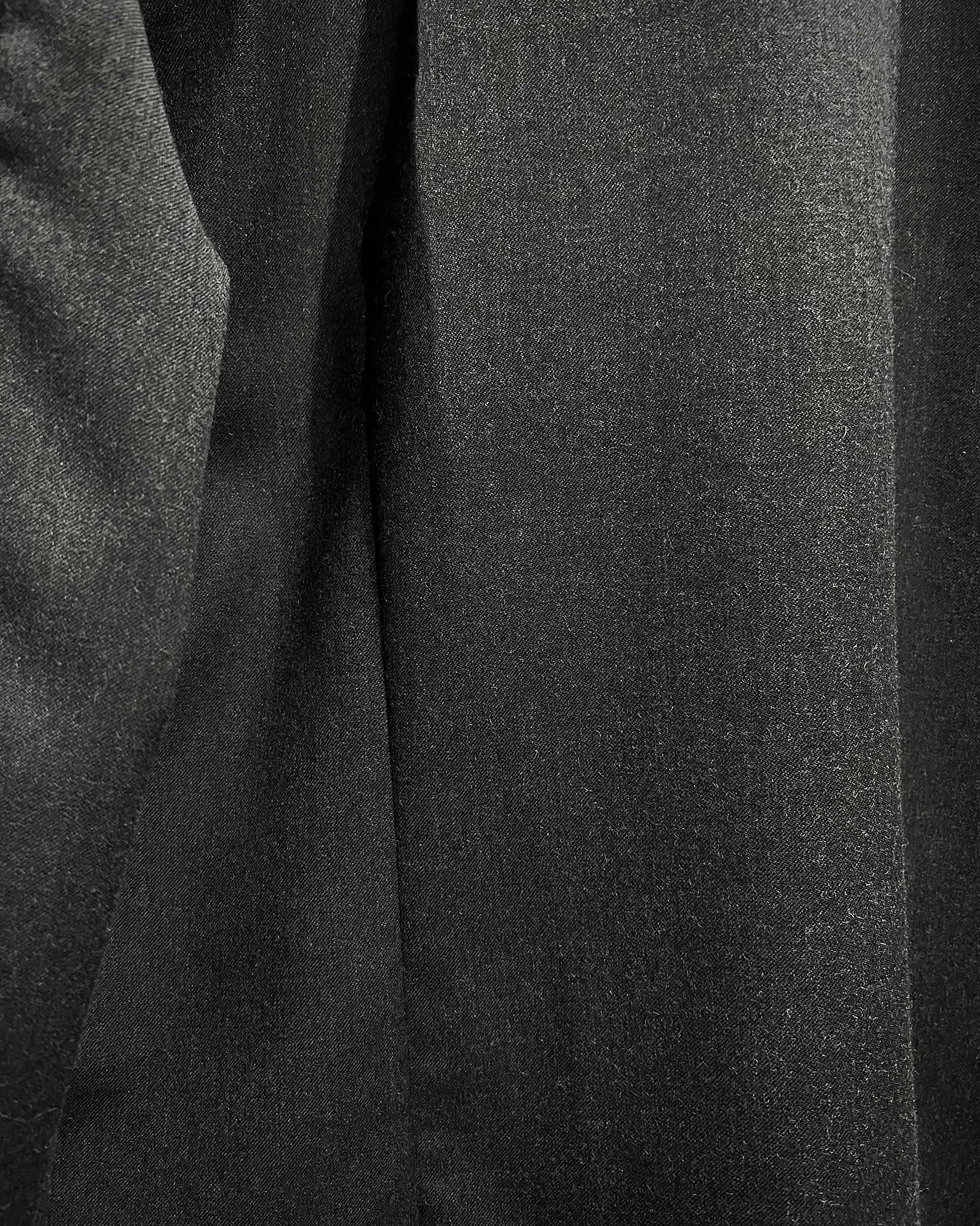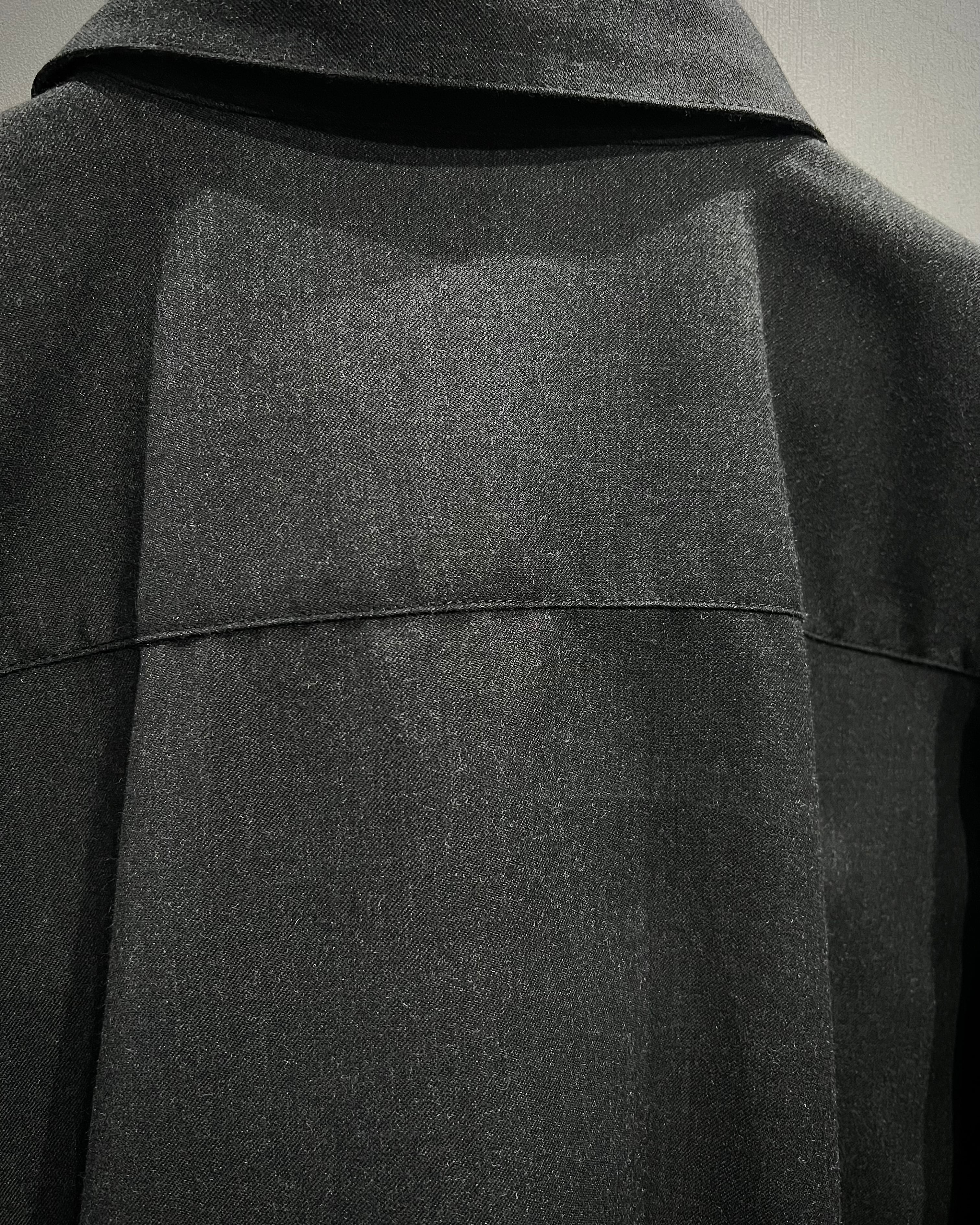 ボディにはウール×ポリエステル混紡の上質なファブリックを採用。マットで落ち着いたチャコールブラックの色味に、ほんのりと起毛感を含んだ柔らかな質感が加わり、シックな雰囲気を漂わせる仕上がりに。