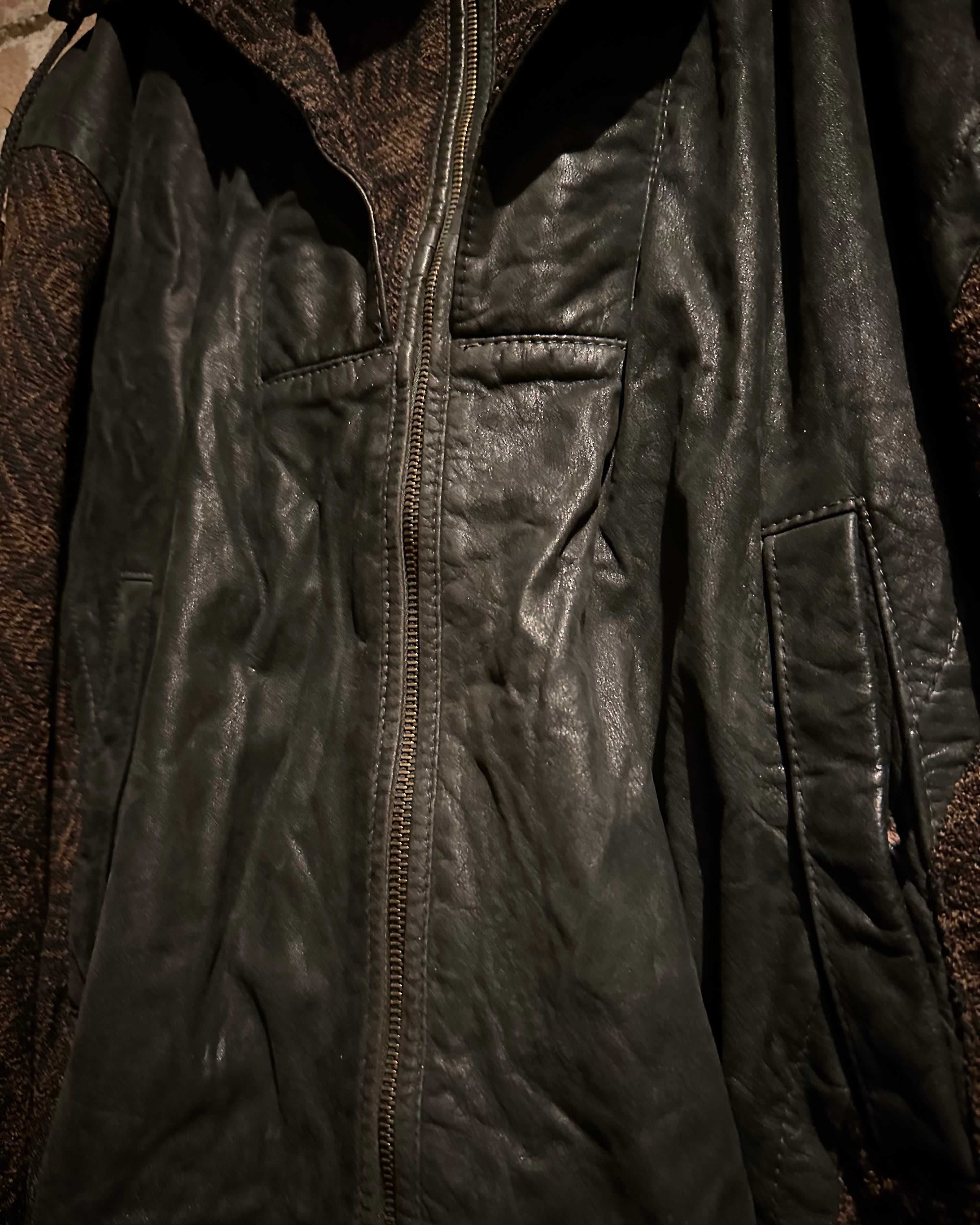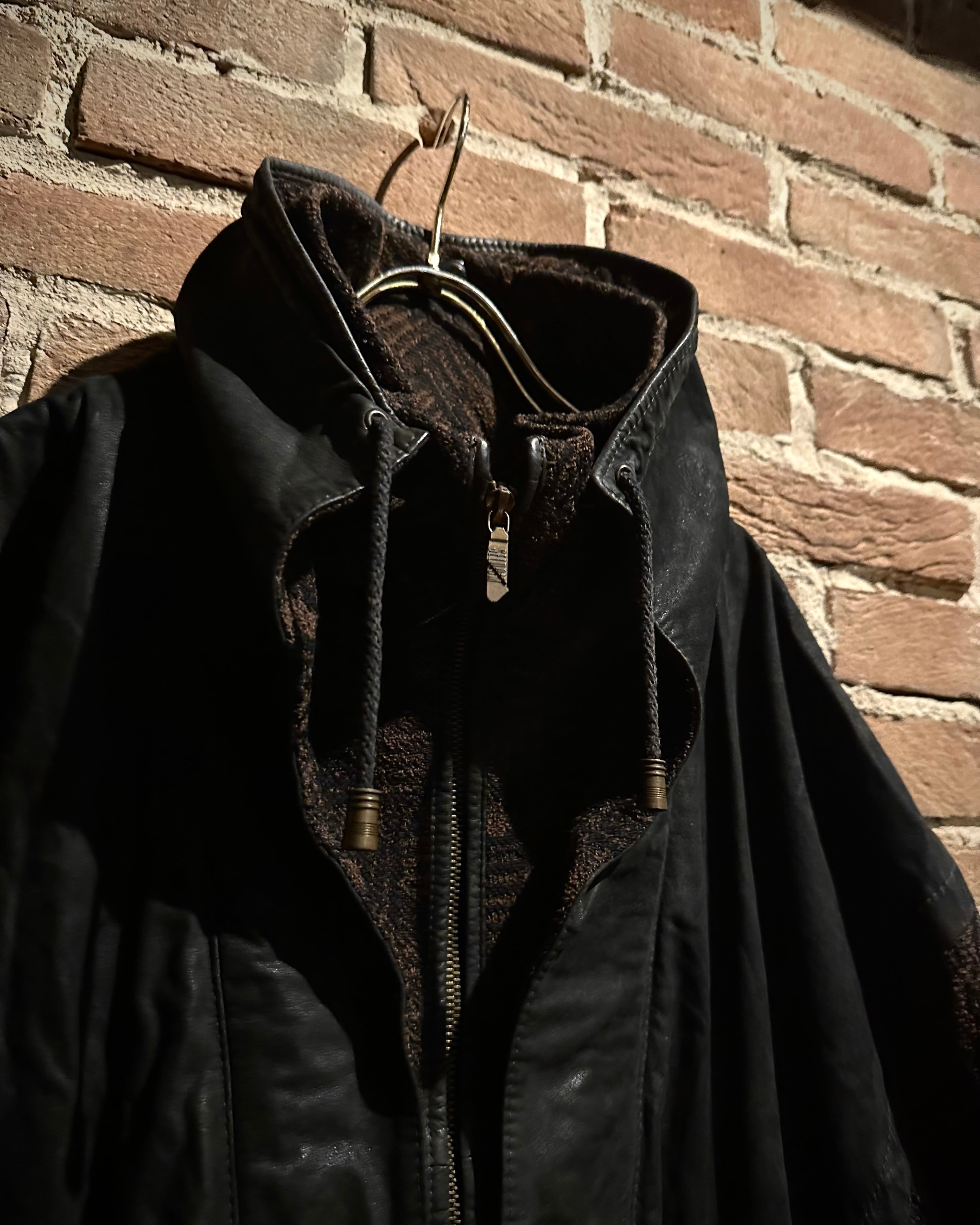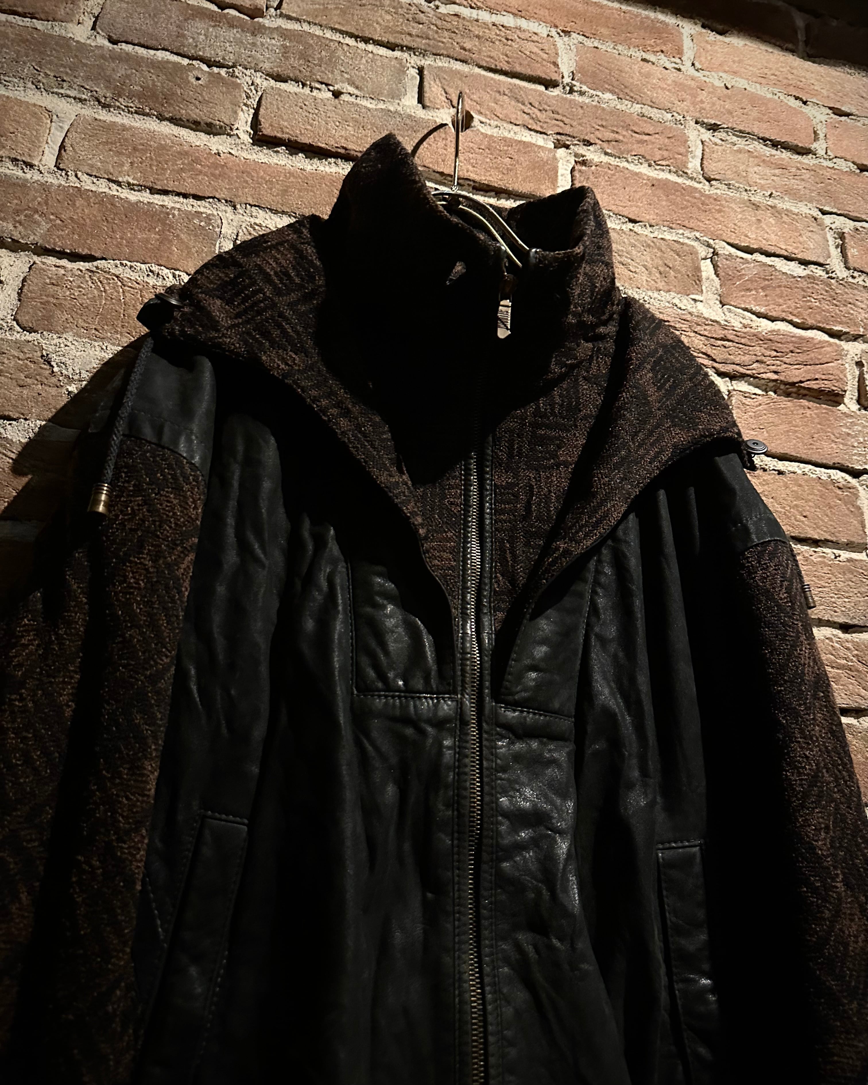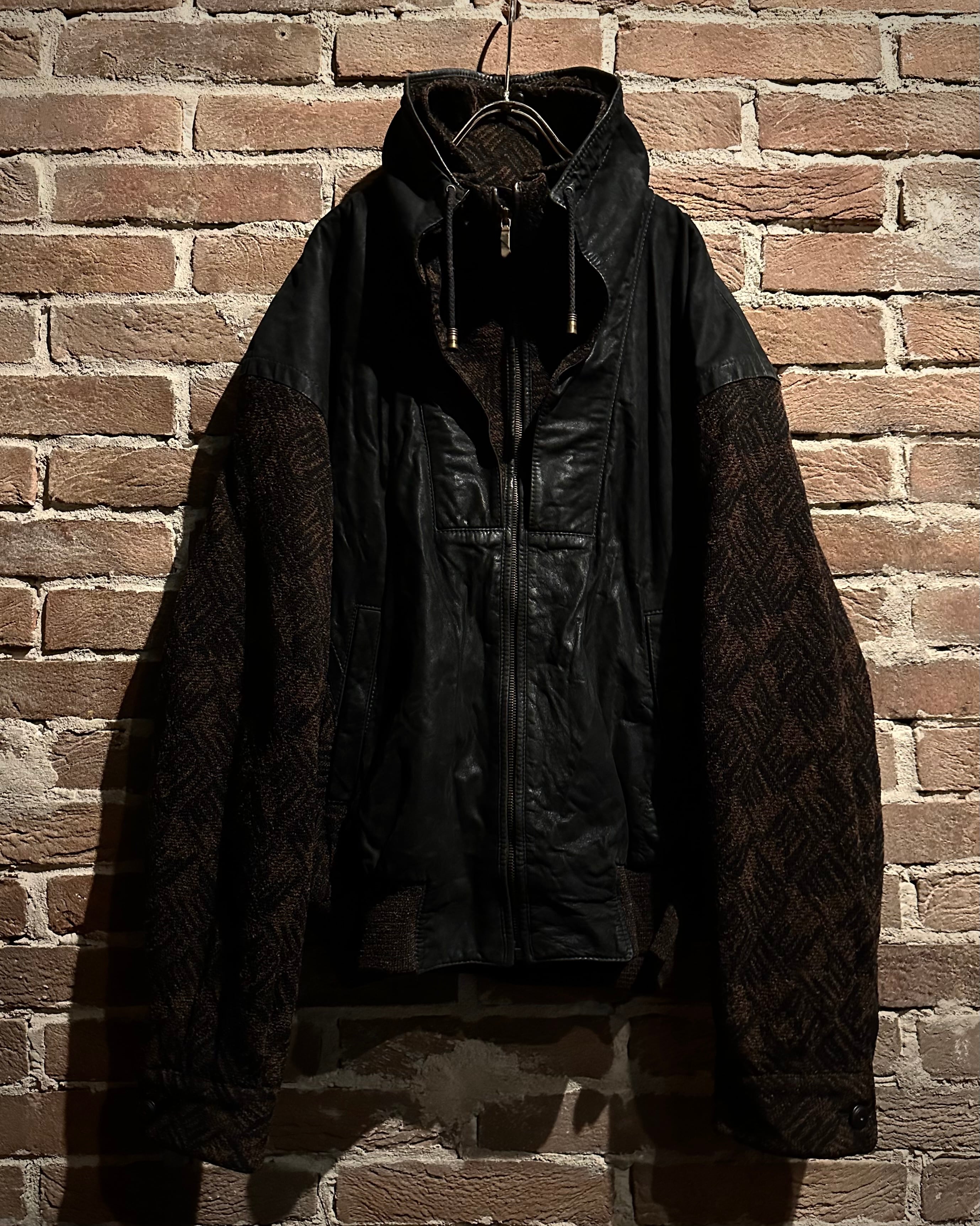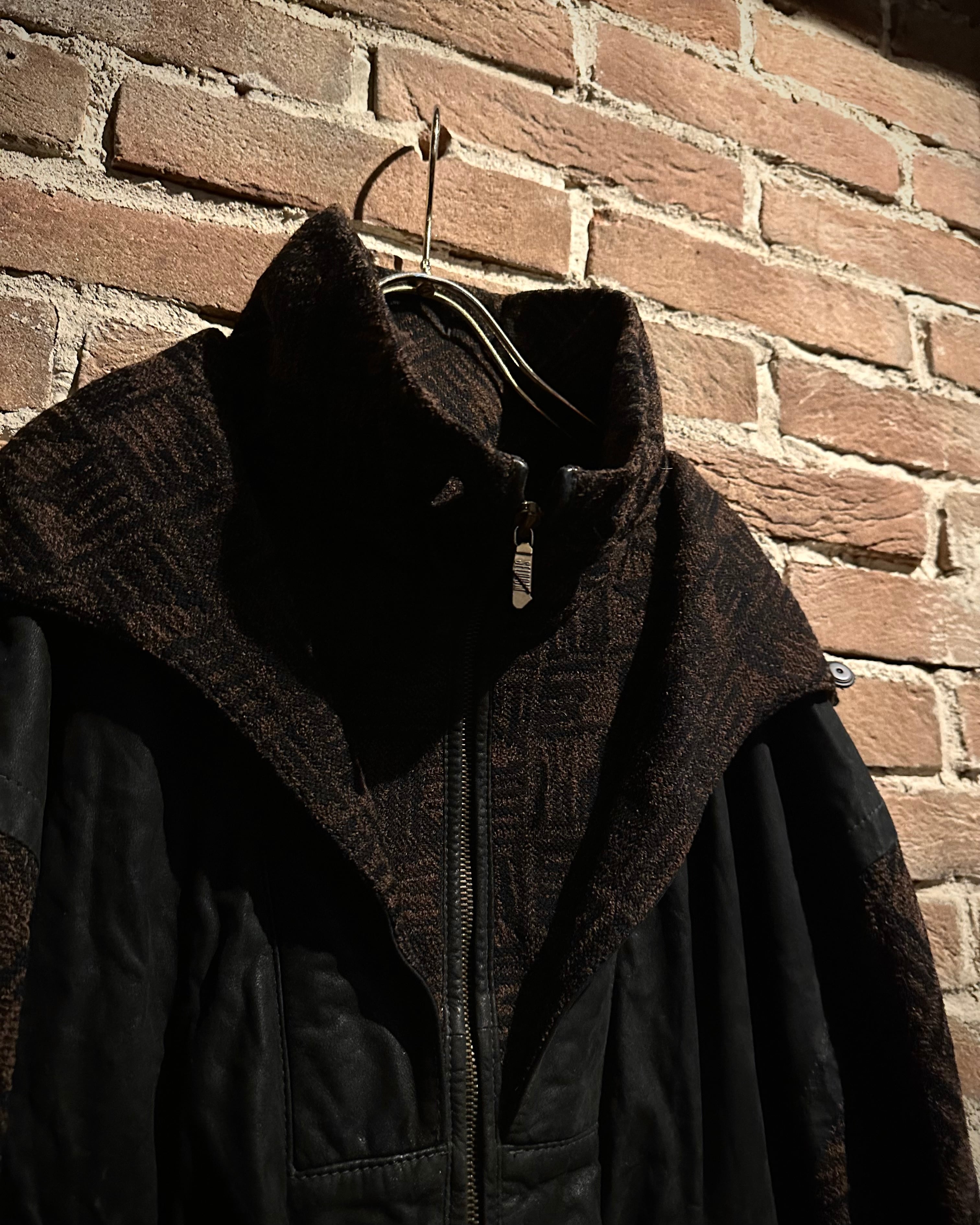 ニット×レザーの異素材を巧みに掛け合わせた、存在感抜群の80's ユーロヴィンテージのジャケット。