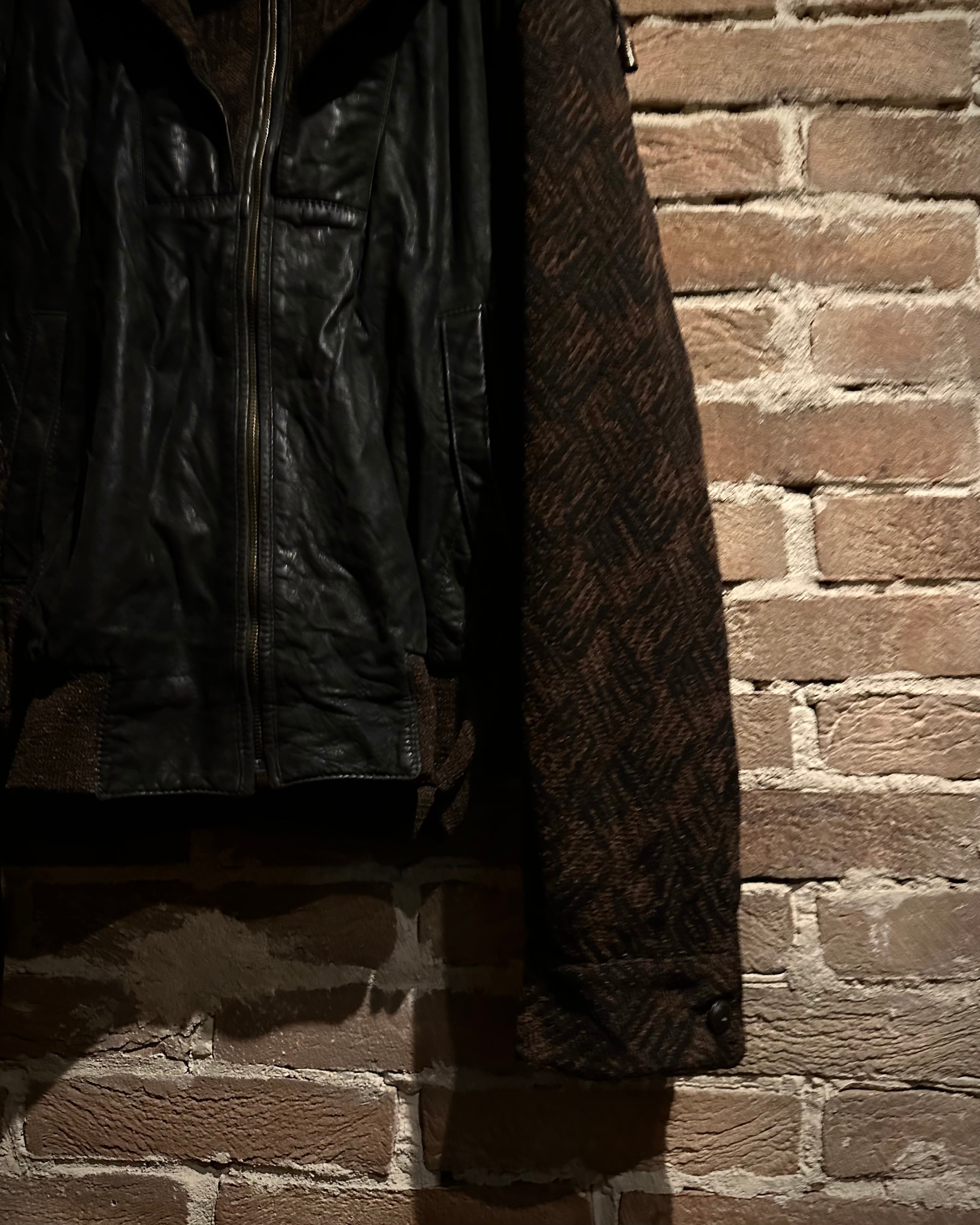 抽象的なパターンを載せた温かみあるニットをベースに、マットなブラックレザーを大胆に身頃へ切り替えた1着です。
