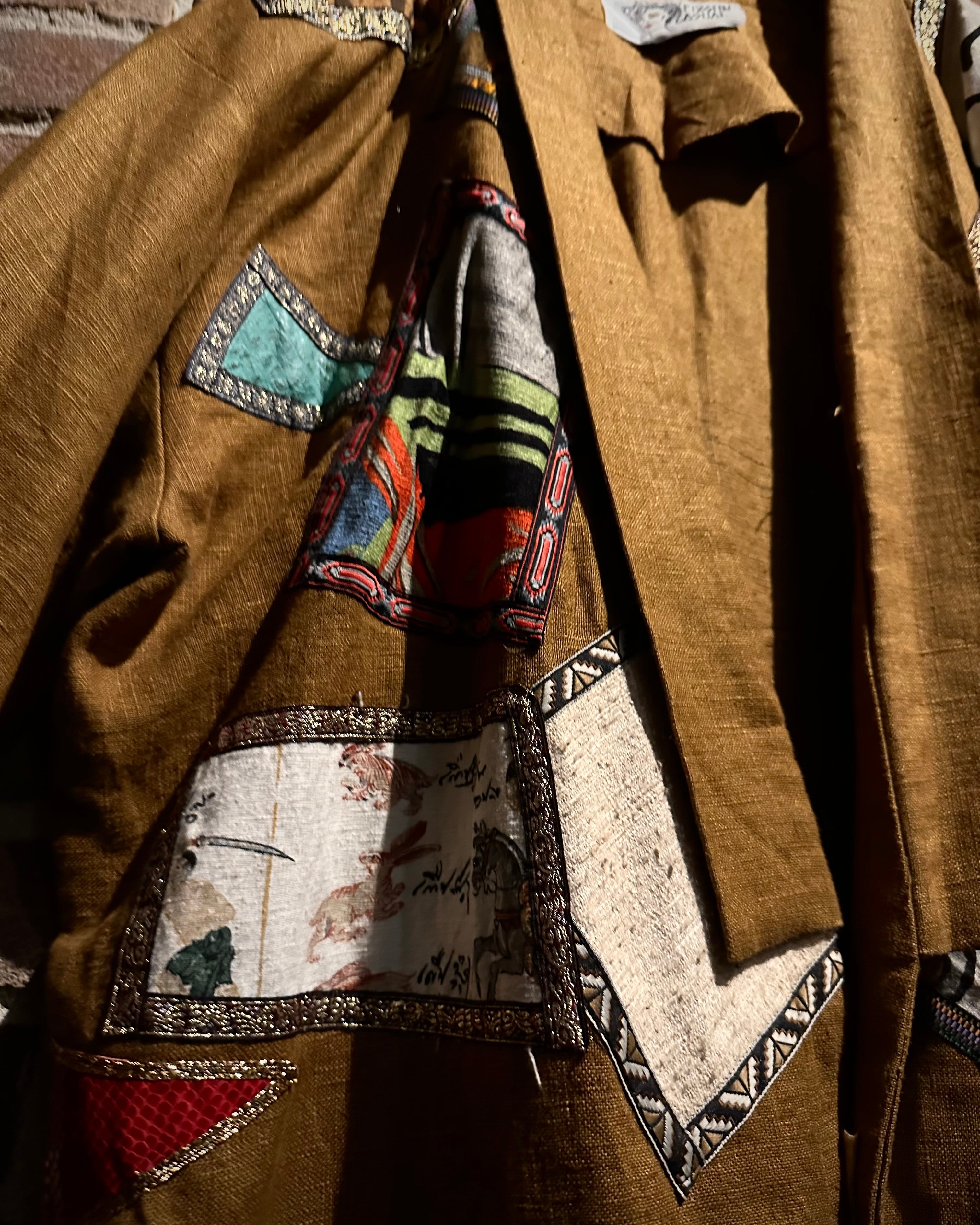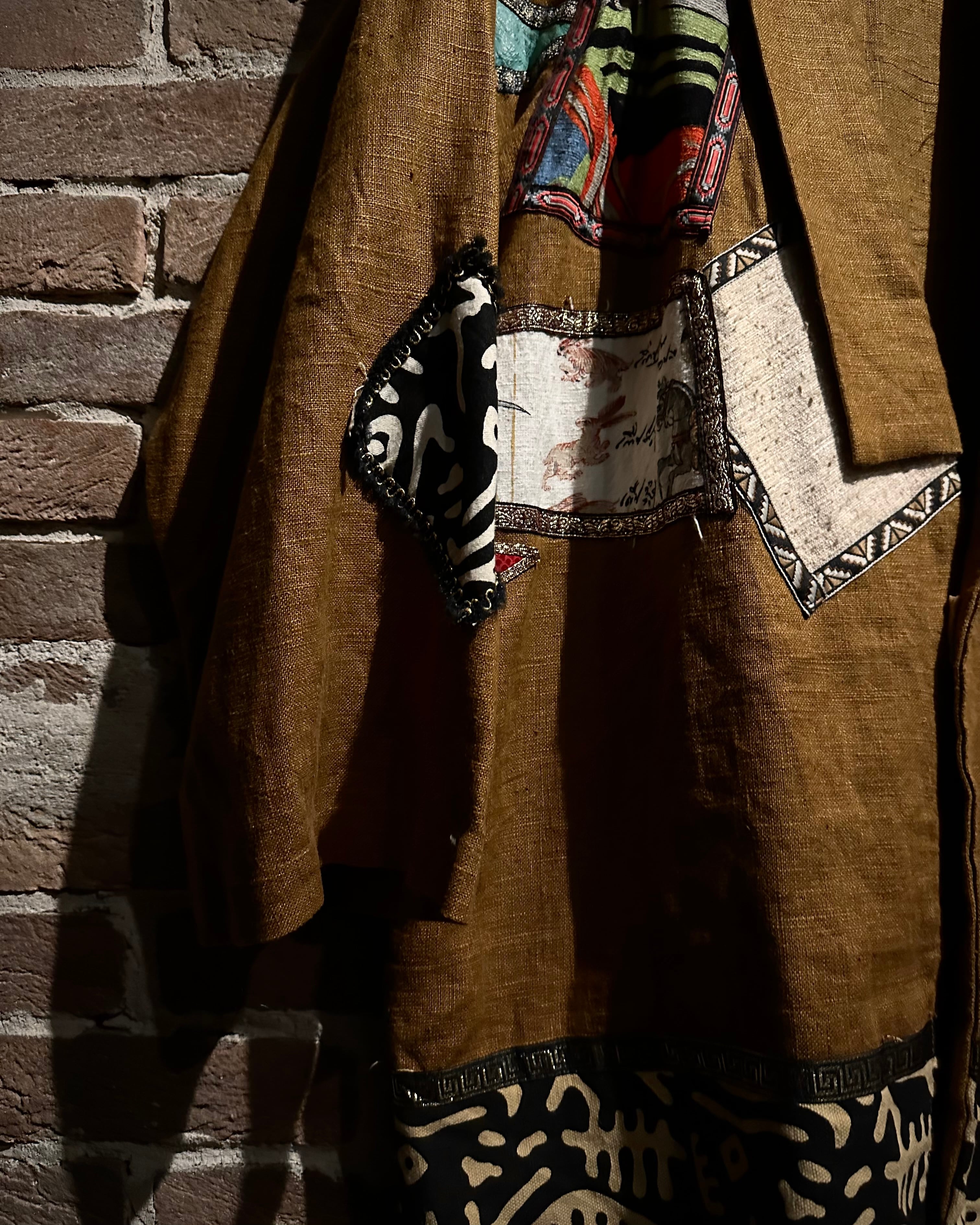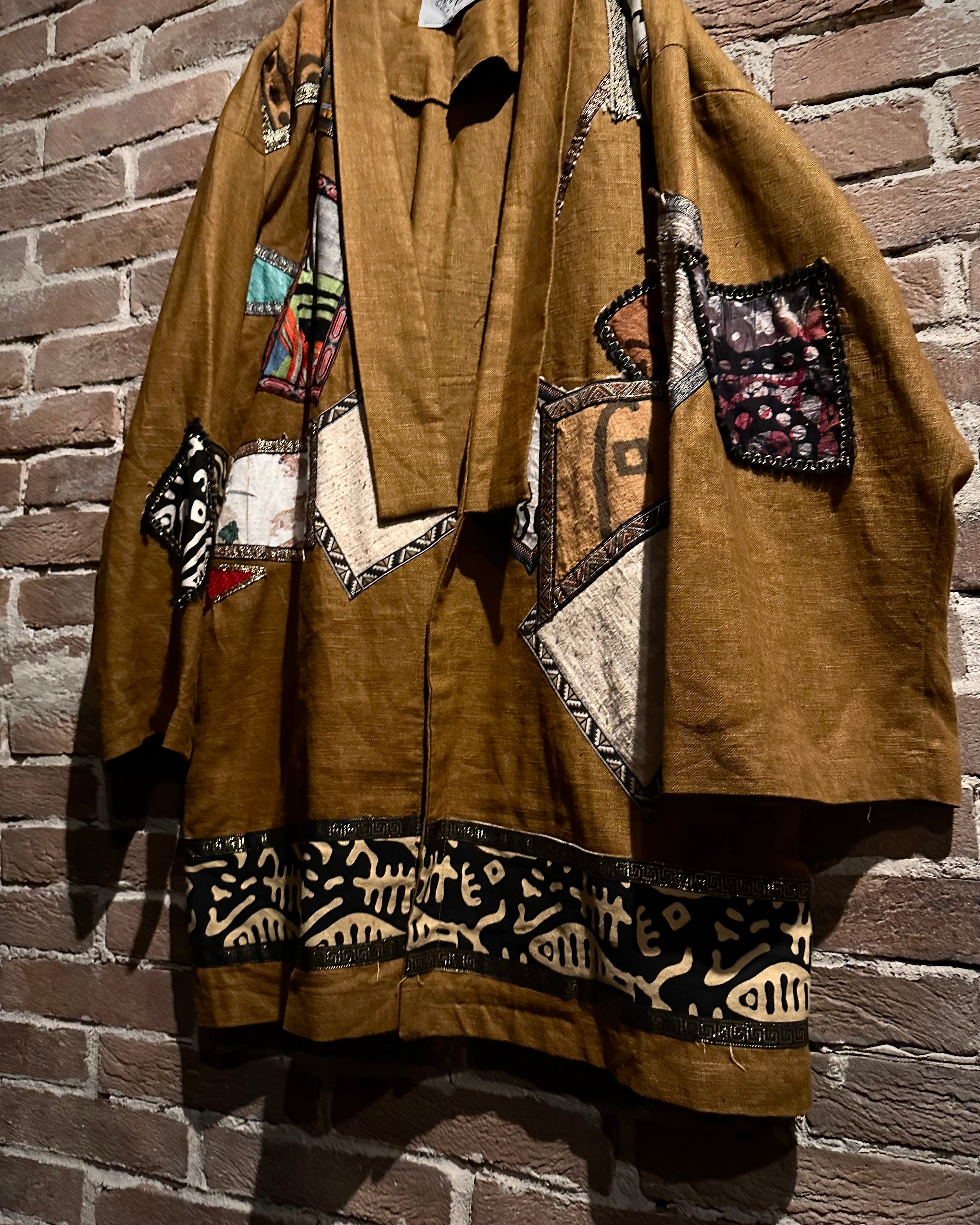 フロントや袖、背面にかけてアフリカンバティックや織り柄ファブリックを大胆にパッチワークした存在感のある1着。